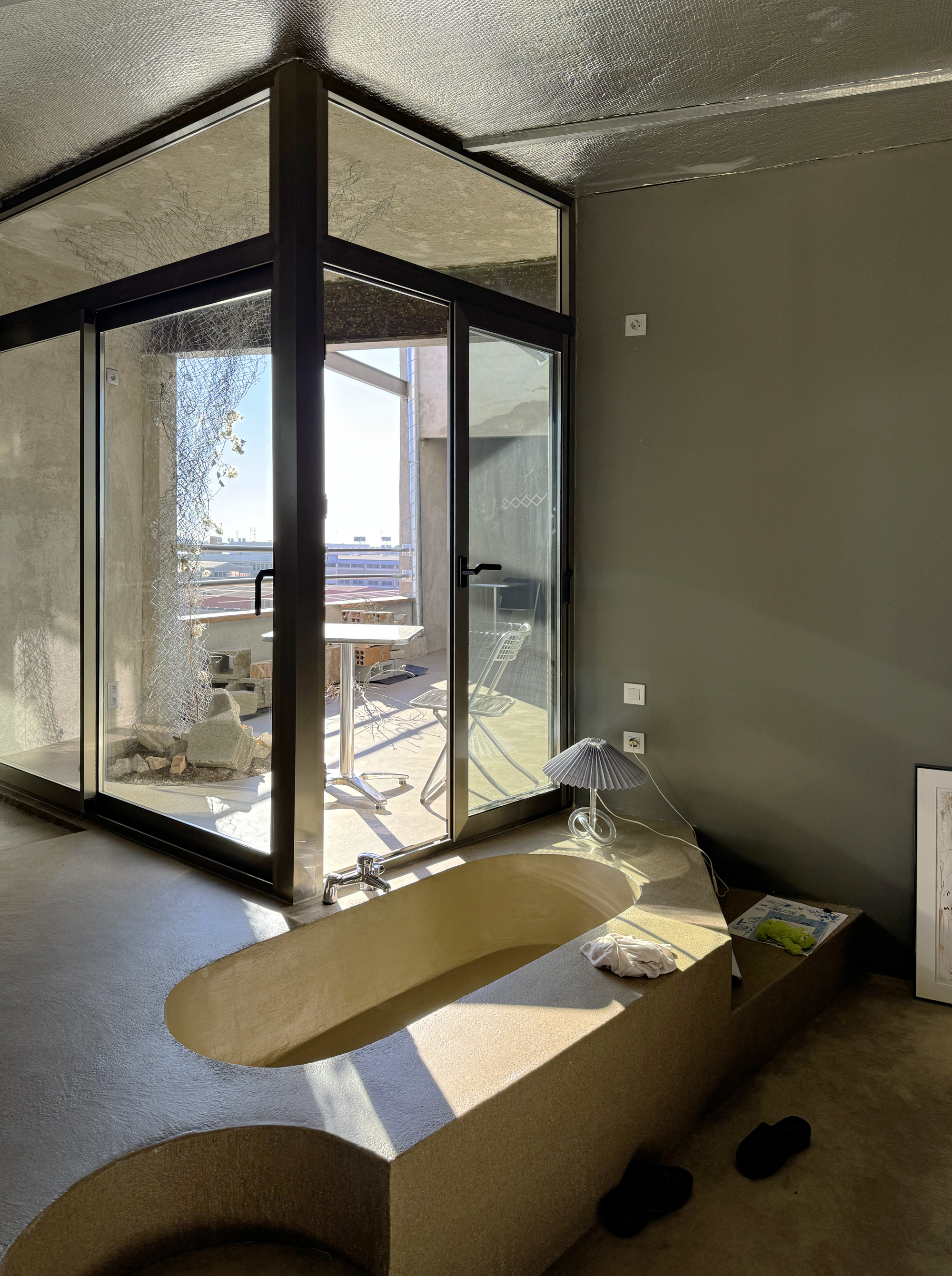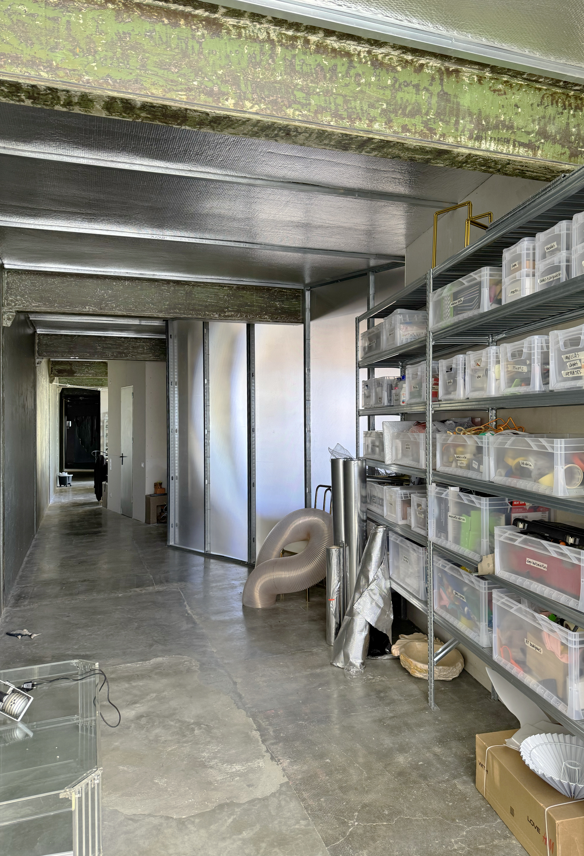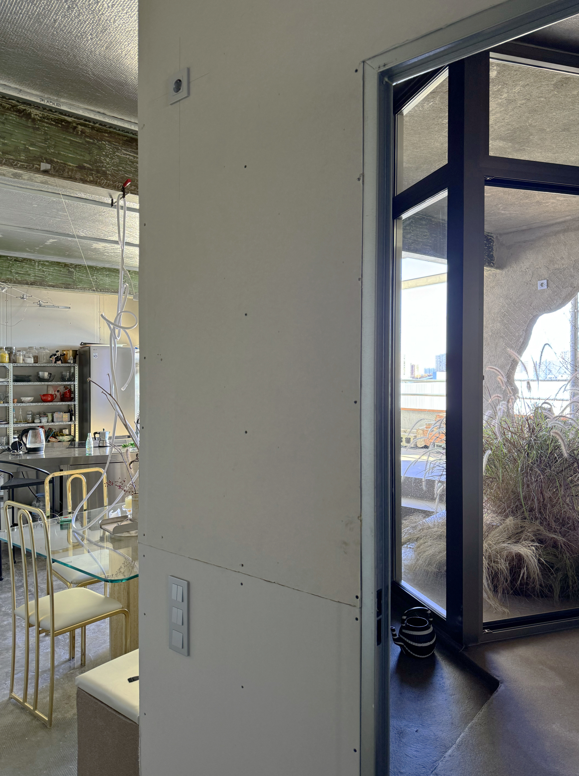 Located on the approximately 400 m² top floor of a workshop building vacant for 25 years, this former industrial unit has been converted into an adaptable residence for up to 5 co-habitants, workspace, and social environment. The original 7.5-metre-wide bay has been rearticulated by expanding a small central ventilation patio, now a source of natural light and the spatial core around which the primary areas of the live-work home are organised. This partially covered outdoor space assumes multiple roles: it is a garden, terrace, porch, passageway, living, dining, and kitchen, simultaneously extending the interior zones.