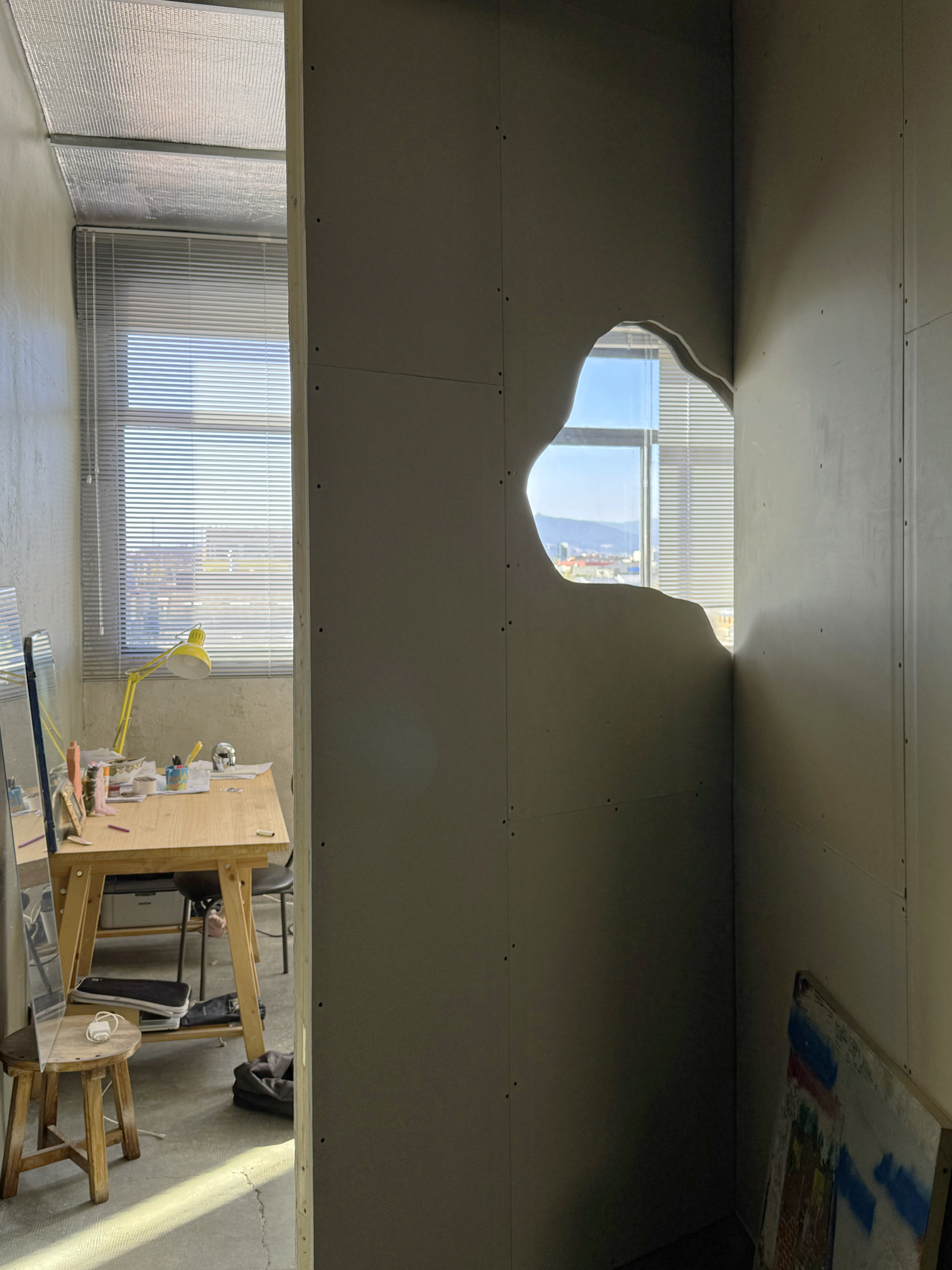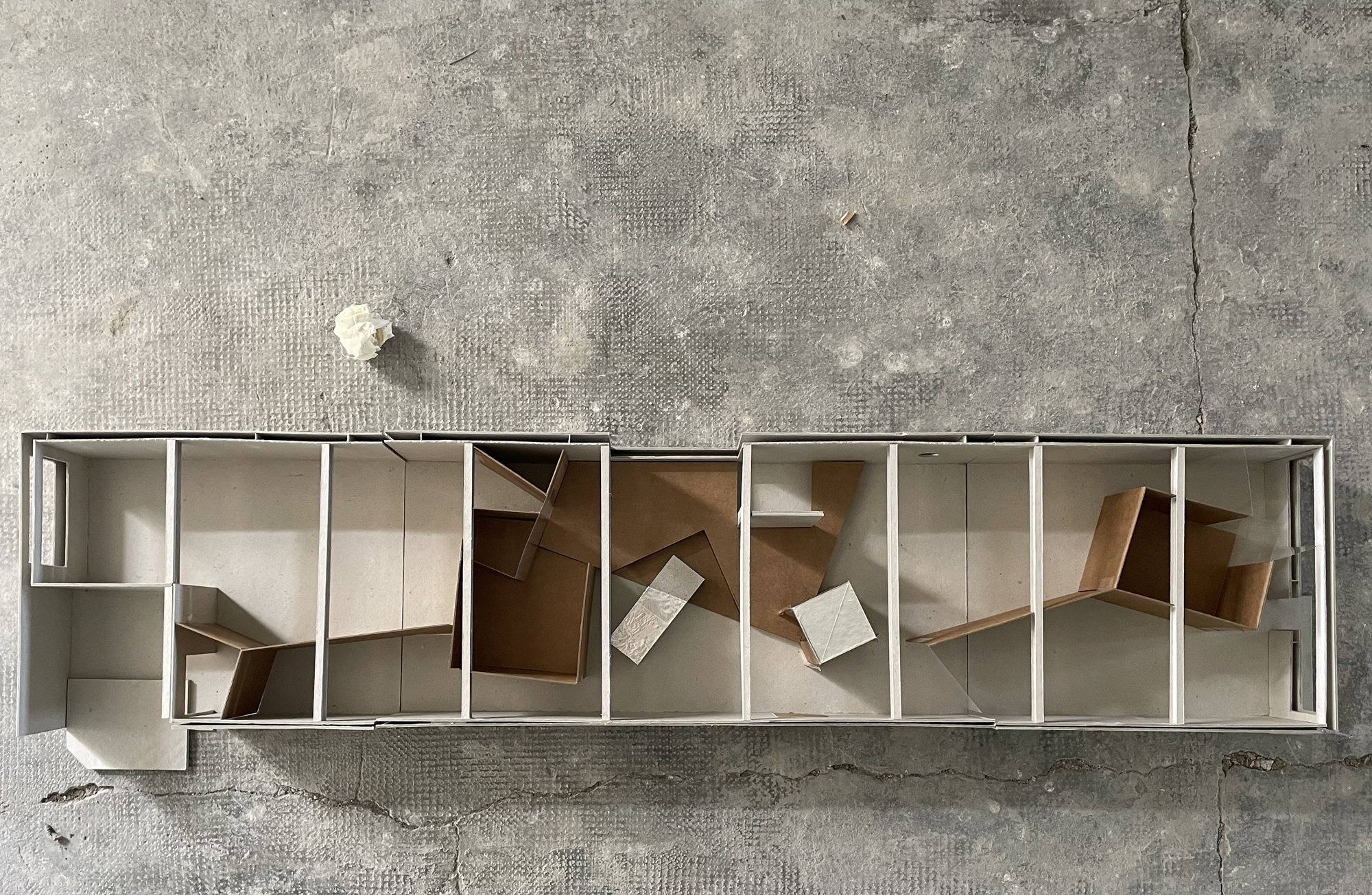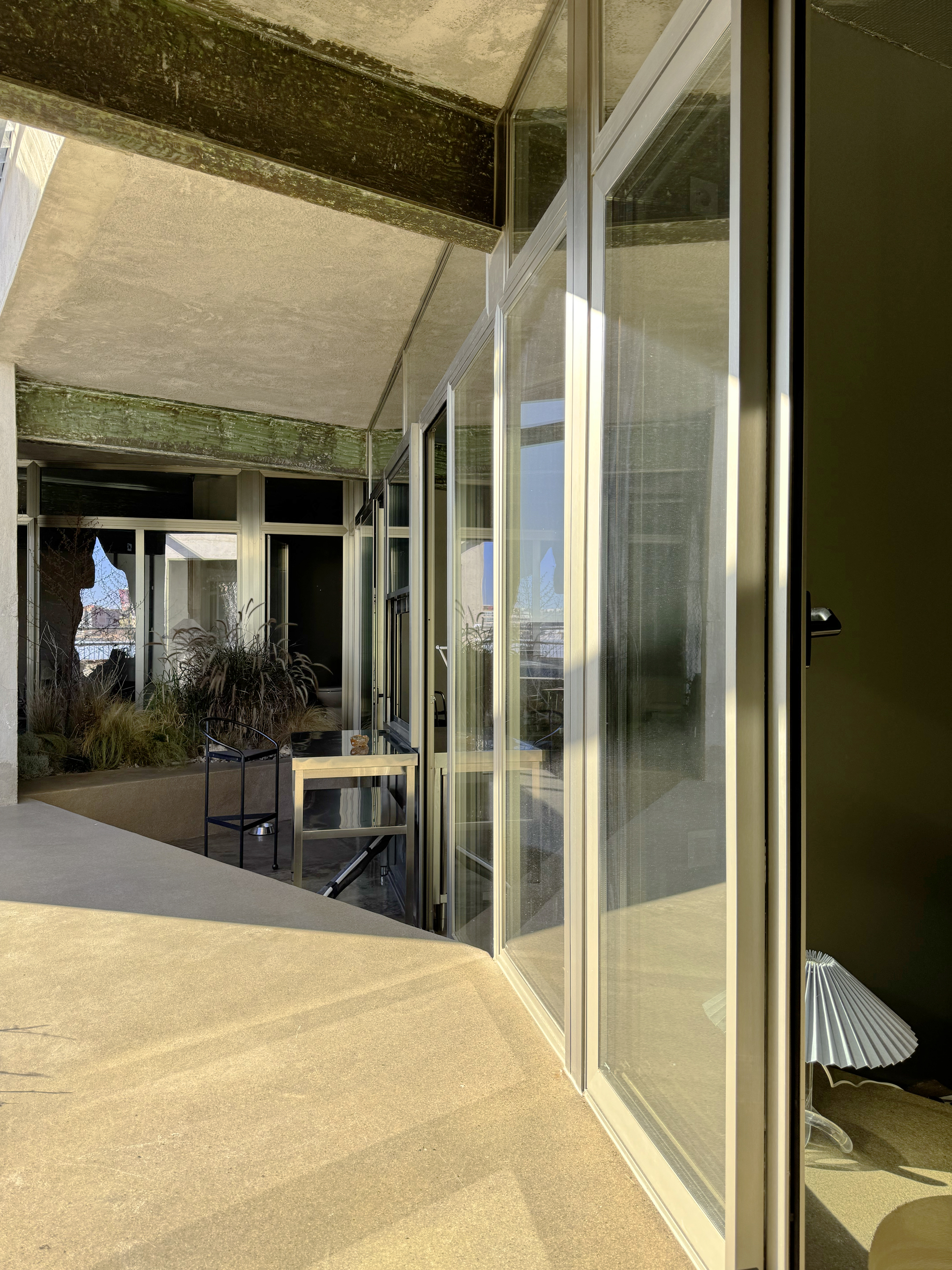 Located on the approximately 400 m² top floor of a workshop building vacant for 25 years, this former industrial unit has been converted into an adaptable residence for up to 5 co-habitants, workspace, and social environment. The original 7.5-metre-wide bay has been rearticulated by expanding a small central ventilation patio, now a source of natural light and the spatial core around which the primary areas of the live-work home are organised. This partially covered outdoor space assumes multiple roles: it is a garden, terrace, porch, passageway, living, dining, and kitchen, simultaneously extending the interior zones.