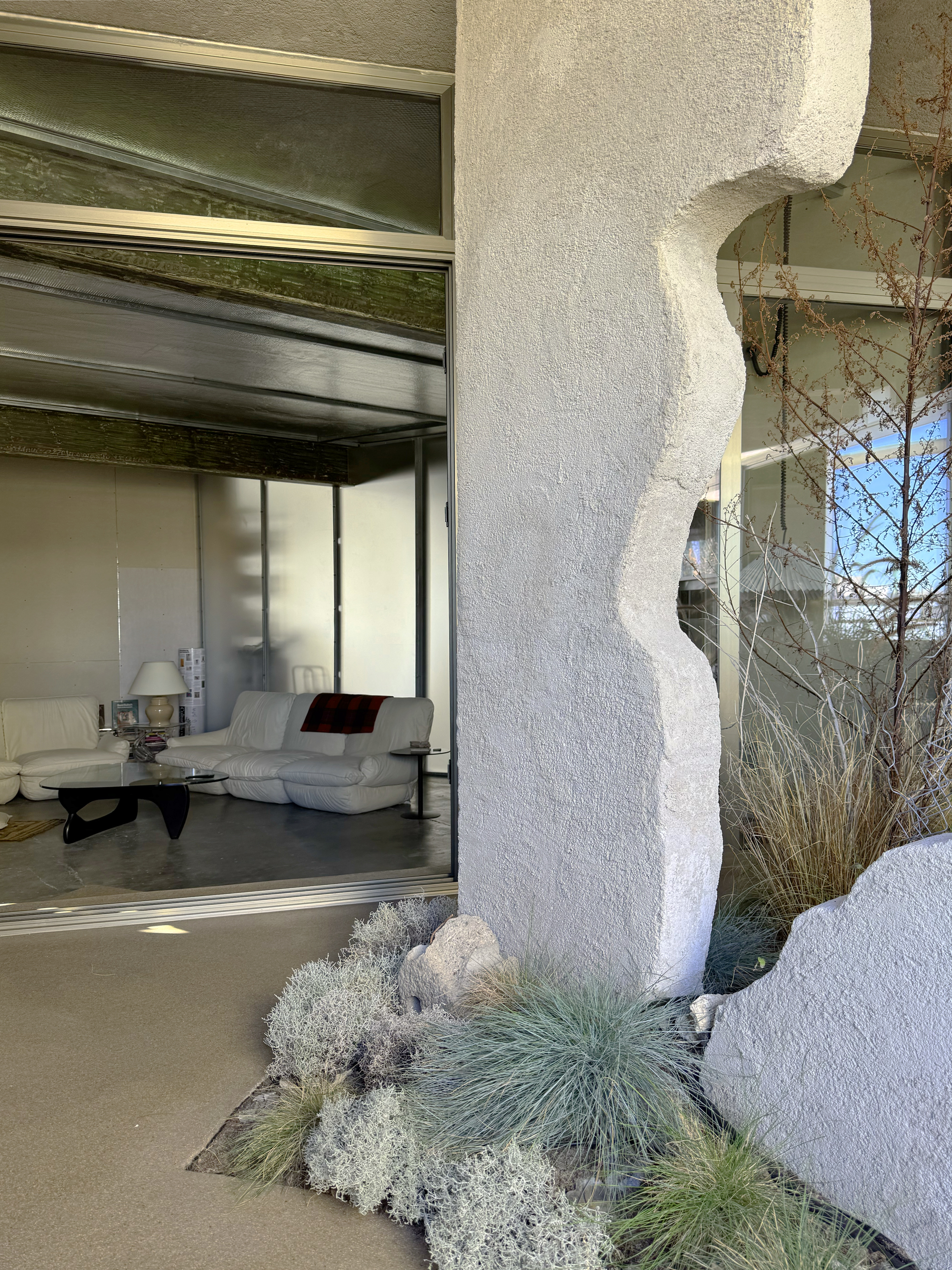 The floor of the patio is raised to manage rainwater drainage and the outflow from the kitchen and bathrooms. Taking advantage of this operation, a two-level platform is created, integrating several built-in features that enhance the use of the space: a bathtub, firewood storage, benches, and planters appear throughout the surface, which is finished with a continuous beach sand coating.