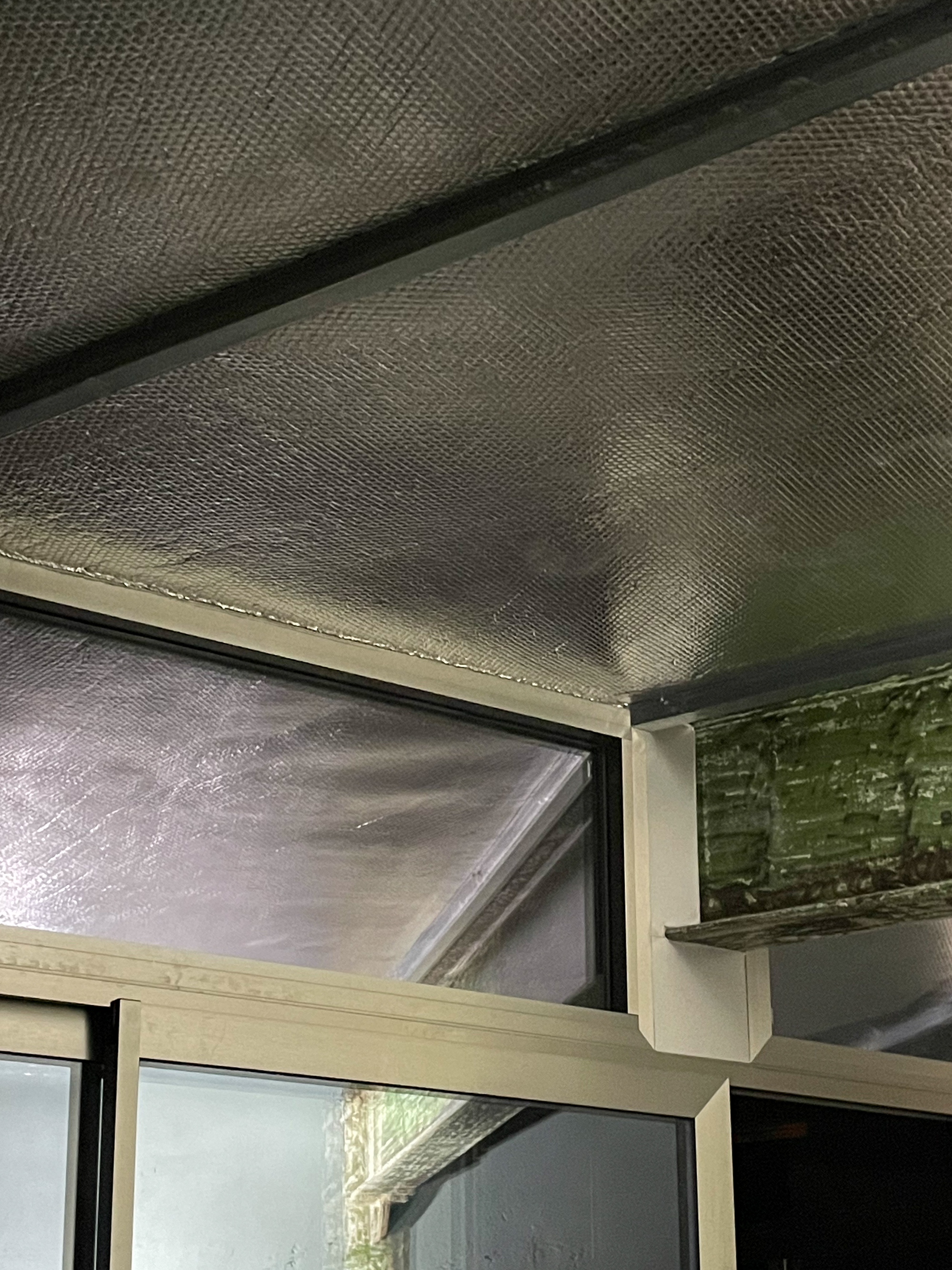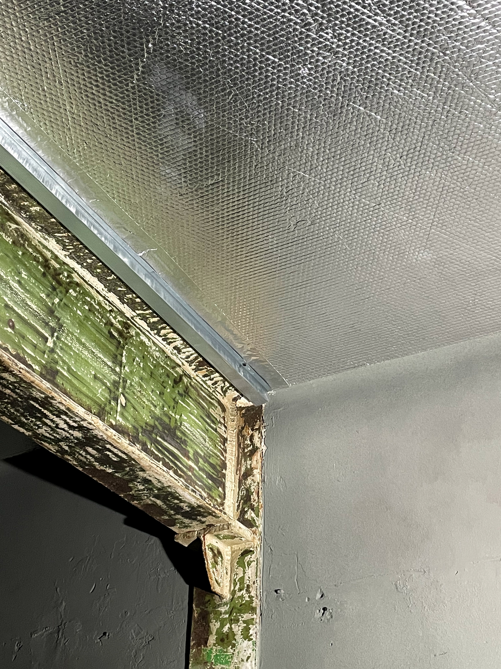 To insulate the roof—being directly below the building’s exterior covering—a reflective thermal barrier was applied. In addition to its insulating performance, its silvery finish reflects light into the unit, subtly modulated by the warm, earthy tones of the surrounding materials. Economy, sustainability, and aesthetics go hand in hand in this project, where all added materials are left raw and the entire space is furnished with second-hand pieces.