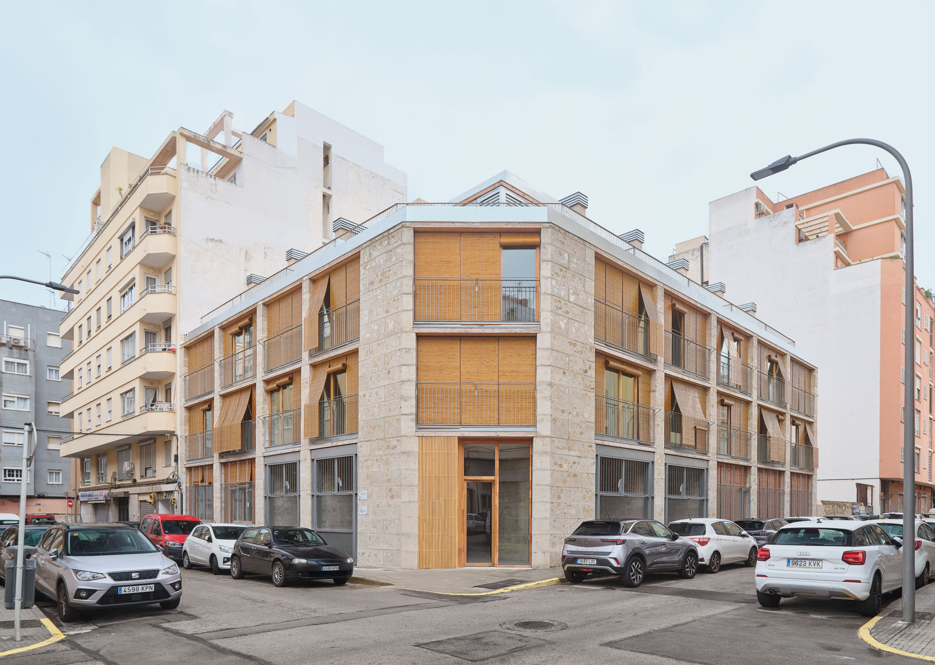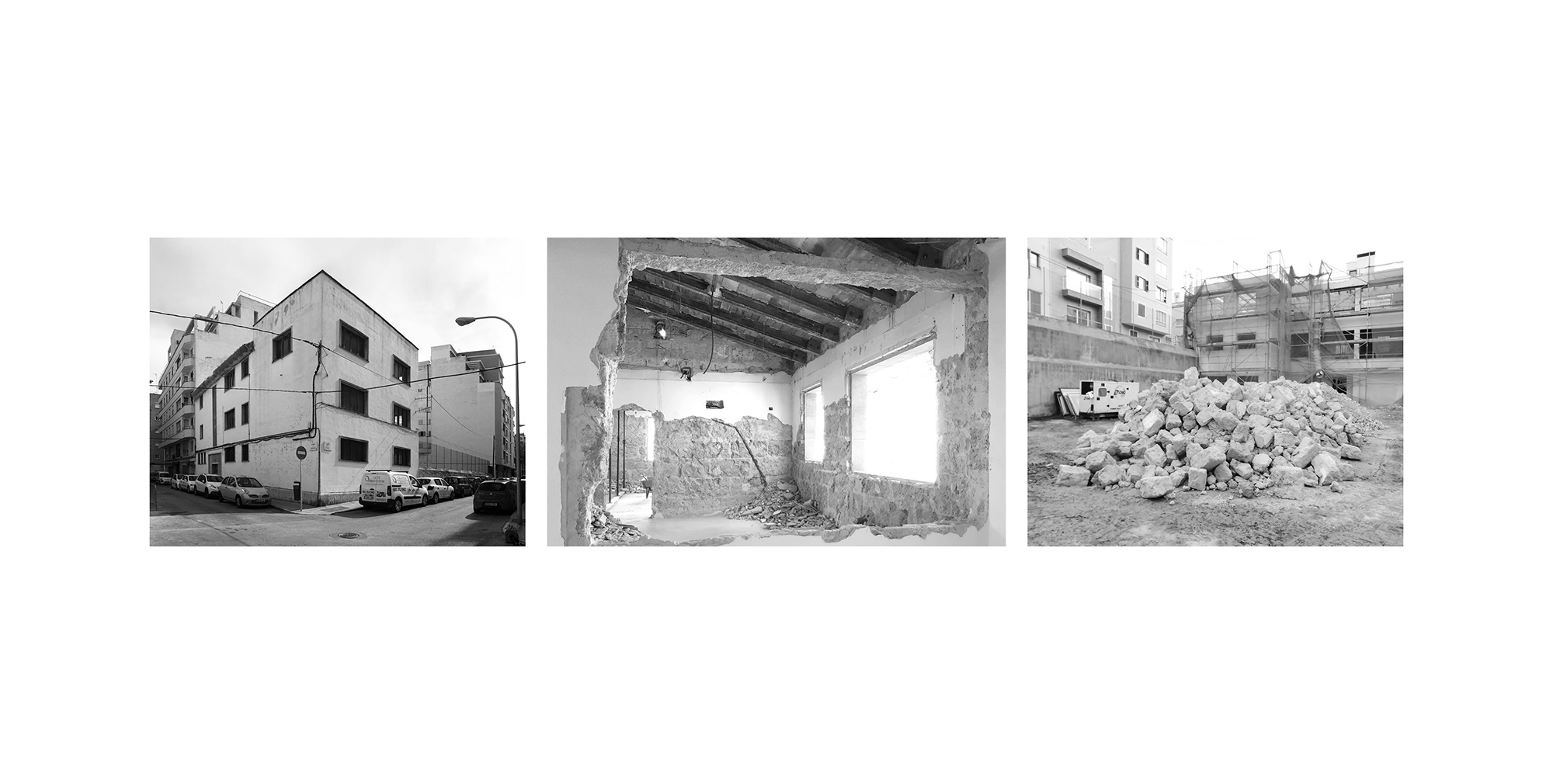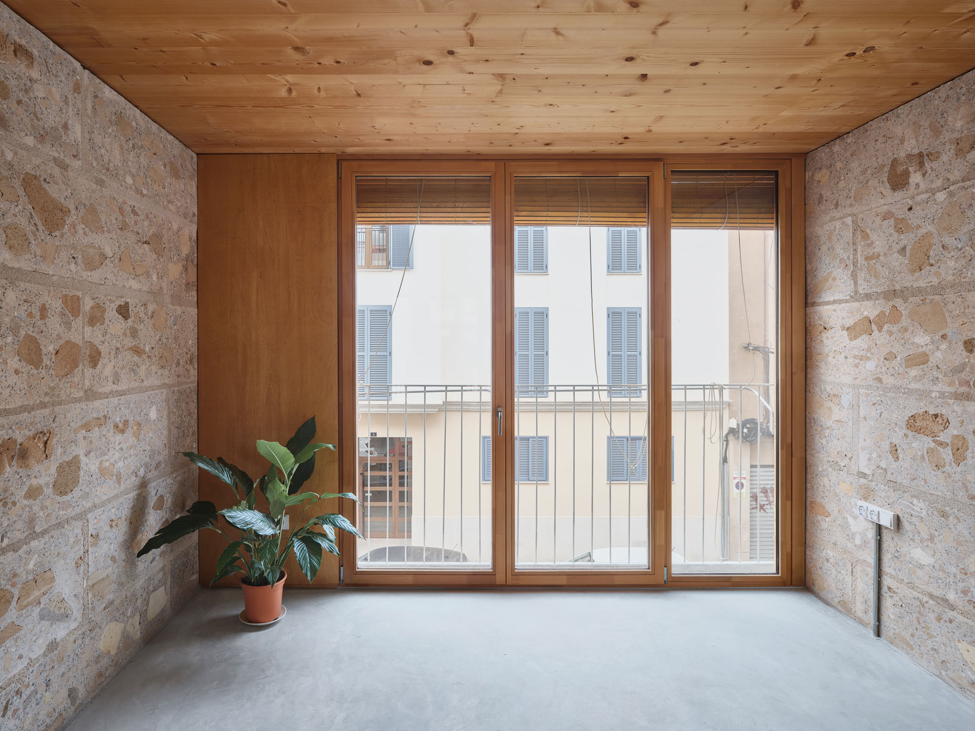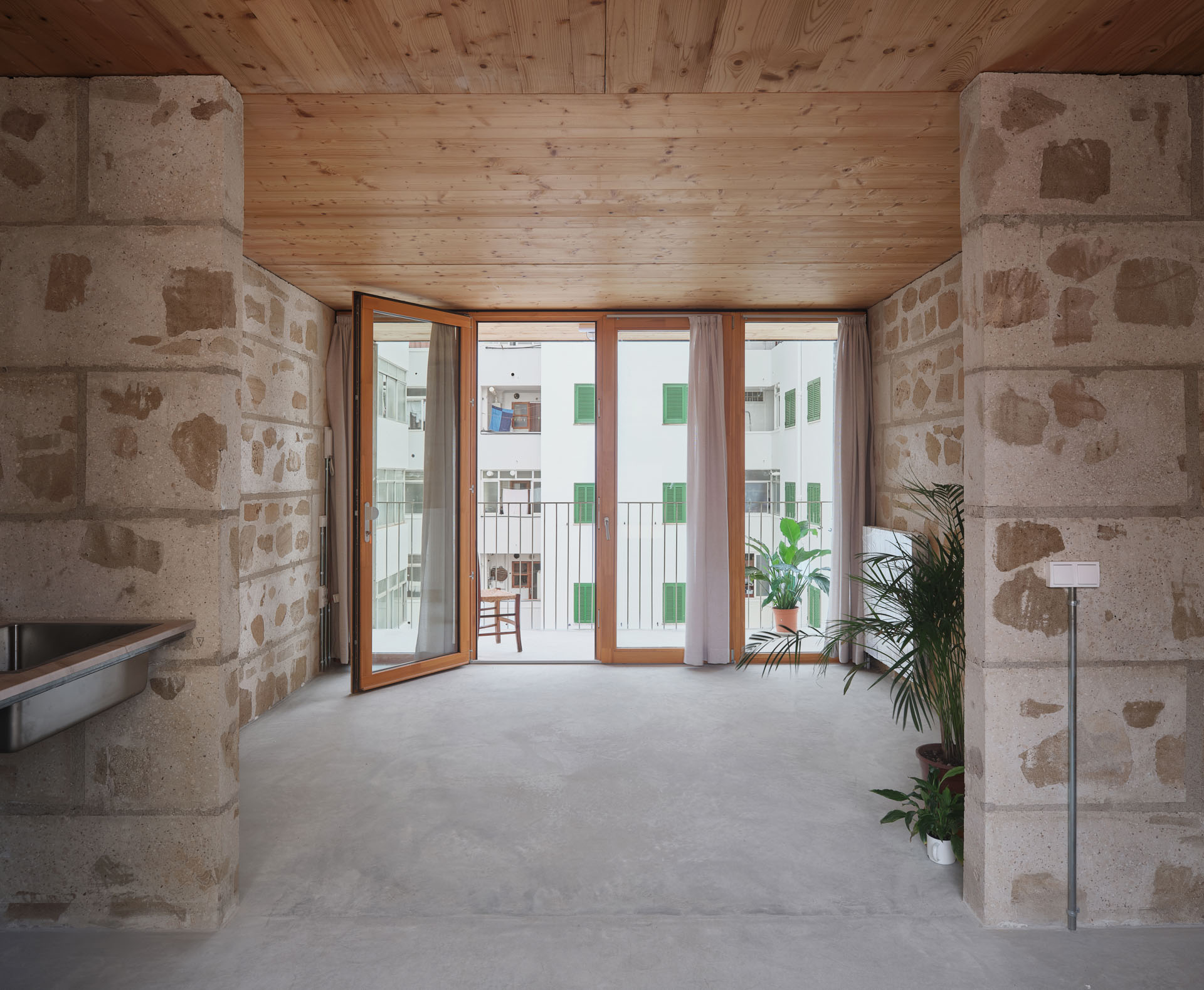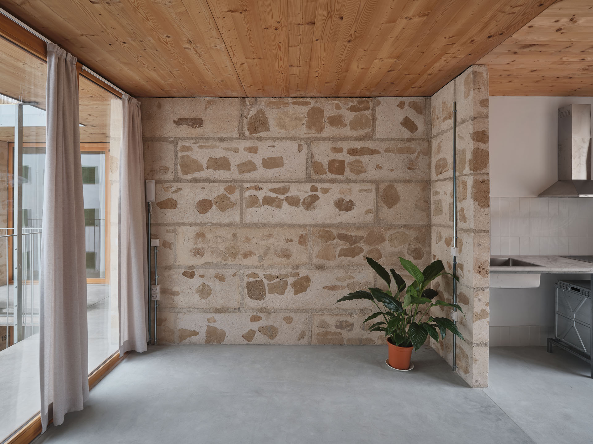 On the plot where the Social Housing were built, primarily intended for the elderly, there was a building that we were obliged to demolish due to its non-compliance with urban planning regulations and its poor condition—there was no possibility of preserving it. It was a small, disused three-story school constructed with structural sandstone (marès) walls and concrete and ceramic ceilings. The project’s distinctive strategy was the utilization of demolition materials from the old school as resources to construct the new building, practicing what we might call urban mining: where material resources come from the urban plot itself, resulting from the demolition of the pre-existing building.