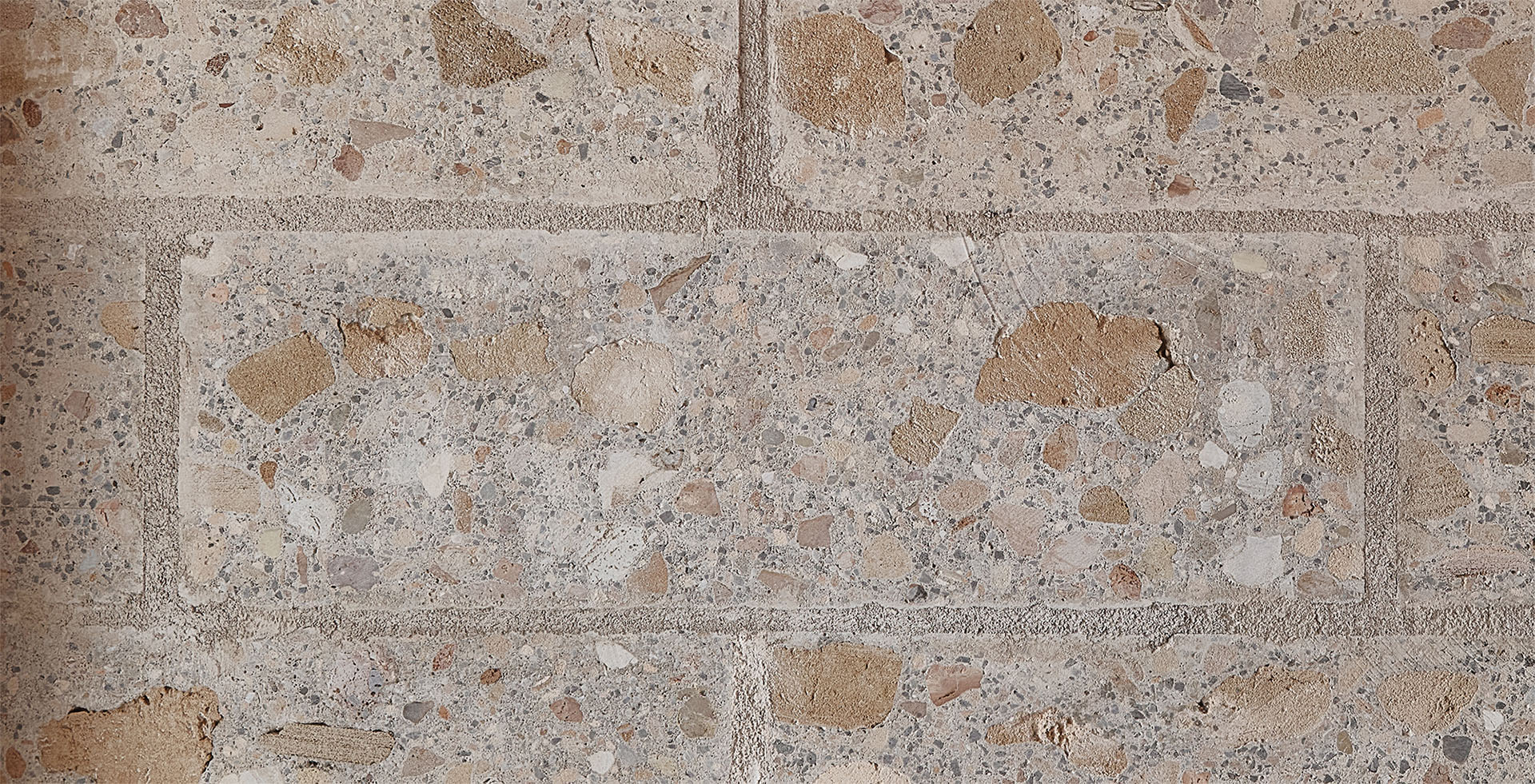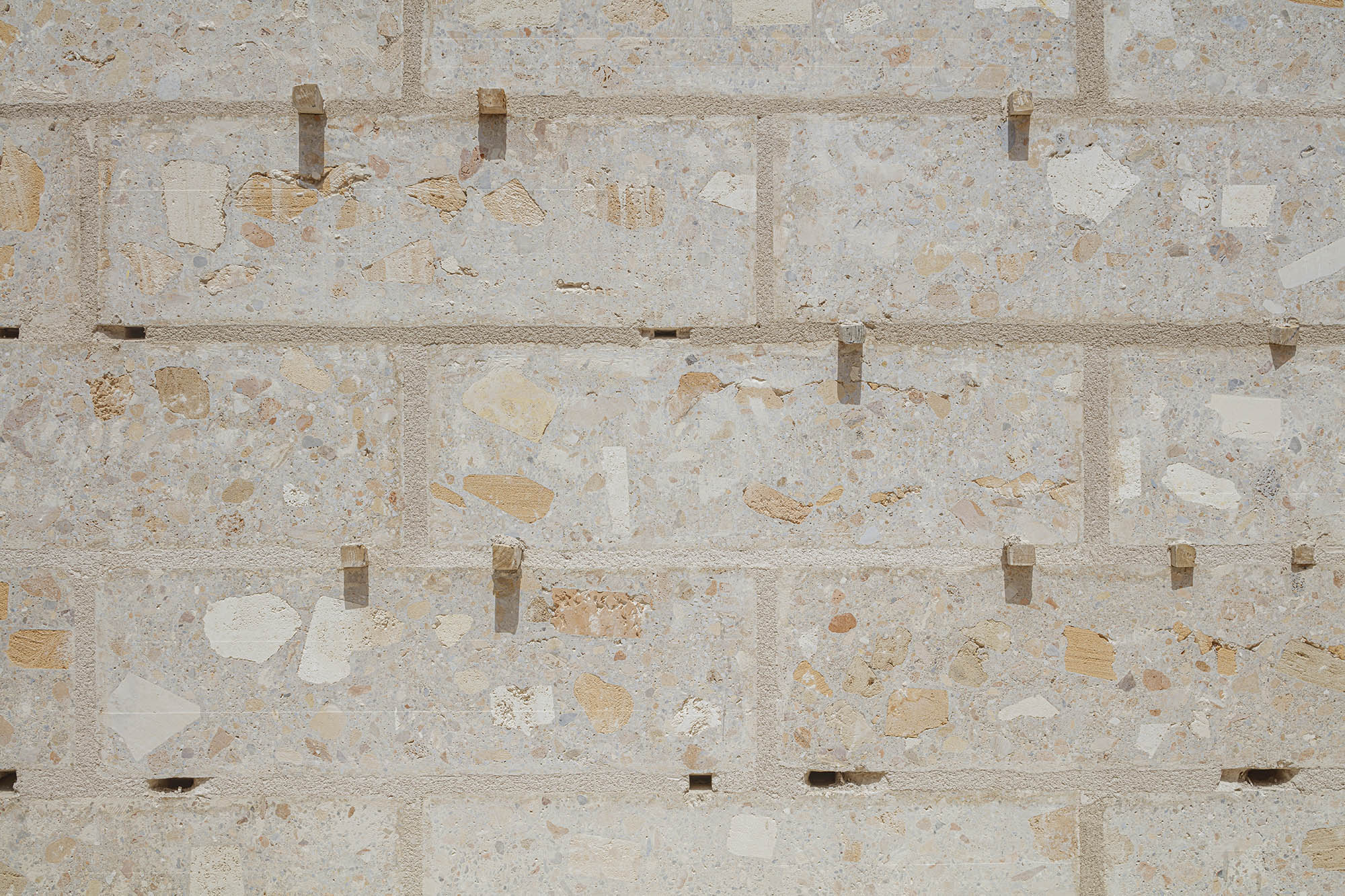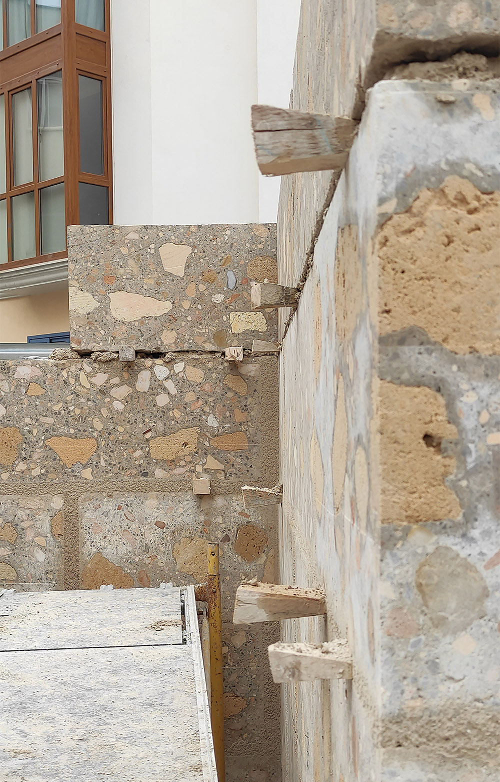 Once the demolition was completed and materials were selected, nearly all the rubble was repurposed according to material type. First, pieces of ceramic and concrete elements (140 m³) were poured into the foundation pits and walls of the semi-basement. Second, all the sandstone (about 160 m³) was used to construct large blocks (approximately 3,000 units) of cyclopean concrete with cement and lime mixed with recycled marès stone (40% of the block volume), composed of large cobbles up to 30 cm in diameter, sandstone gravel, and picadís (sand, also from marès). Each block was cut with a large disc saw from a 4 x 4 m2 slab, so that the stones reappeared on the faces of the blocks.