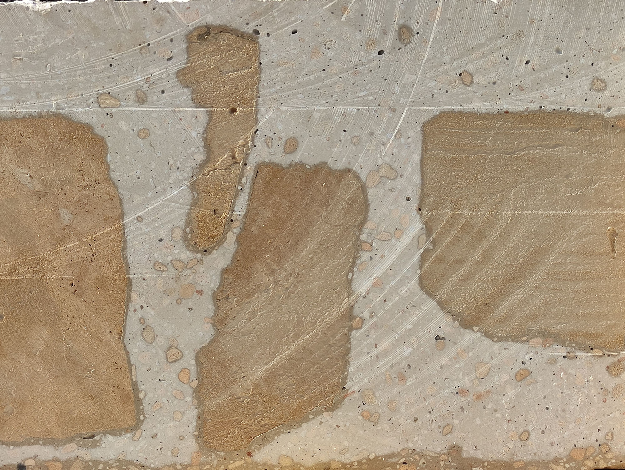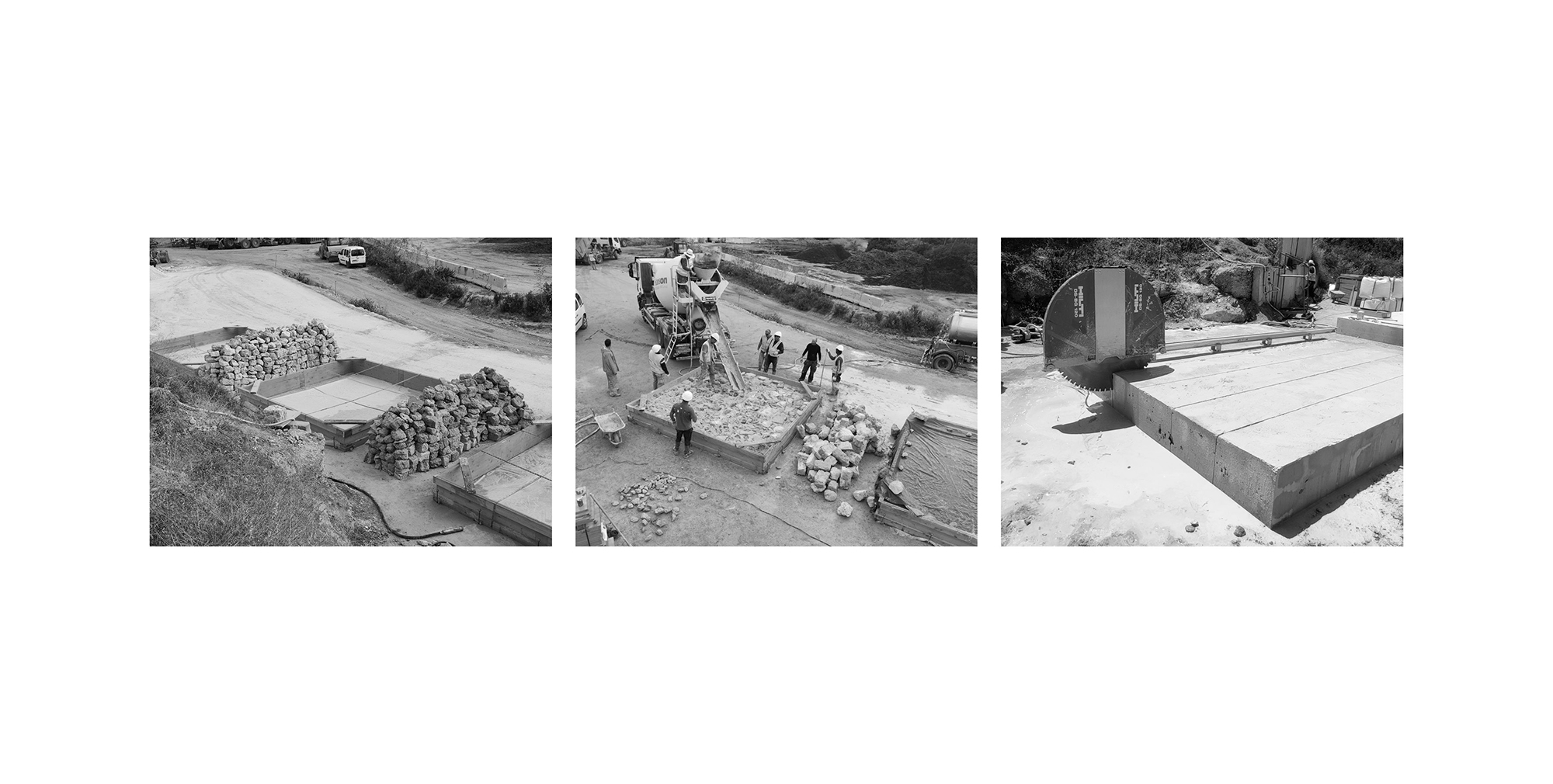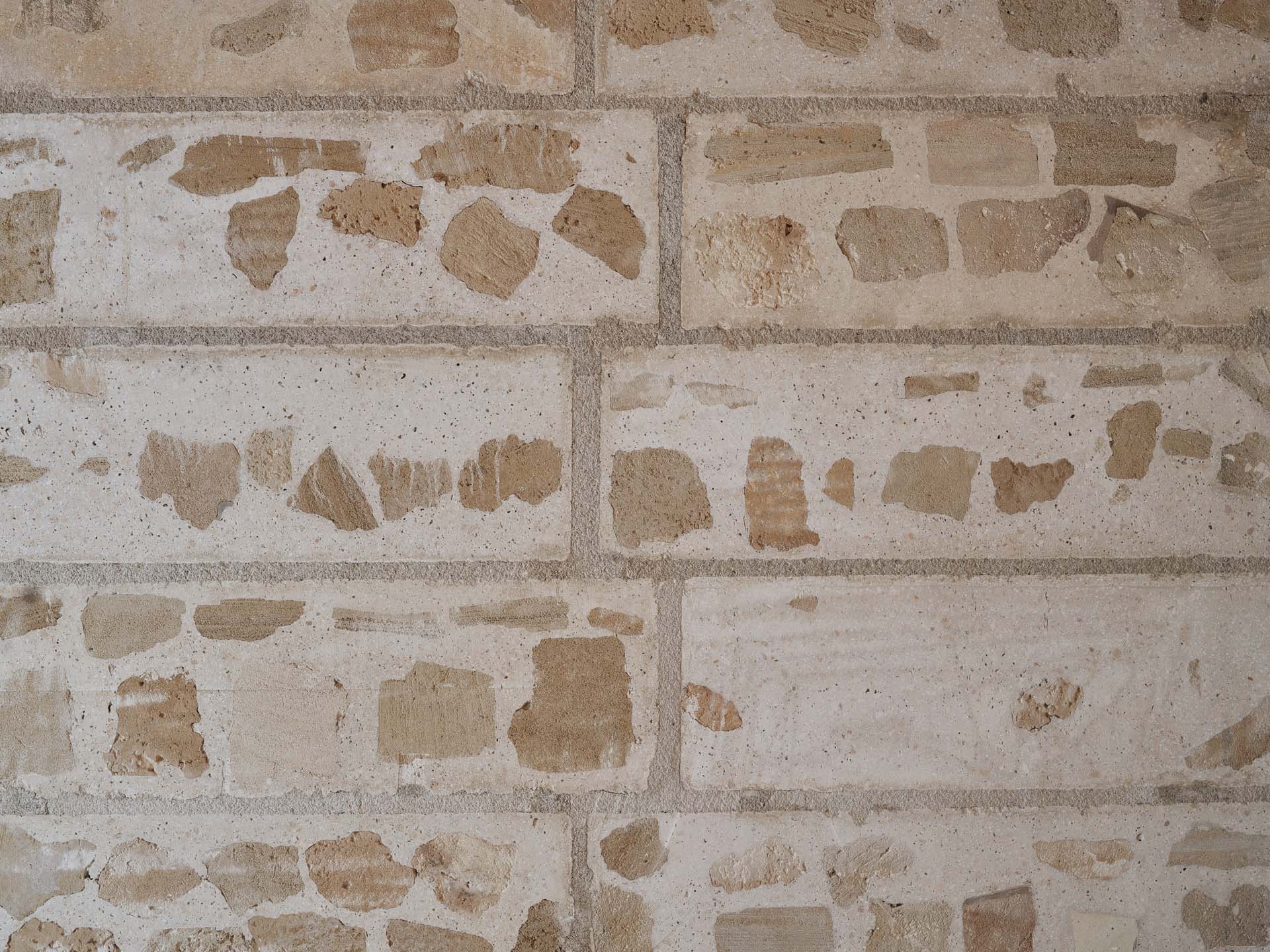 Once the demolition was completed and materials were selected, nearly all the rubble was repurposed according to material type. First, pieces of ceramic and concrete elements (140 m³) were poured into the foundation pits and walls of the semi-basement. Second, all the sandstone (about 160 m³) was used to construct large blocks (approximately 3,000 units) of cyclopean concrete with cement and lime mixed with recycled marès stone (40% of the block volume), composed of large cobbles up to 30 cm in diameter, sandstone gravel, and picadís (sand, also from marès). Each block was cut with a large disc saw from a 4 x 4 m2 slab, so that the stones reappeared on the faces of the blocks.