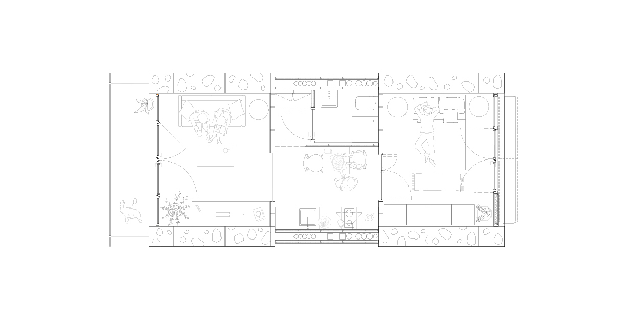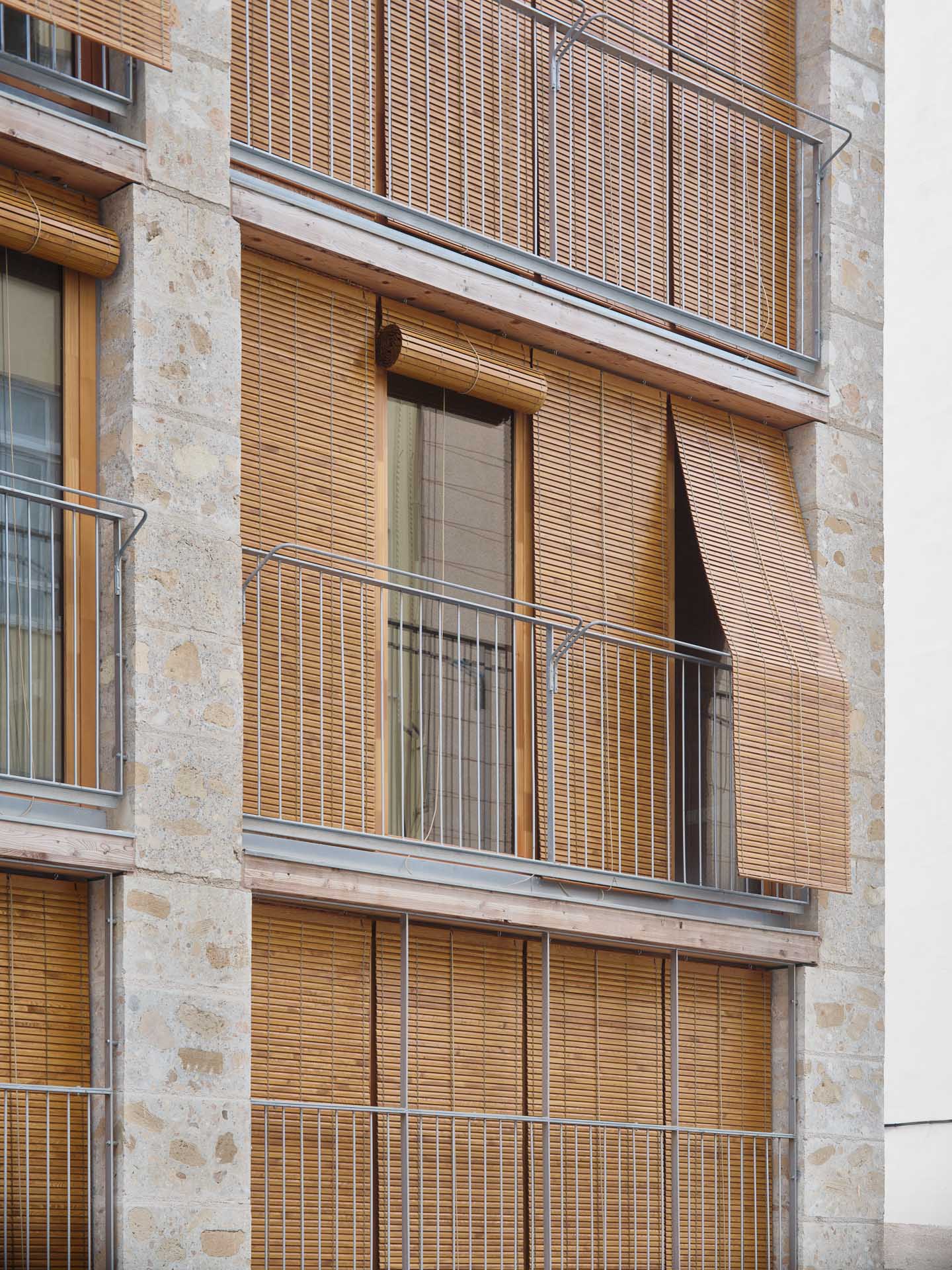 The entire spatial and programmatic organization of the building responds to the described structural system; the floor plan is organized with a stair core in the corner, providing access to a walkway in the interior garden, from where each apartment is accessed—all are through apartments except those on the semi-basement floor, which, like those on the attic floor, have half the depth of the typical floors and utilize two structural spans for each apartment. The top-floor apartments have large terraces. Each floor also has a communal area (laundry room, lounges, etc.). The façade starkly displays the structural system: the end walls (vertical) of the prefabricated block walls, which decrease in height on each floor and support the timber (horizontal) ceilings, and, as the façade of each apartment, floor-to-ceiling wooden balconies with a lateral opaque strip and Venetian blinds to protect from the eastern and western sun.