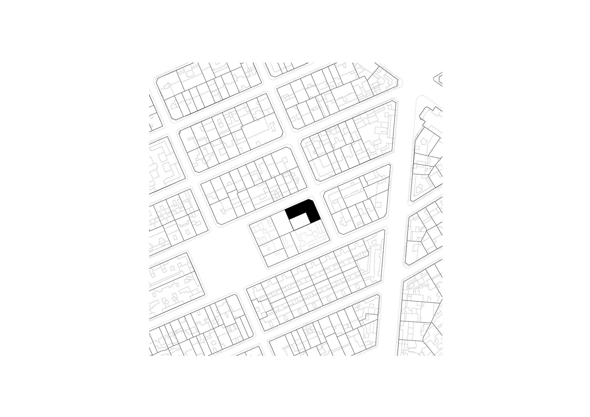 The blocks for the top floor, bearing less load, are made of 100% lime concrete, while the rest of the floors combine lime with cement. These blocks, approximately 135 cm long, 42 cm high, and with variable widths for each floor (64, 54, 44, and 34 cm), were prefabricated once the demolition was completed, before commencing the construction of the new building. This approach significantly reduced the construction duration. The blocks were stacked to build load-bearing walls perpendicular to the street, supporting cross-laminated timber ceilings. On each floor, the walls reduce in thickness by 10 cm, allowing direct support of the timber panels, facilitating the speed of execution of the entire structure.
