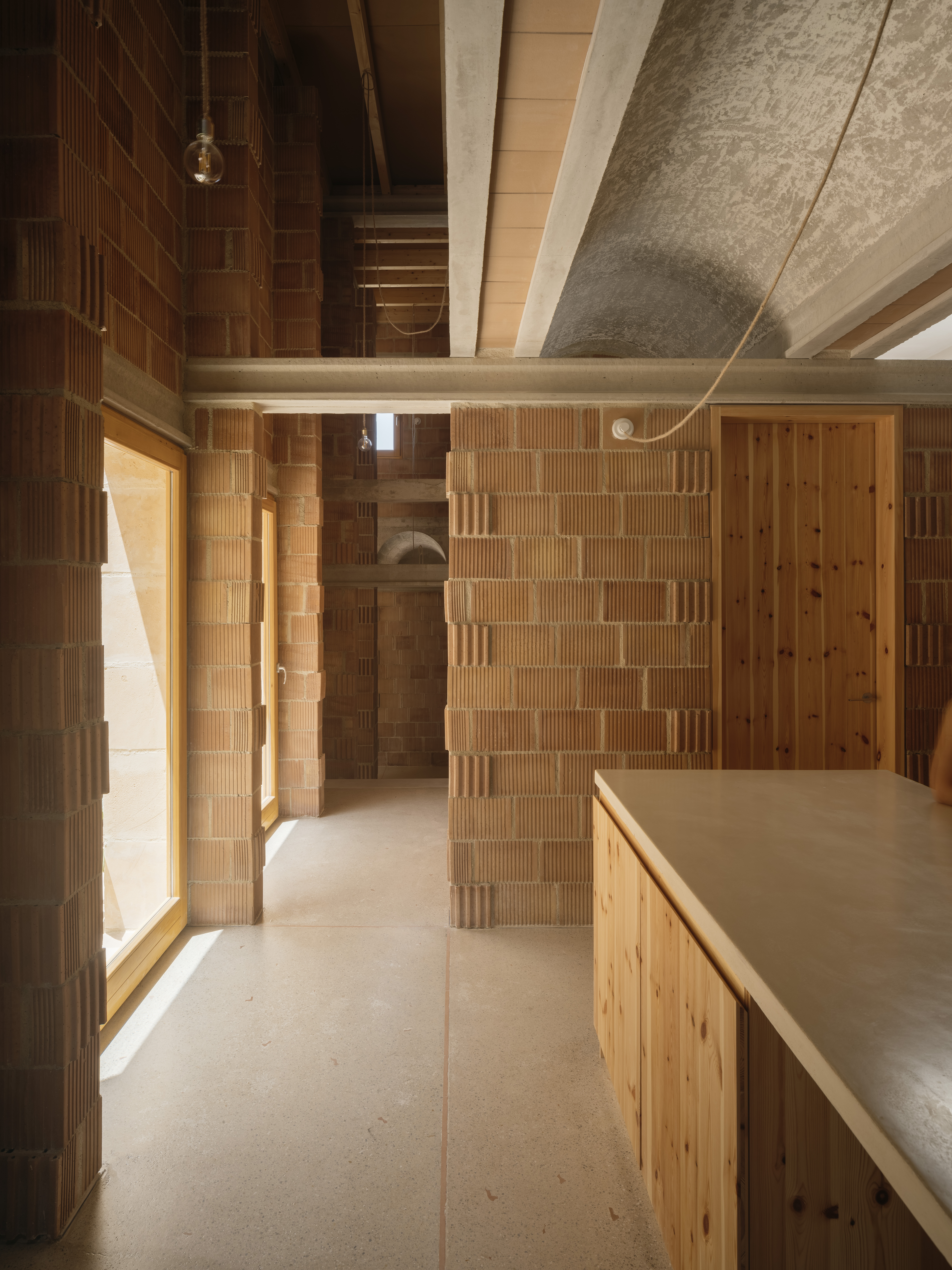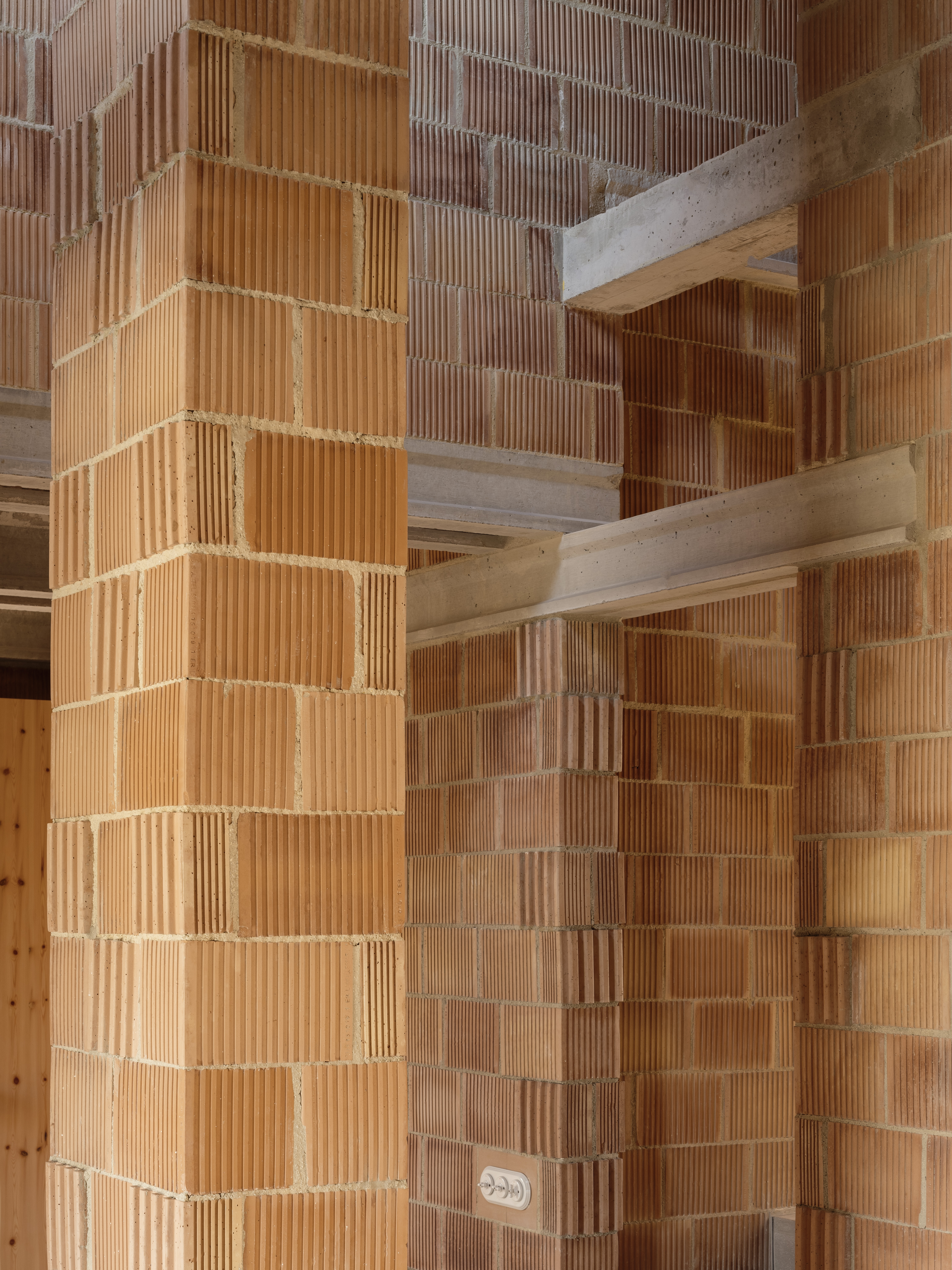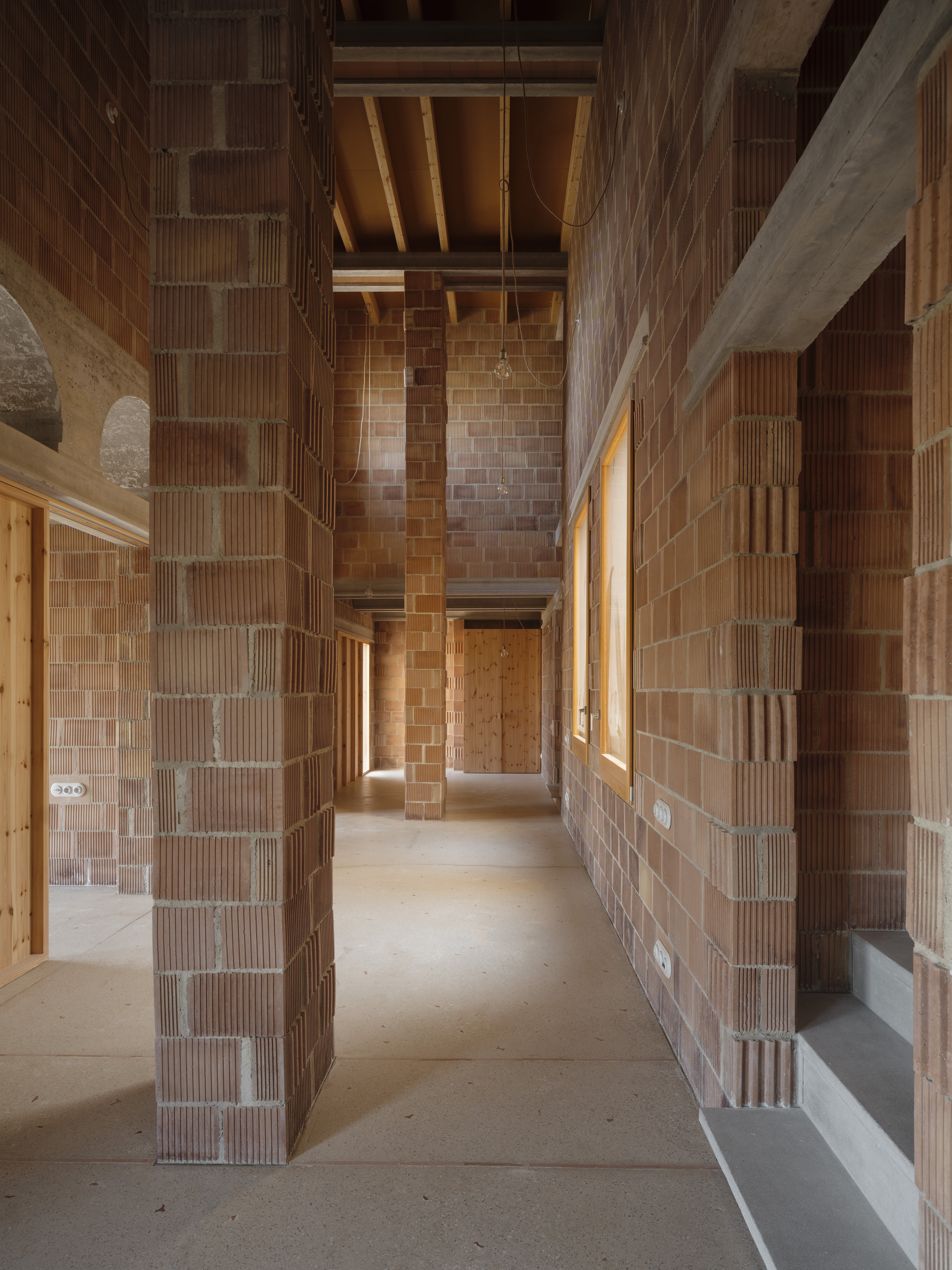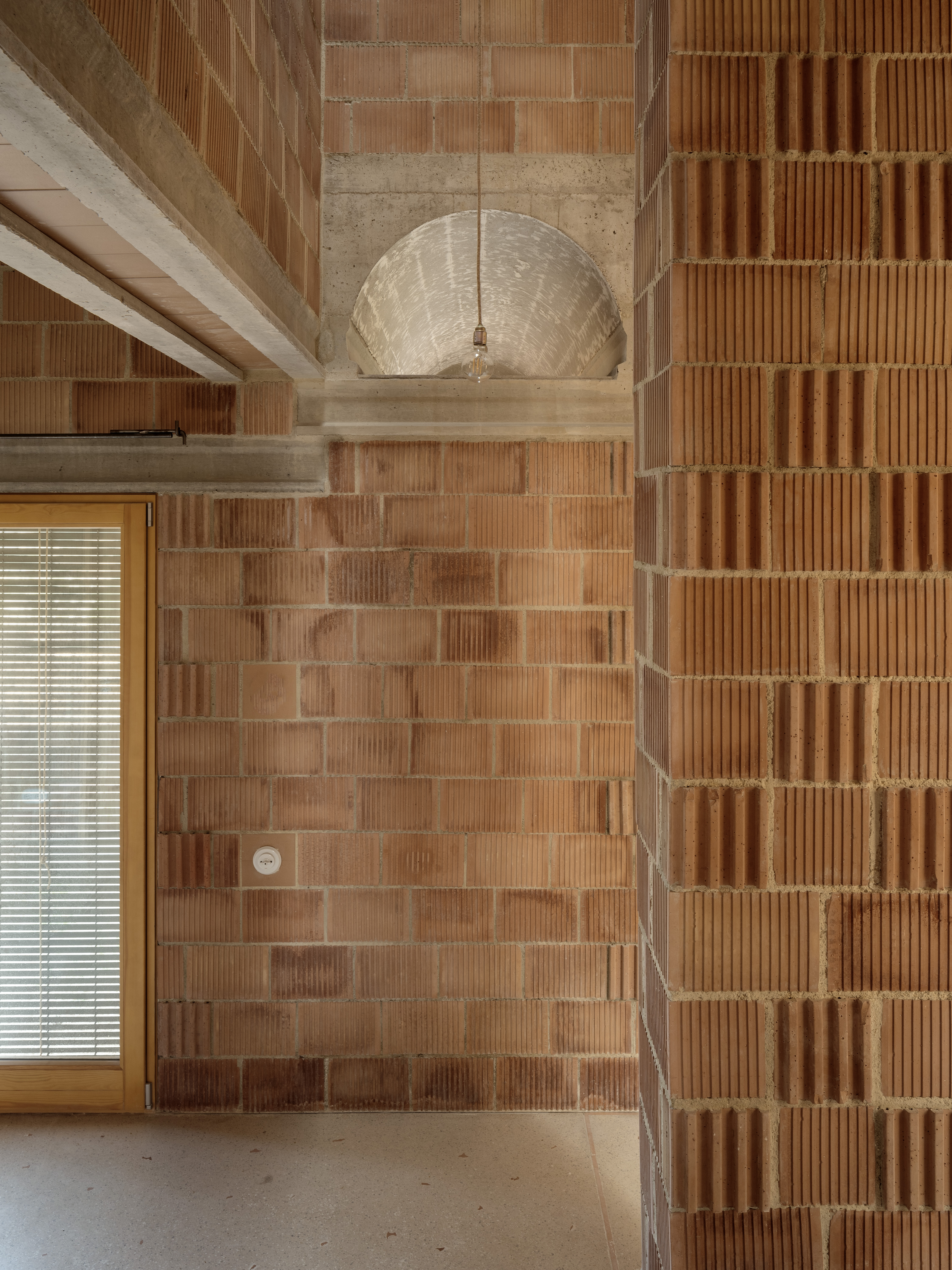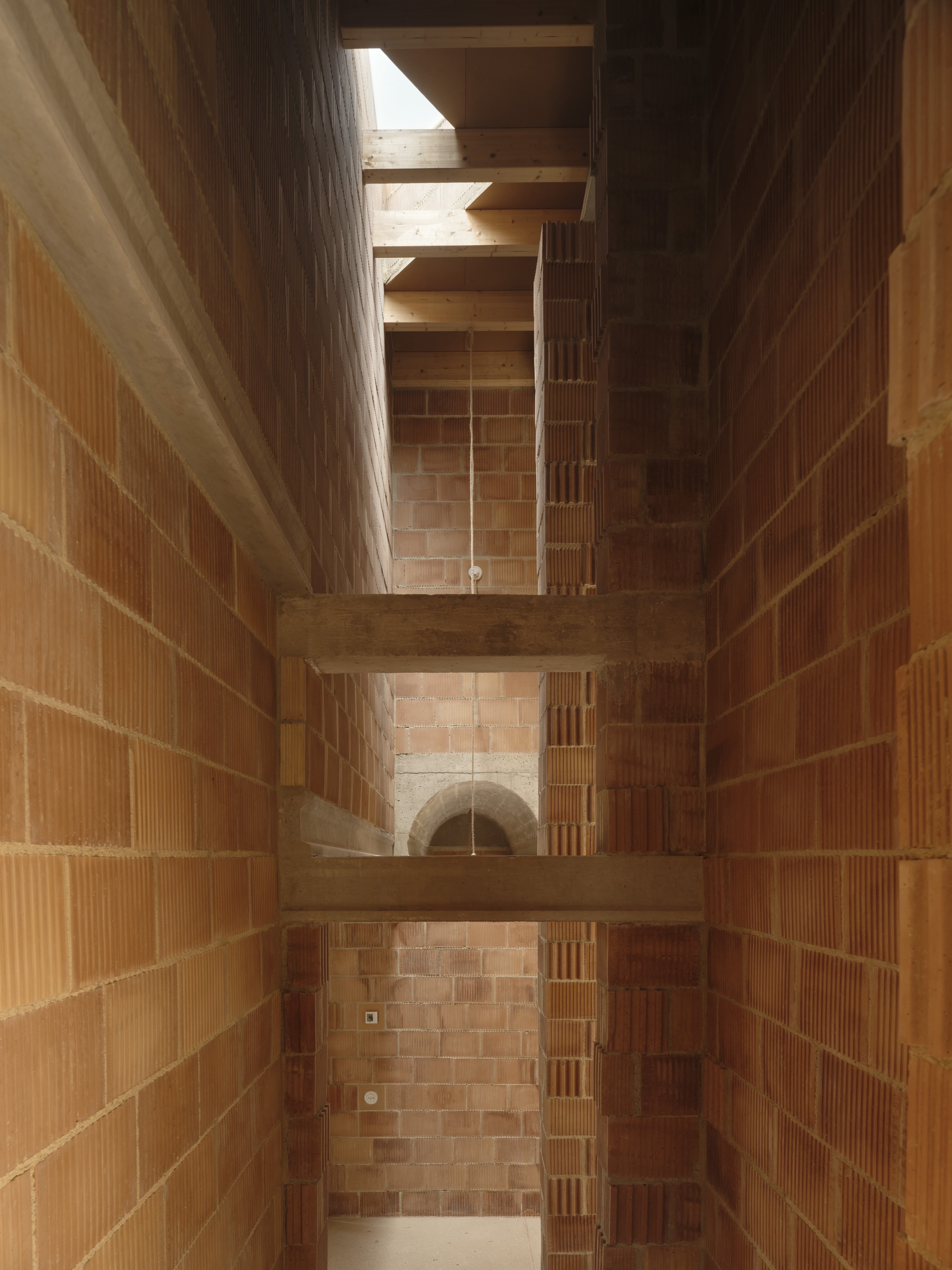 El ladrillo de fabricación local constituye la hoja interior portante, se trata de un ladrillo perforado de carga de 19x29x19cm. Con el fin de reducir los residuos y no cortar ni una sola pieza, el aparejo del ladrillo se complementa con unas piezas de ajuste provenientes de otro sistema cerámico, la termoarcilla, pero que dimensionalmente encajan y resuelven esquinas y bordes. Al mismo tiempo, este aparejo, junto con las piezas de ajuste, definen un patrón que caracteriza el interior.