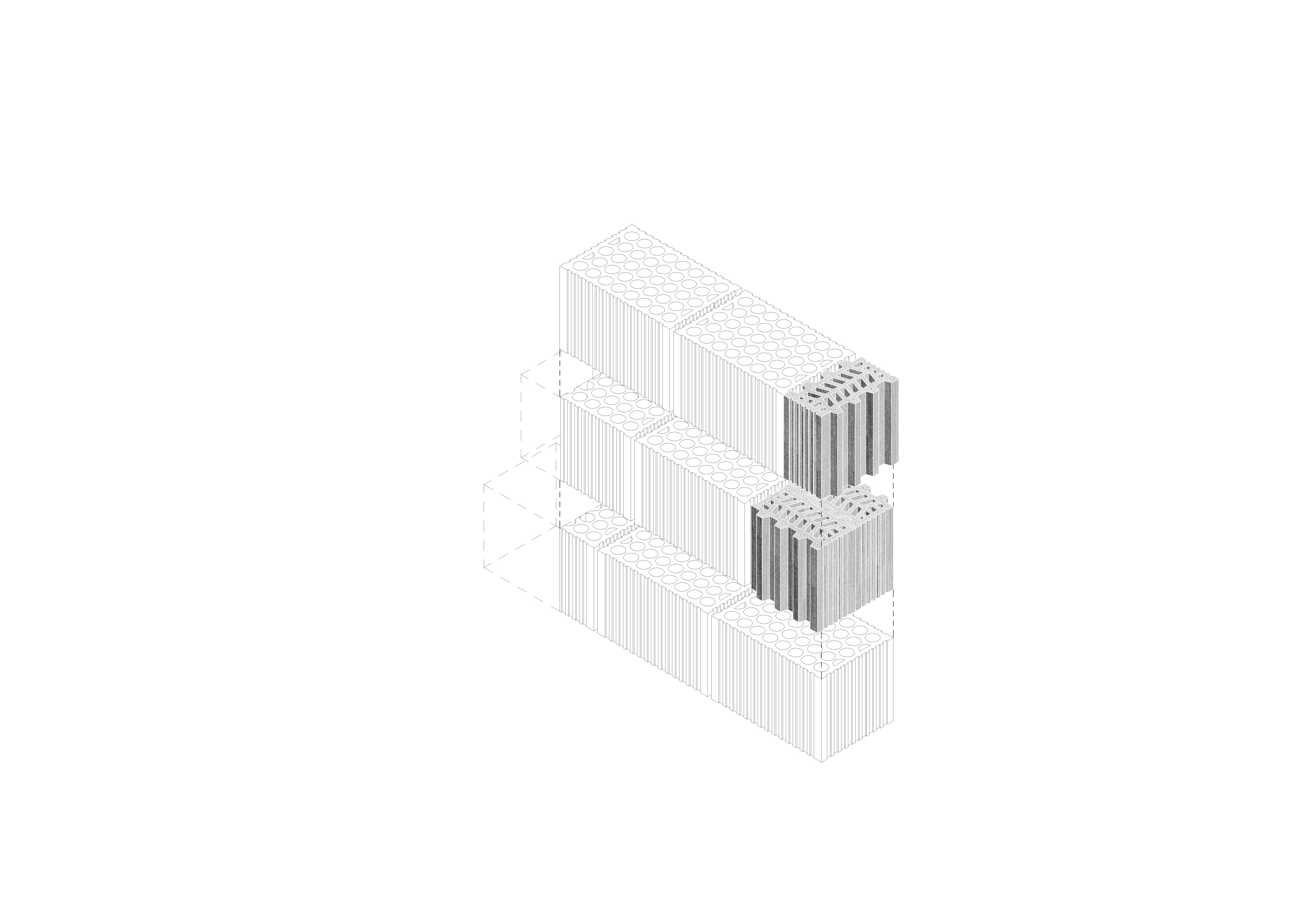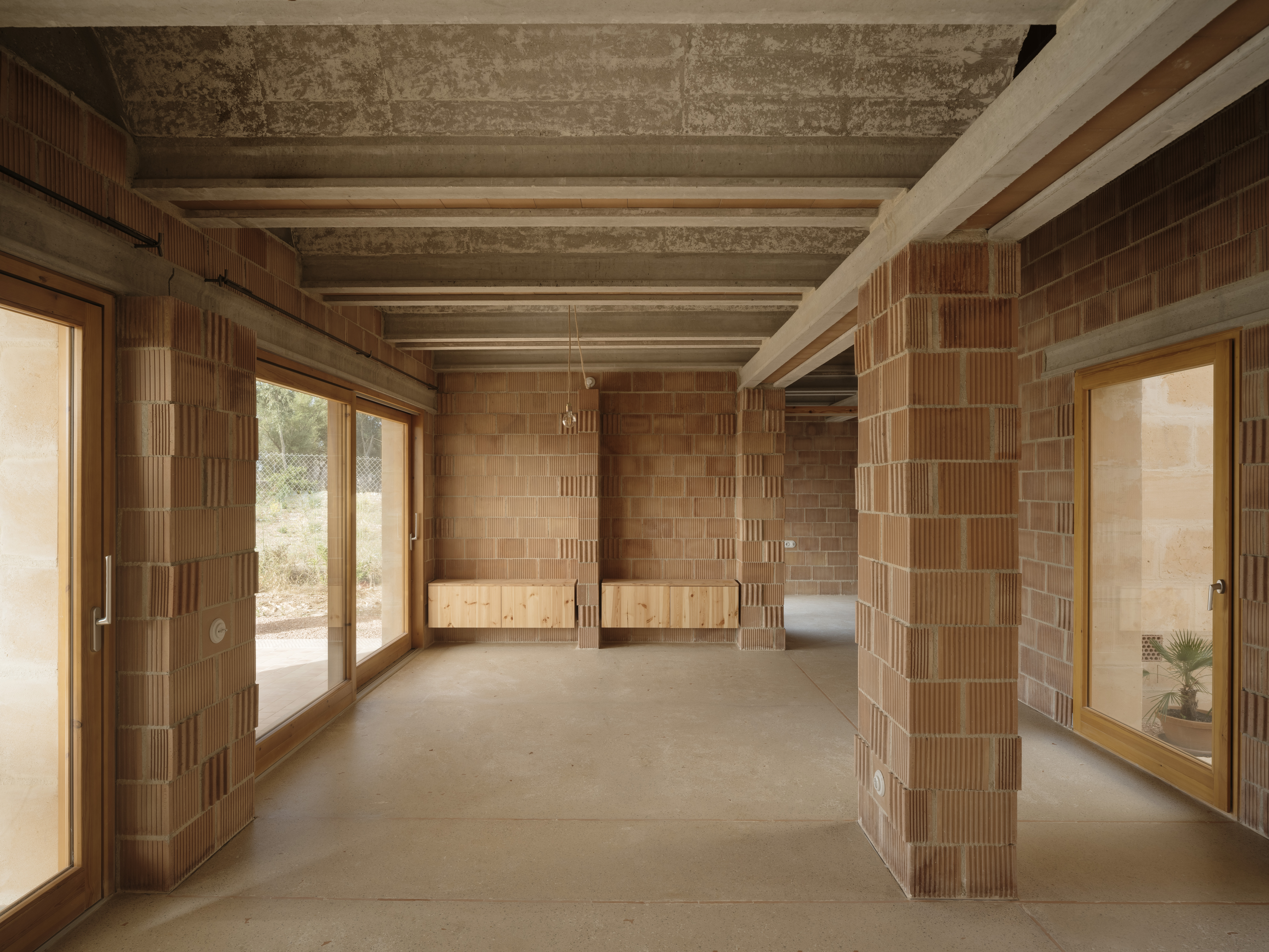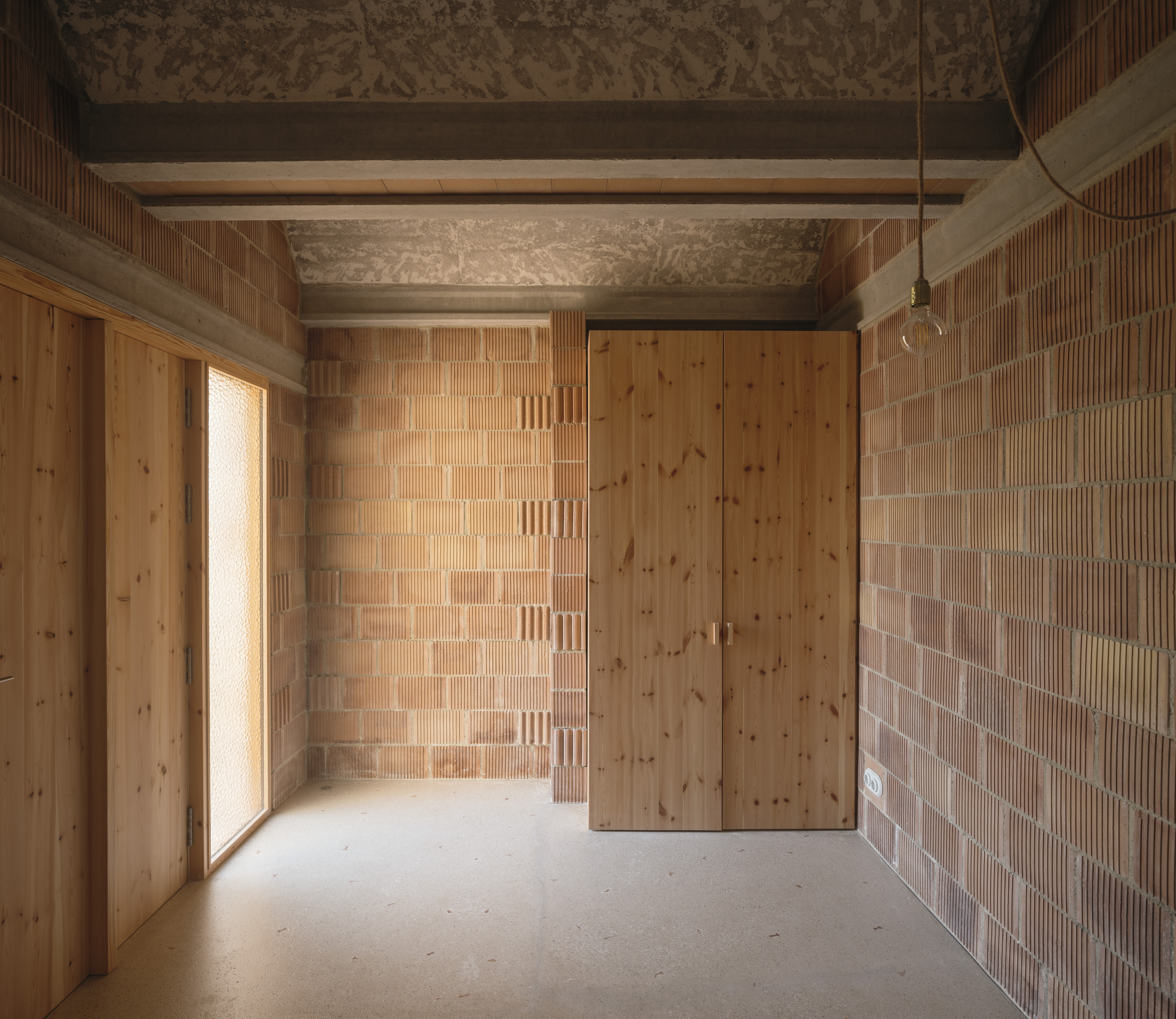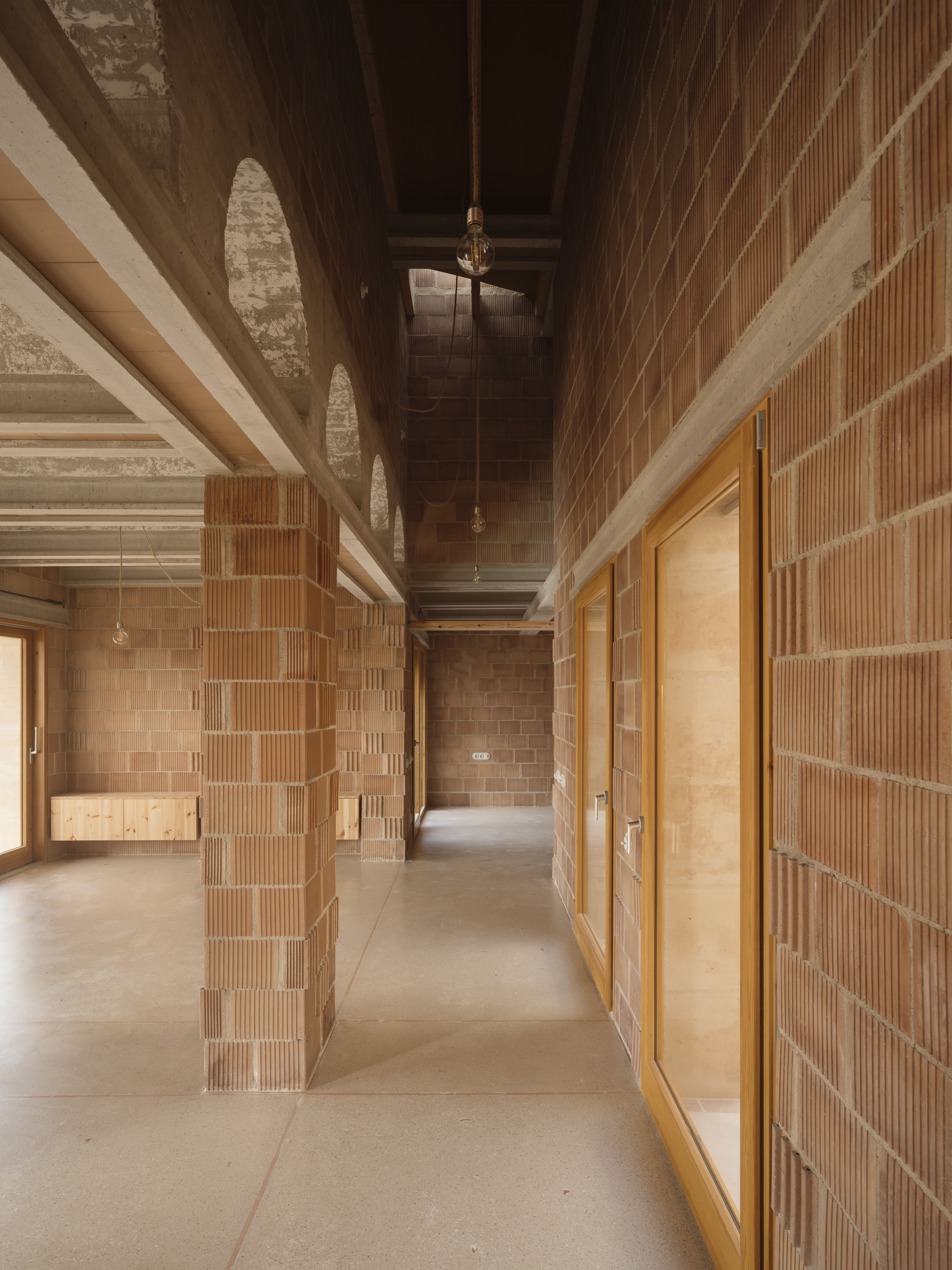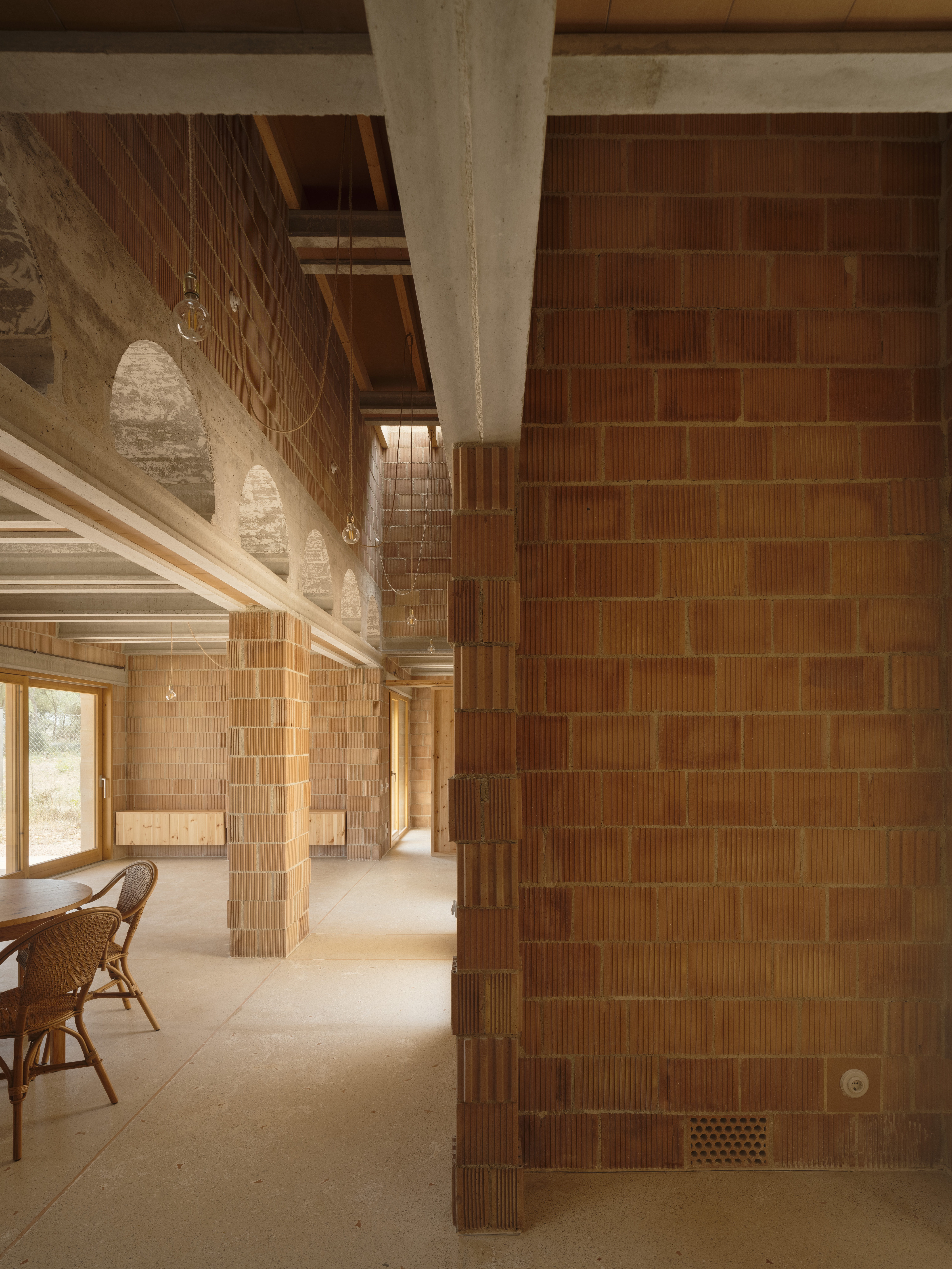 El ladrillo de fabricación local constituye la hoja interior portante, se trata de un ladrillo perforado de carga de 19x29x19cm. Con el fin de reducir los residuos y no cortar ni una sola pieza, el aparejo del ladrillo se complementa con unas piezas de ajuste provenientes de otro sistema cerámico, la termoarcilla, pero que dimensionalmente encajan y resuelven esquinas y bordes. Al mismo tiempo, este aparejo, junto con las piezas de ajuste, definen un patrón que caracteriza el interior.