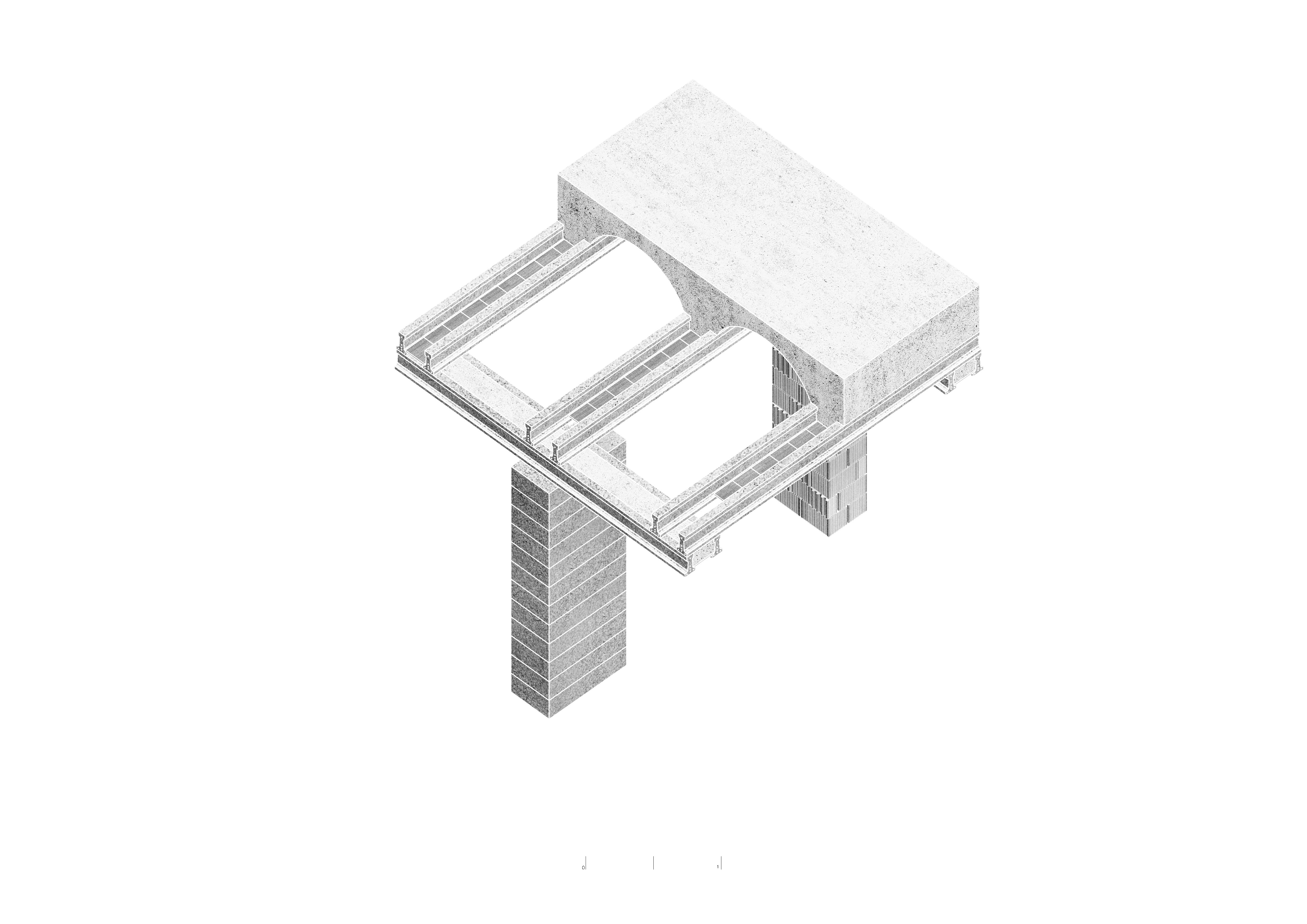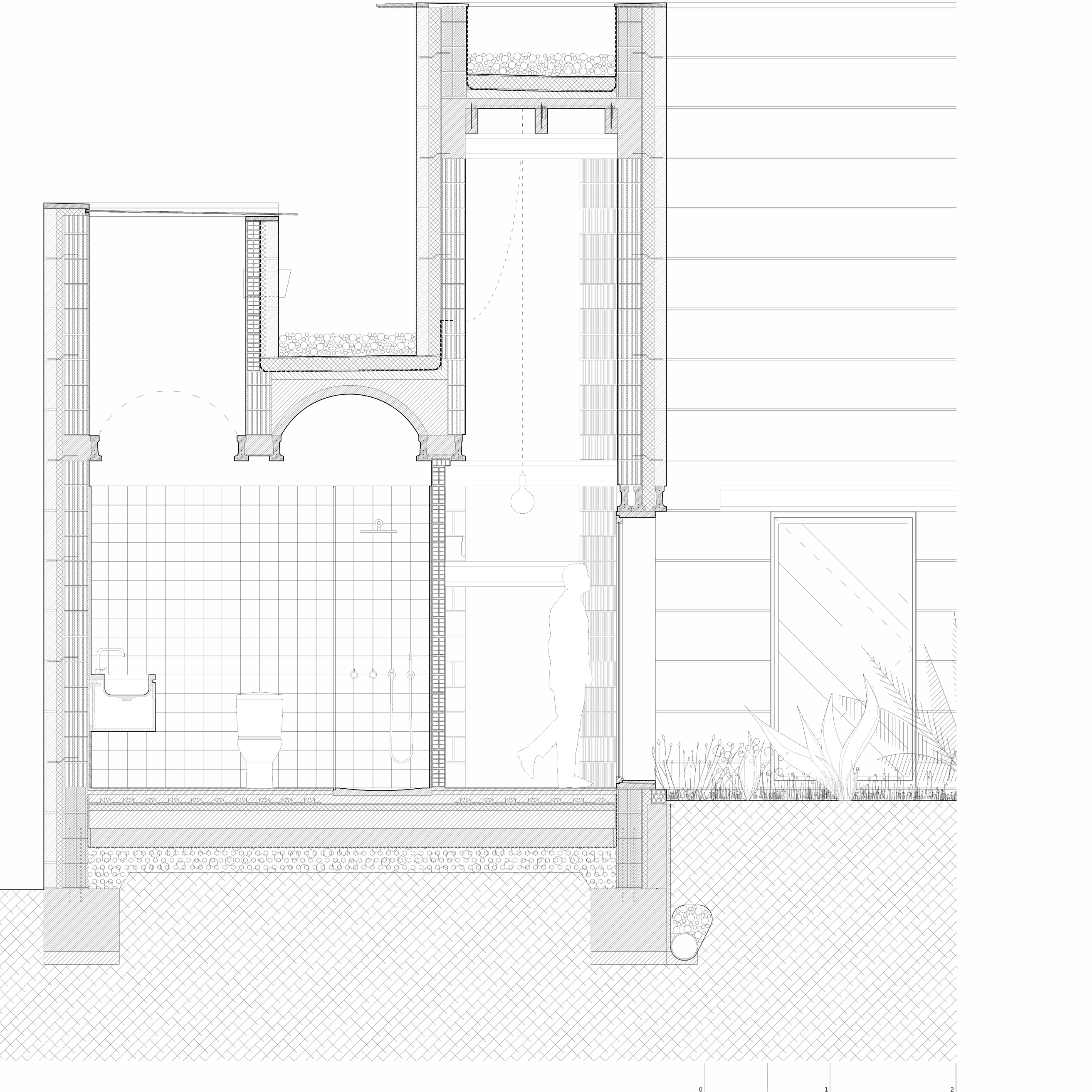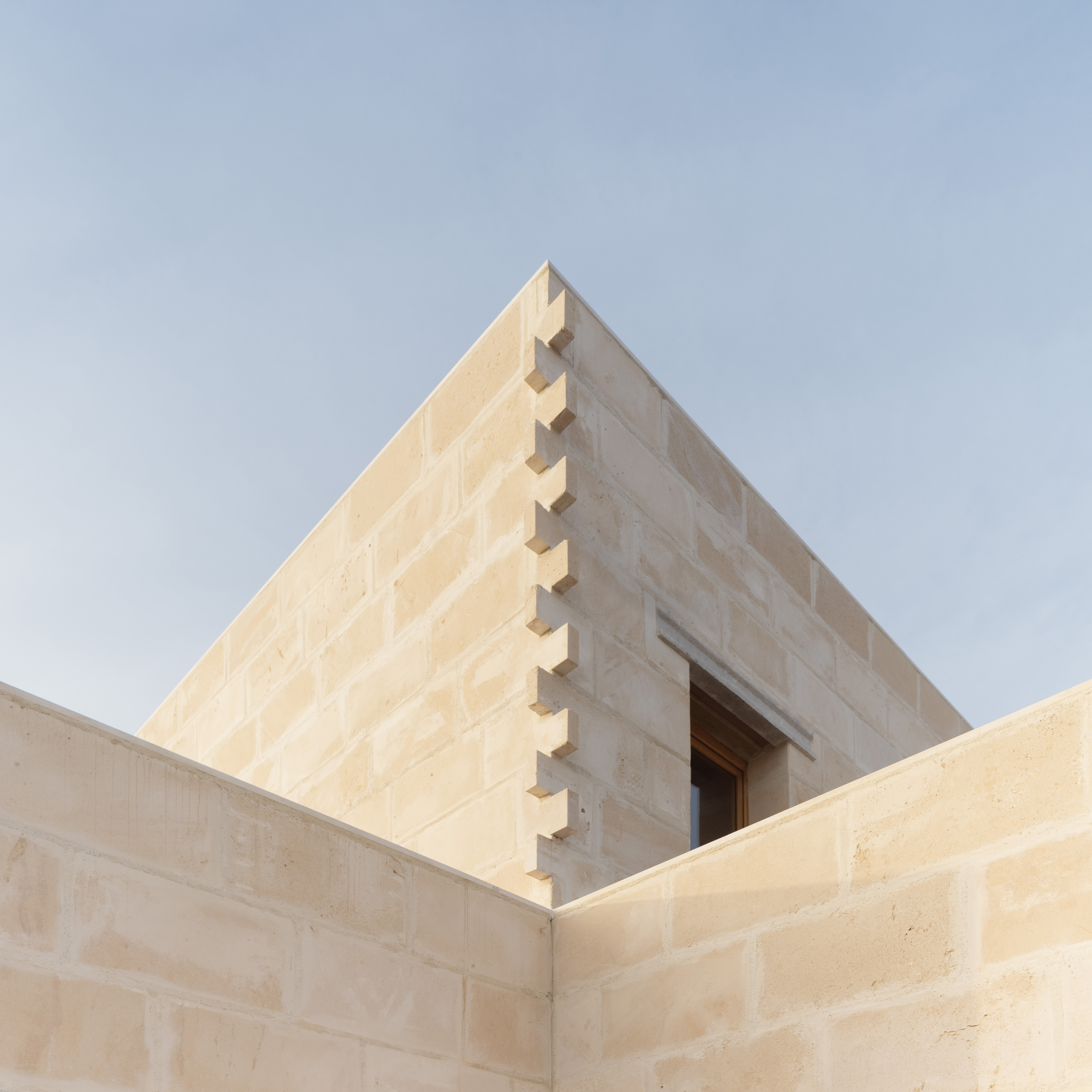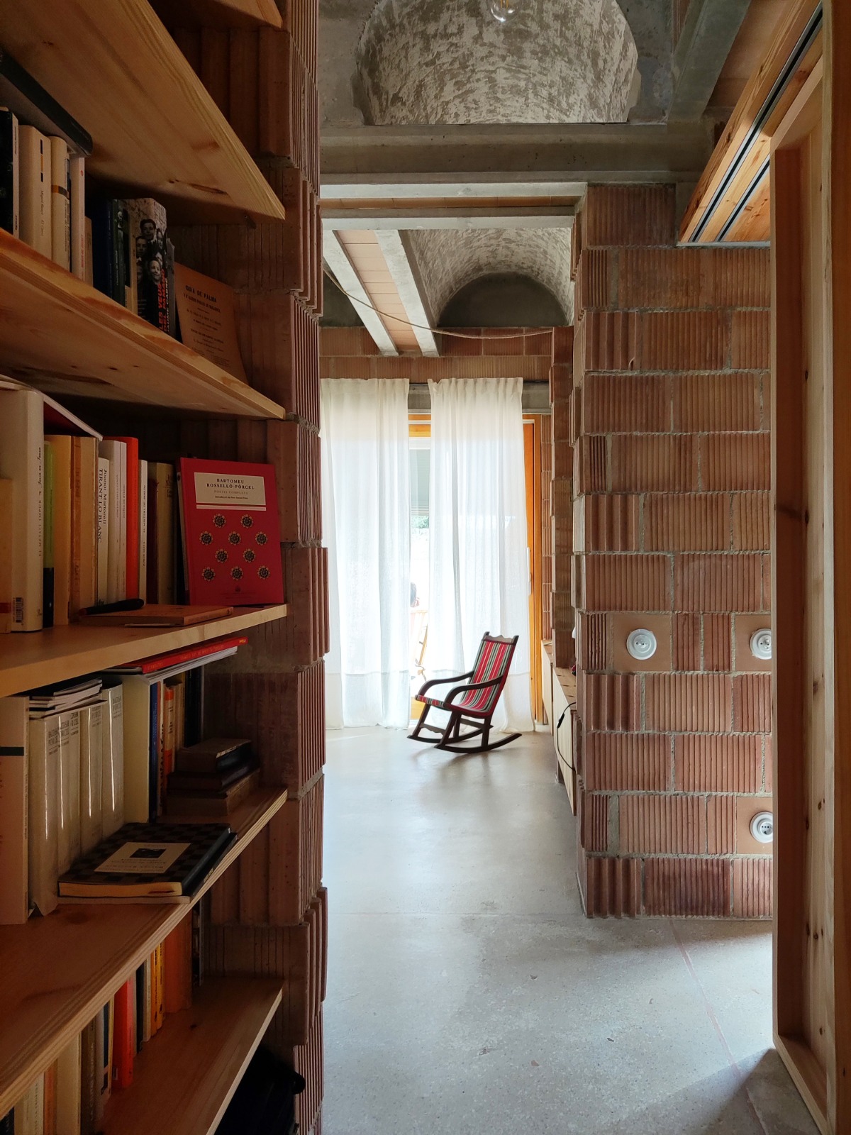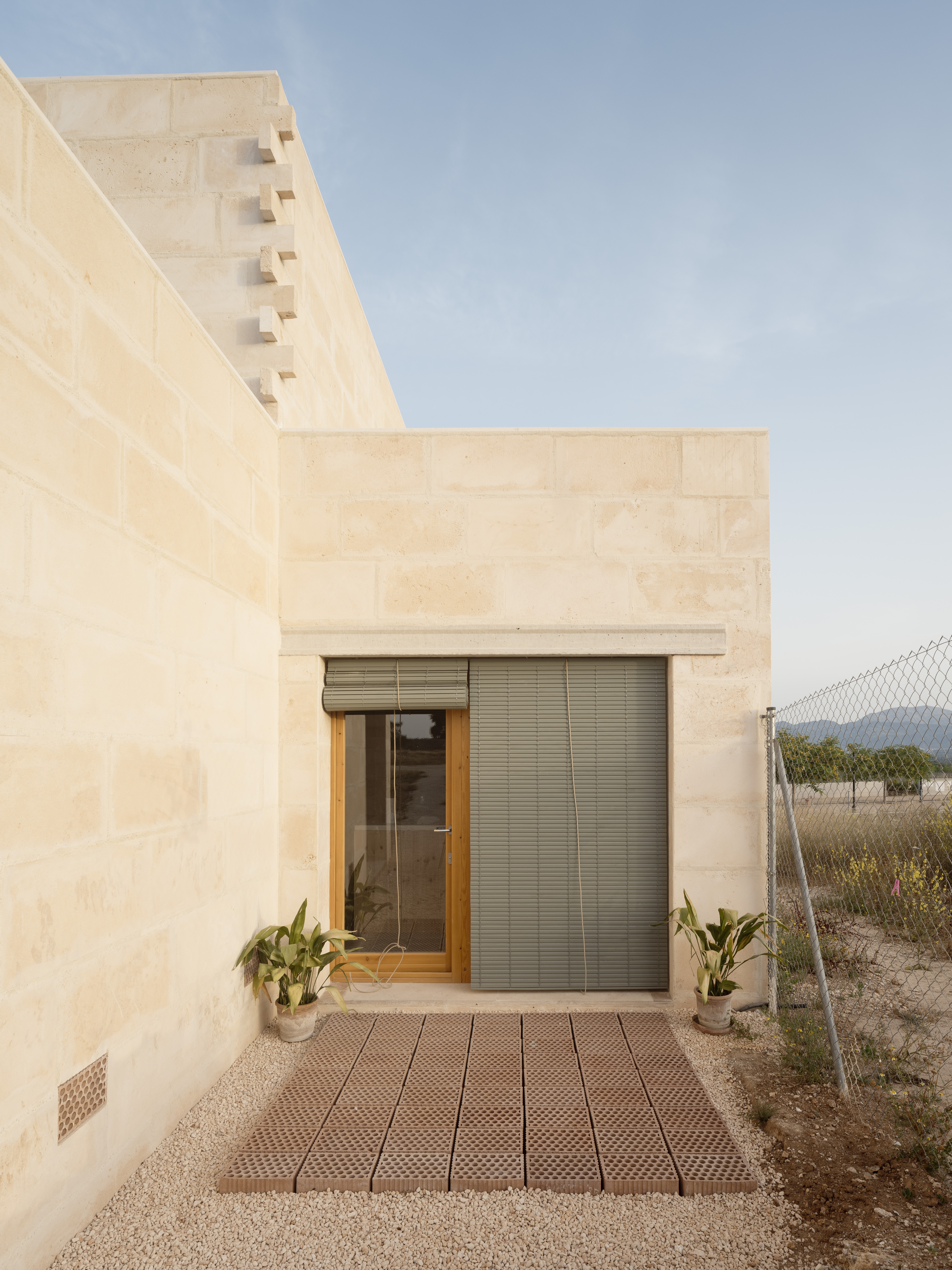 El ladrillo de fabricación local constituye la hoja interior portante, se trata de un ladrillo perforado de carga de 19x29x19cm. Con el fin de reducir los residuos y no cortar ni una sola pieza, el aparejo del ladrillo se complementa con unas piezas de ajuste provenientes de otro sistema cerámico, la termoarcilla, pero que dimensionalmente encajan y resuelven esquinas y bordes. Al mismo tiempo, este aparejo, junto con las piezas de ajuste, definen un patrón que caracteriza el interior.