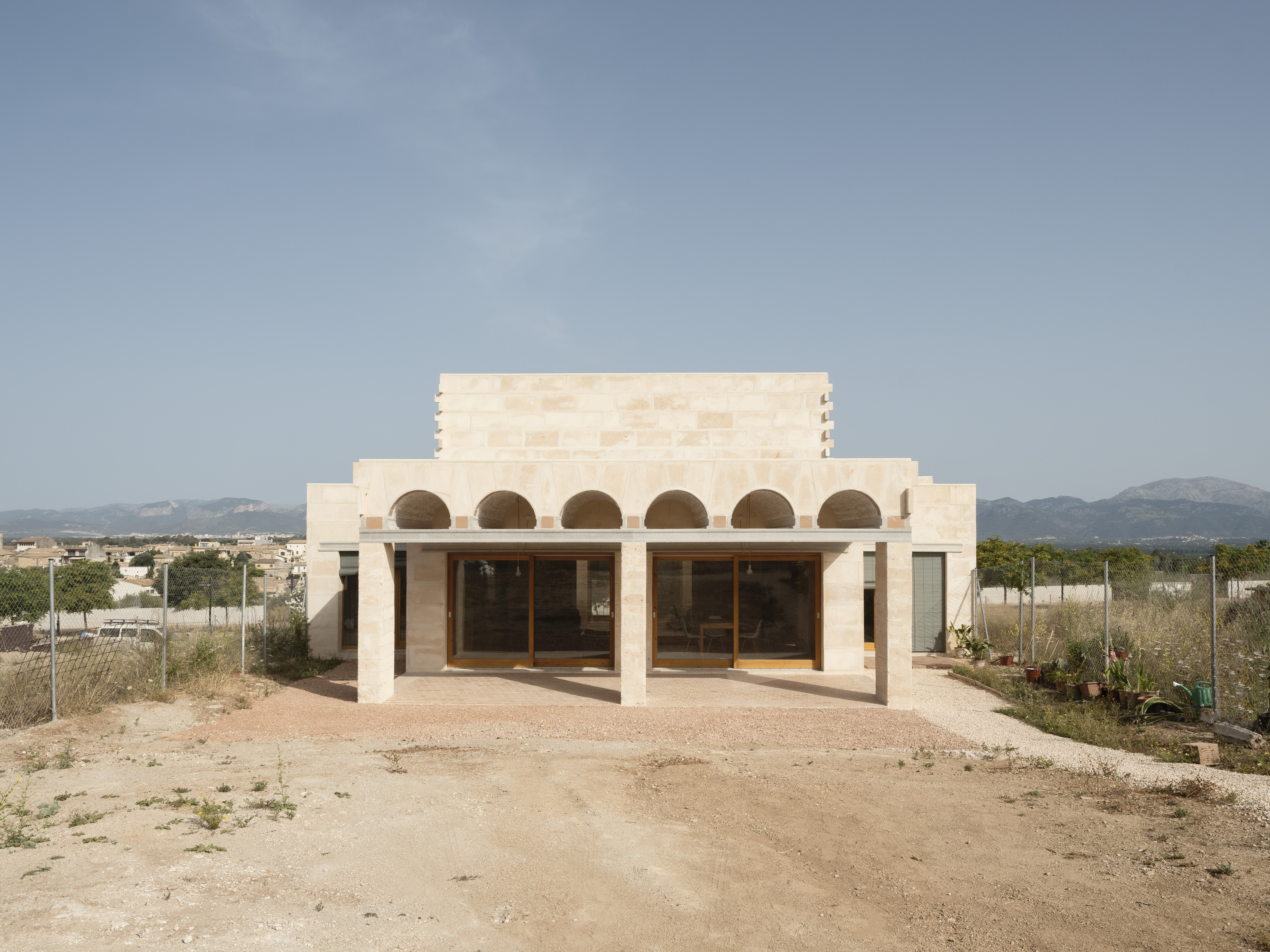 La parcela es de proporciones alargadas, en sentido norte-sur. Al norte tenemos la calle de acceso y vistas hacia la sierra de Tramuntana. Al sur tenemos el espacio exterior más privado, además del sol y el embat, la brisa marina que en los días más calurosos sopla de mar a tierra.