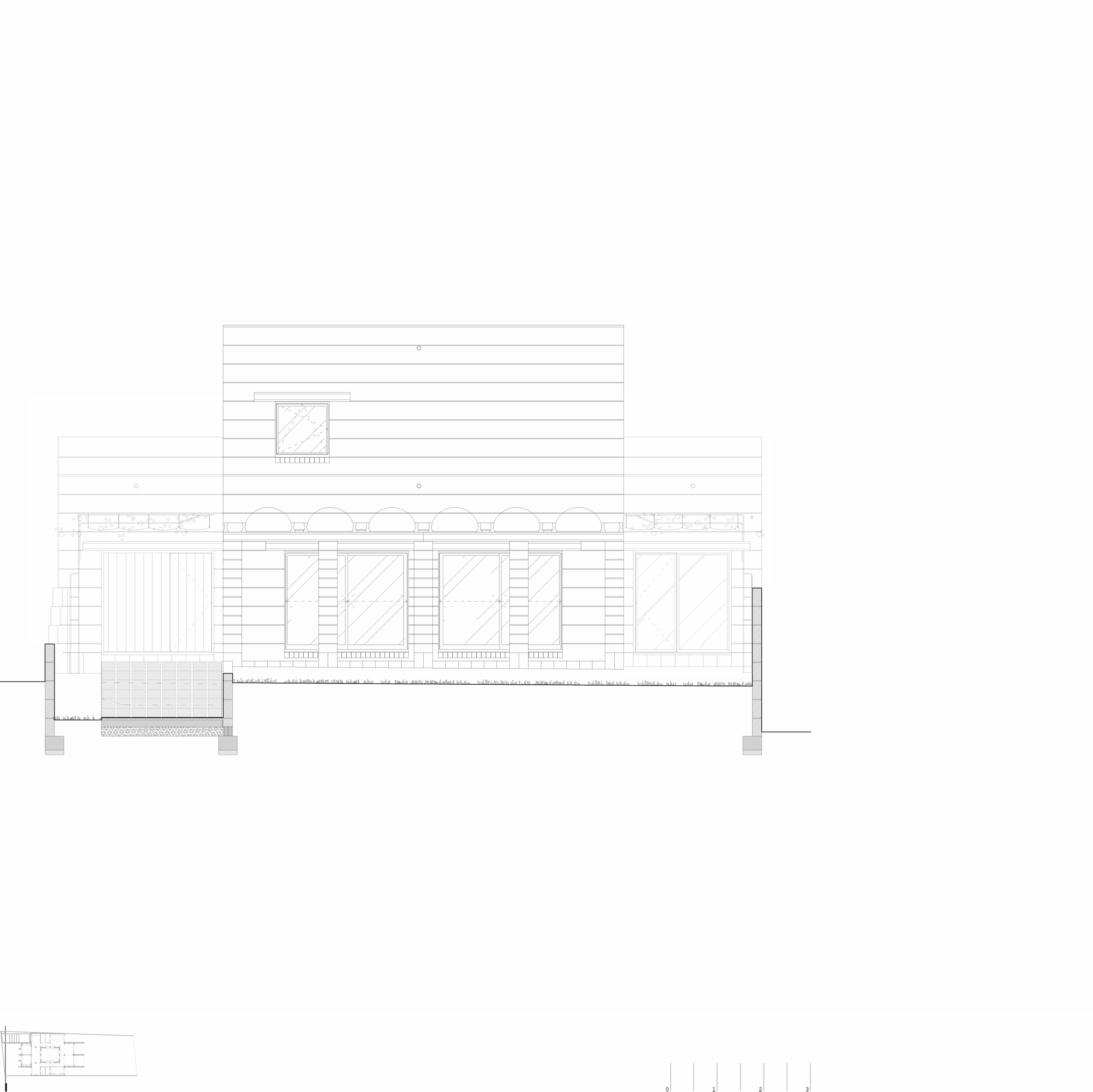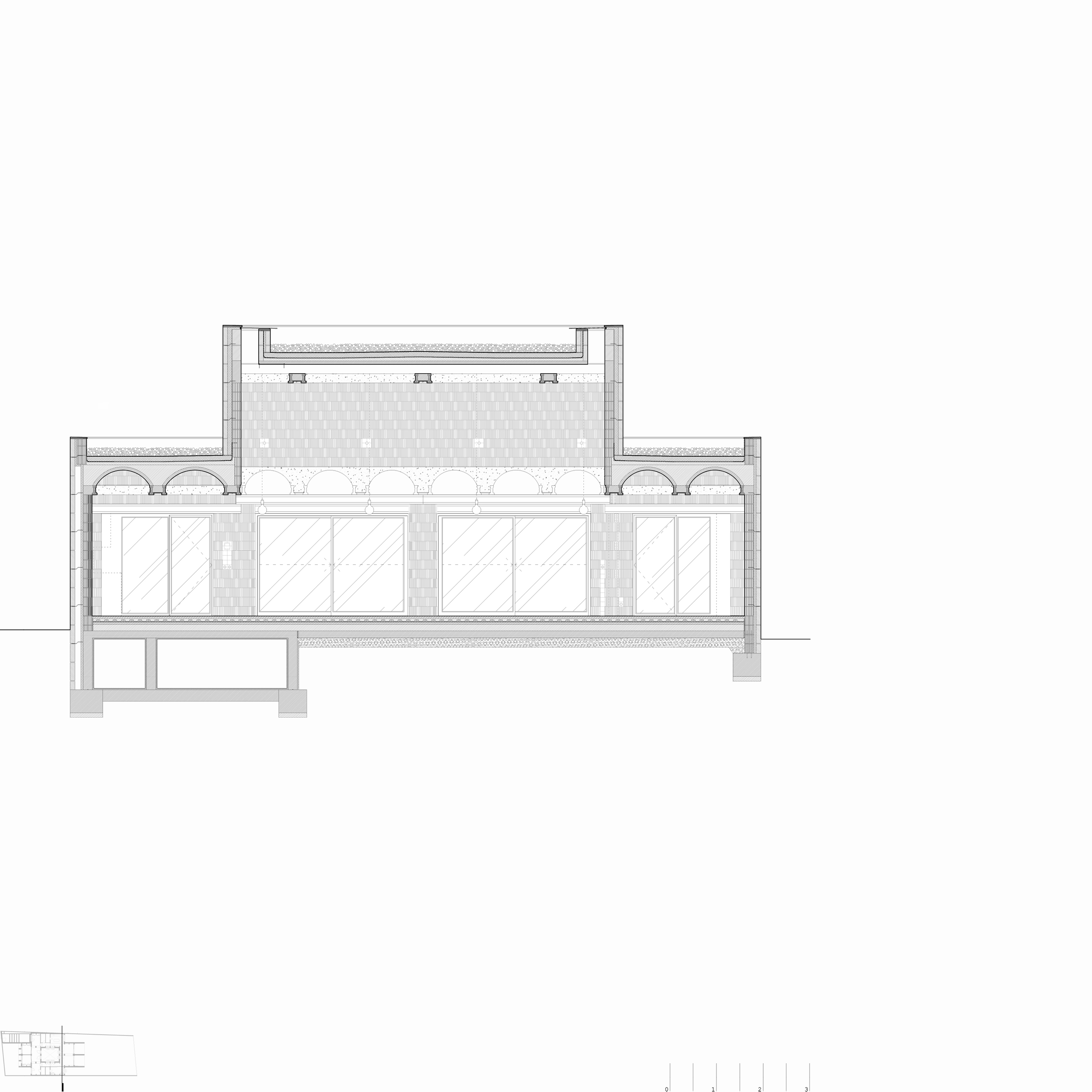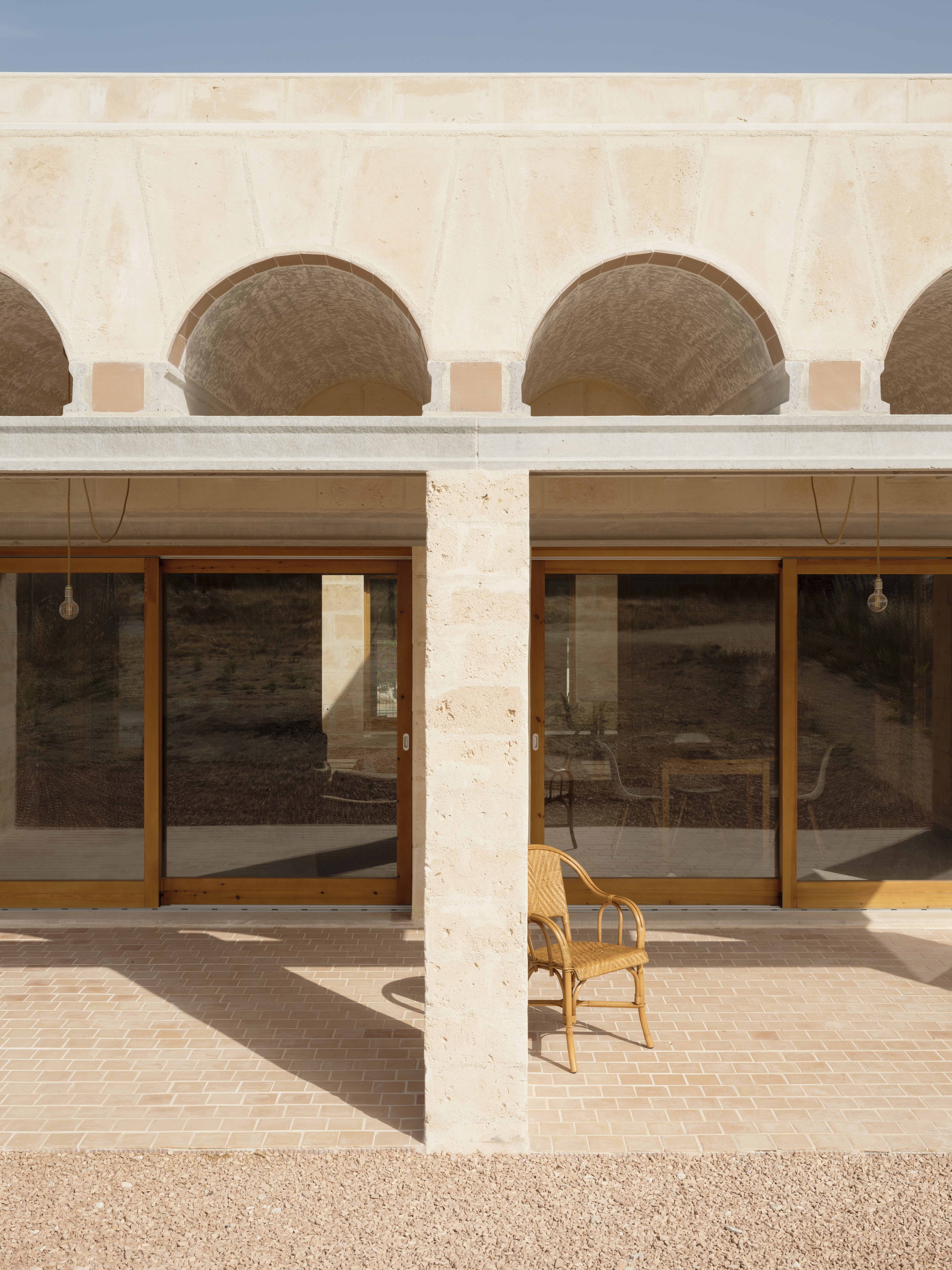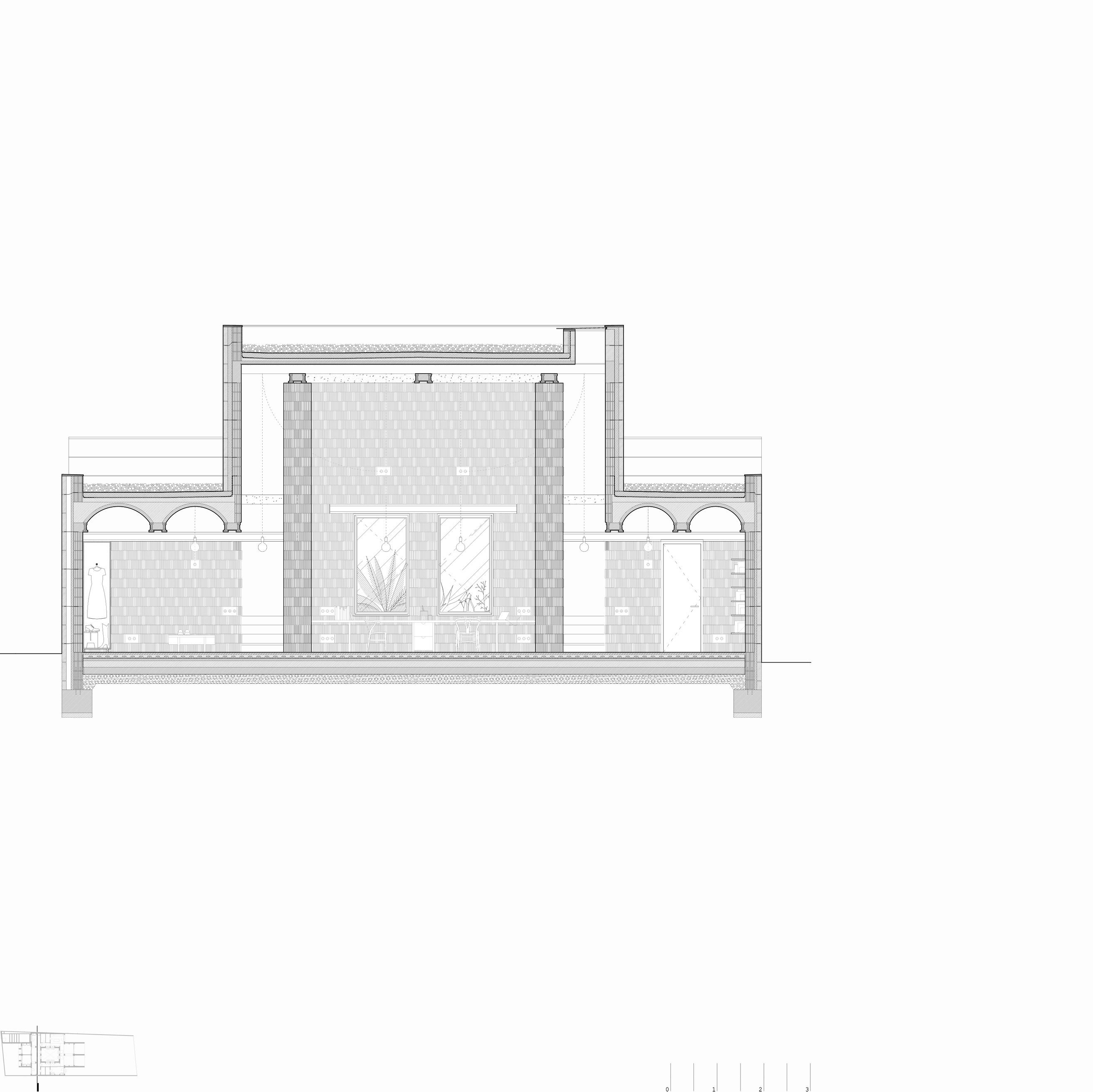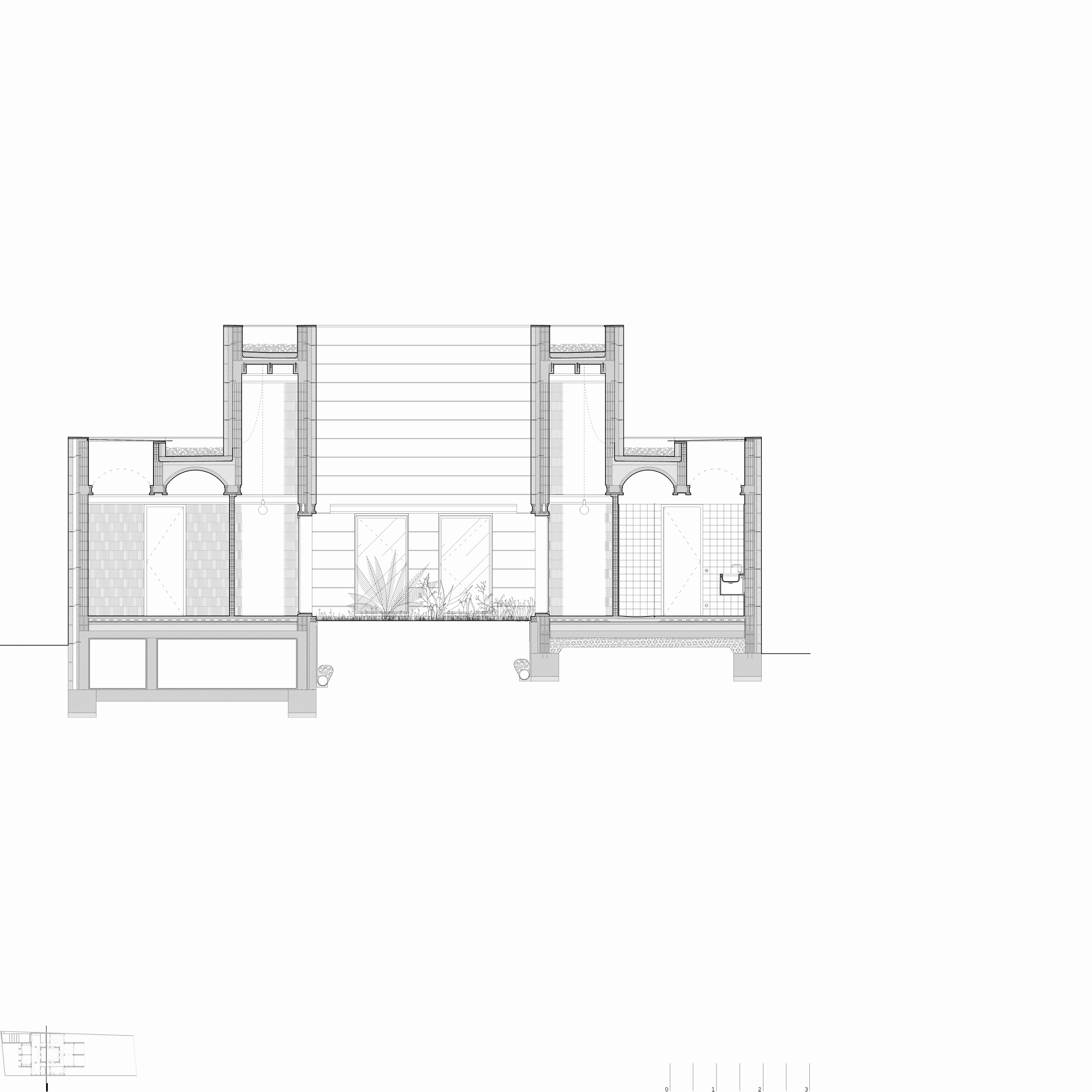 La propuesta se ordena siguiendo el sentido longitudinal de la parcela. Así es como la estructura de muros portantes y las pequeñas bóvedas siguen la dirección larga del solar, permitiendo las vistas hacia las montañas y acompañando el movimiento de la brisa.