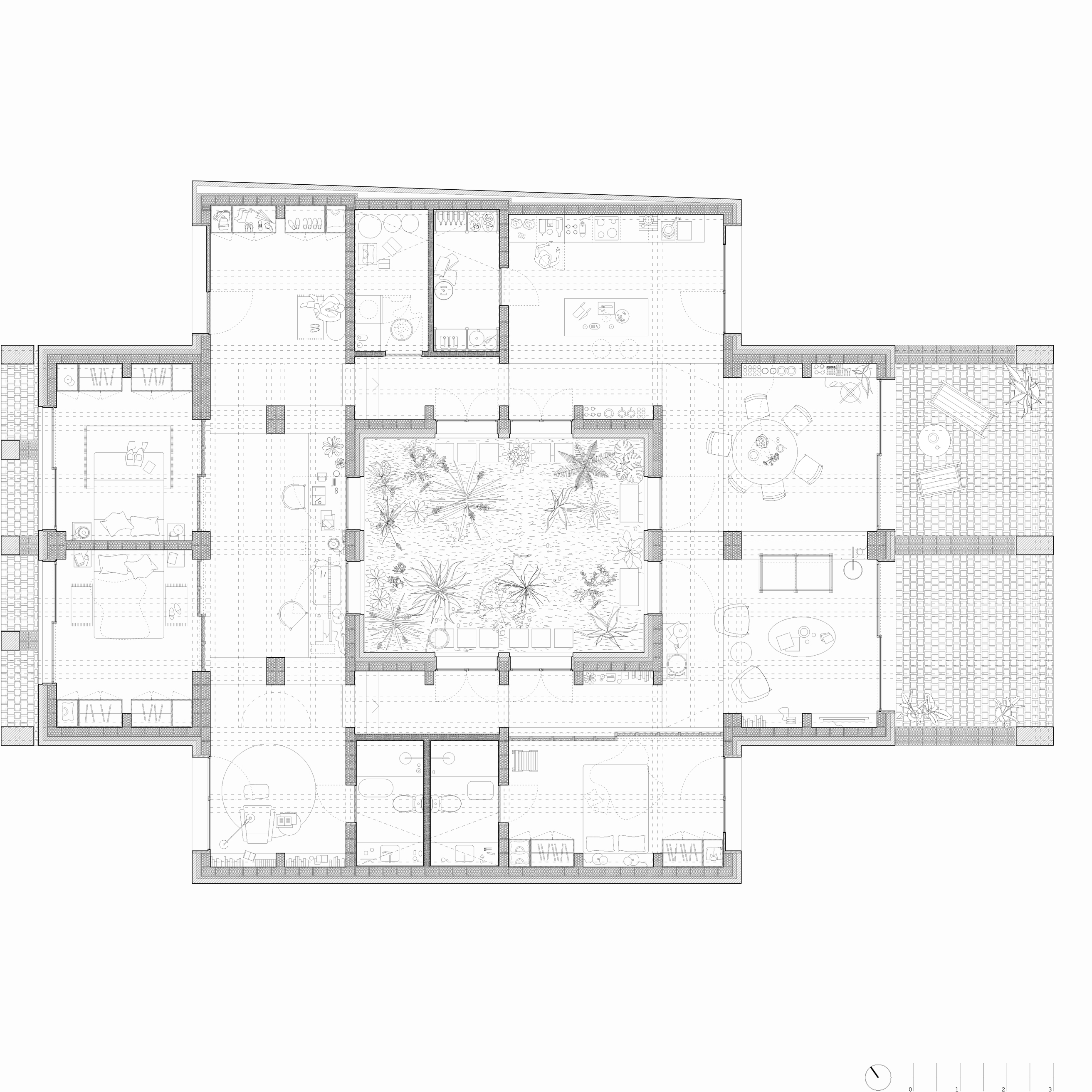 Una casa patio que recoge las estrategias tipológicas y climáticas tradicionales y se adapta a las particularidades concretas del solar.