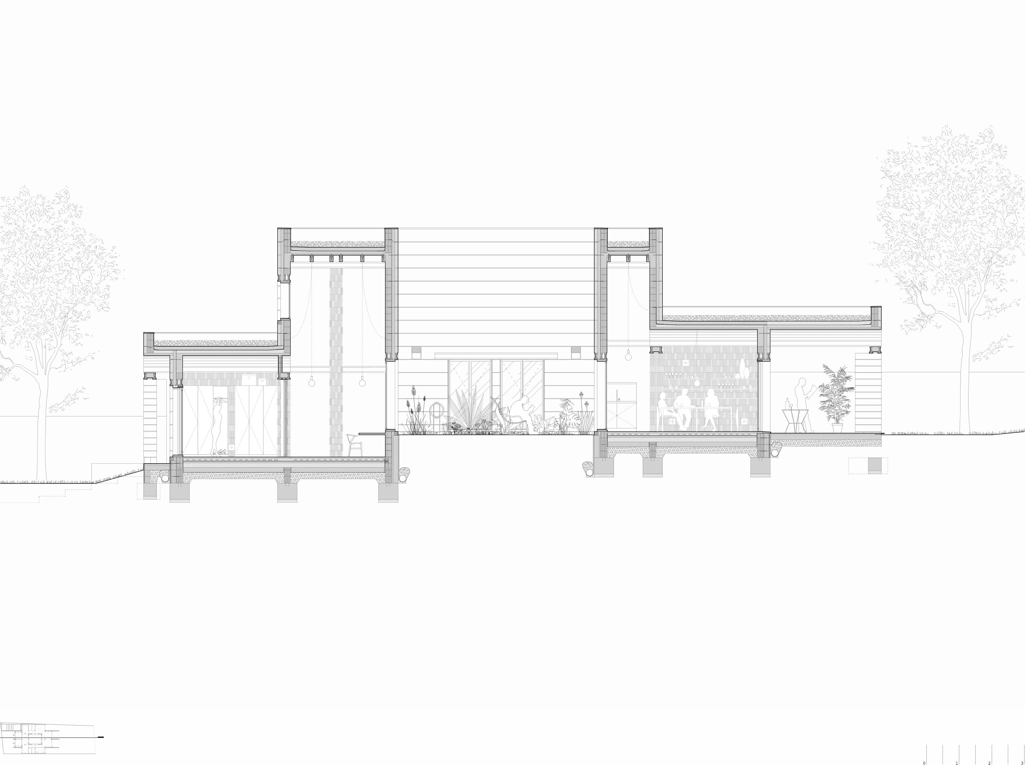 Así mismo, la propuesta se adapta al salto topográfico que existe entre la parte anterior y posterior del solar, minimizando los trabajos de excavación y definiendo diferentes relaciones con el patio además de enriquecer el espacio interior.
