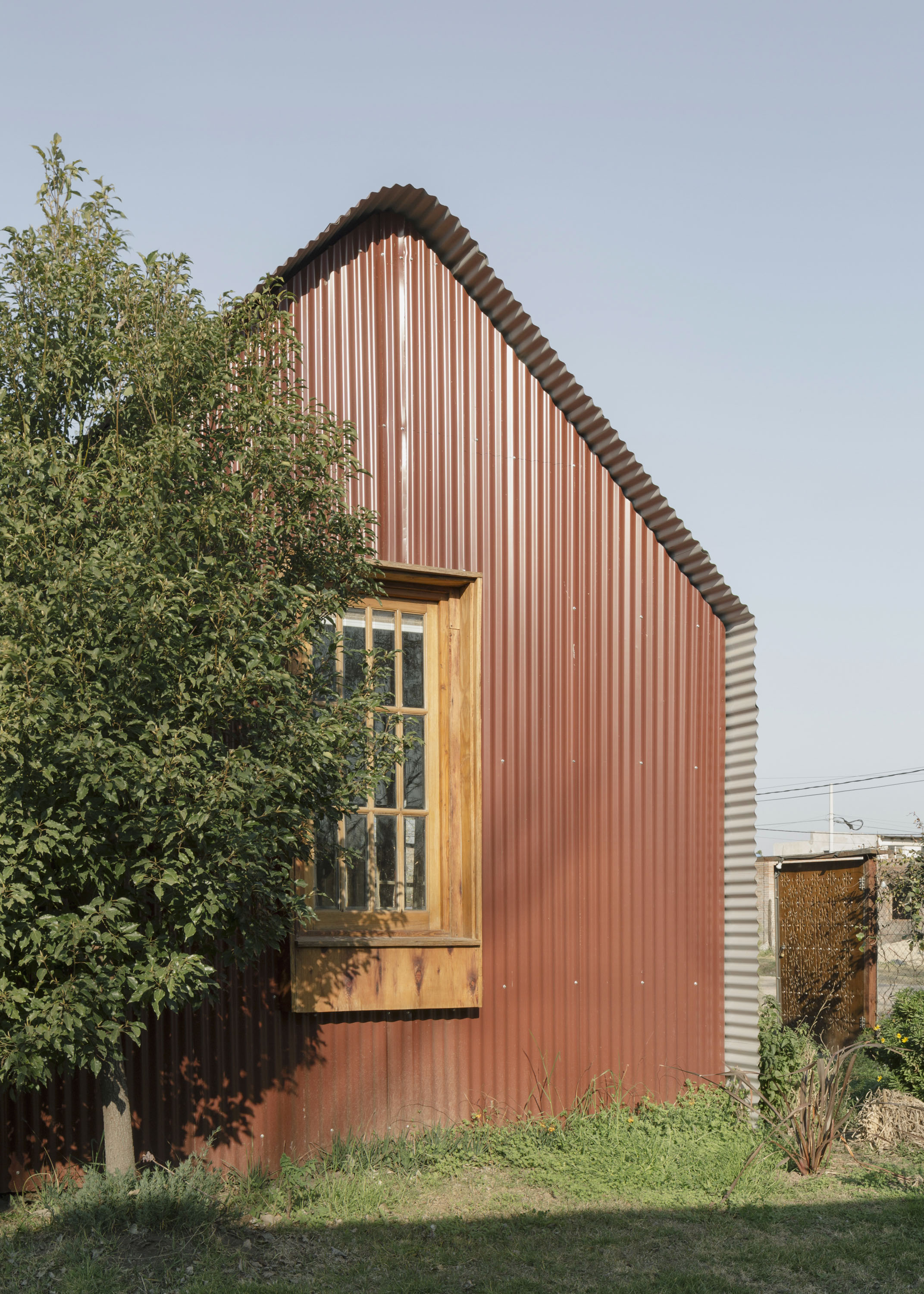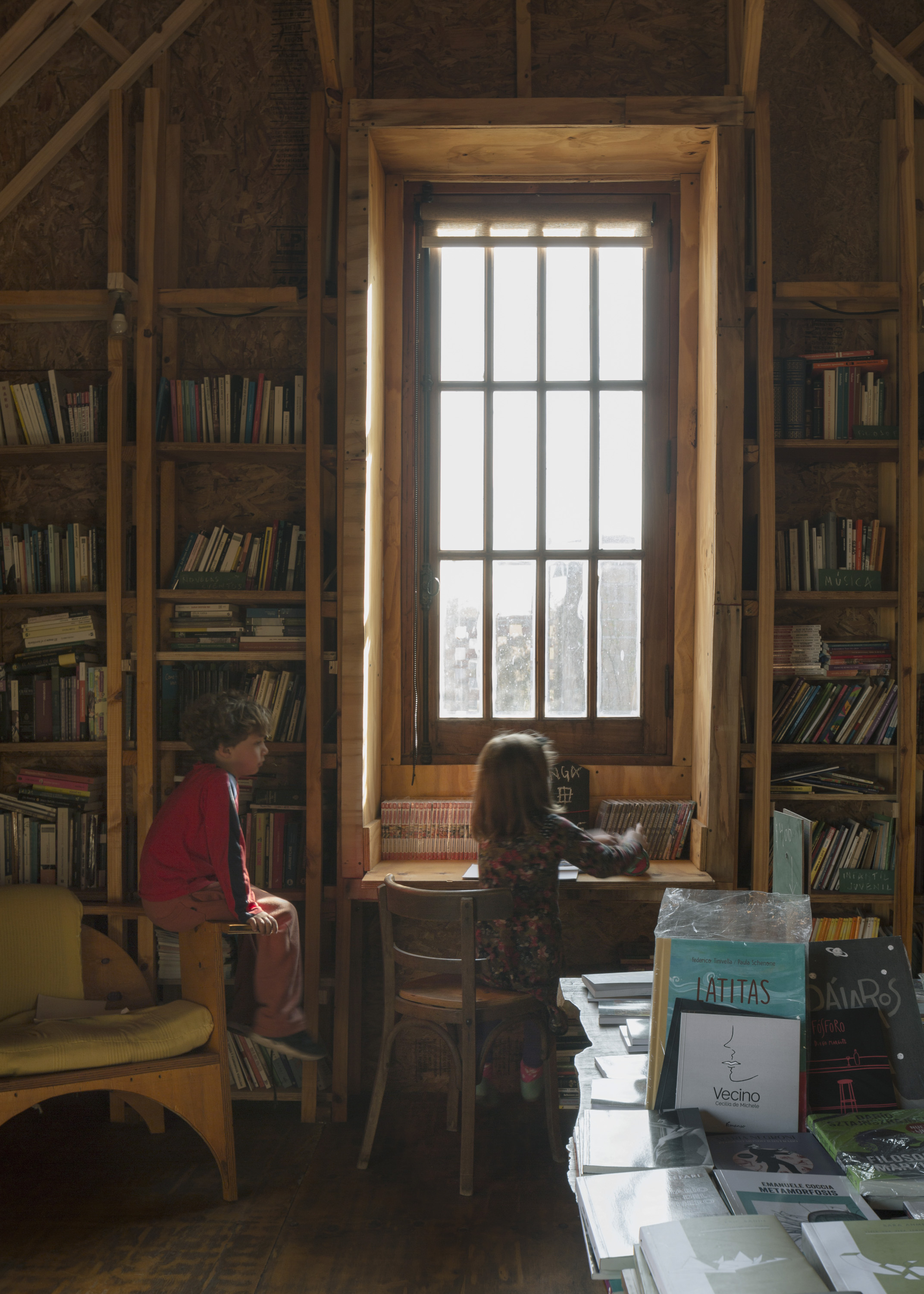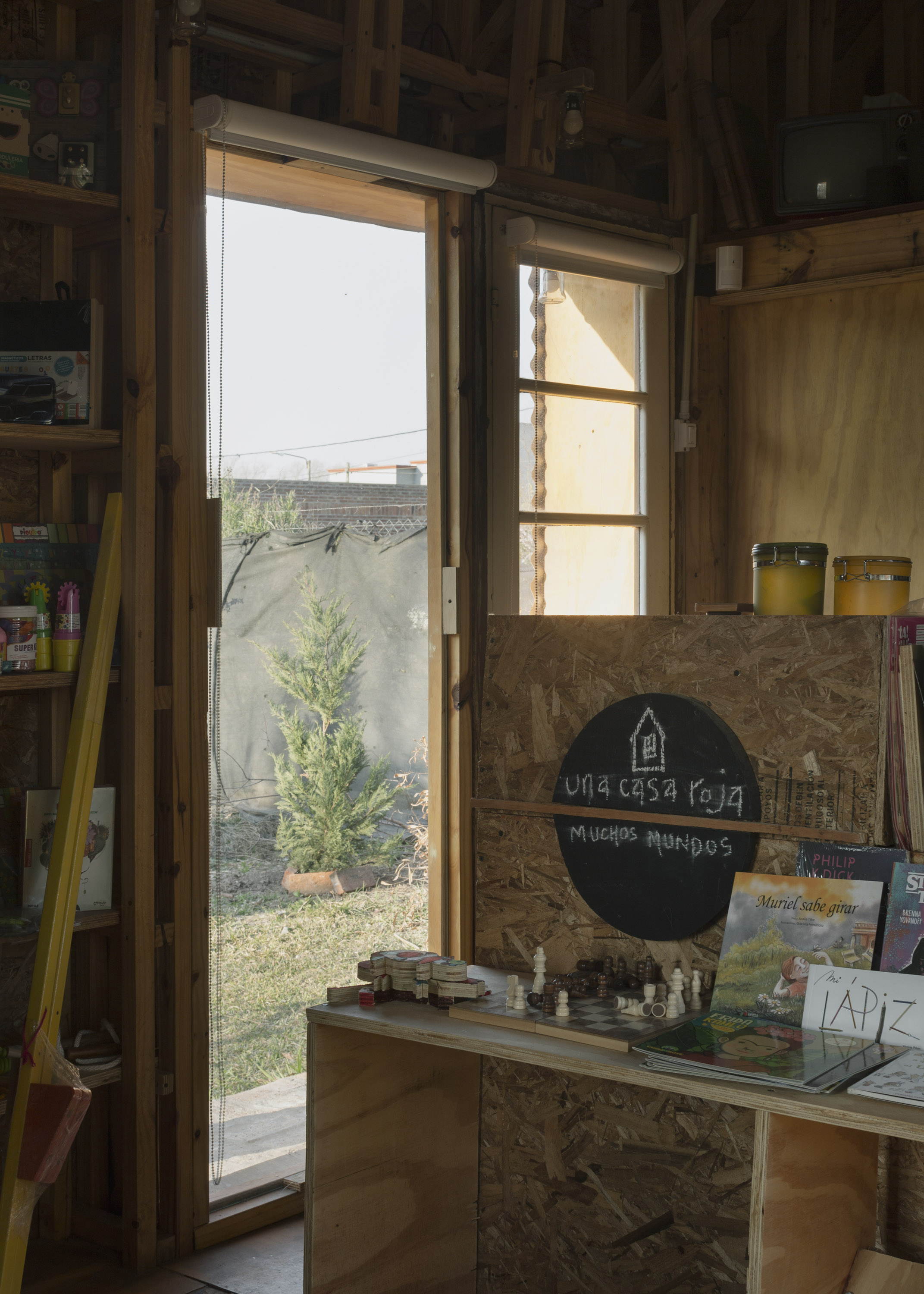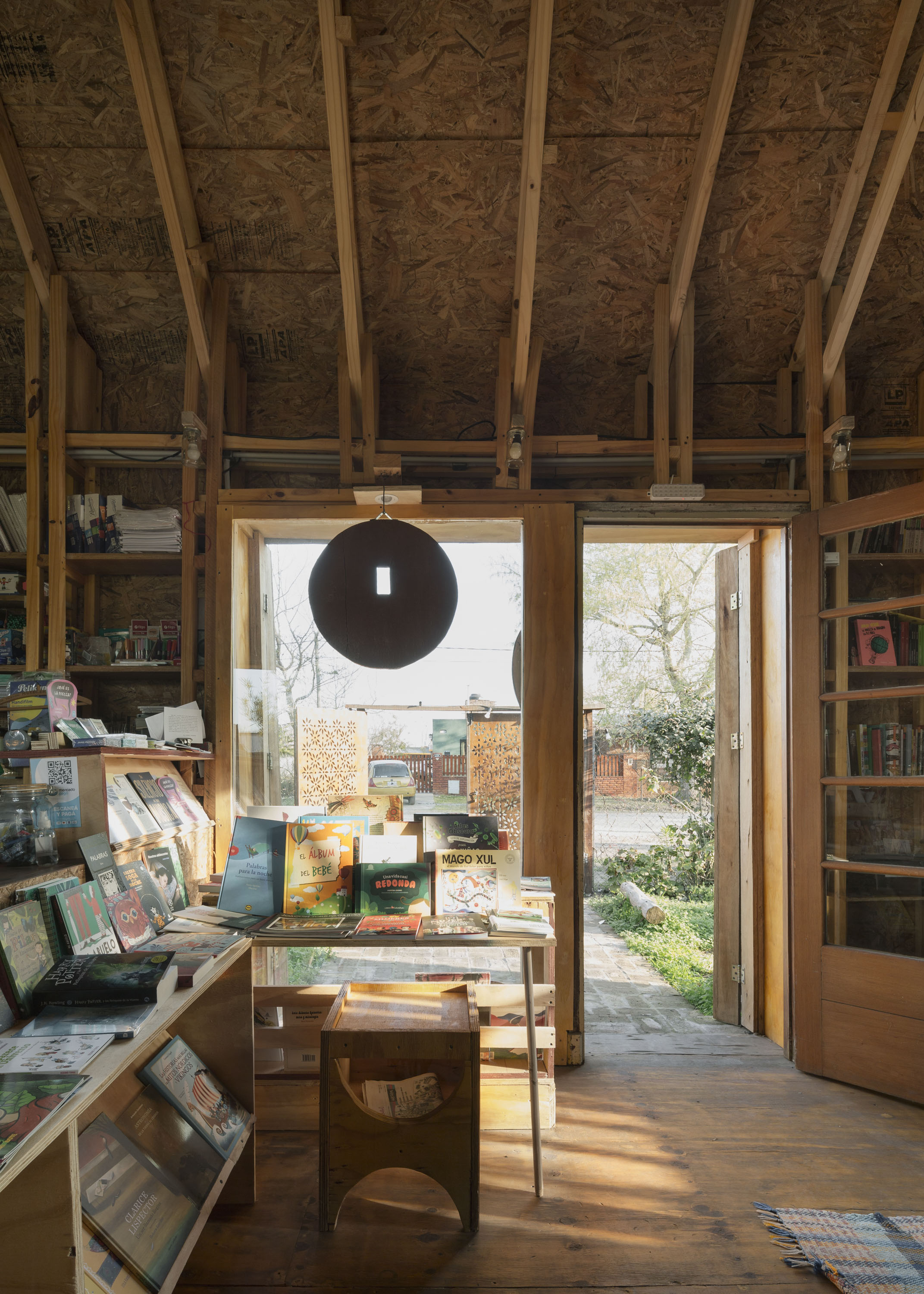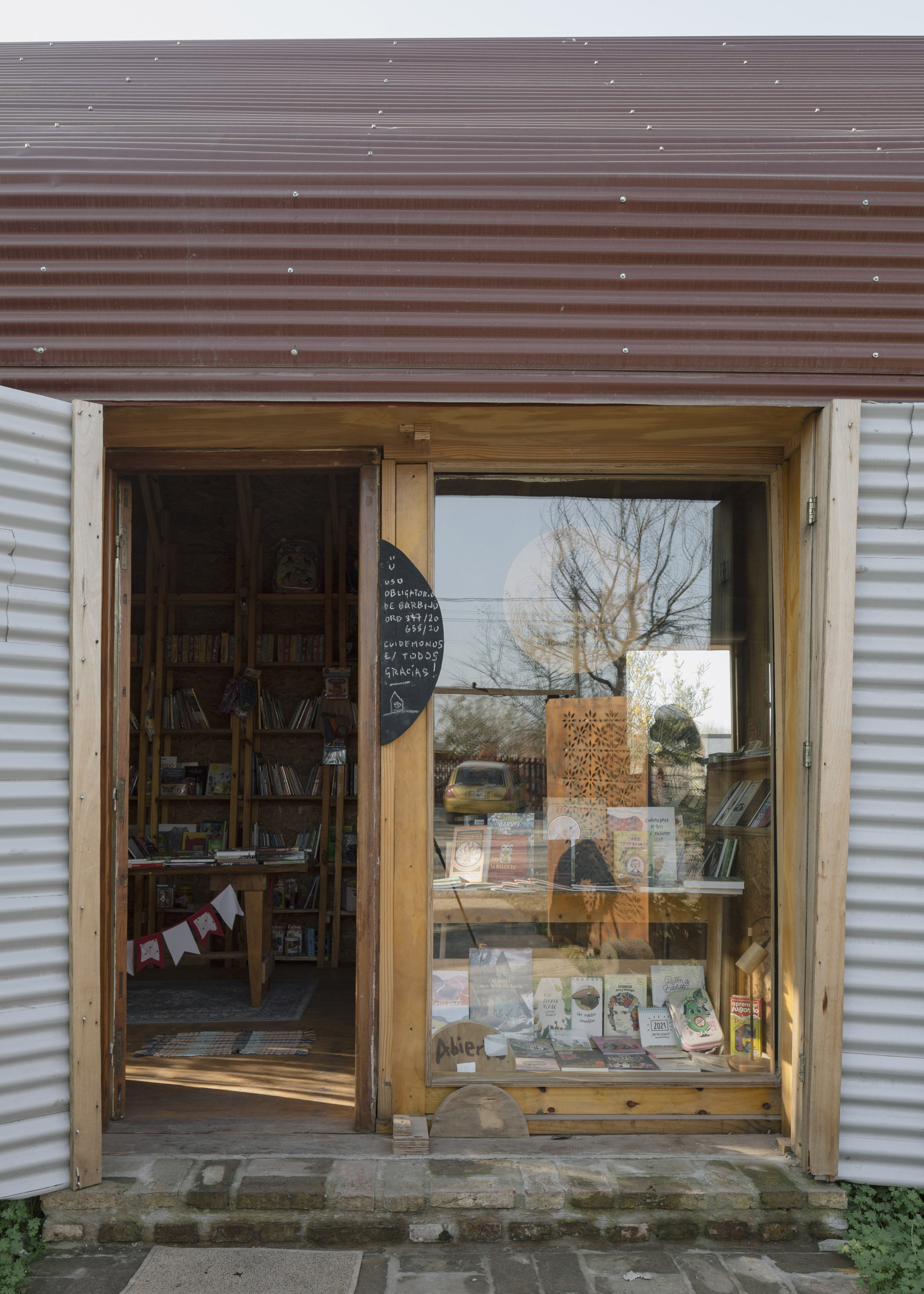 En el exterior la chapa de color rojizo se coloca de forma horizontal eliminando la necesidad de colocar cenefas y elementos de cierre. A su vez las cabriadas truncas se articulan con la chapa curvada configurando una cámara de aire ventilada en todo el desarrollo de la cumbrera mejorando considerablemente las condiciones de aislación térmica del recinto. Las aberturas se resuelven con ventanas recicladas y por tratarse de una pequeña librería y biblioteca se limitan al mínimo, controlando y filtrando la incidencia del sol directo, y ubicando, para aprovechar la luz difusa, un ventanal de mayor superficie hacia el sur. A su vez estos vanos se ubican de manera estratégica para direccionar las visuales y evitar cruzar miradas con viviendas vecinas configurando un espacio de carácter introspectivo. Al ingresar, parece el el interior de la bodega de algún barco que va en su búsqueda en altamar.