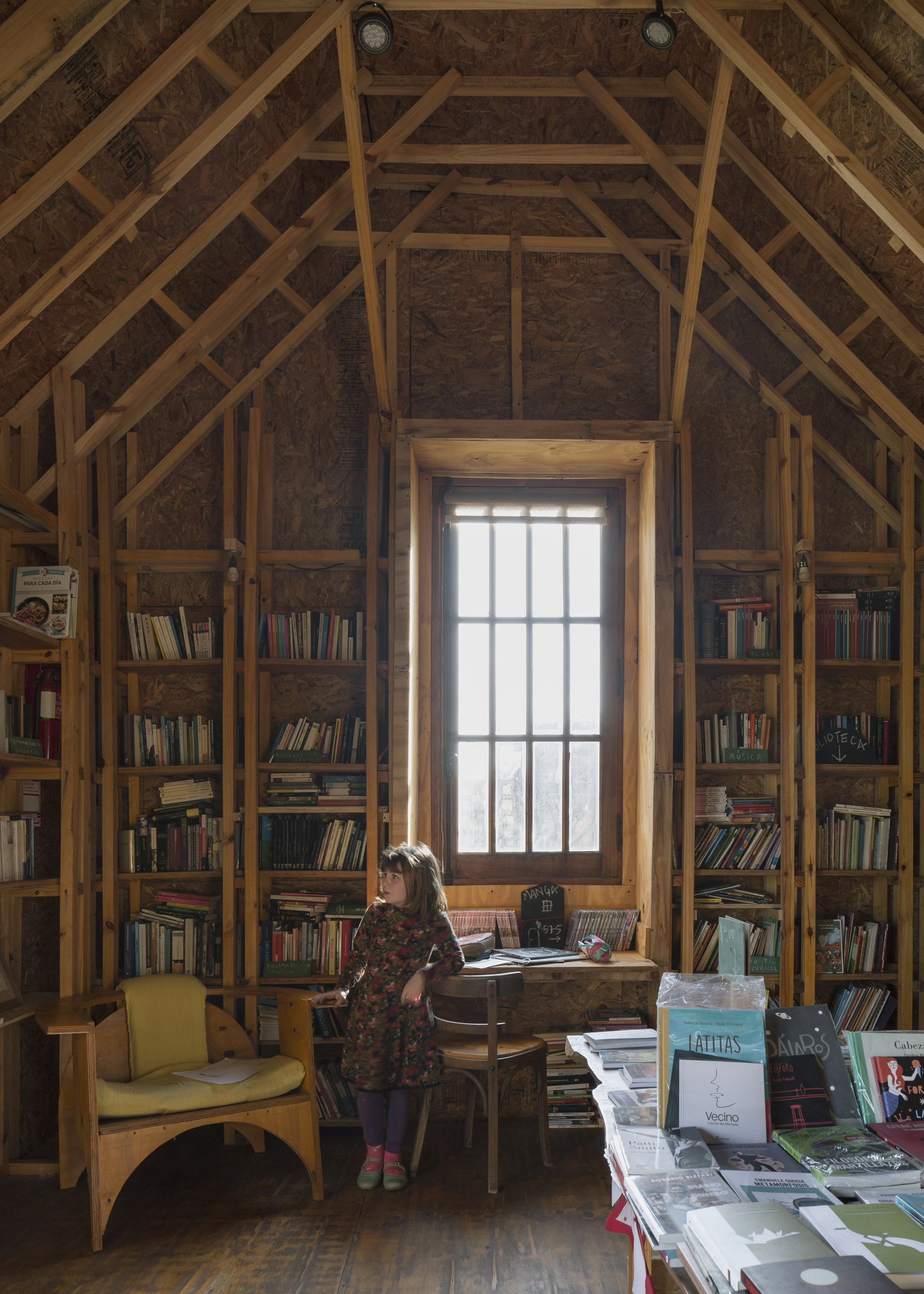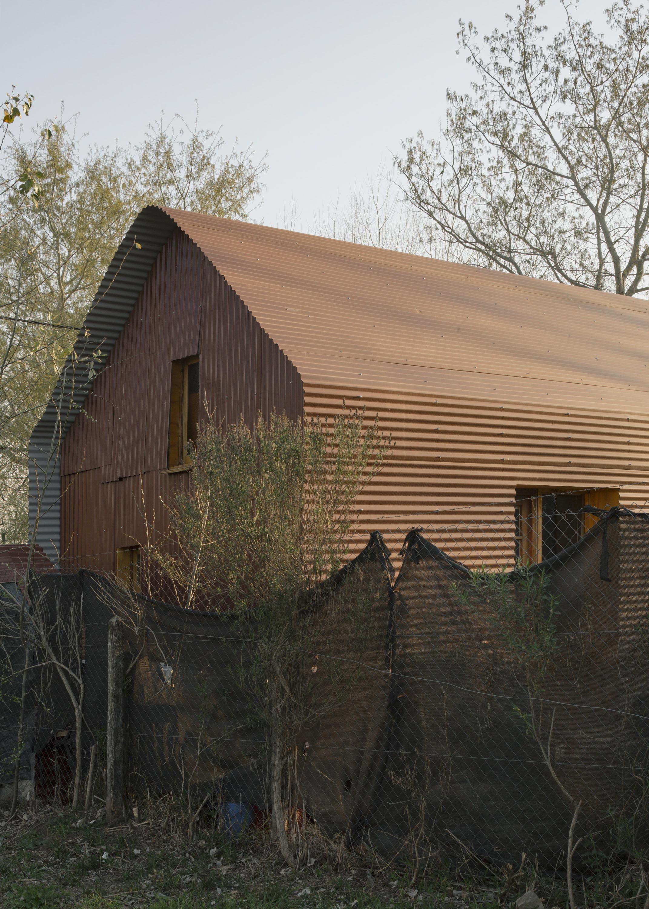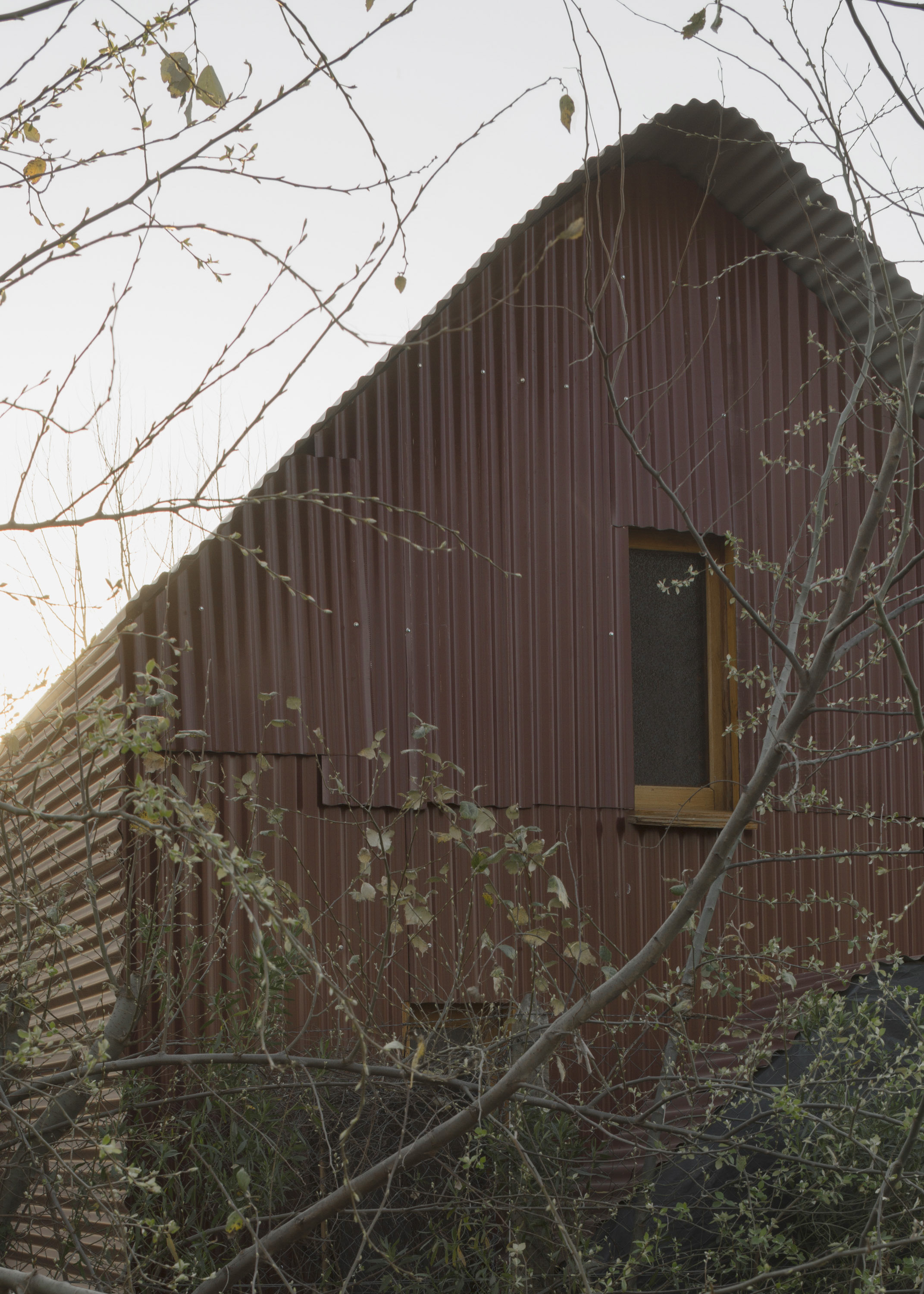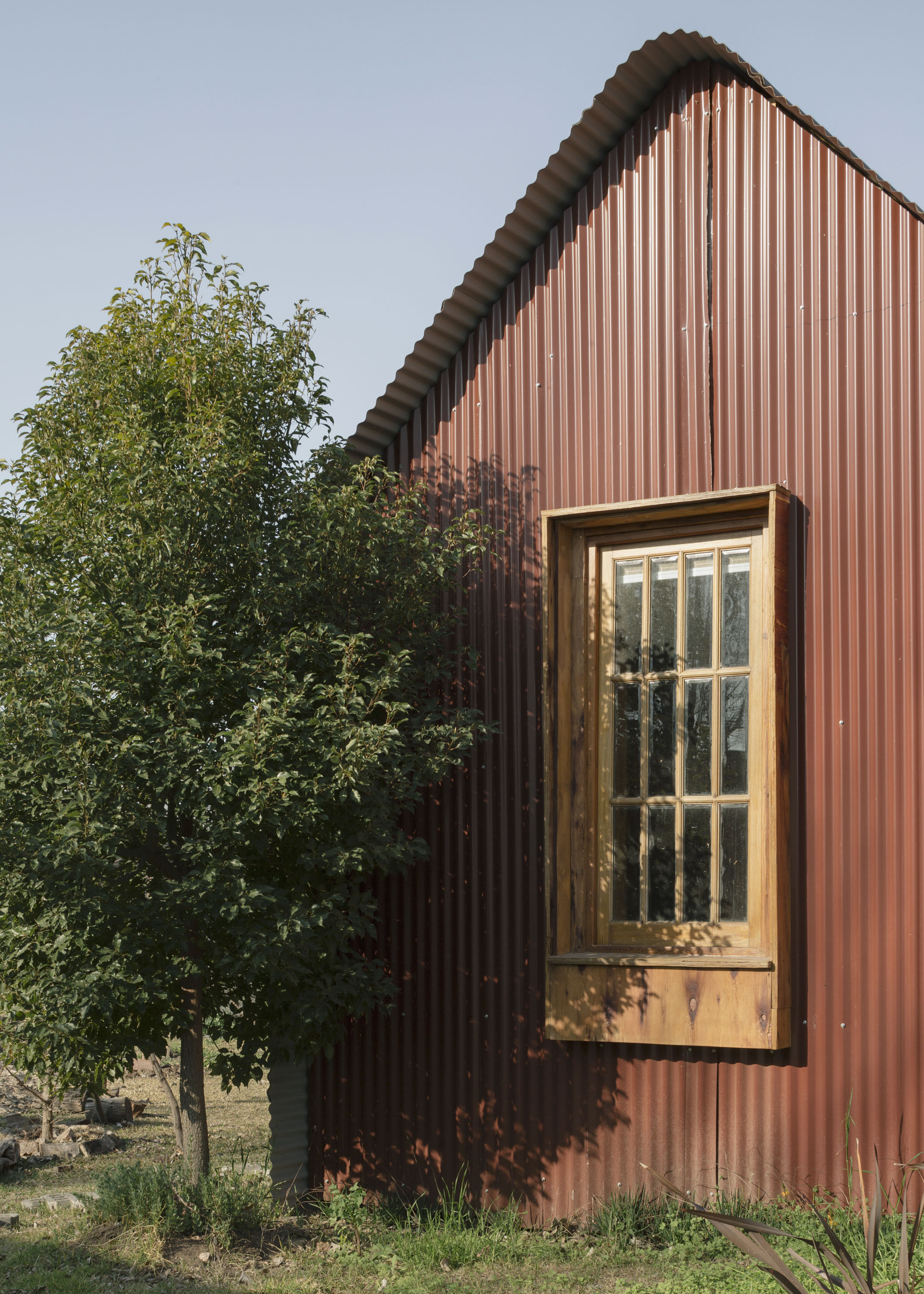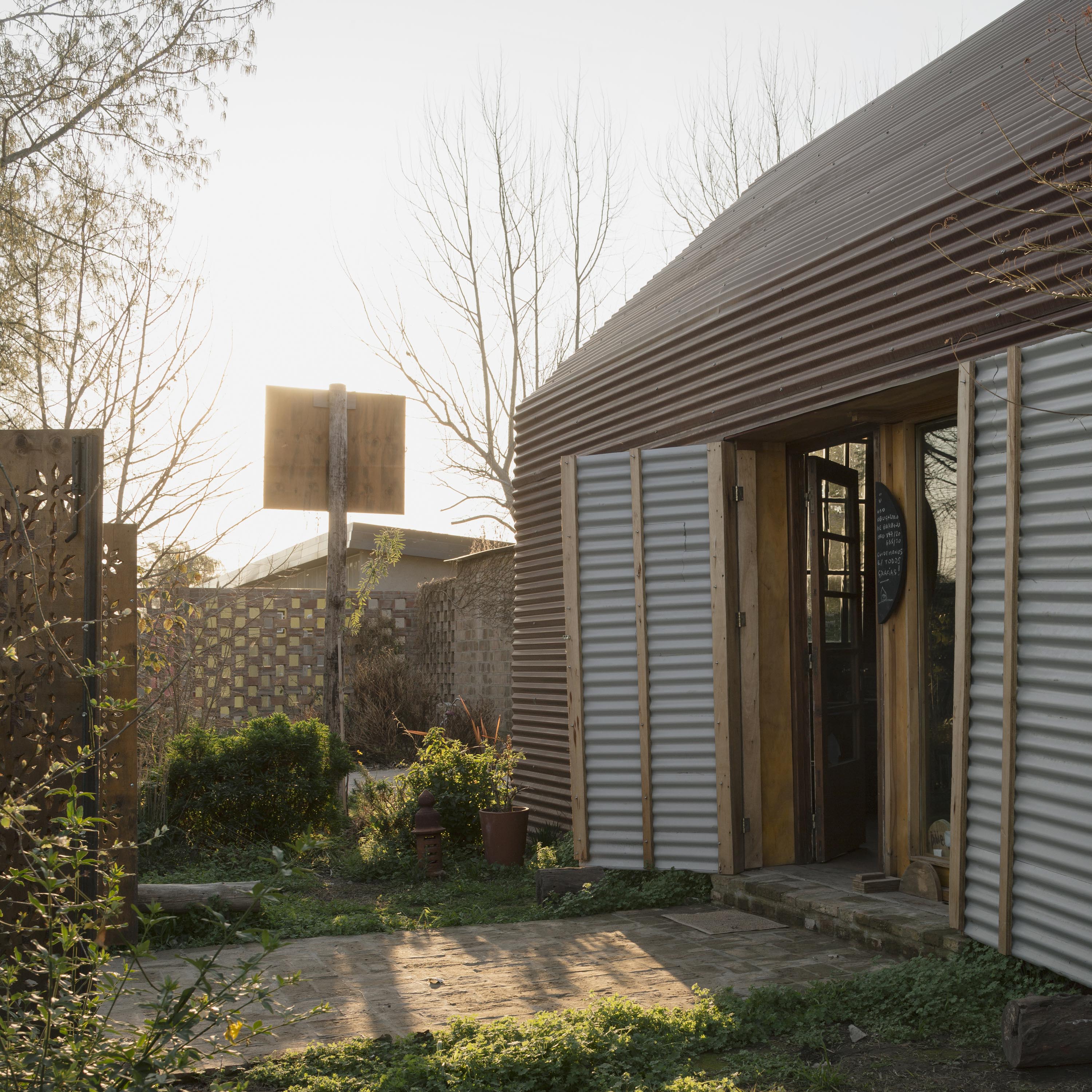 En el exterior la chapa de color rojizo se coloca de forma horizontal eliminando la necesidad de colocar cenefas y elementos de cierre. A su vez las cabriadas truncas se articulan con la chapa curvada configurando una cámara de aire ventilada en todo el desarrollo de la cumbrera mejorando considerablemente las condiciones de aislación térmica del recinto. Las aberturas se resuelven con ventanas recicladas y por tratarse de una pequeña librería y biblioteca se limitan al mínimo, controlando y filtrando la incidencia del sol directo, y ubicando, para aprovechar la luz difusa, un ventanal de mayor superficie hacia el sur. A su vez estos vanos se ubican de manera estratégica para direccionar las visuales y evitar cruzar miradas con viviendas vecinas configurando un espacio de carácter introspectivo. Al ingresar, parece el el interior de la bodega de algún barco que va en su búsqueda en altamar.