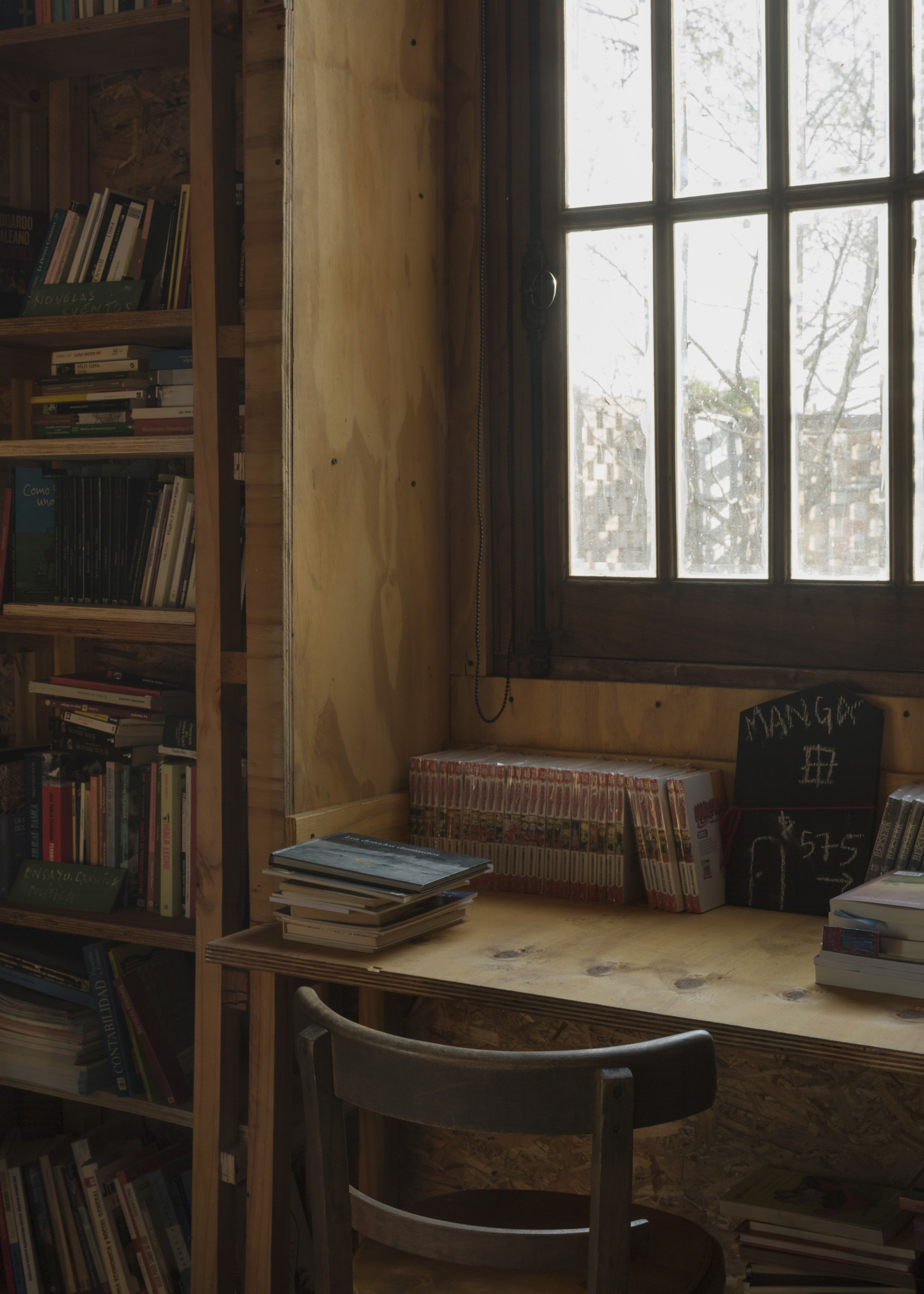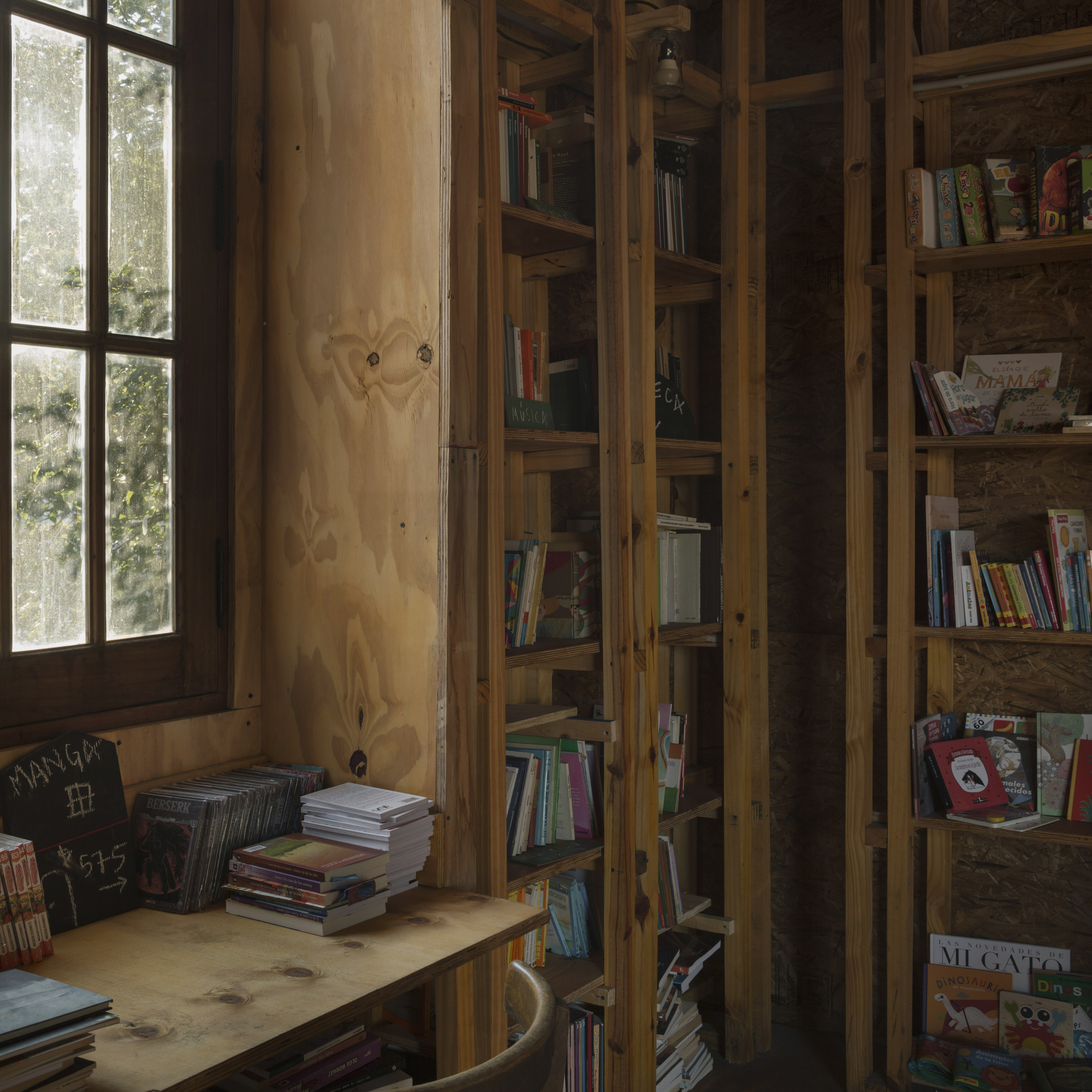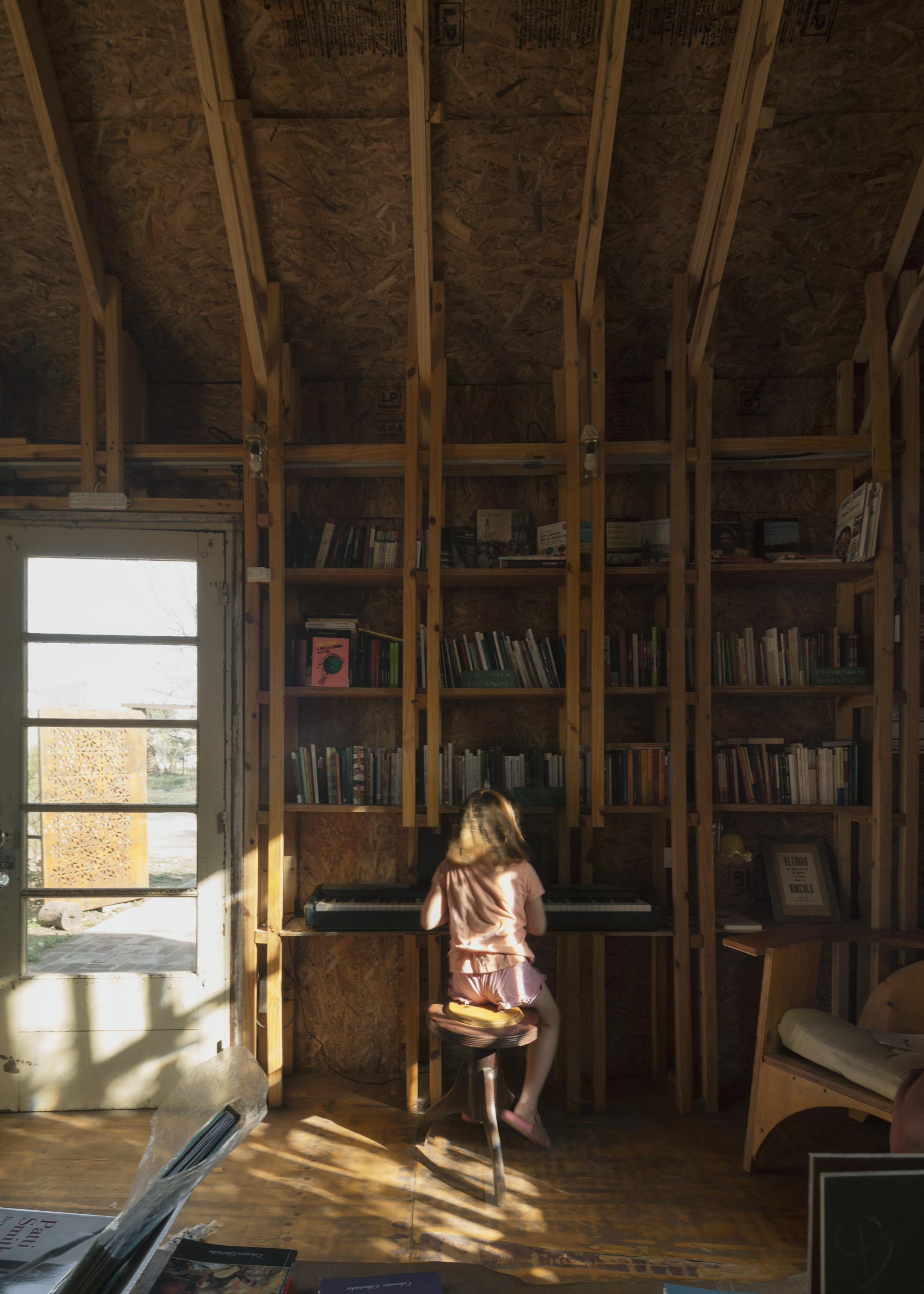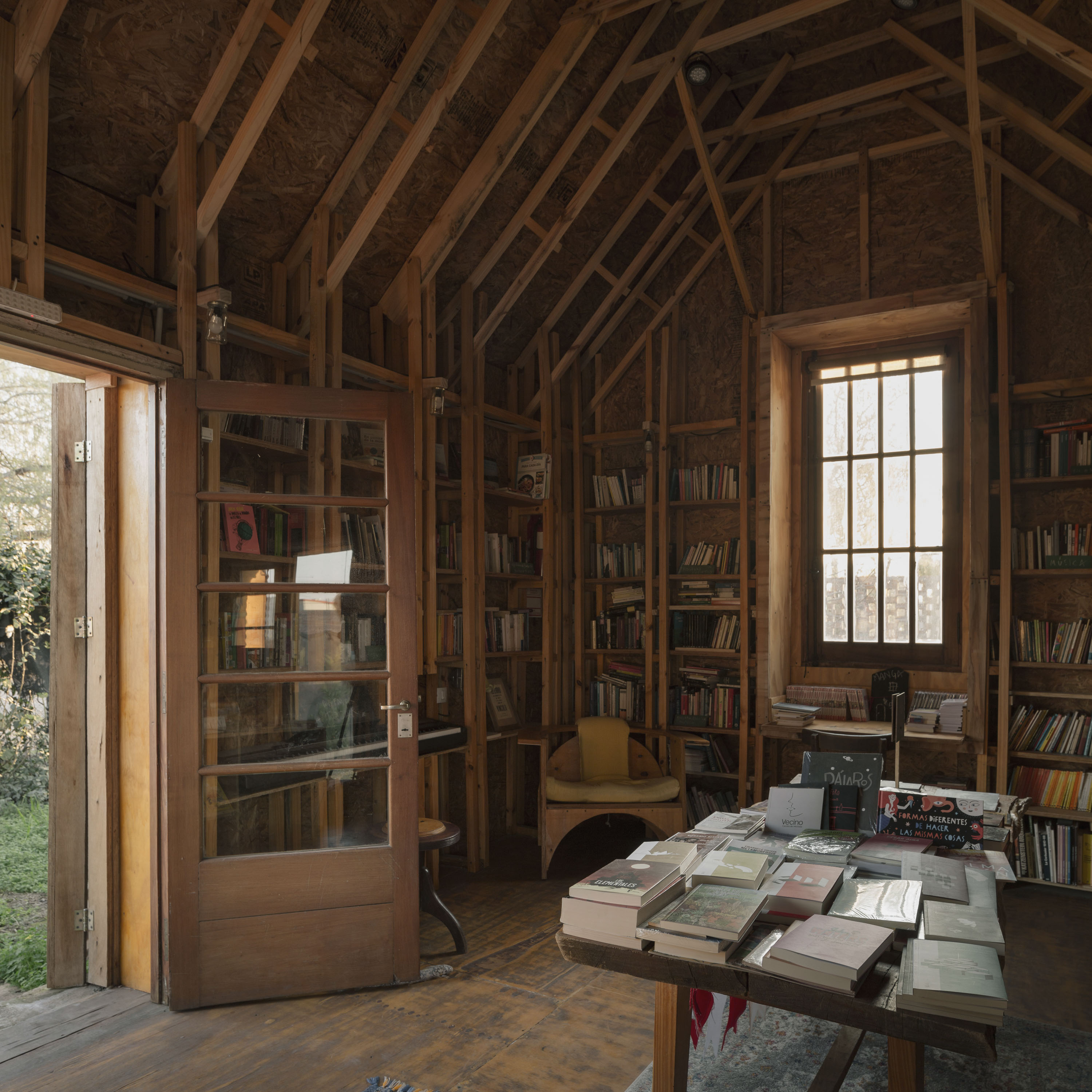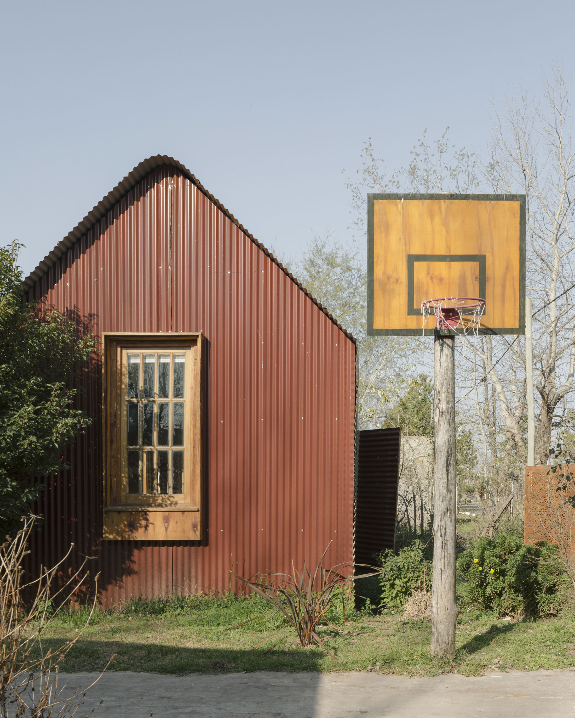 En el exterior la chapa de color rojizo se coloca de forma horizontal eliminando la necesidad de colocar cenefas y elementos de cierre. A su vez las cabriadas truncas se articulan con la chapa curvada configurando una cámara de aire ventilada en todo el desarrollo de la cumbrera mejorando considerablemente las condiciones de aislación térmica del recinto. Las aberturas se resuelven con ventanas recicladas y por tratarse de una pequeña librería y biblioteca se limitan al mínimo, controlando y filtrando la incidencia del sol directo, y ubicando, para aprovechar la luz difusa, un ventanal de mayor superficie hacia el sur. A su vez estos vanos se ubican de manera estratégica para direccionar las visuales y evitar cruzar miradas con viviendas vecinas configurando un espacio de carácter introspectivo. Al ingresar, parece el el interior de la bodega de algún barco que va en su búsqueda en altamar.