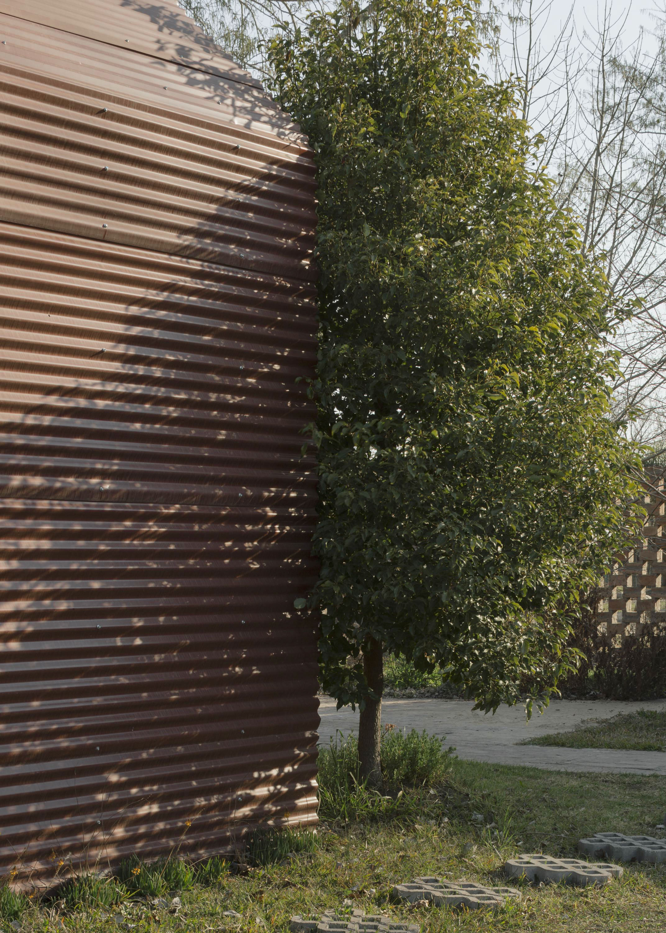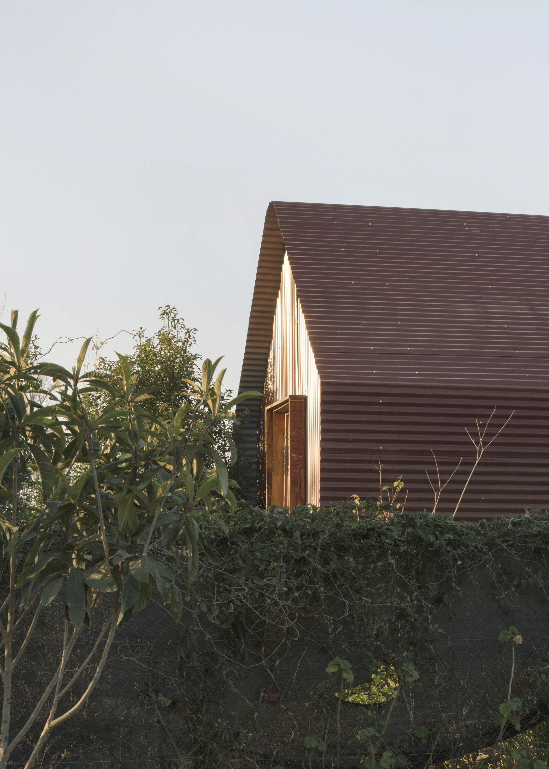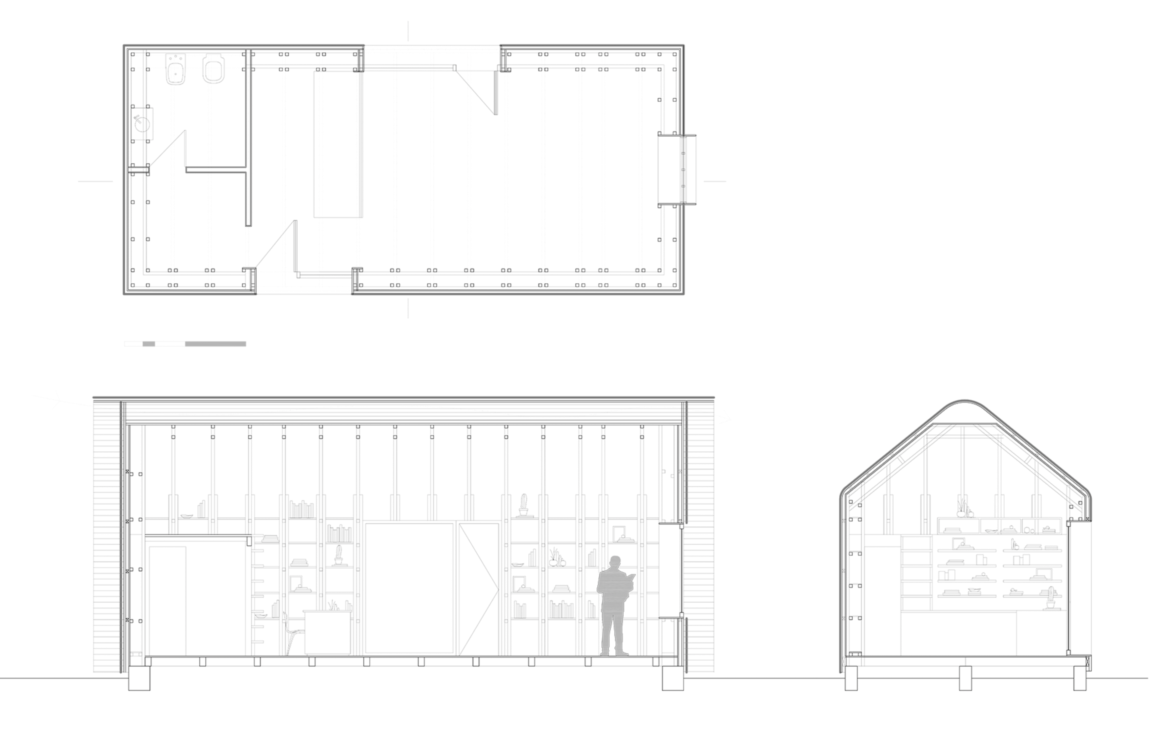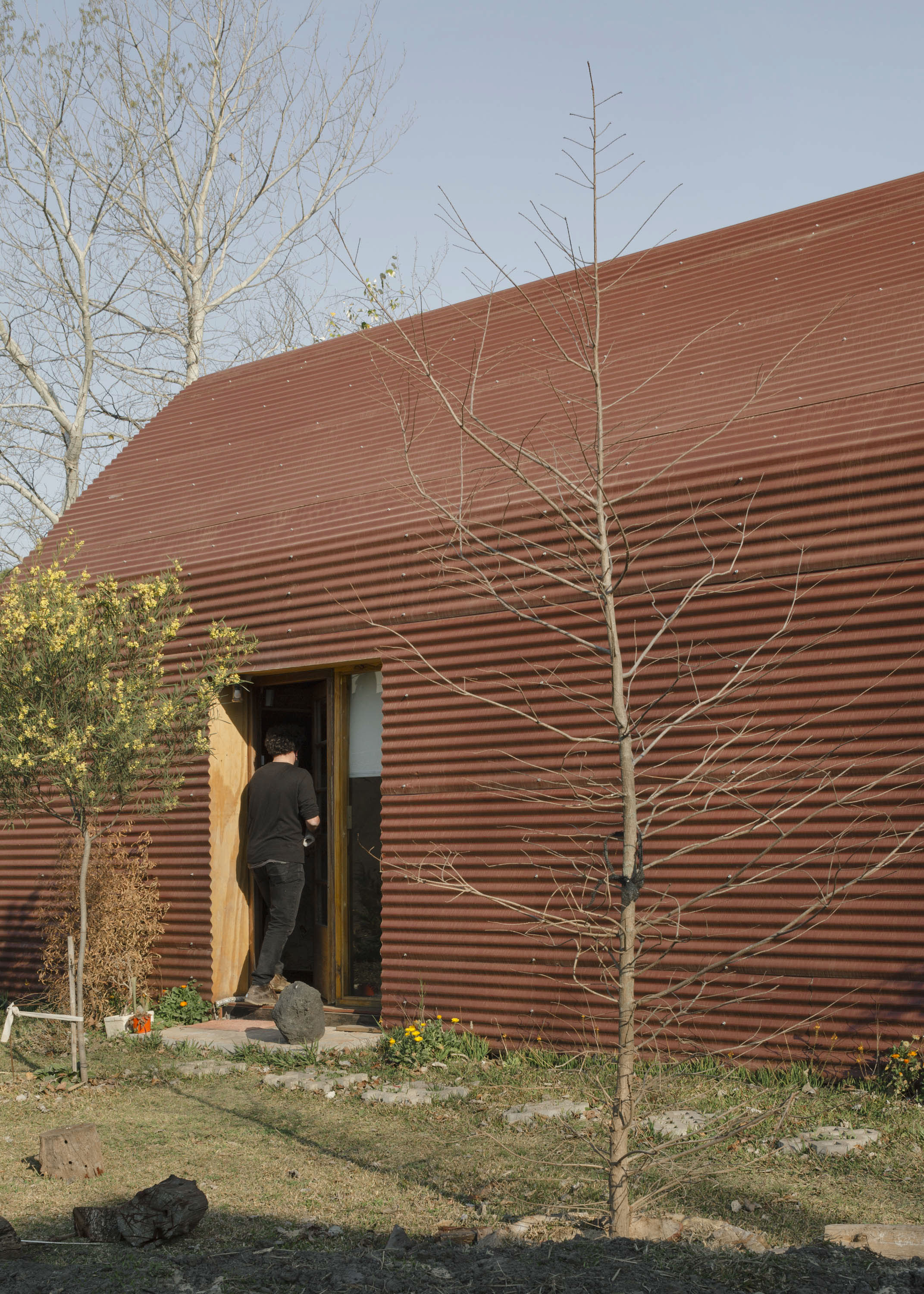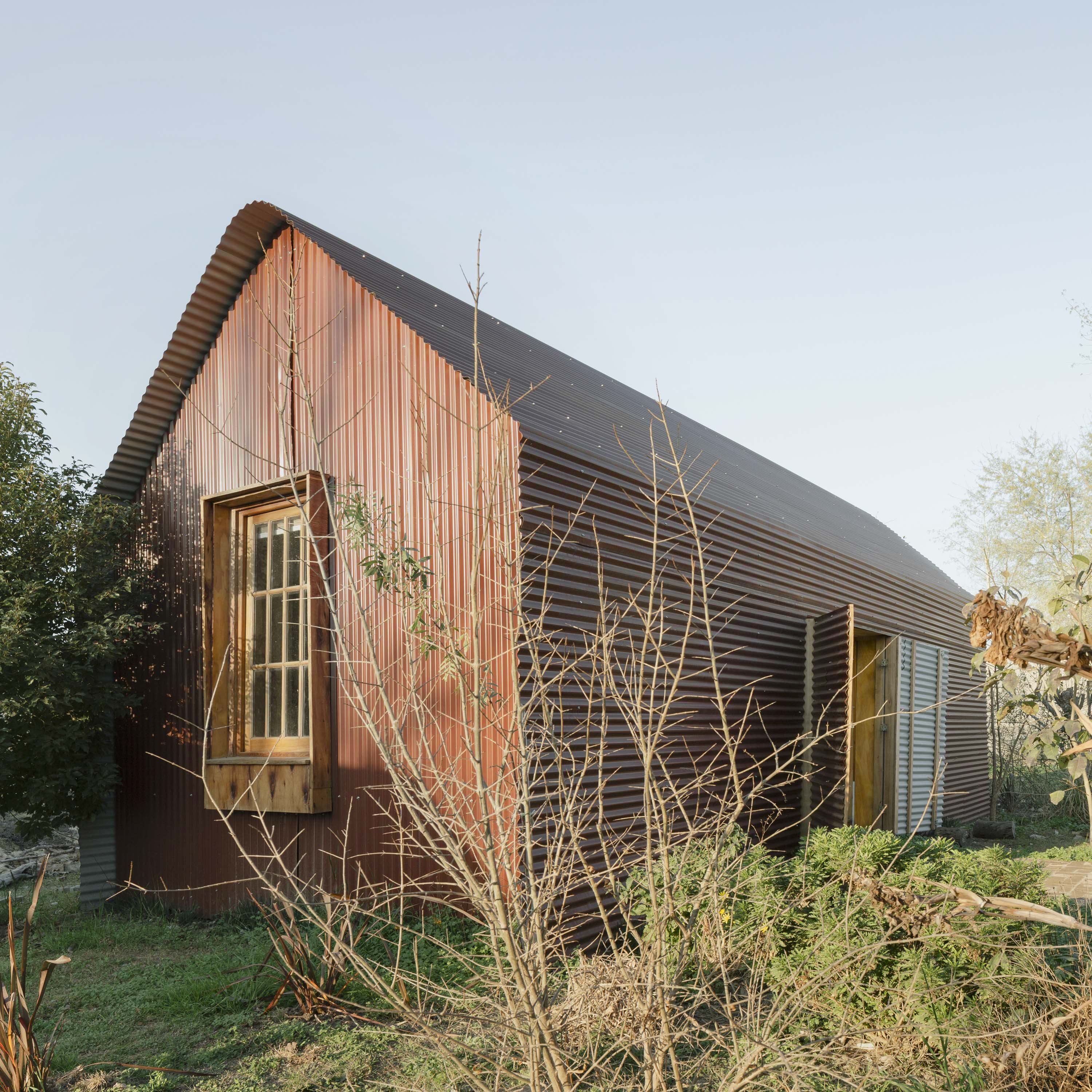 En el exterior la chapa de color rojizo se coloca de forma horizontal eliminando la necesidad de colocar cenefas y elementos de cierre. A su vez las cabriadas truncas se articulan con la chapa curvada configurando una cámara de aire ventilada en todo el desarrollo de la cumbrera mejorando considerablemente las condiciones de aislación térmica del recinto. Las aberturas se resuelven con ventanas recicladas y por tratarse de una pequeña librería y biblioteca se limitan al mínimo, controlando y filtrando la incidencia del sol directo, y ubicando, para aprovechar la luz difusa, un ventanal de mayor superficie hacia el sur. A su vez estos vanos se ubican de manera estratégica para direccionar las visuales y evitar cruzar miradas con viviendas vecinas configurando un espacio de carácter introspectivo. Al ingresar, parece el el interior de la bodega de algún barco que va en su búsqueda en altamar.