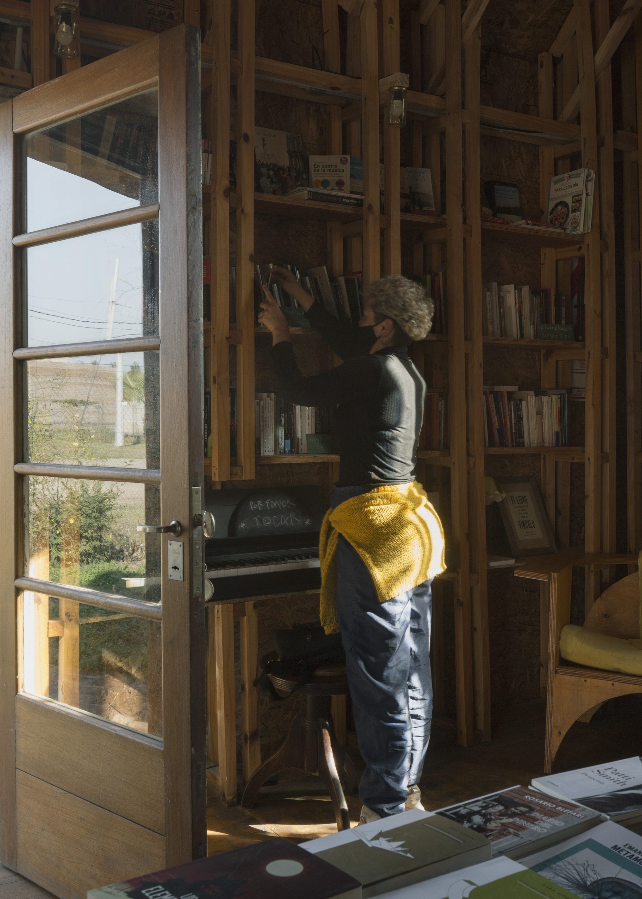 Su estructura se configura con pequeñas piezas de madera de una única dimensión. Un tipo de construcción de entramado liviano y de bajo impacto la cual fue materializada por una sola persona. Esto fue determinante en el diseño de las piezas las que deberían ser fácilmente manipulables, livianas pero resistentes. Dos tipos de unidades estructurales las cuales se fabrican en el suelo para luego ser montadas: una funciona como columna, otra como cabriada; ambas materializadas con listones de pino de 2 × 2. Una vez ensambladas son soporte tanto del cerramiento como de los anaqueles.