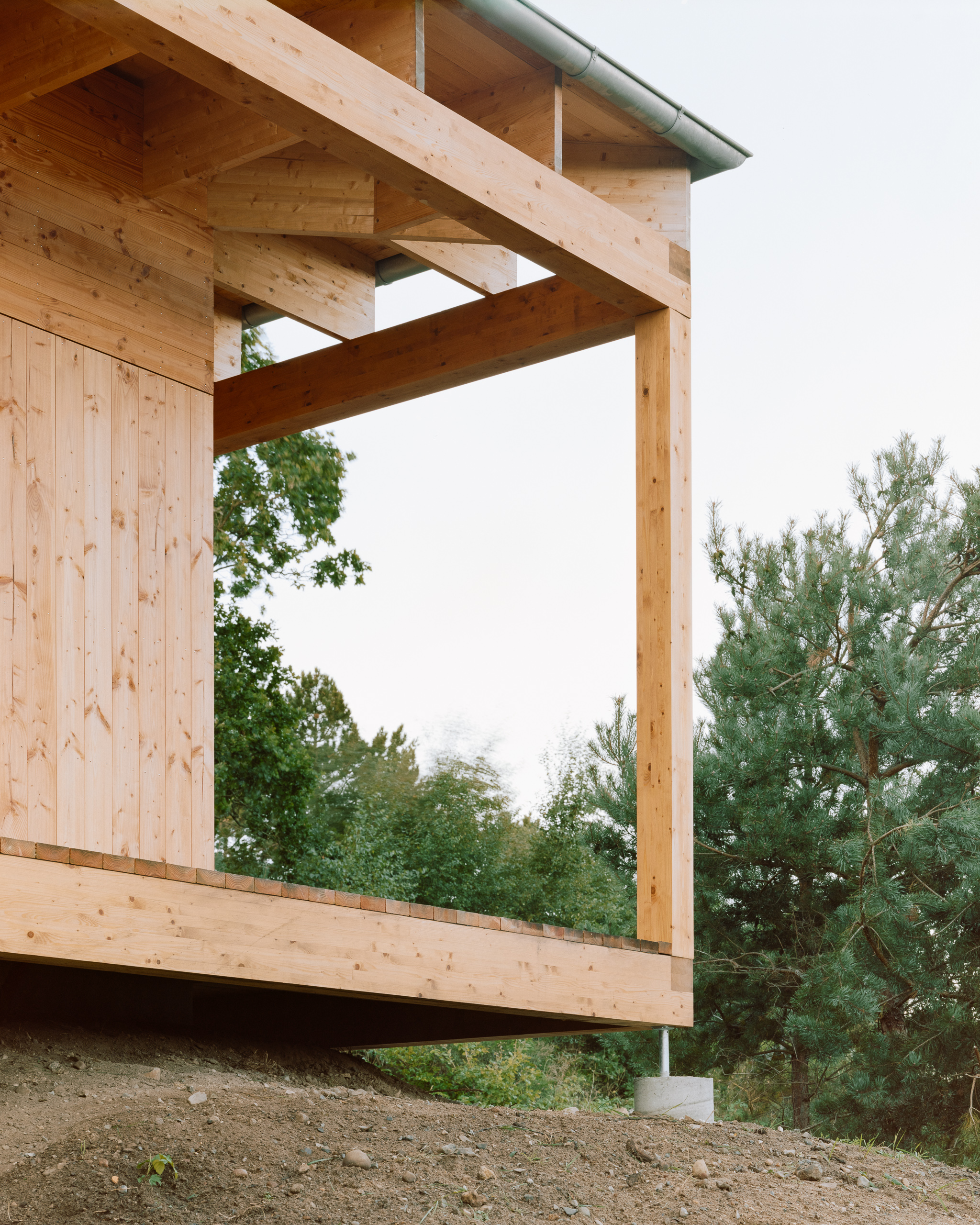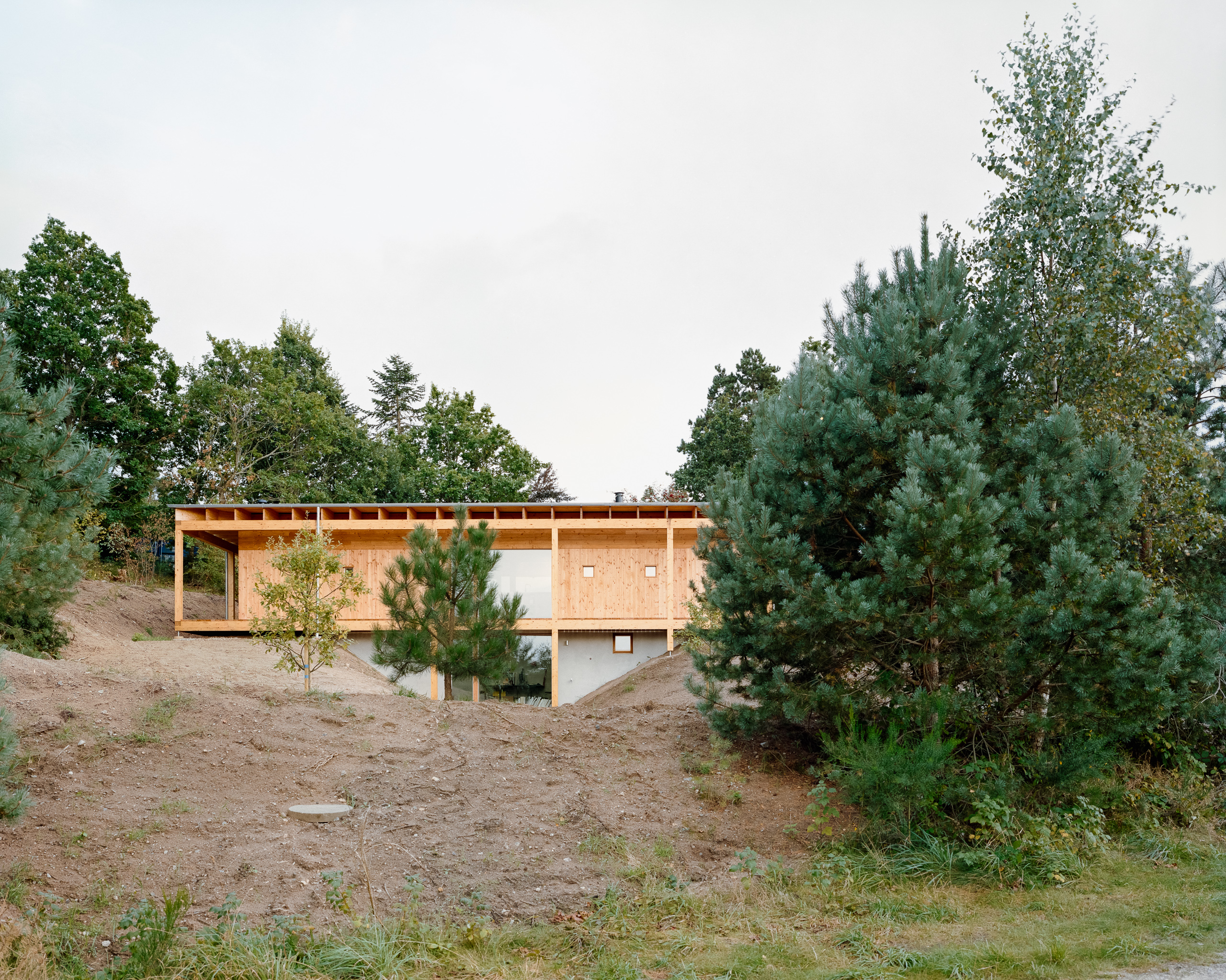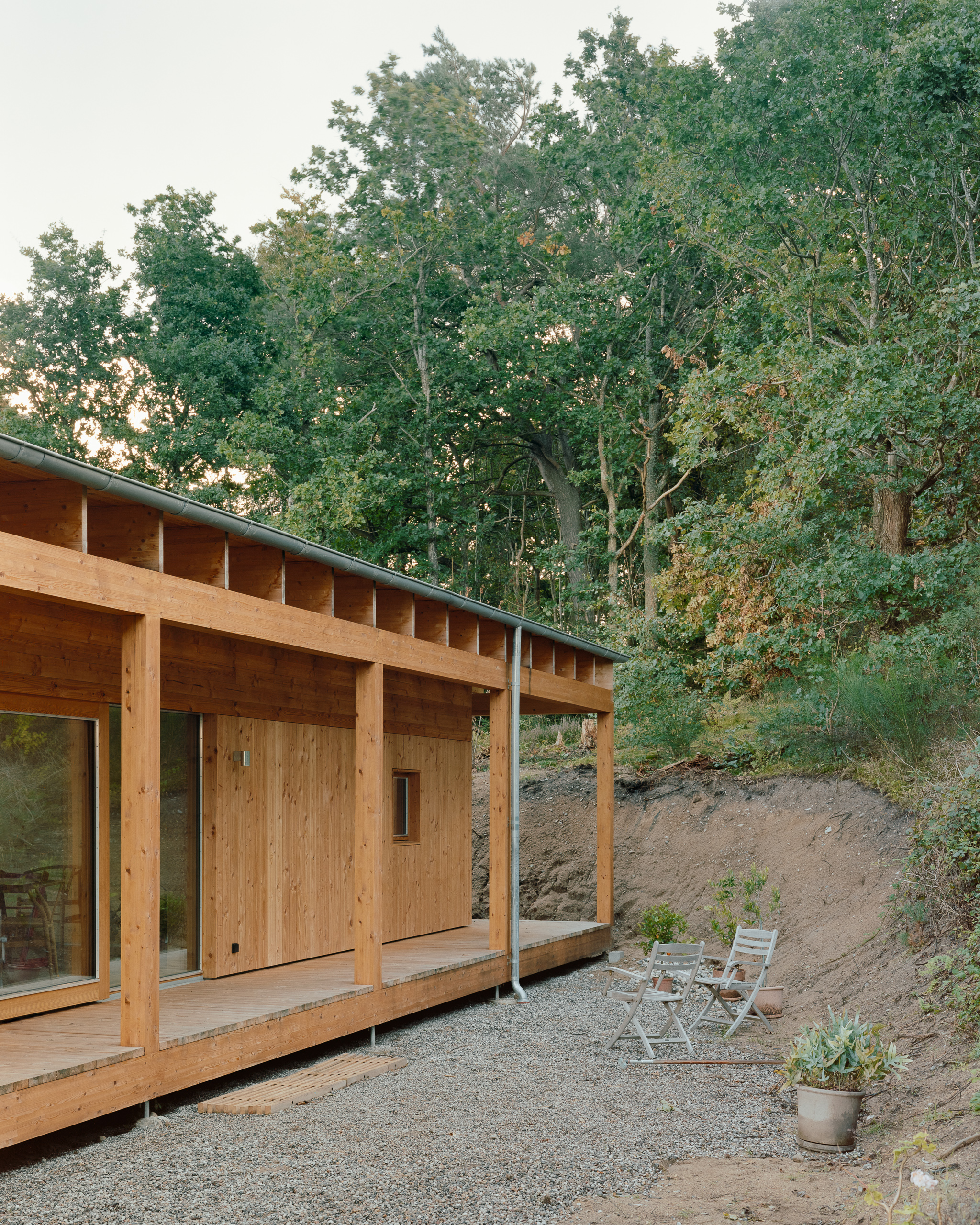 The house is located in the outskirts of Ebeltoft in a morane landscape, formed during the last ice age. Glacial movements formed a landscape with meltwater valleys and hills. The house connects with the landscape on a high plateau that is covered by a large roof. The large roof overhang accentuates the counterbalance of the architecture to the forces of the surrounding landscape.