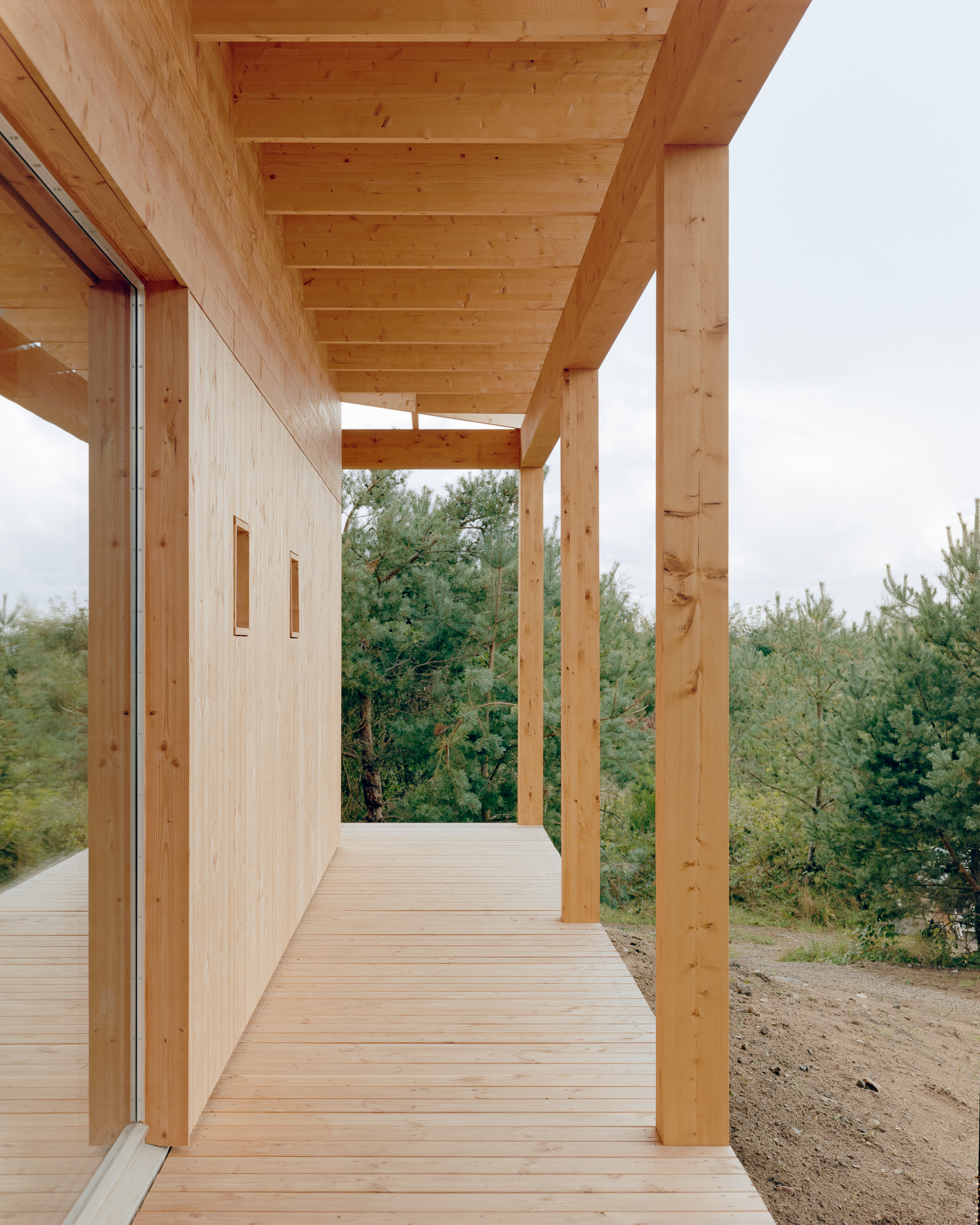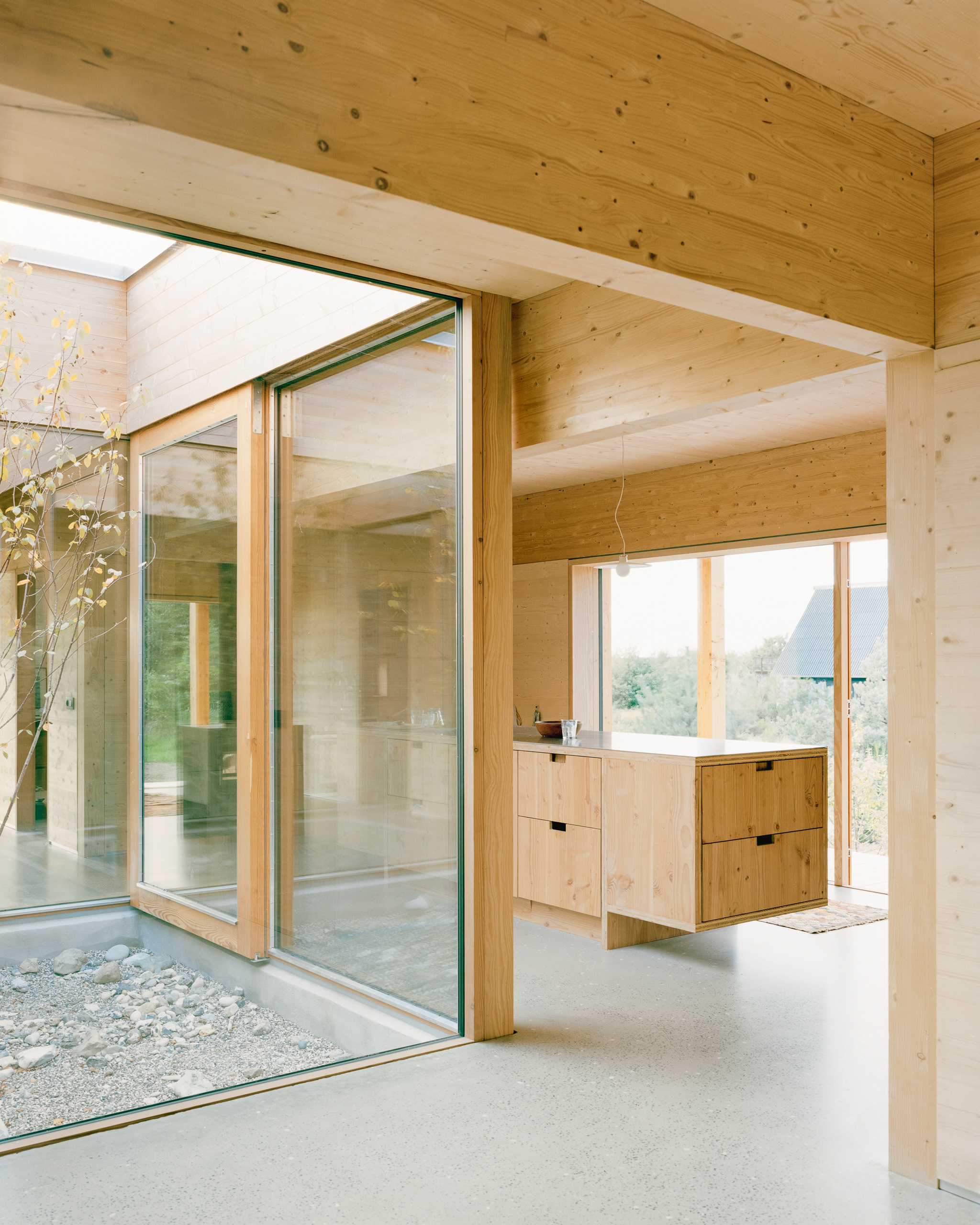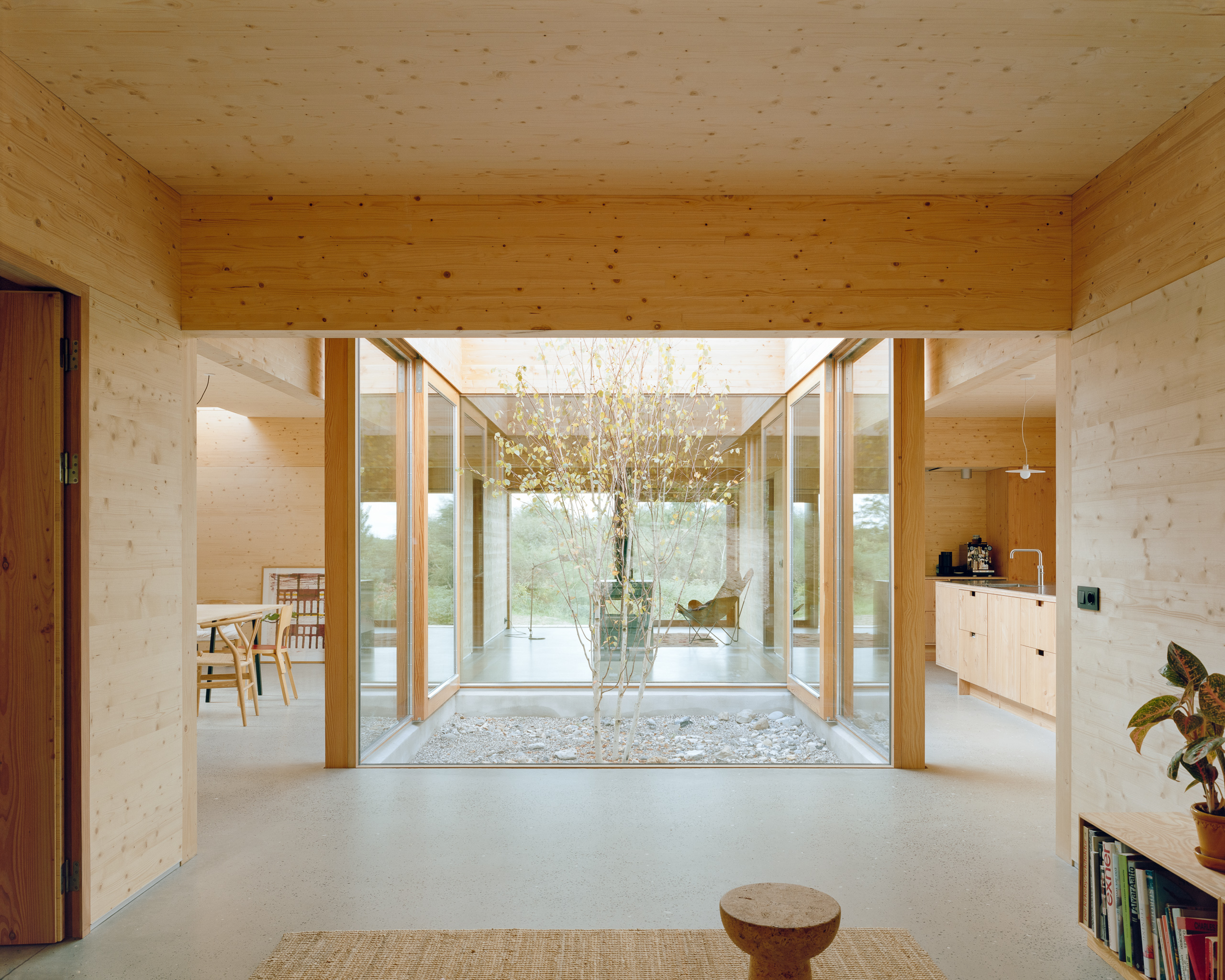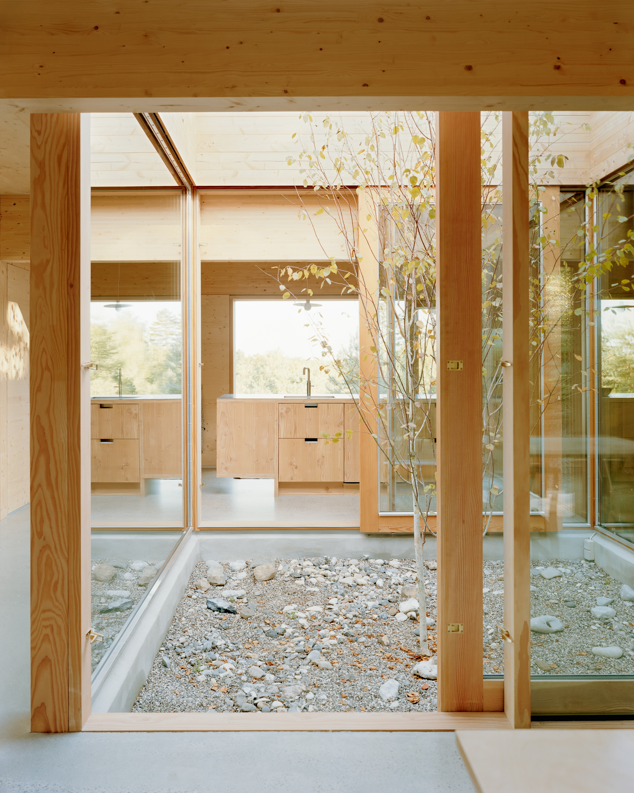 Under the large roof, flexible rooms for a family are organized in a modular wooden building system, centered around an atrium. The atrium is the heart of the house and connects the rooms to each other and connects the house to the sky and the earth. From here, there is a view to the four main compass directions, framing the diverse landscapes.