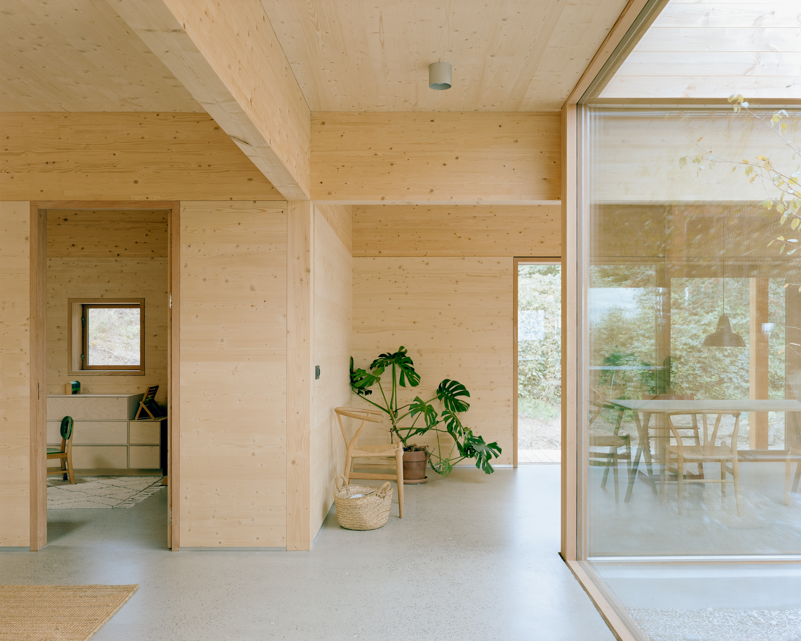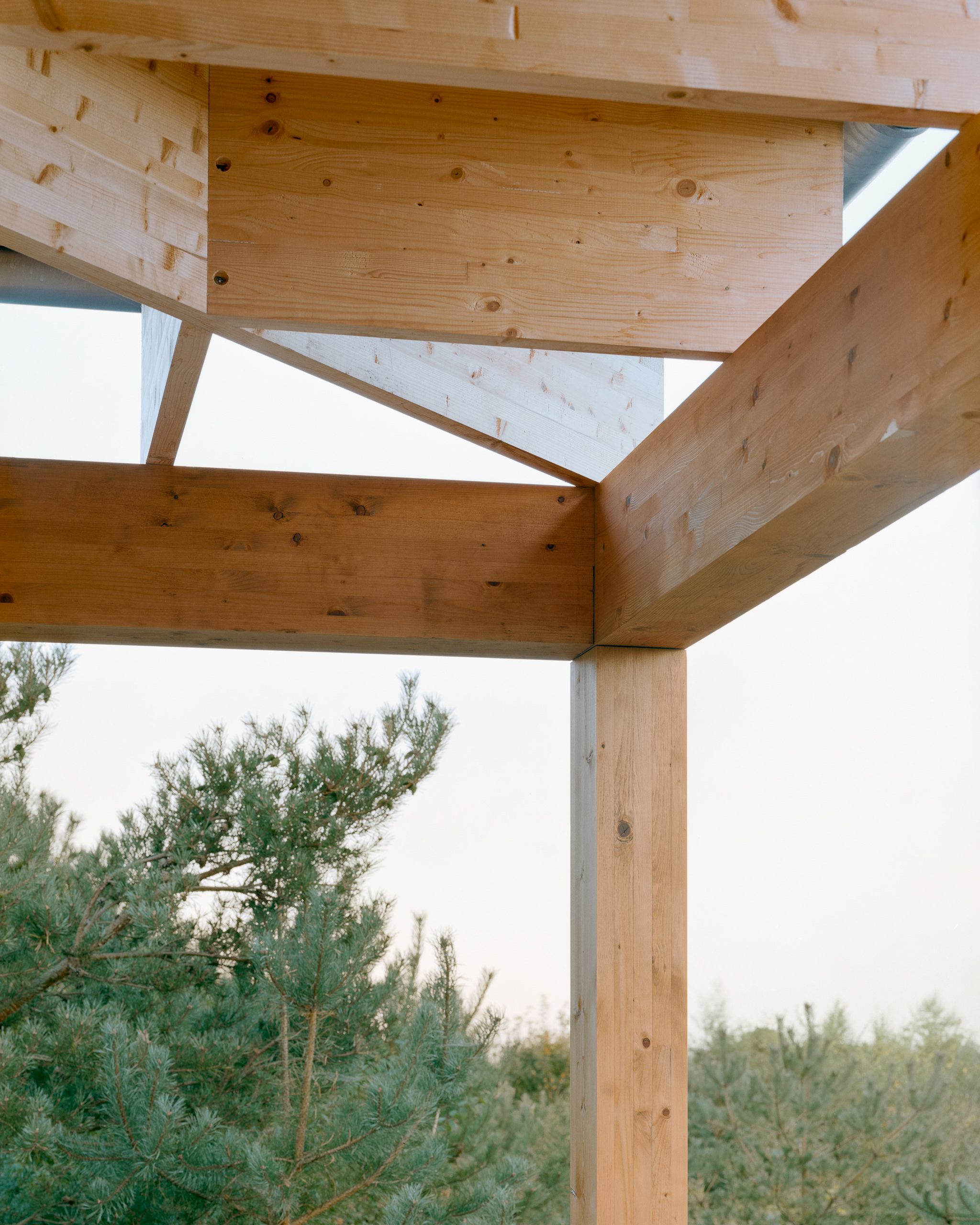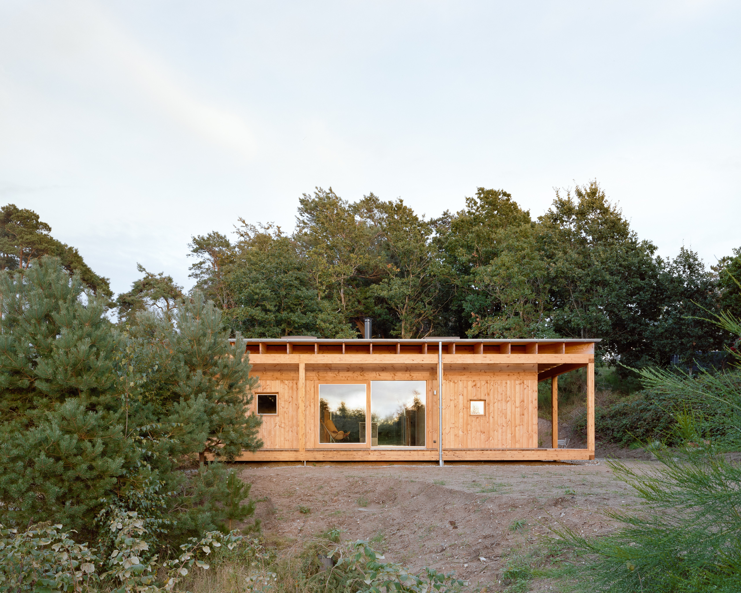Under the large roof, flexible rooms for a family are organized in a modular wooden building system, centered around an atrium. The atrium is the heart of the house and connects the rooms to each other and connects the house to the sky and the earth. From here, there is a view to the four main compass directions, framing the diverse landscapes.