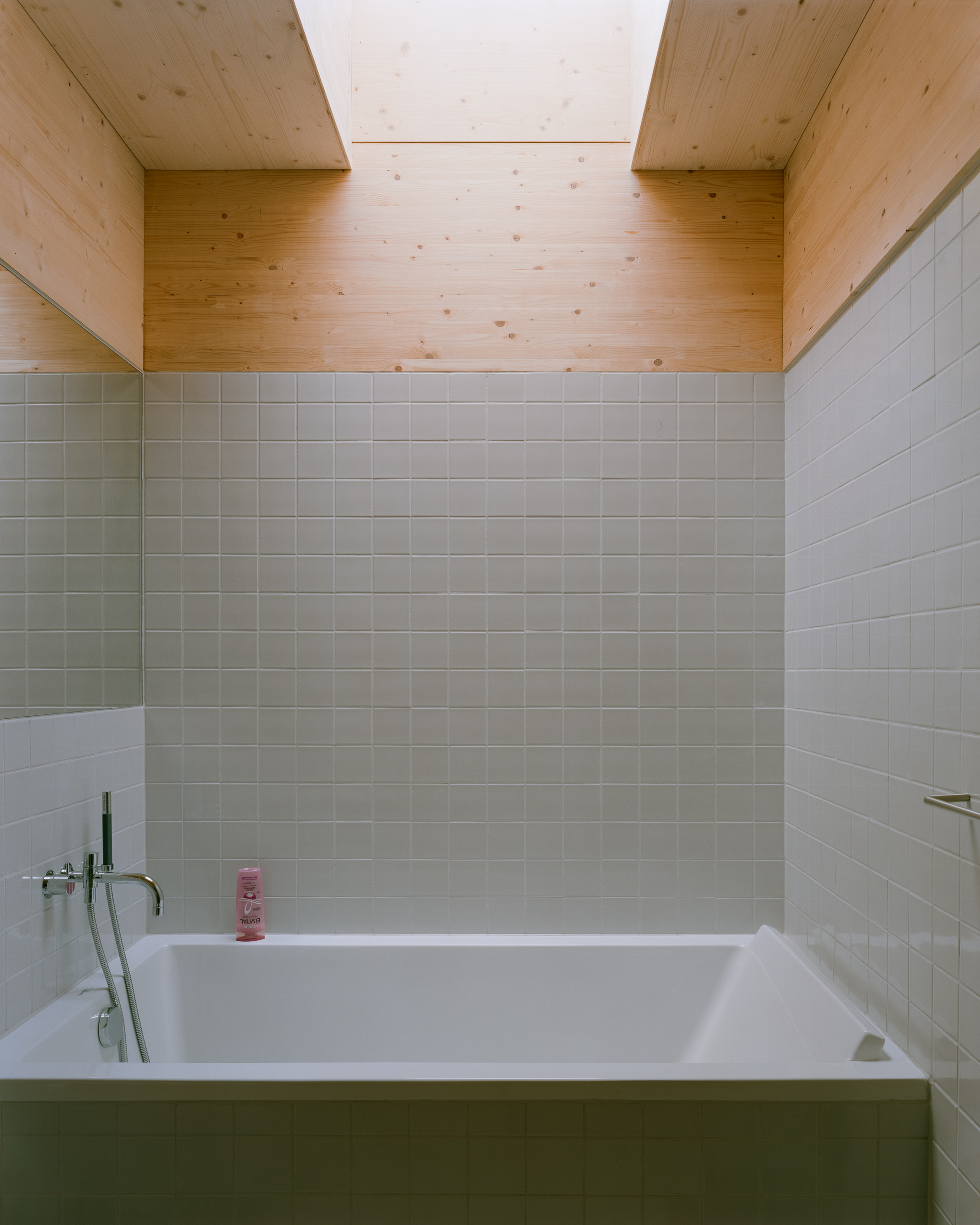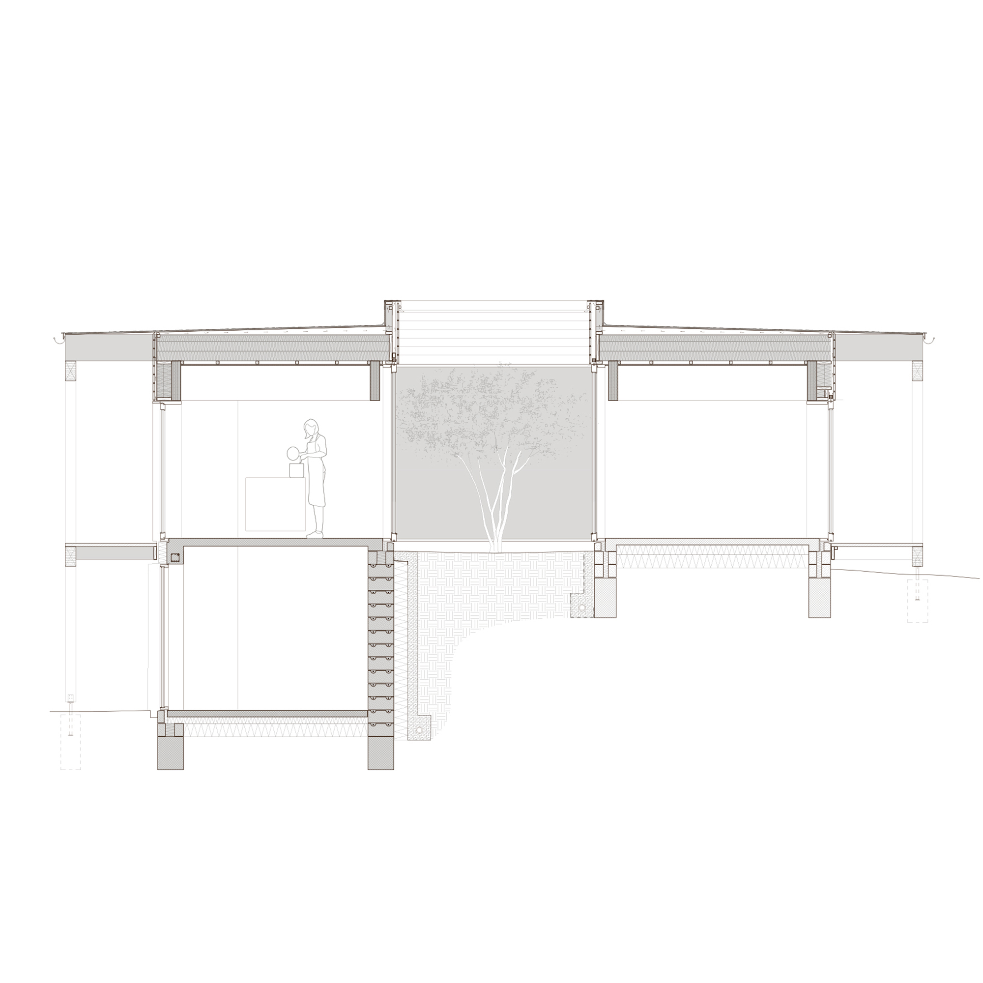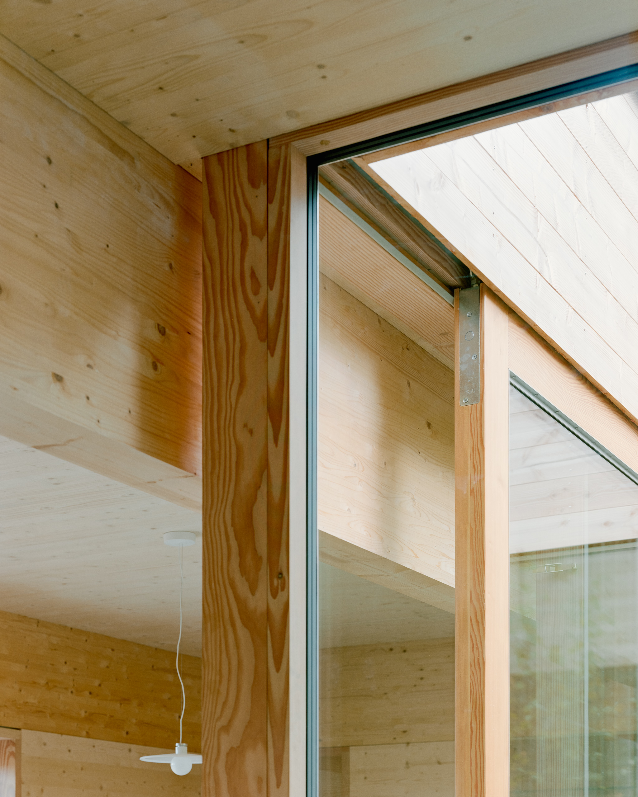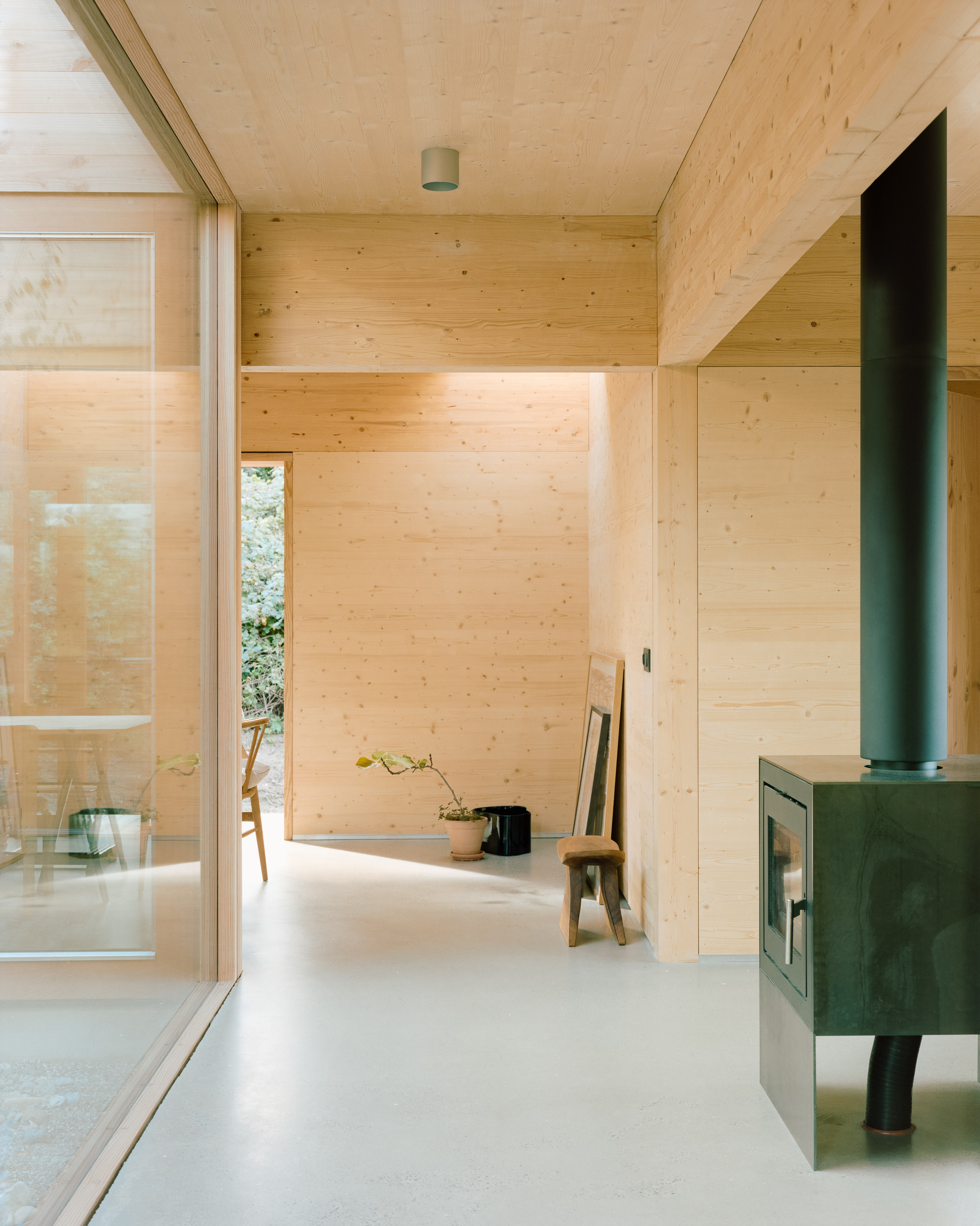 Under the large roof, flexible rooms for a family are organized in a modular wooden building system, centered around an atrium. The atrium is the heart of the house and connects the rooms to each other and connects the house to the sky and the earth. From here, there is a view to the four main compass directions, framing the diverse landscapes.