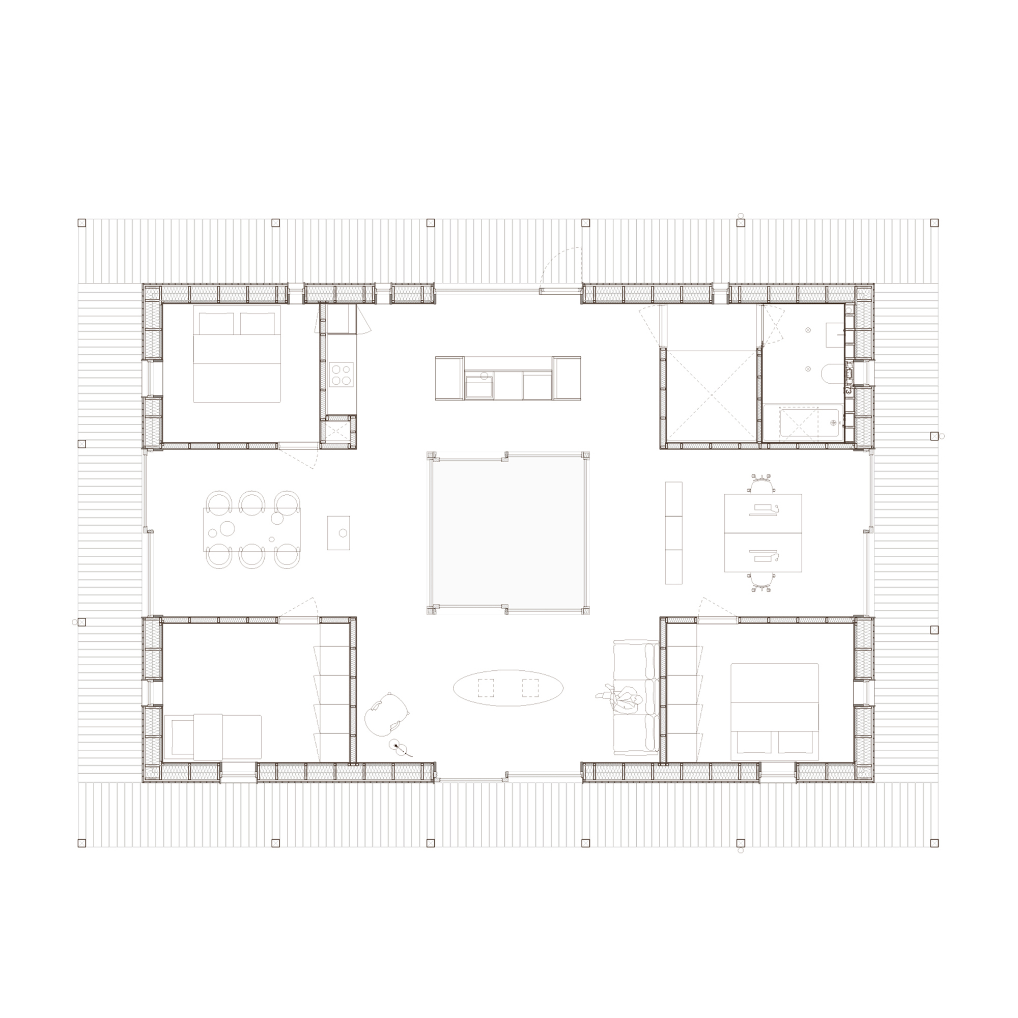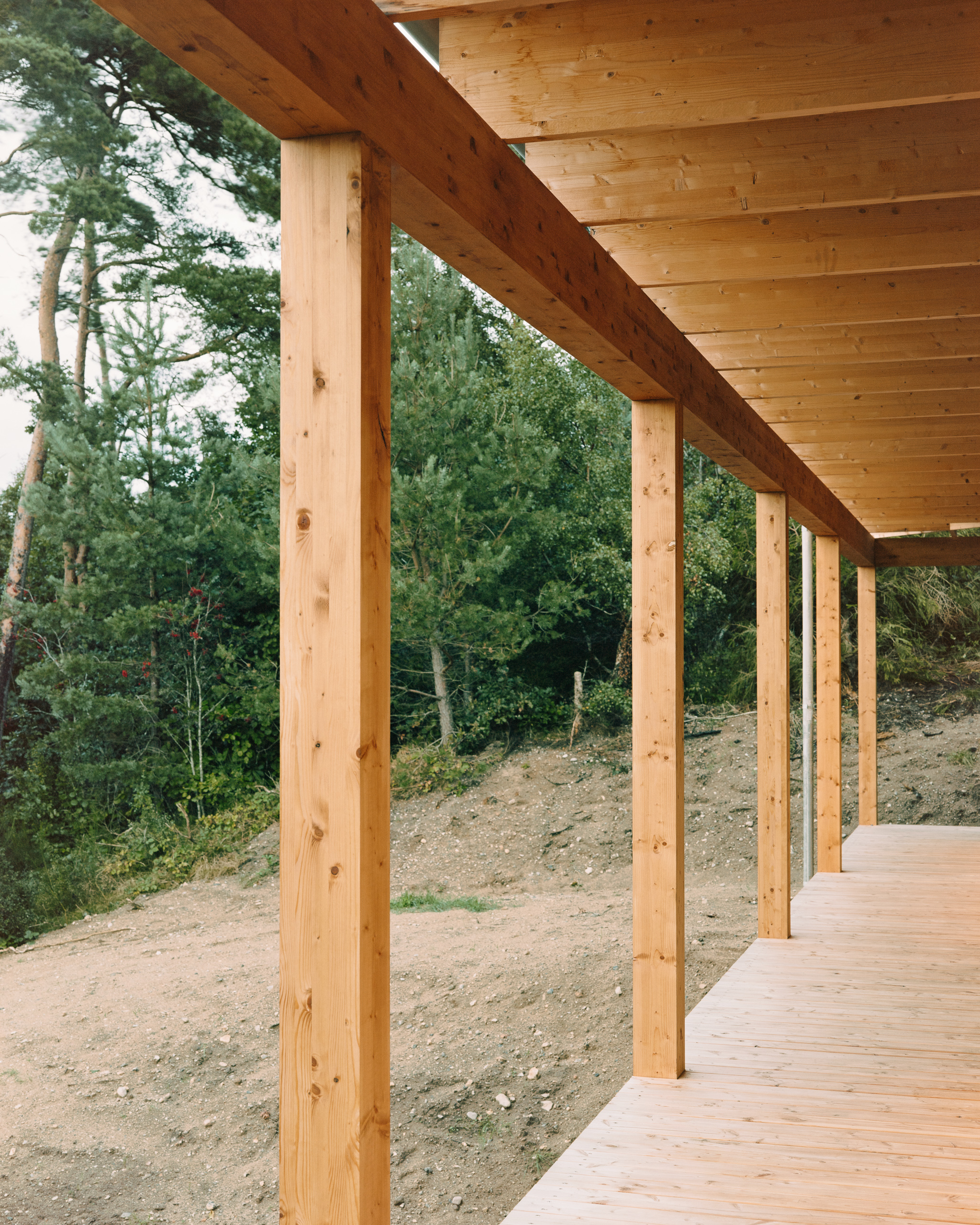 The roof overhang is fastened by a colonnade of wooden columns that form a terrace running all the way around the house. This space frames the landscape and invites you to remain around the house. Here, the constructive rhythms of the house are revealed and promoted.