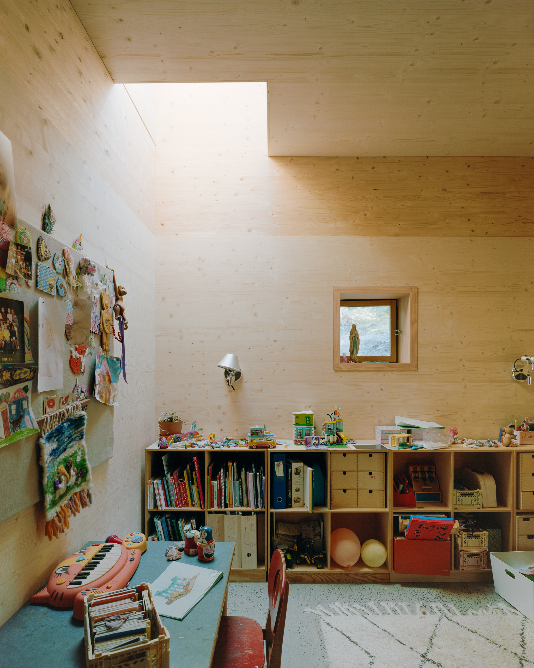 The intention is an inner community without hallways and corridors and a house that can adapt to the needs of the family. Walls can be flexibly and freely taken down and put up again according to changing needs. This is made possible by the roof being supported only by the outer wall with continuous top straps.