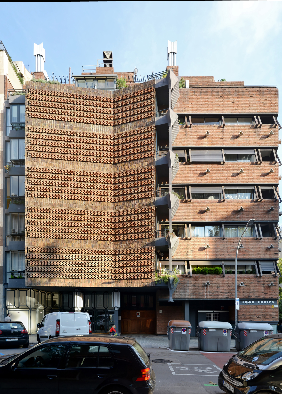 En la construcción del edificio se continúa la tradición artesanal de Cataluña. Un ejemplo de esto lo tenemos en la estratificación en franjas horizontales de la fachada -en la línea del Modernismo autóctono- cuya unificación corre a cargo de las dos paredes laterales de ladrillo a modo de celosía que facilitan la ventilación e iluminación de las zonas de servicio de las viviendas. Con el retranqueo de la sección superior de la fachada se buscó crear unos balcones con chimeneas y barandillas que evocaran al insigne arquitecto catalán Antoni Gaudí. La escalera interior se construyó a base de bóvedas a la catalana.