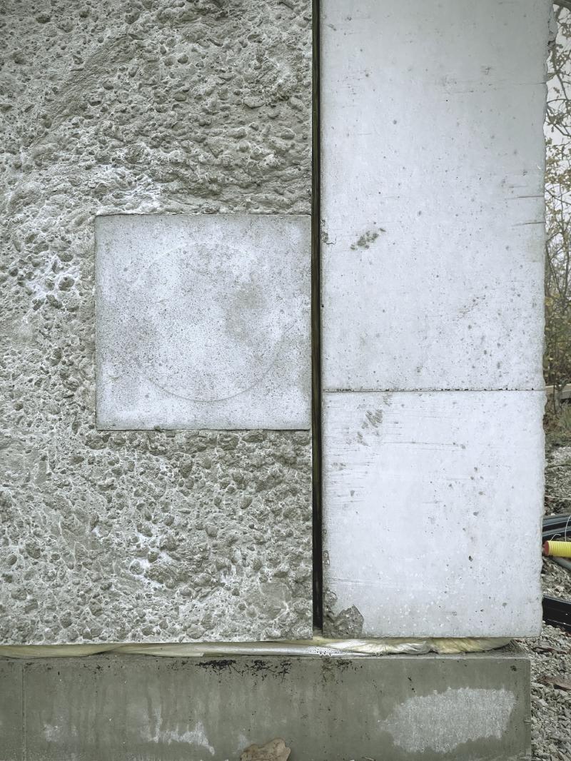 As a counterweight to the industrial way of working a handful of tiles were pressed upside down into the concrete blocks as they were being cast. An element of ornamentation to break away from the prefab atmosphere.