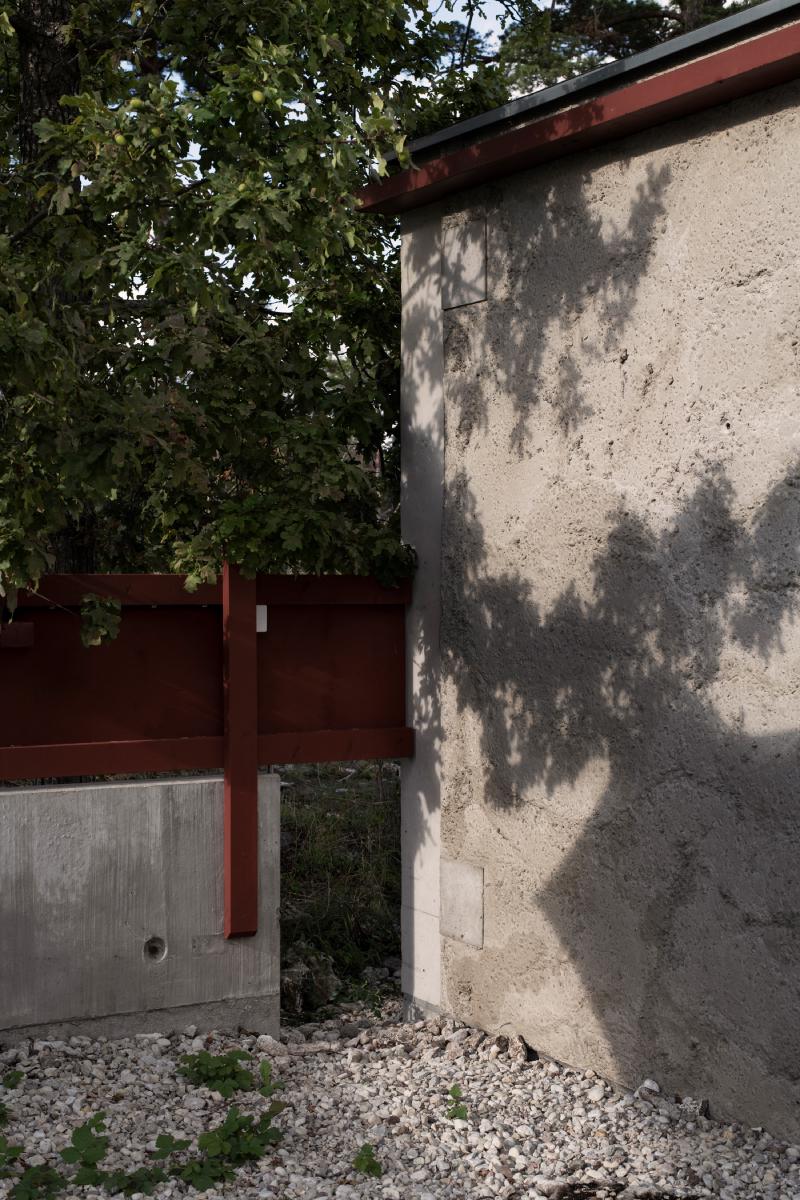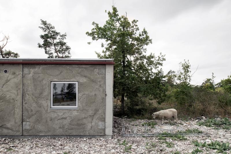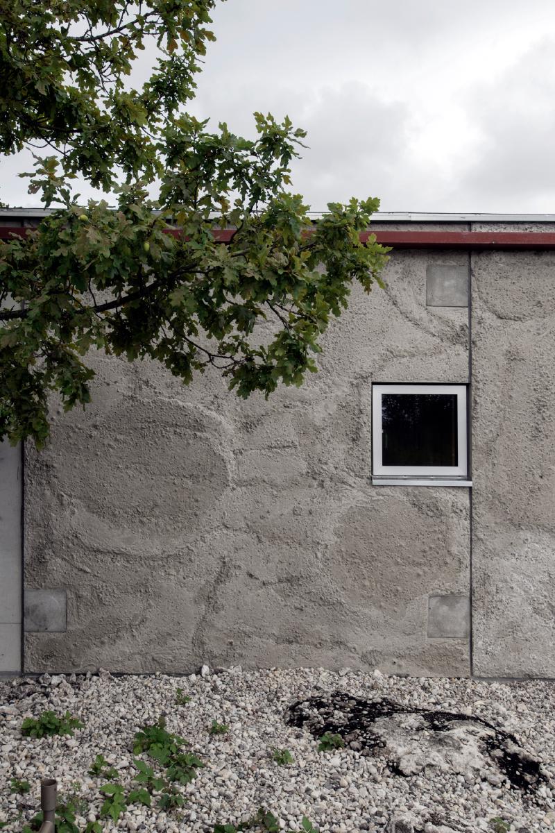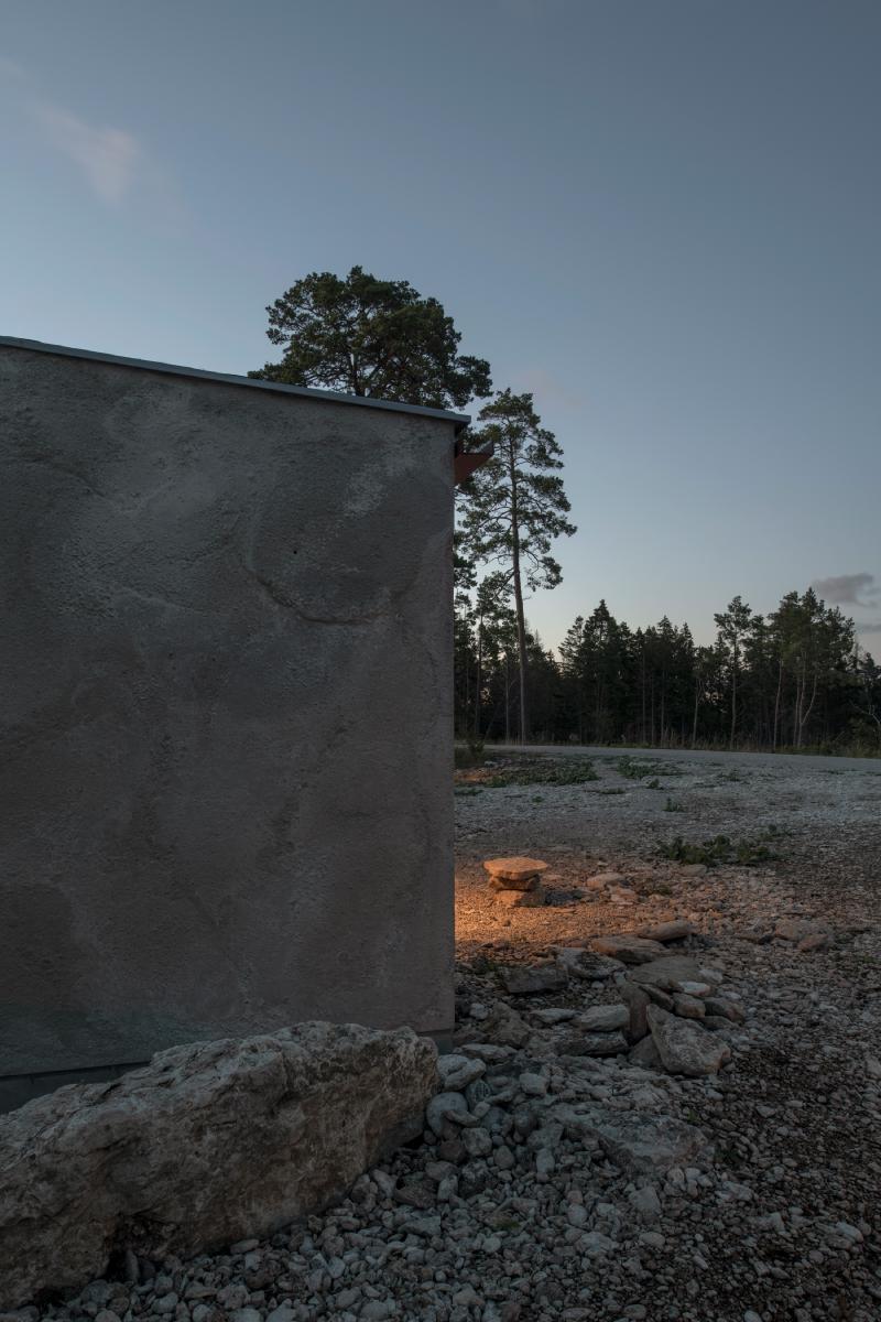 But the inspiration for the house comes not from nature but from industry. An everyday life image of a transformer substation kiosk was the first reference image when the conceptual work began. On site a couple of old concrete blocks was found and worked around. The harsh expression matches the surroundings, as the house is next door neighbor with bunkers and other remnants of military activity.