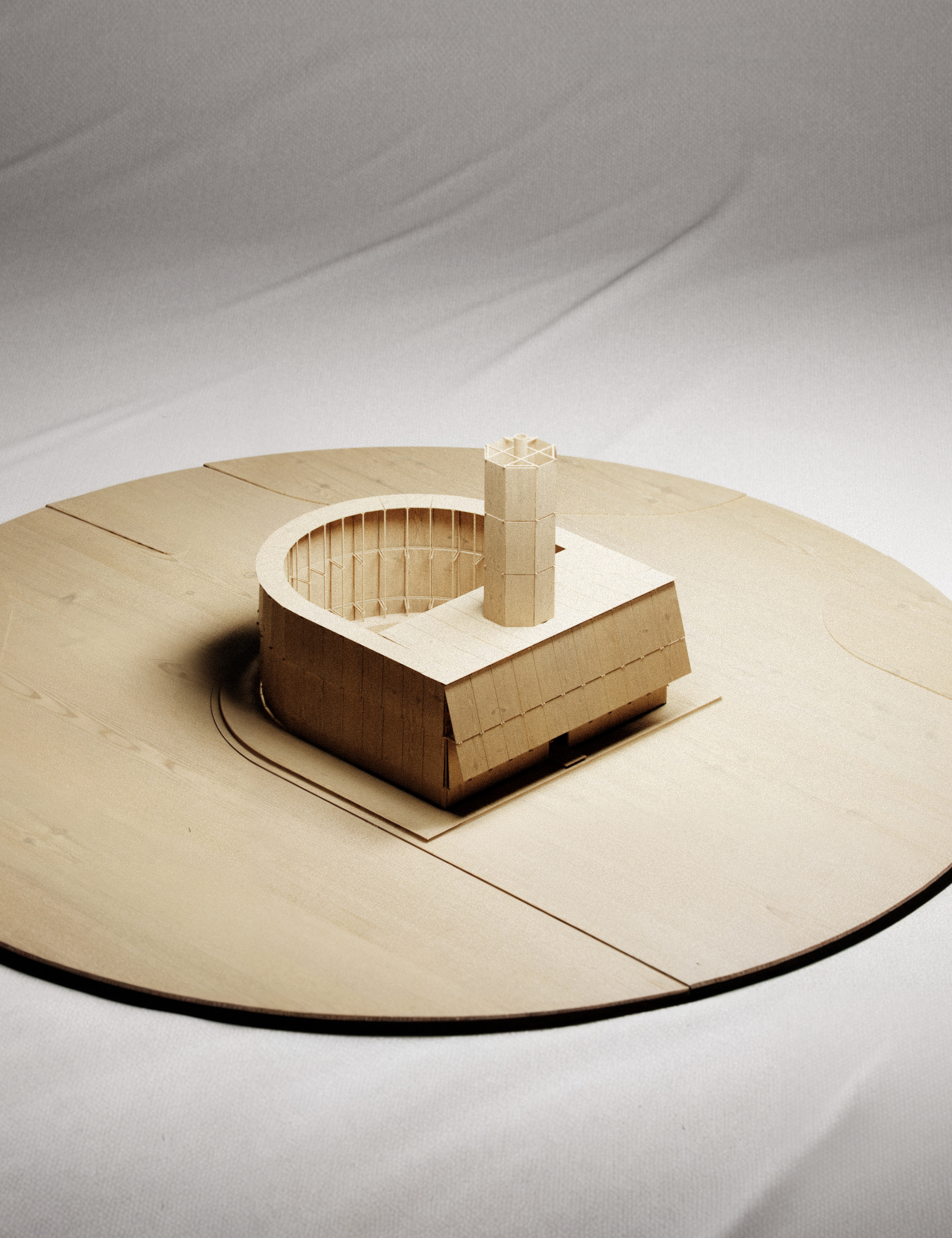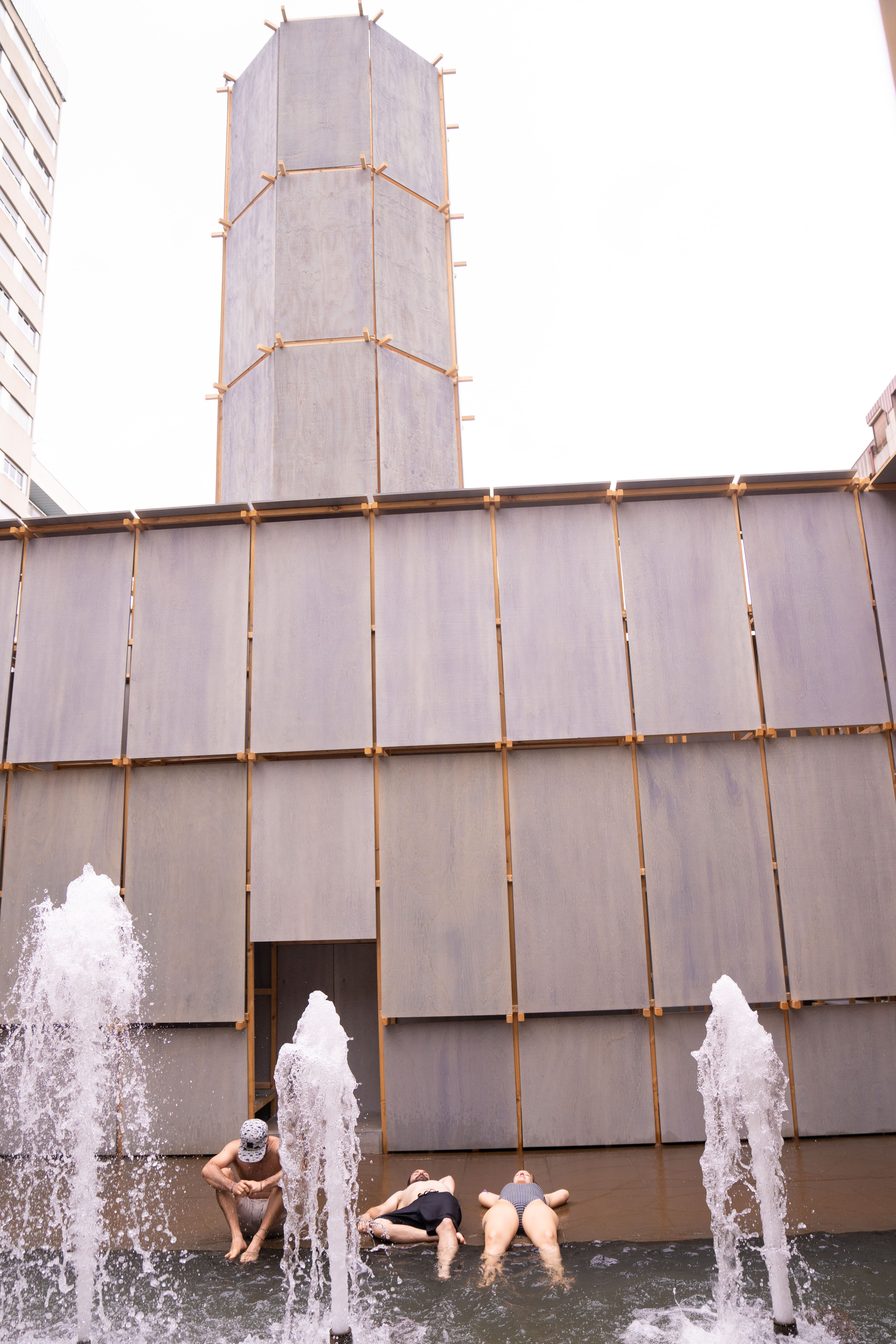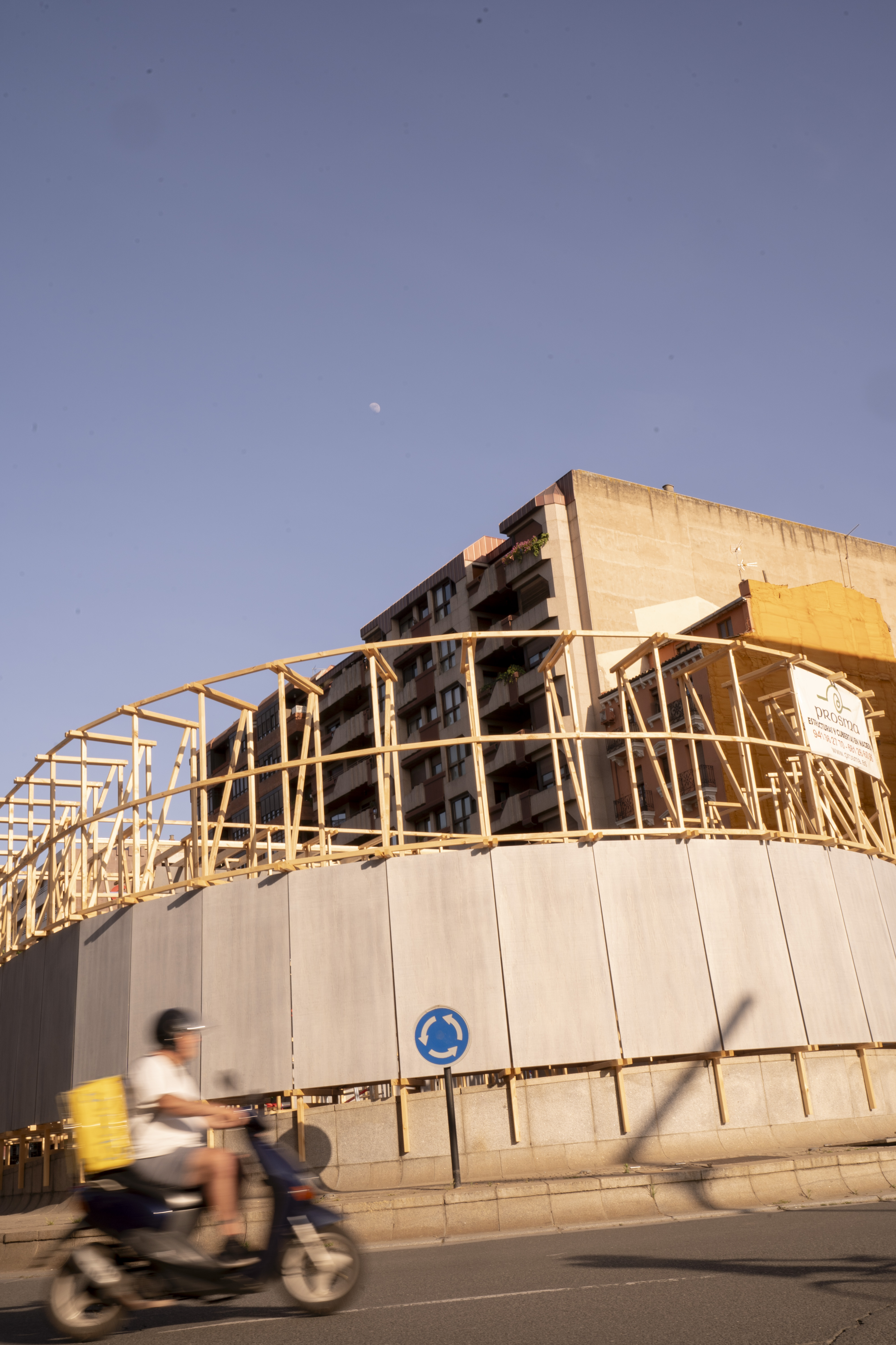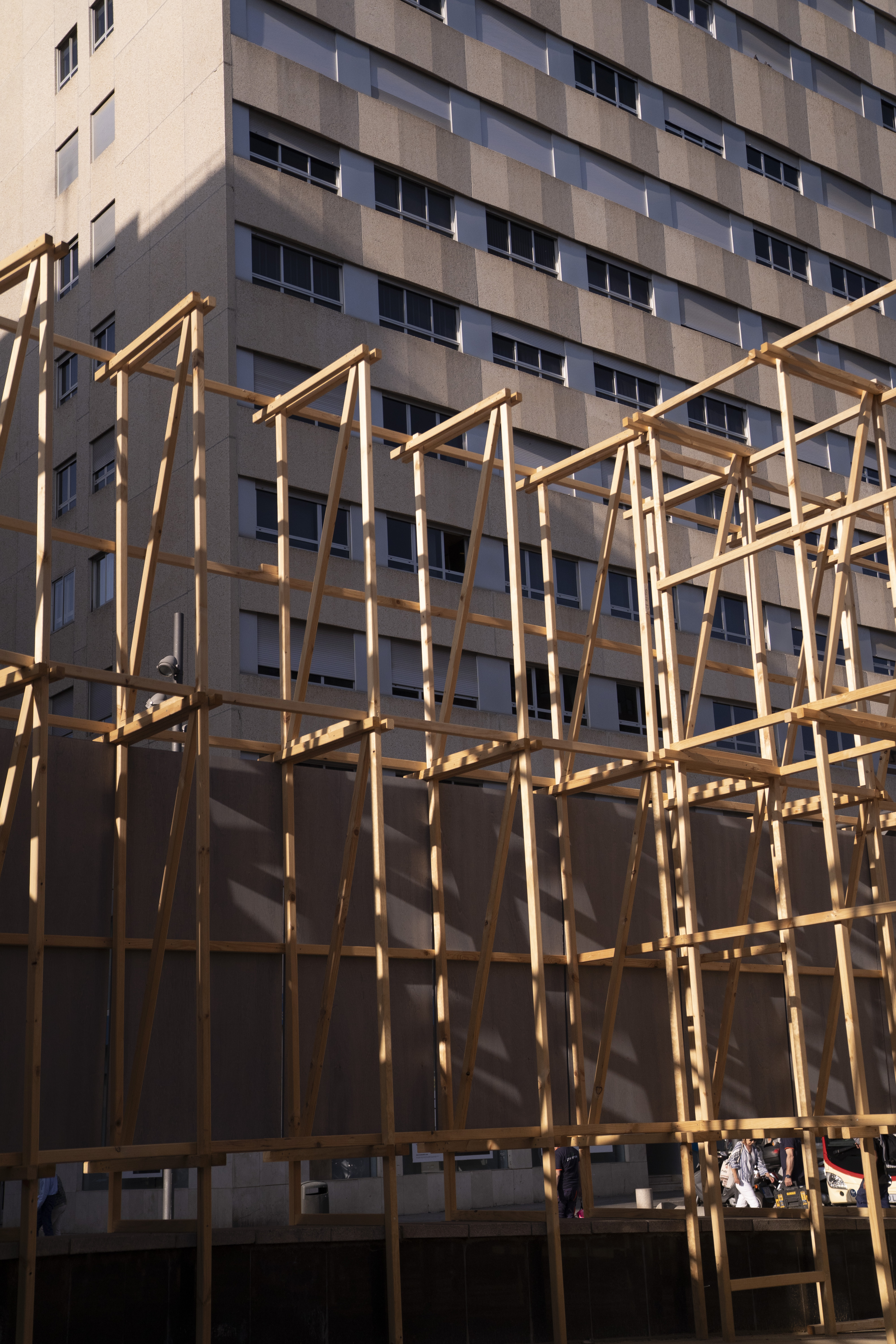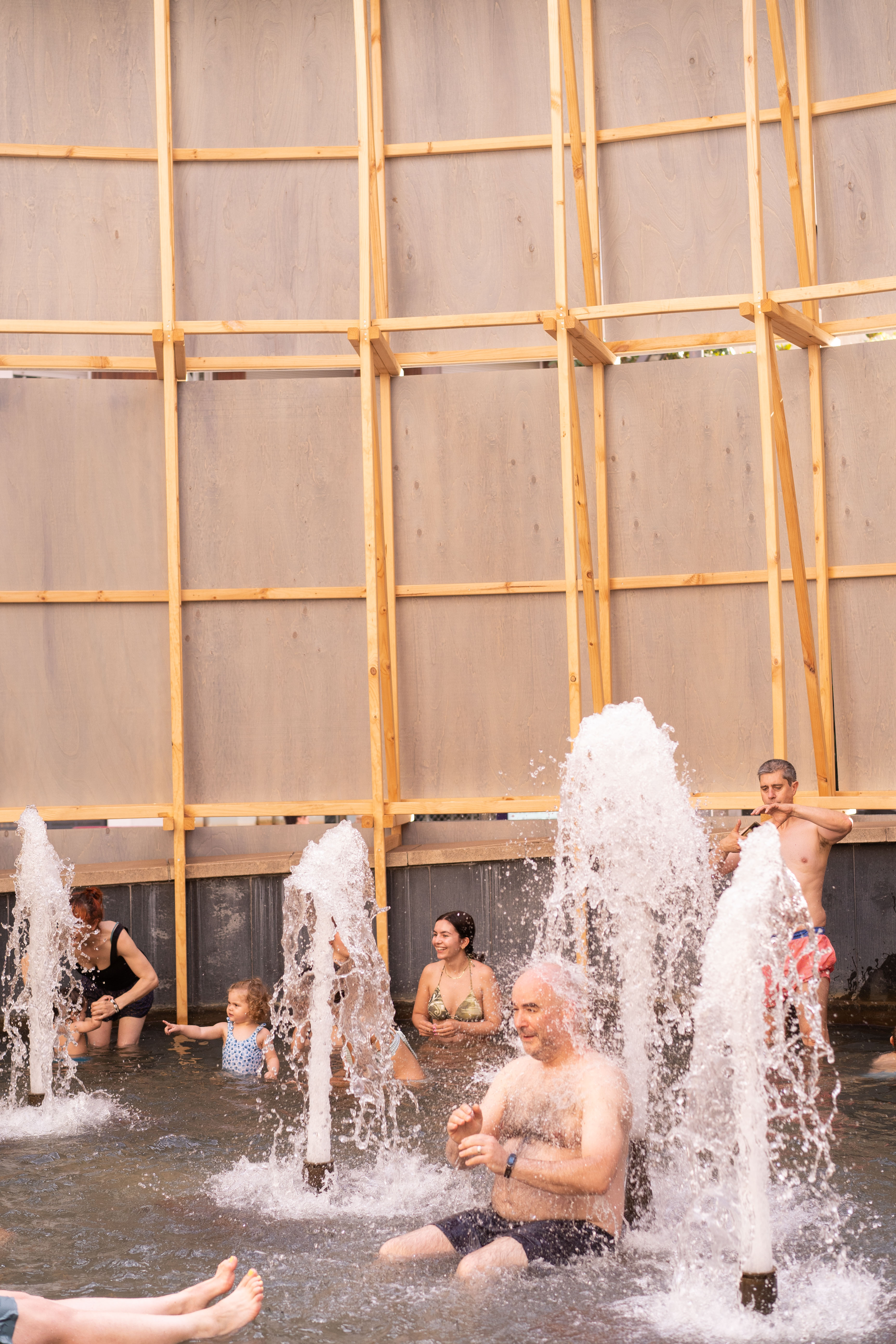 The high walls of the bathing facility are made of a regular @mber structure cladded with uncut wooden panels temporarily used for the installa@on. If the panels will find a second life a\er the festival, the fountain itself will go back to its uselessness, leaving behind only memories and new visions of what public space could be. The heart of the restless circle of motion, shaped by absence, will go back to oblivion; fountain pouring silver into the dark.