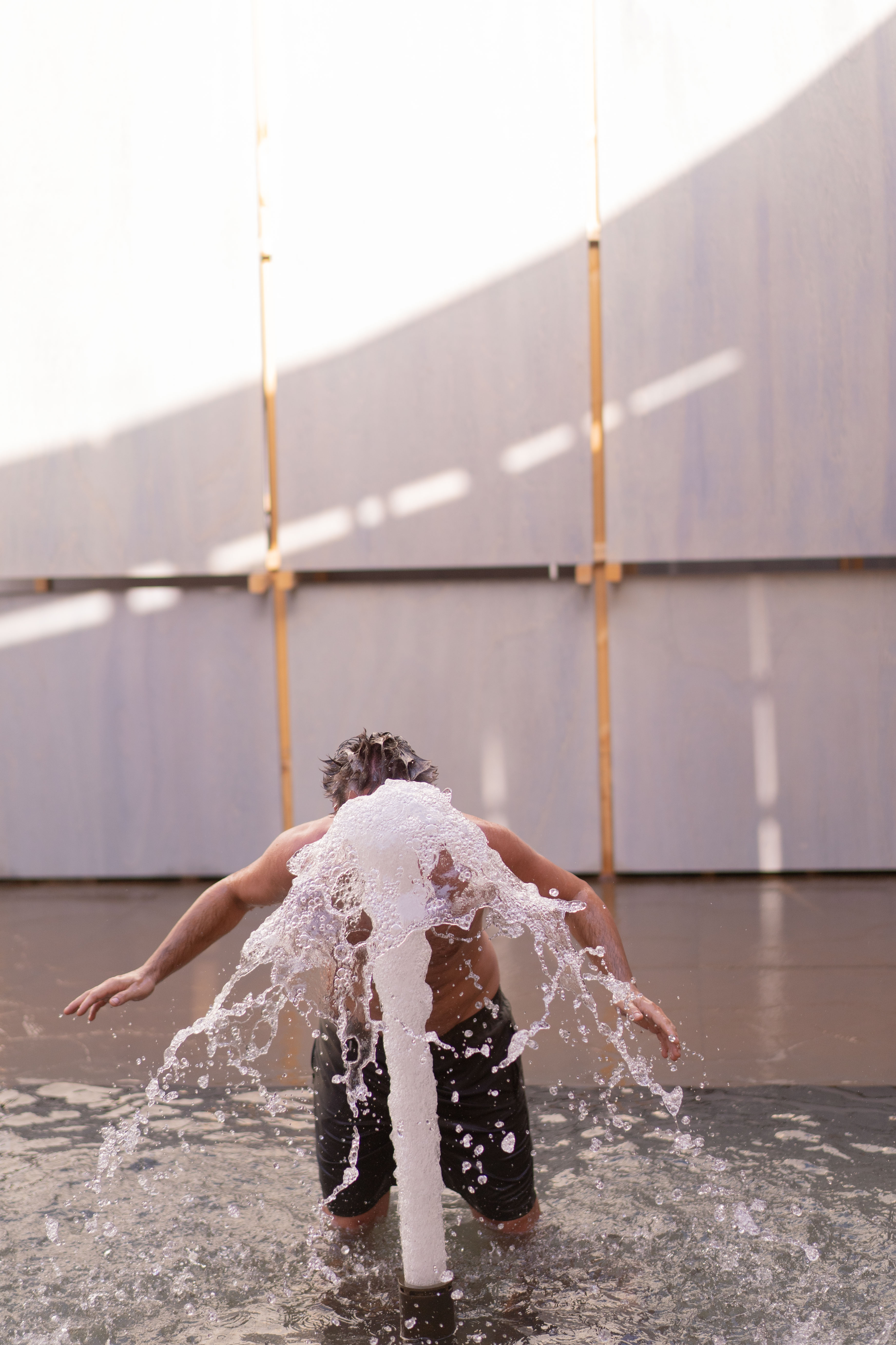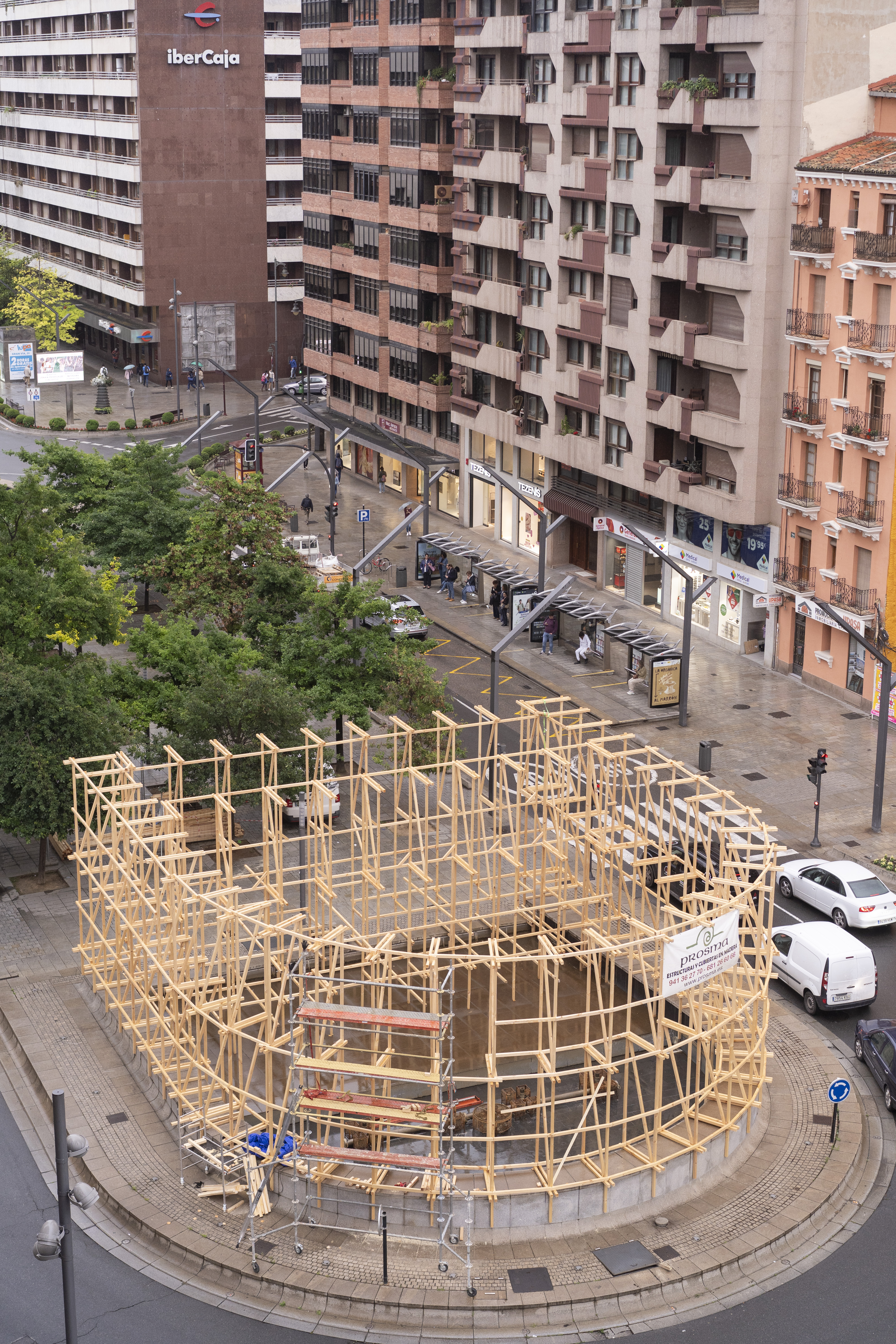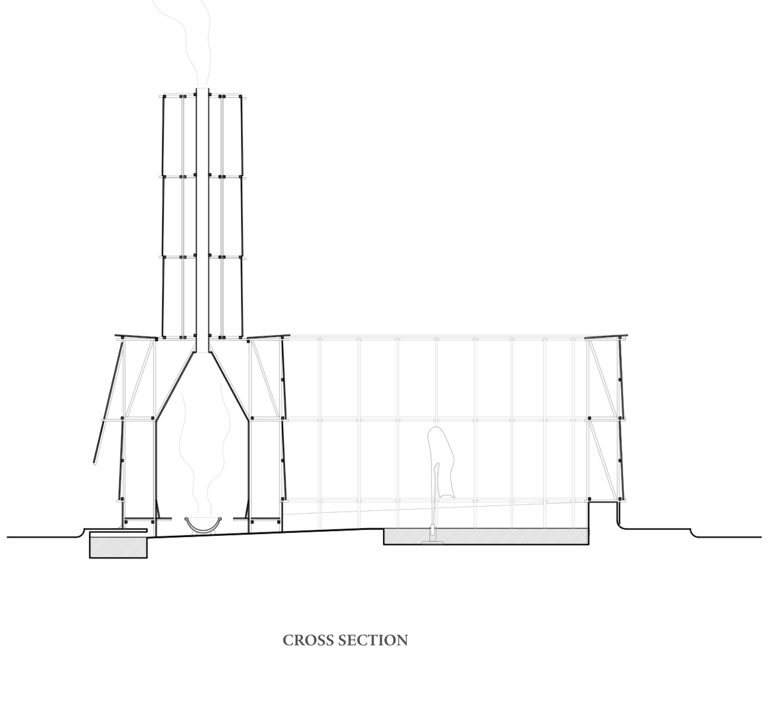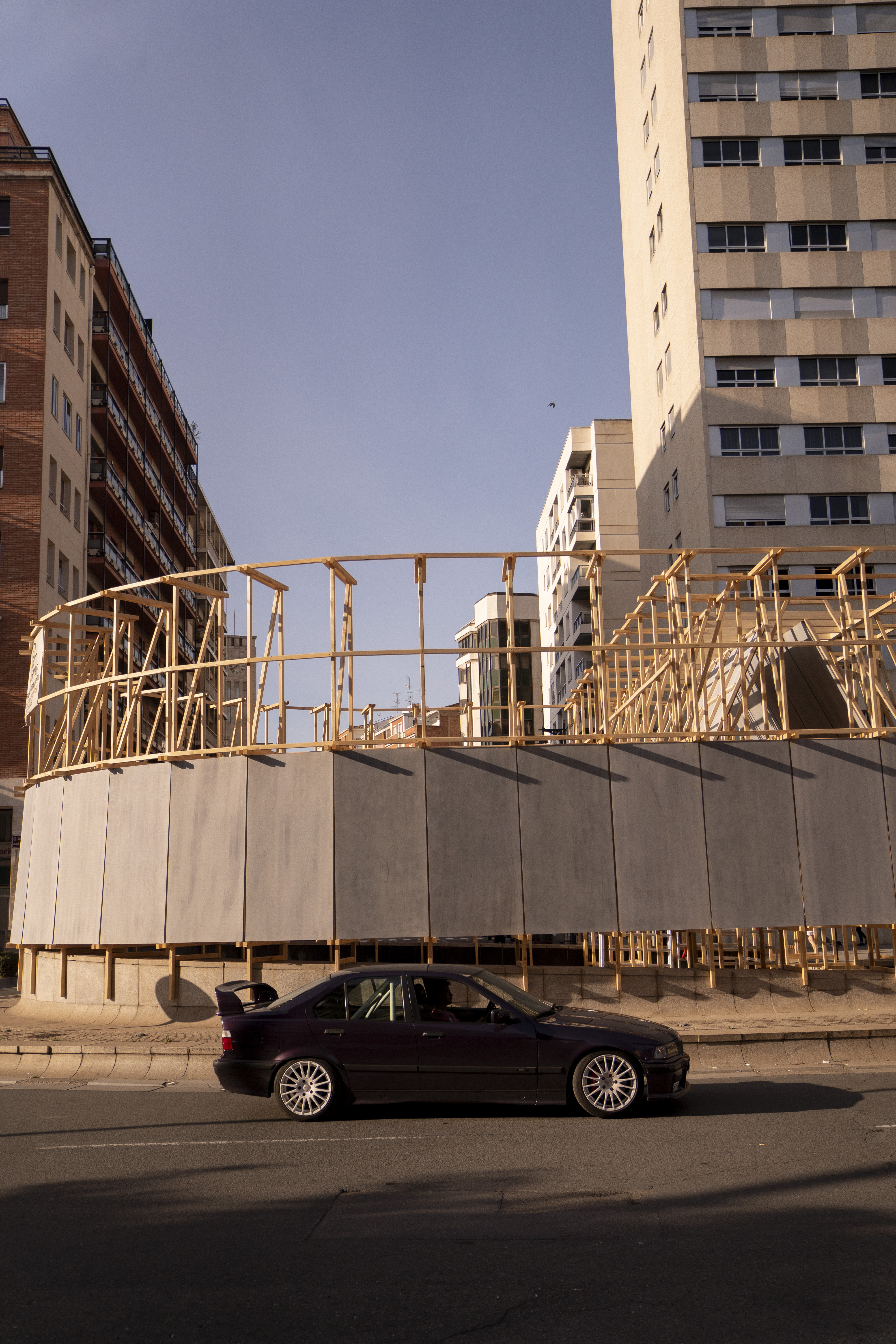 The high walls of the bathing facility are made of a regular @mber structure cladded with uncut wooden panels temporarily used for the installa@on. If the panels will find a second life a\er the festival, the fountain itself will go back to its uselessness, leaving behind only memories and new visions of what public space could be. The heart of the restless circle of motion, shaped by absence, will go back to oblivion; fountain pouring silver into the dark.