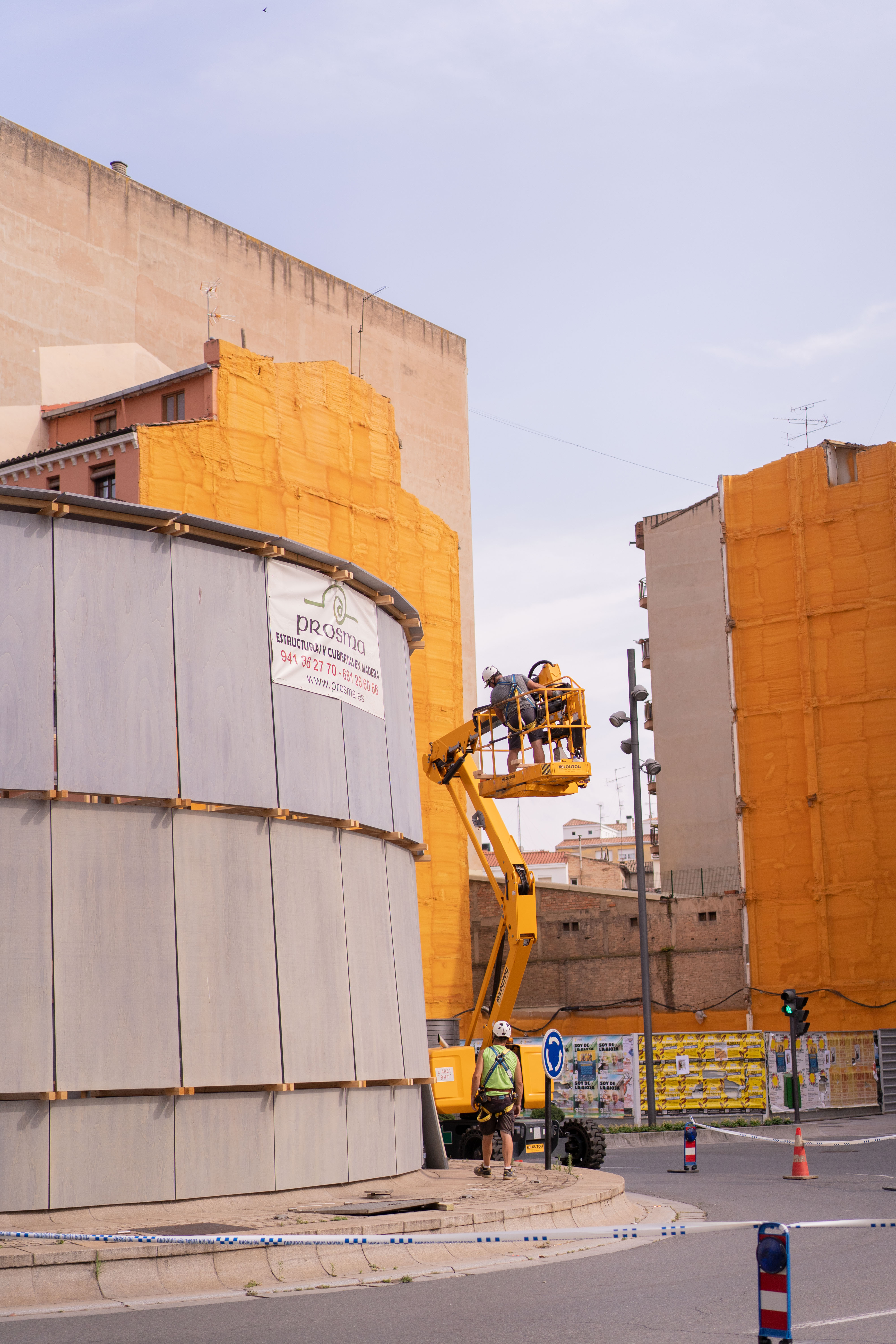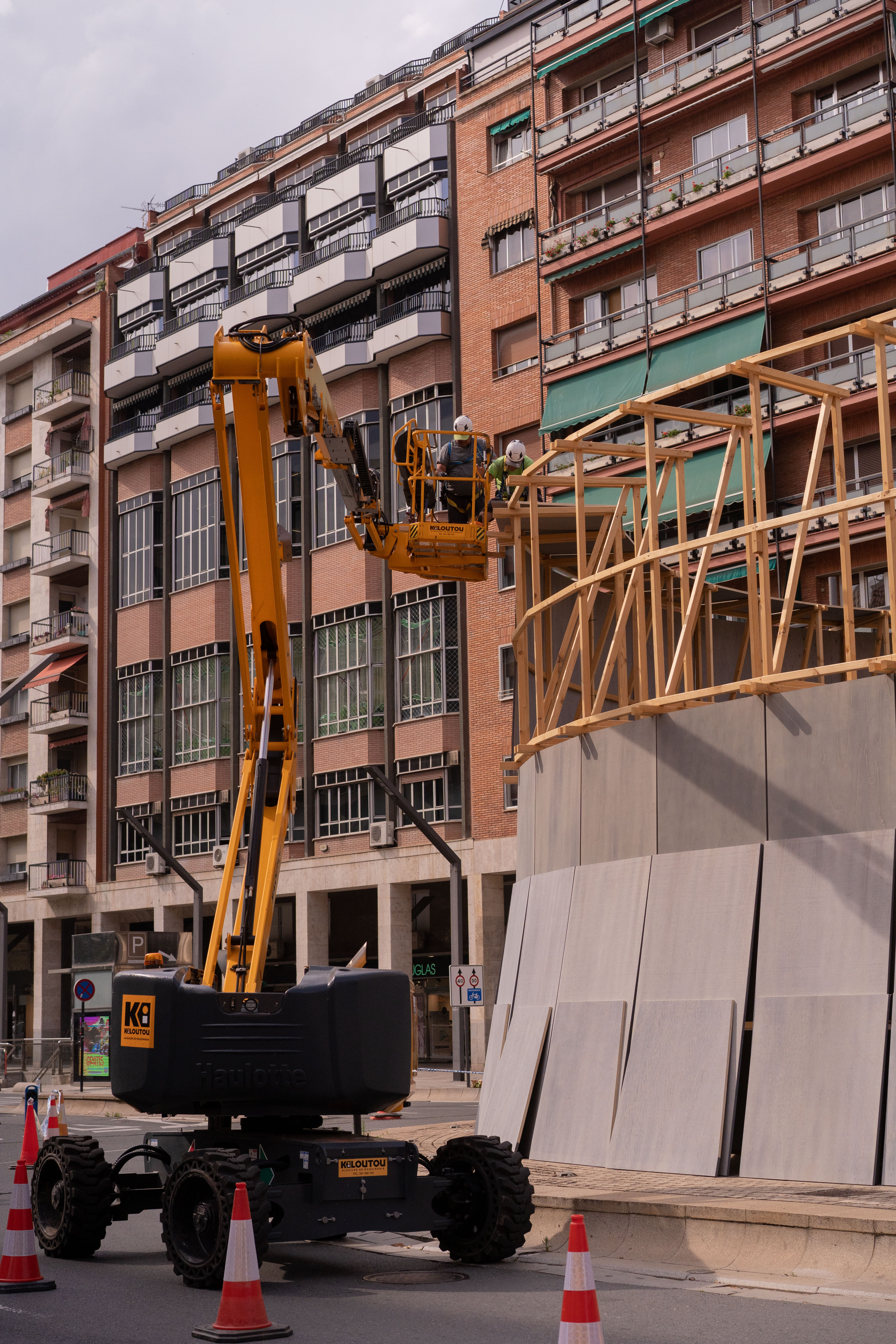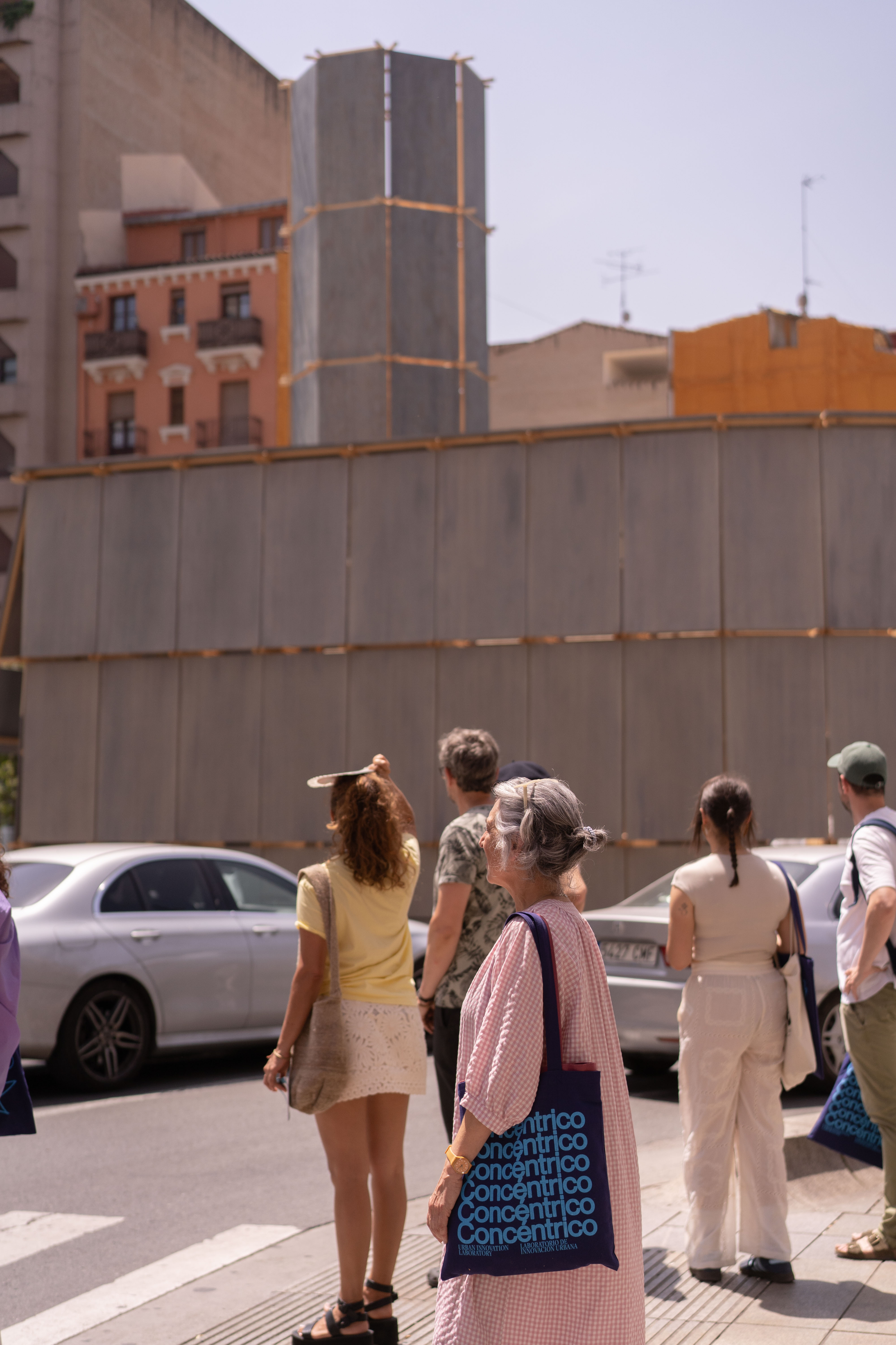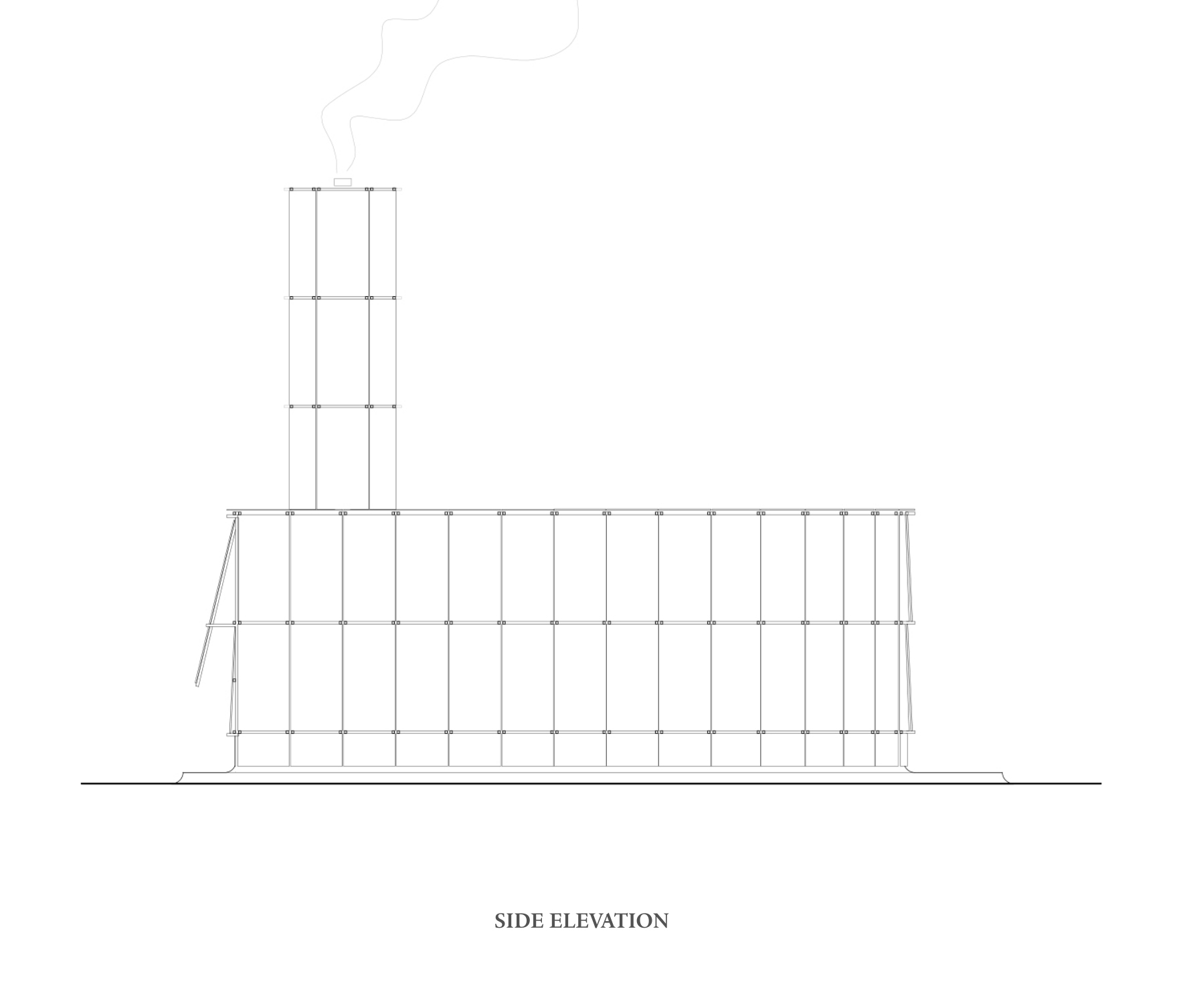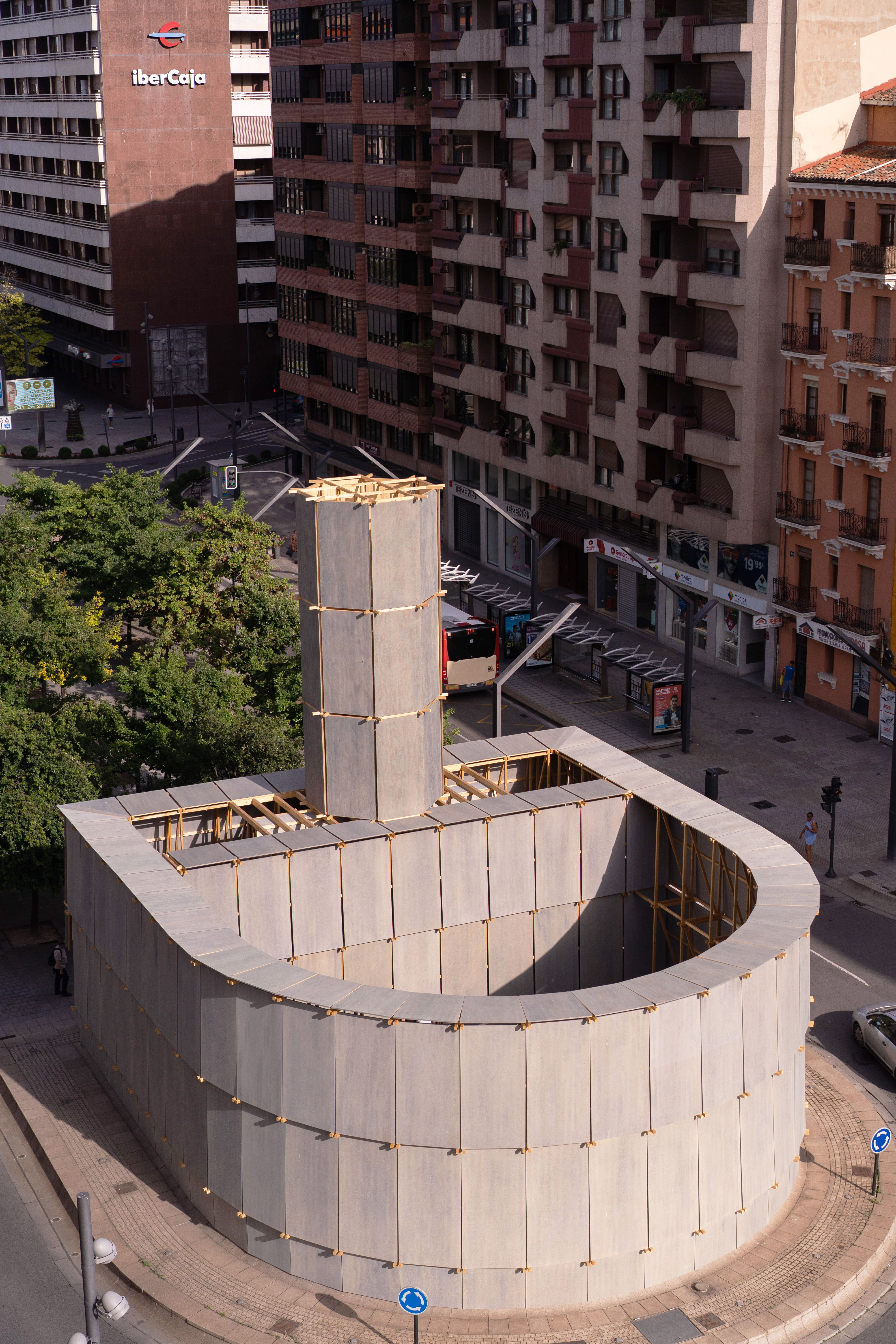 The high walls of the bathing facility are made of a regular @mber structure cladded with uncut wooden panels temporarily used for the installa@on. If the panels will find a second life a\er the festival, the fountain itself will go back to its uselessness, leaving behind only memories and new visions of what public space could be. The heart of the restless circle of motion, shaped by absence, will go back to oblivion; fountain pouring silver into the dark.