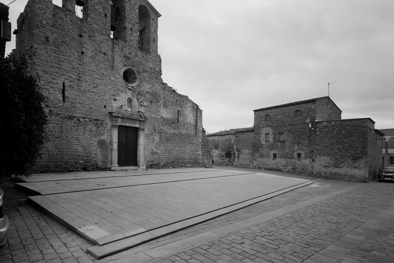 Una de mis primeras obras, pavimentar un pueblo medieval, acabada hace muchos años. En la visión de Bernadó aparece nueva, colorista, viva. Recuerdo la visión del camino (que Bernadó recoge), construido señalando la traza continua del movimiento. Piedras que permanecen y nuevos accidentes que señalan la transformación. Aunque el suelo muestra base, como geometría y soporte, subsiste impertérrito. Josep Lluís Mateo