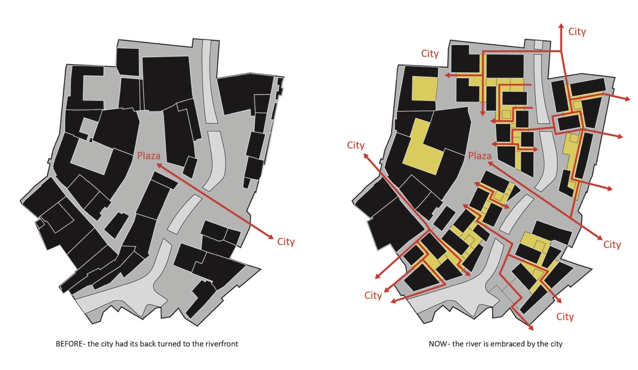 The project combined restoration with innovation. A historic bridge and 11 existing buildings were rehabilitated, while nine new structures were constructed. A key aspect of the design was the re-stitching of both riverbanks through new pedestrian bridges and enhanced visual and physical access to the river, previously blocked and used for waste dumping. The riverbed was also recalibrated to manage flooding during the rainy season, improving both safety and ecological performance.
