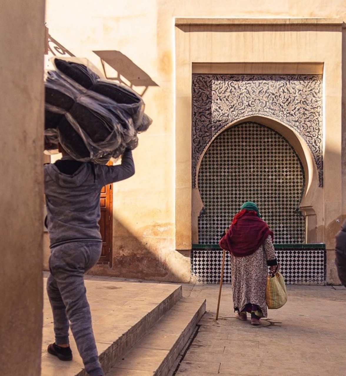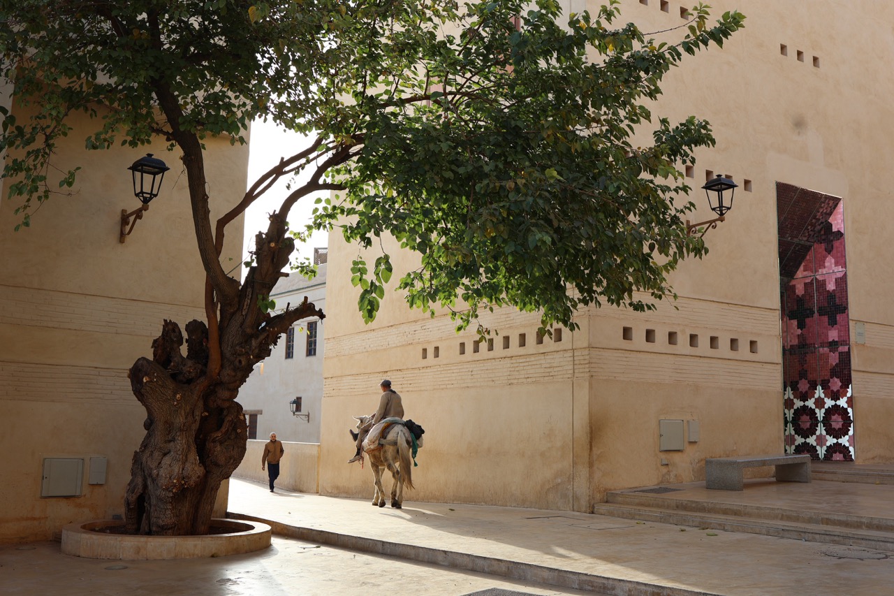 The tiles transition from classical Moroccan motifs to Spanish mutations and finally to modern abstract patterns. These colourful surfaces not only add to the cooling of the courtyard but also function as intuitive signage marking each type of artisan workshop.