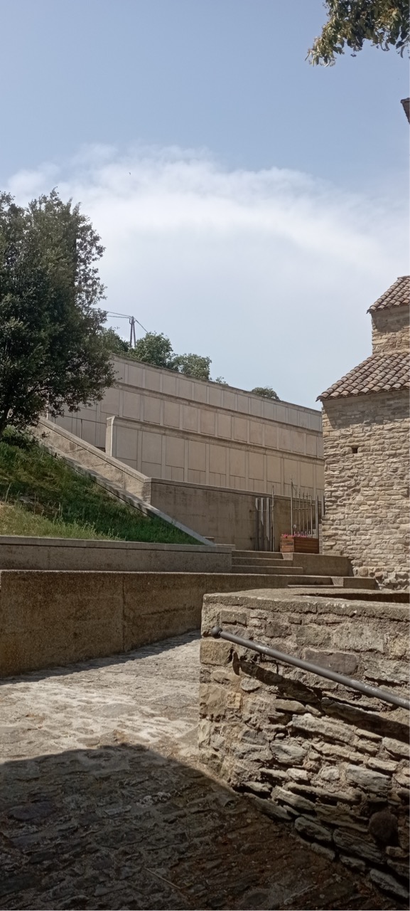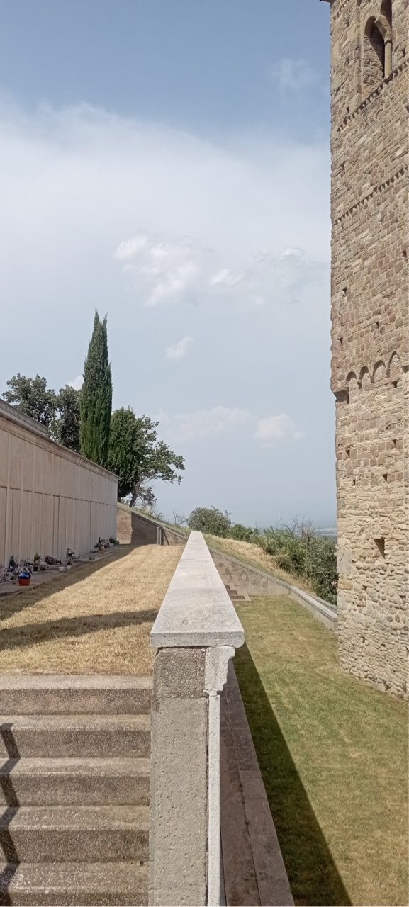 A permanent play of shadows expresses the presence and dialogue with the invisible, while the bell tower—forming a vertical triangle with two newly planted cypresses—acts as the gnomon of a sundial, slowly casting shadows over the white walls and revealing the passage of time.