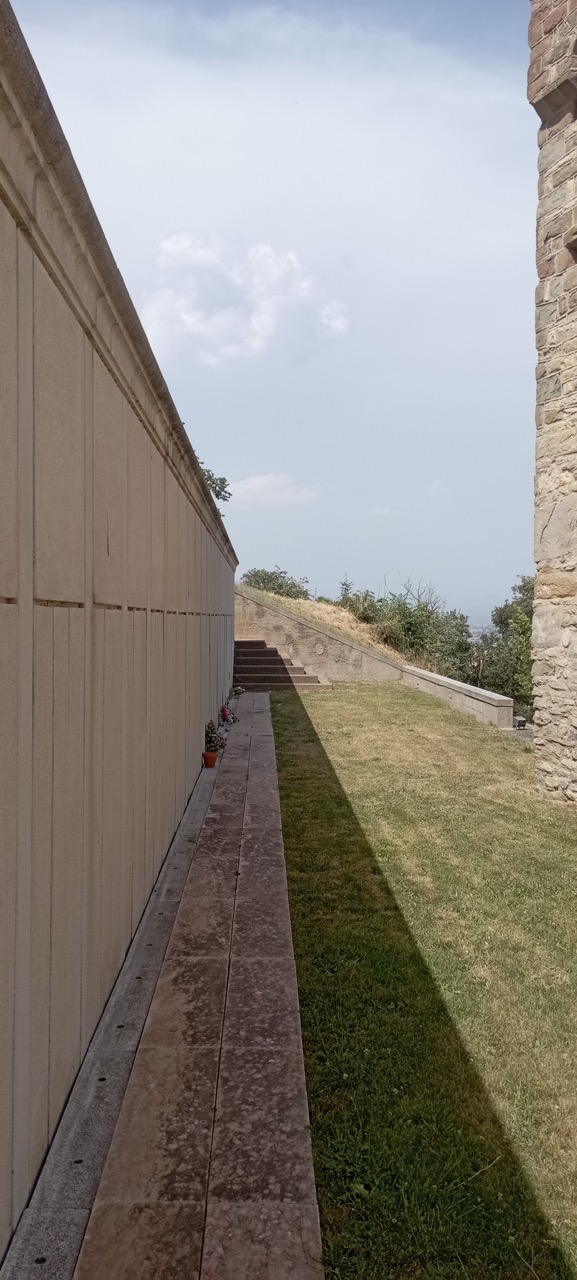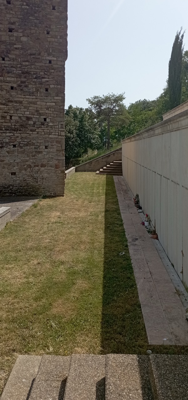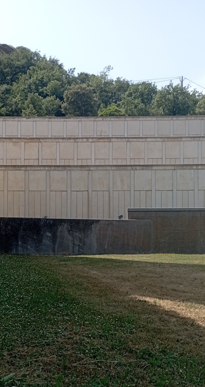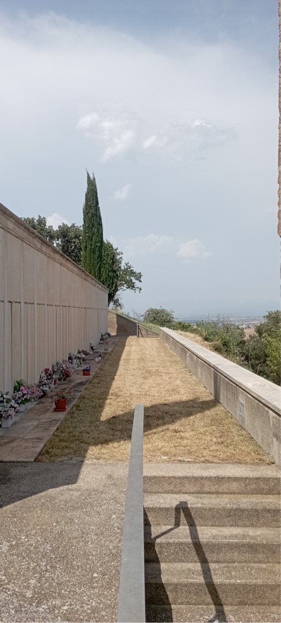 The soil that dampens the wall is replaced by a stepped enclosure with three levels, each formed by a row of double prefabricated niches, covered with white artificial stone slabs. As these are topped with soil and grass, they give the appearance of graves set into the ground.