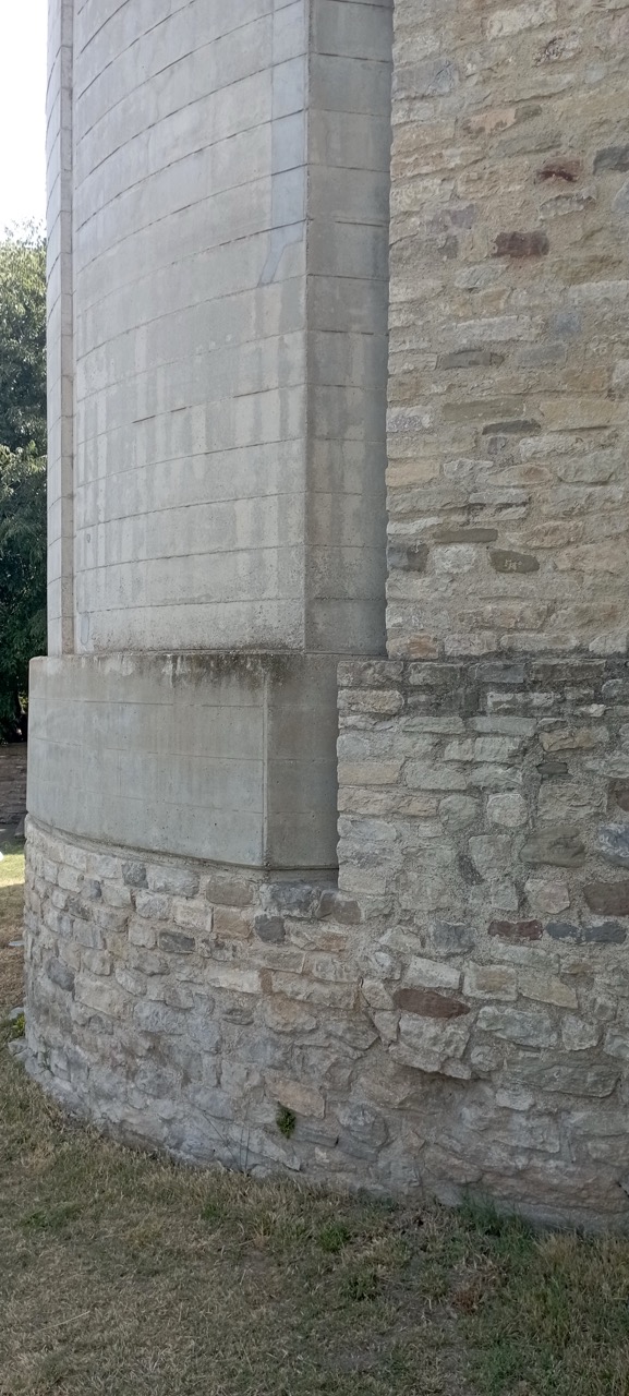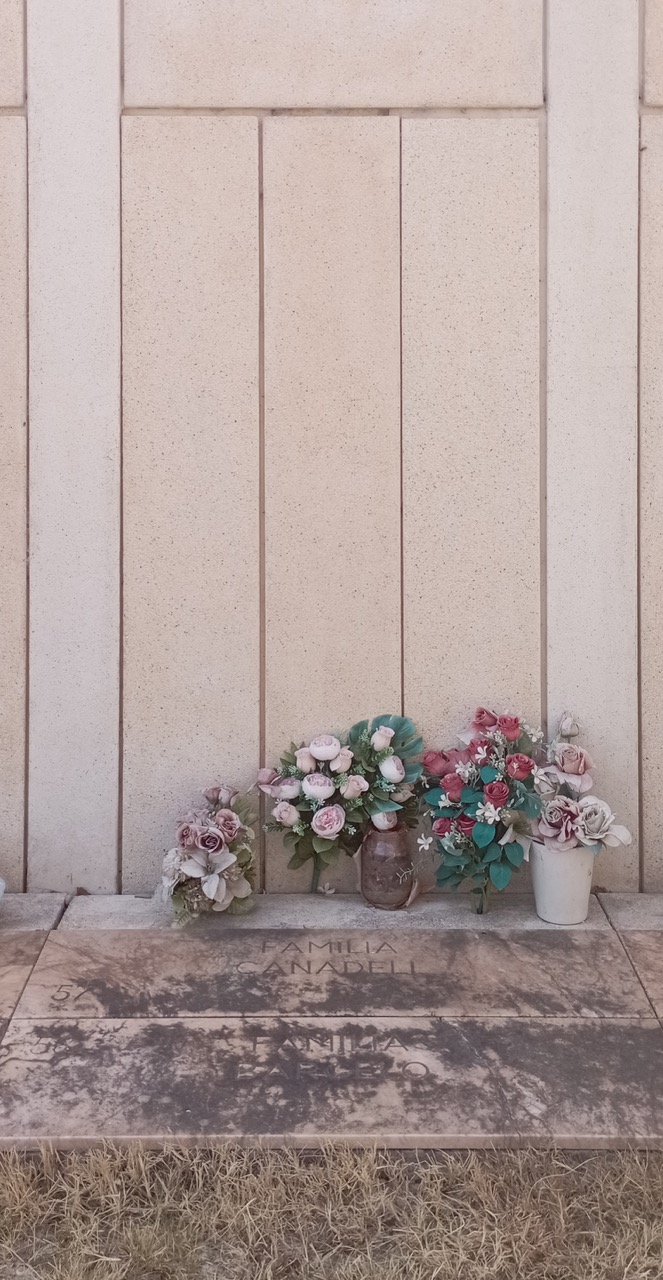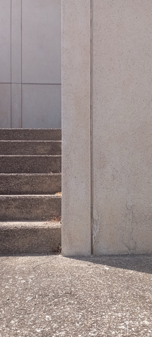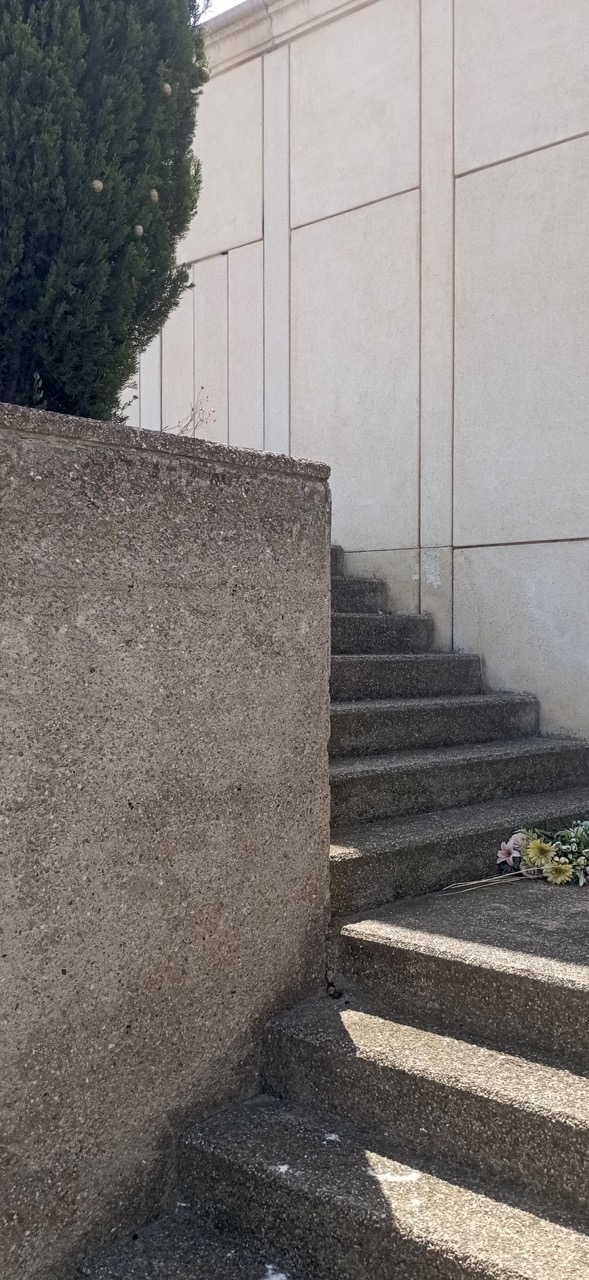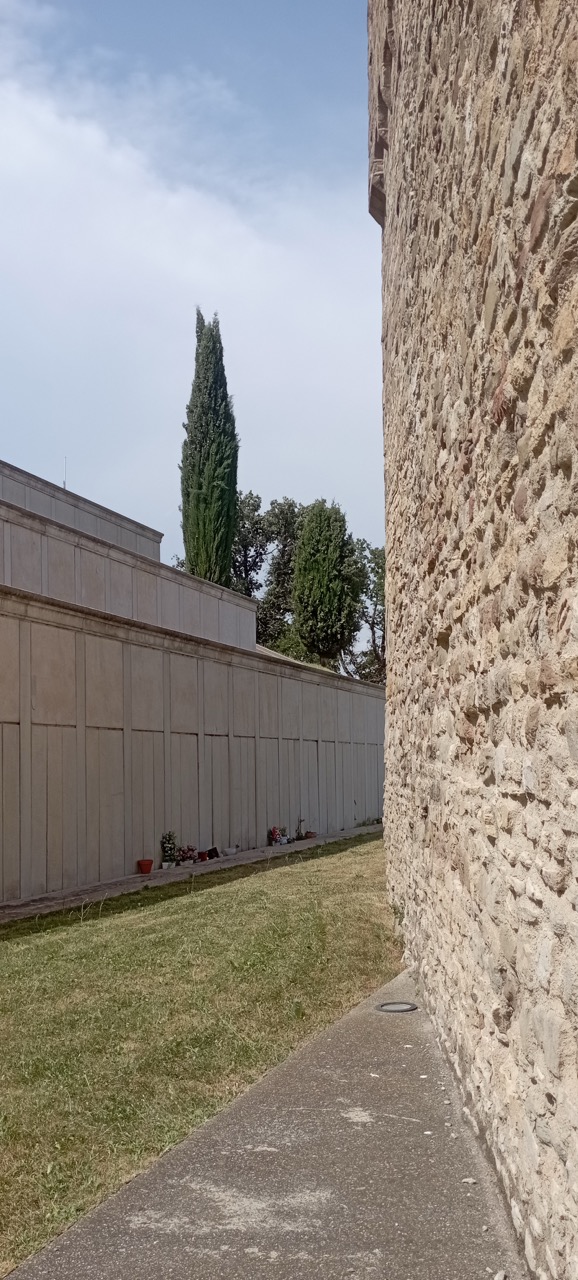 The soil that dampens the wall is replaced by a stepped enclosure with three levels, each formed by a row of double prefabricated niches, covered with white artificial stone slabs. As these are topped with soil and grass, they give the appearance of graves set into the ground.