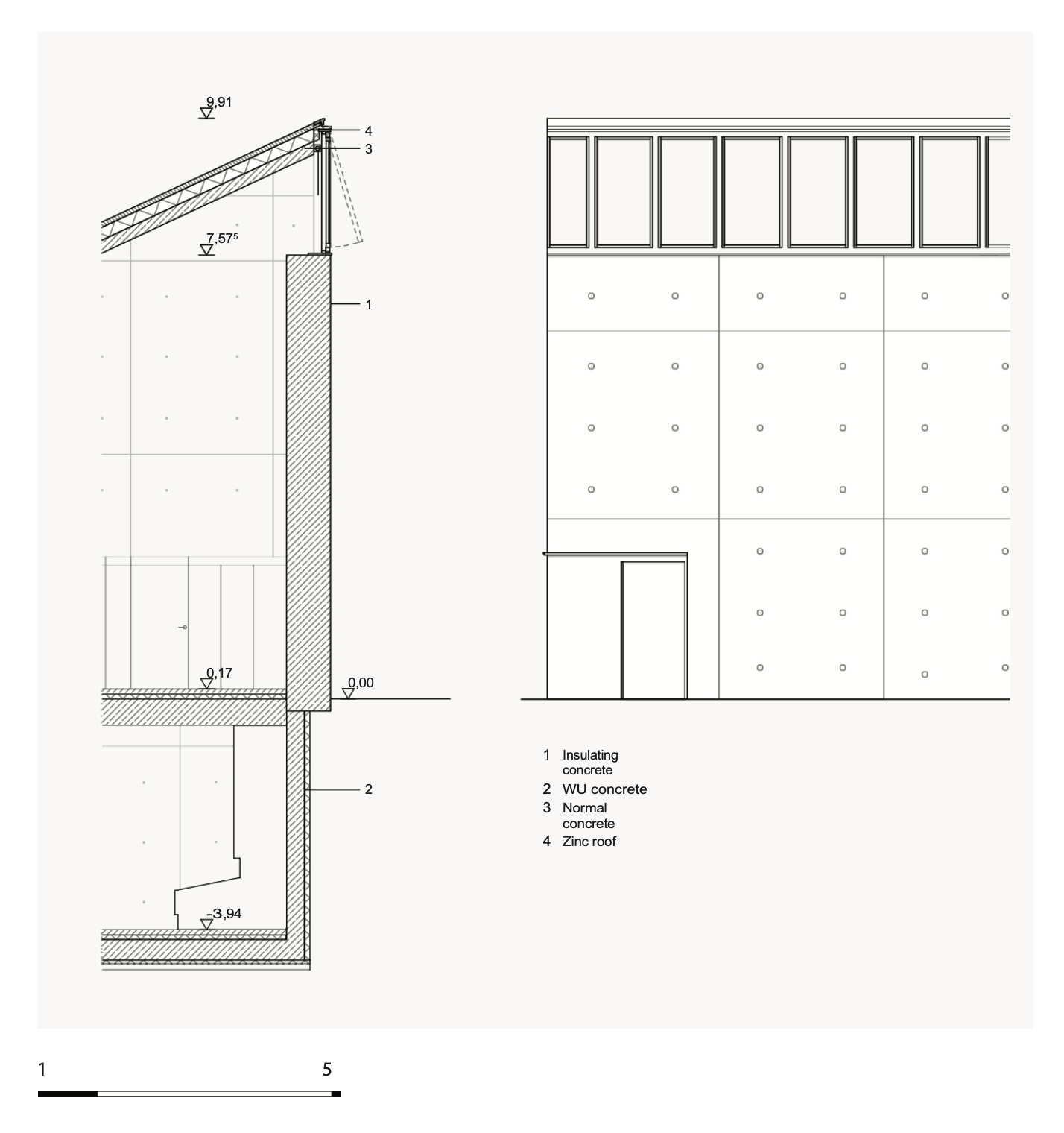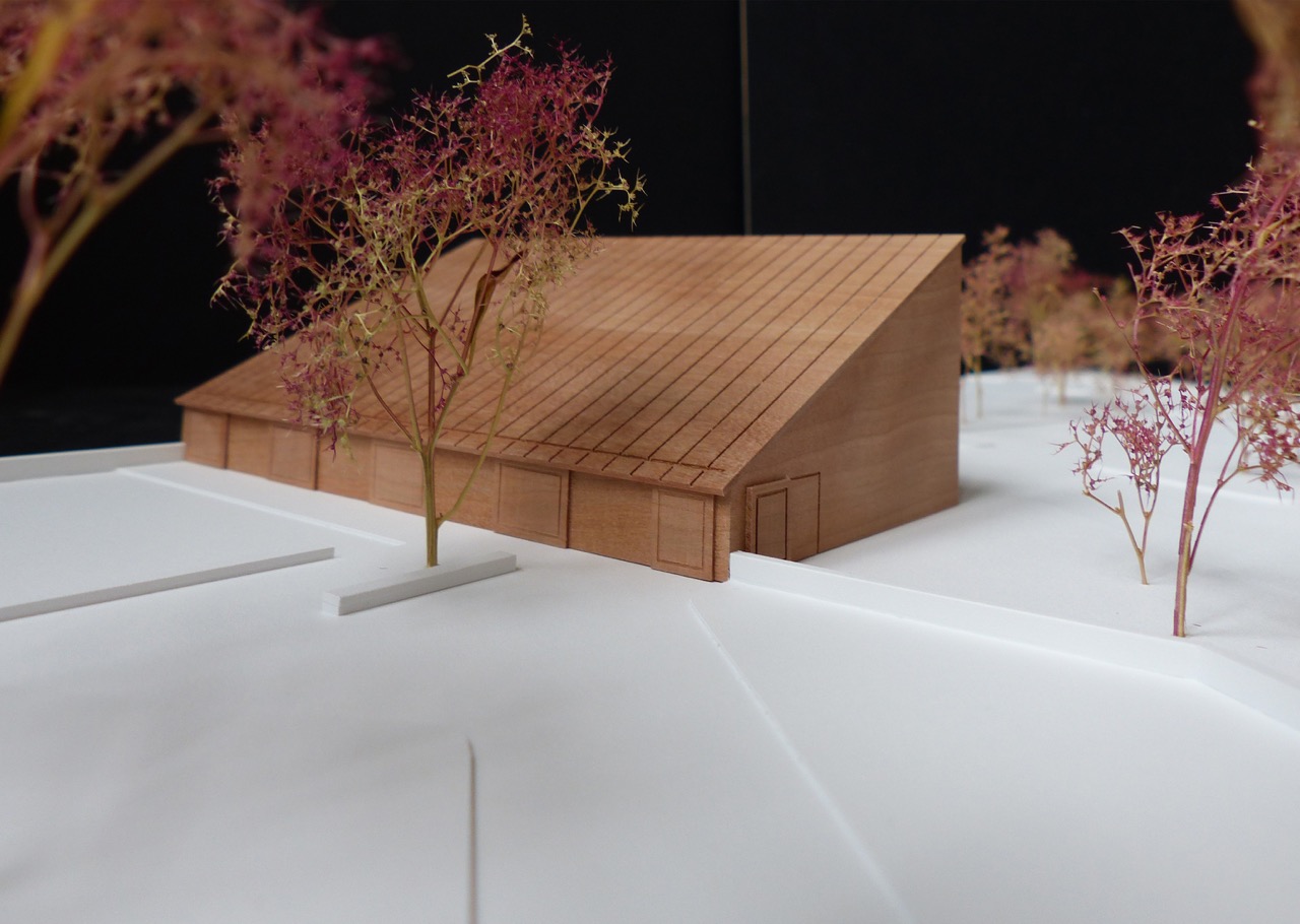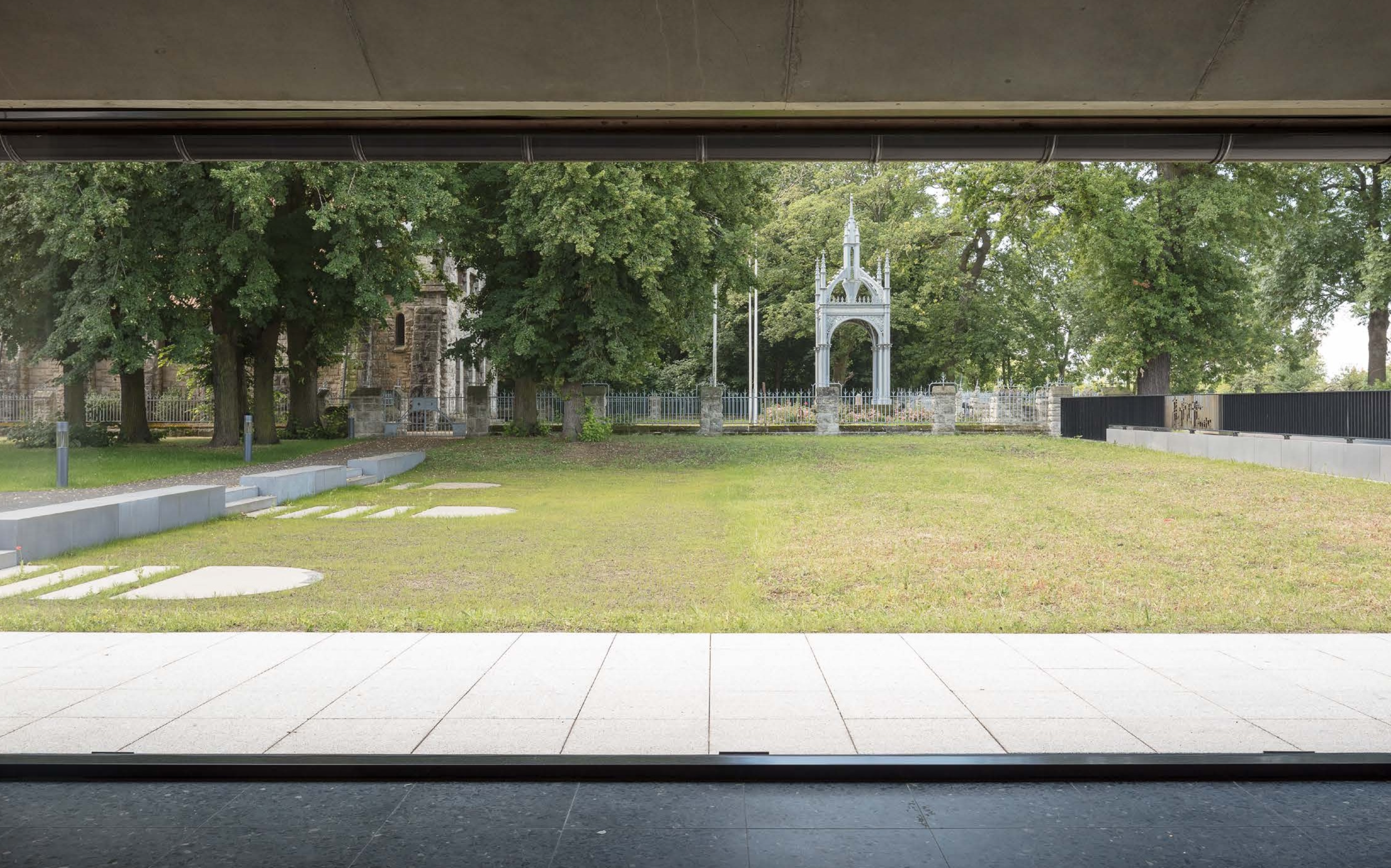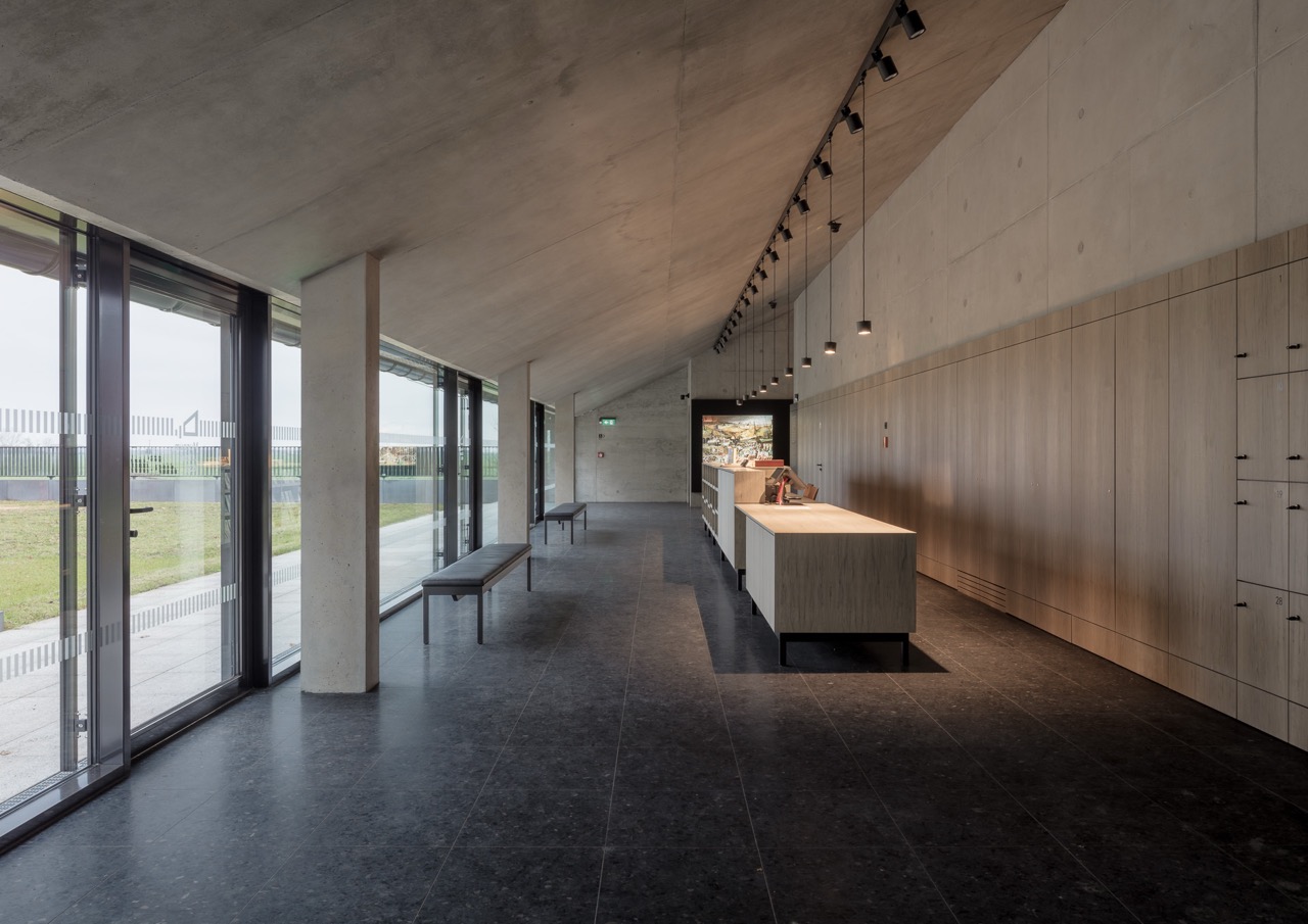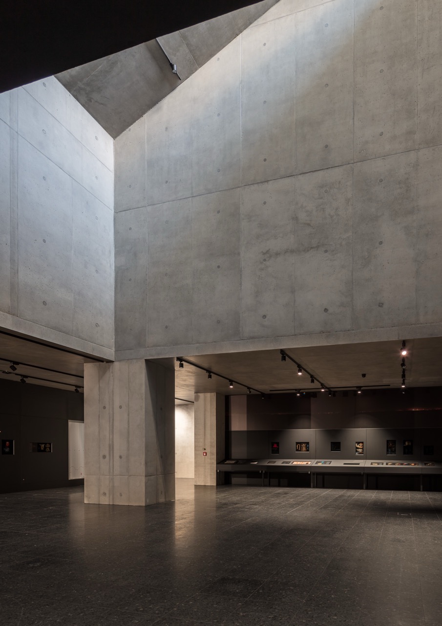An elongated foyer that accompanies the memorial garden provides access to the museum from the car park via the southern gable end. The glass façade along the entire length of the building opens up the space to the historical memorial site with the granite boulder and the chapel. The outside space becomes the image and thus also the background to the events in the foyer. An educational room on the ground floor complements the museum’s offering with the important function of imparting knowledge. The actual exhibition begins at the end of the foyer with the prologue room.