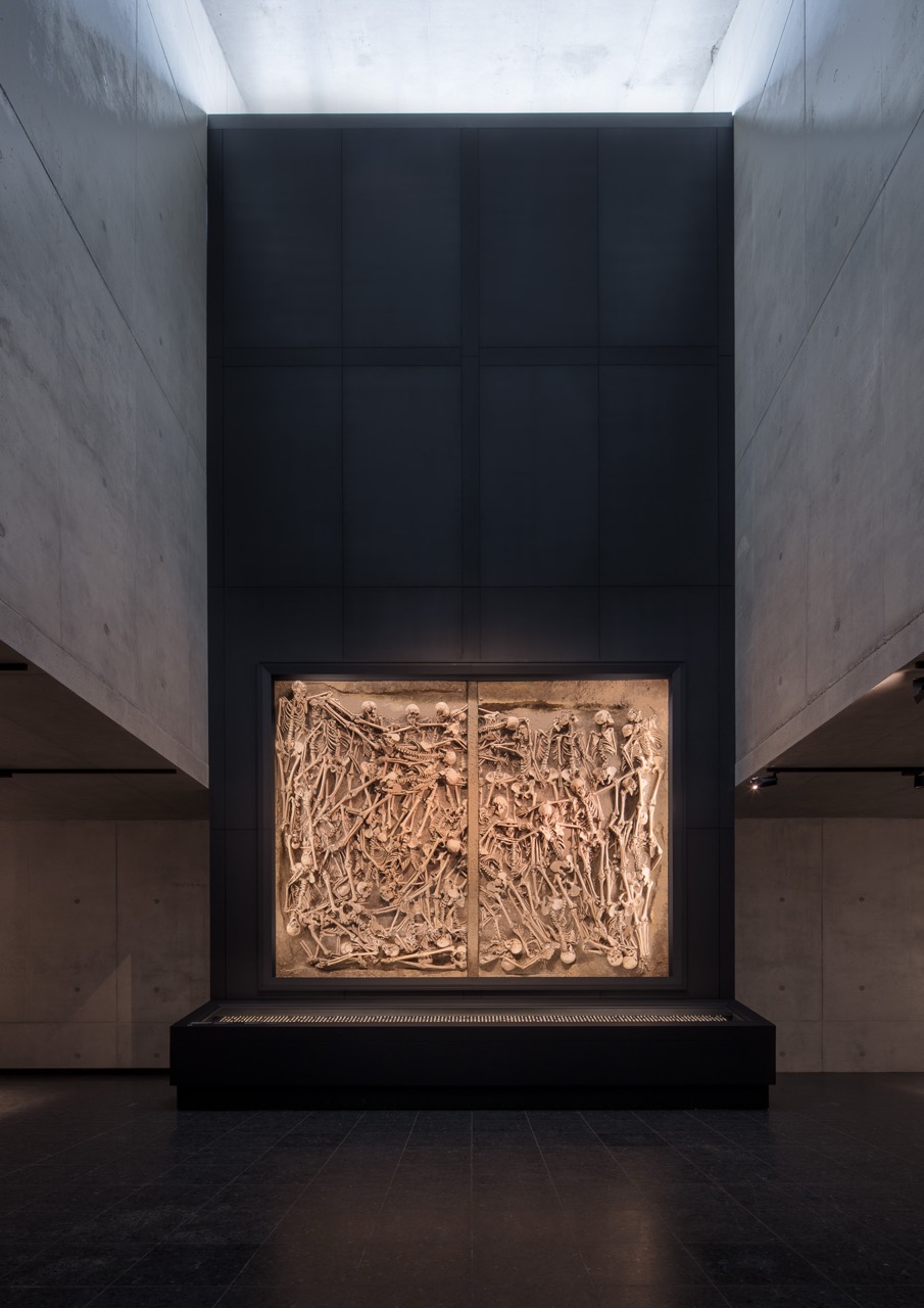 A single flight of stairs leads to the completely windowless windowless, buried basement. It is actually just one room, zoned by squat pillars and with an opening in the centre of the ceiling. The air space extends right up to the roof Staircase to the basement and reaches a height of almost 12 metres at the highest point of the lean-to roof. The 6 x 6 metre installation with a display case in front of it and the mass grave, which has been transformed into a relief-like image, can be seen there. The showcases and information boards set up in the lower areas of the room allow visitors to get a detailed picture of the people and the battle. The result is a spatial effect that can be perceived as both a museum and a memorial. Visitors leave the exhibition via a second staircase that leads them back into the foyer.