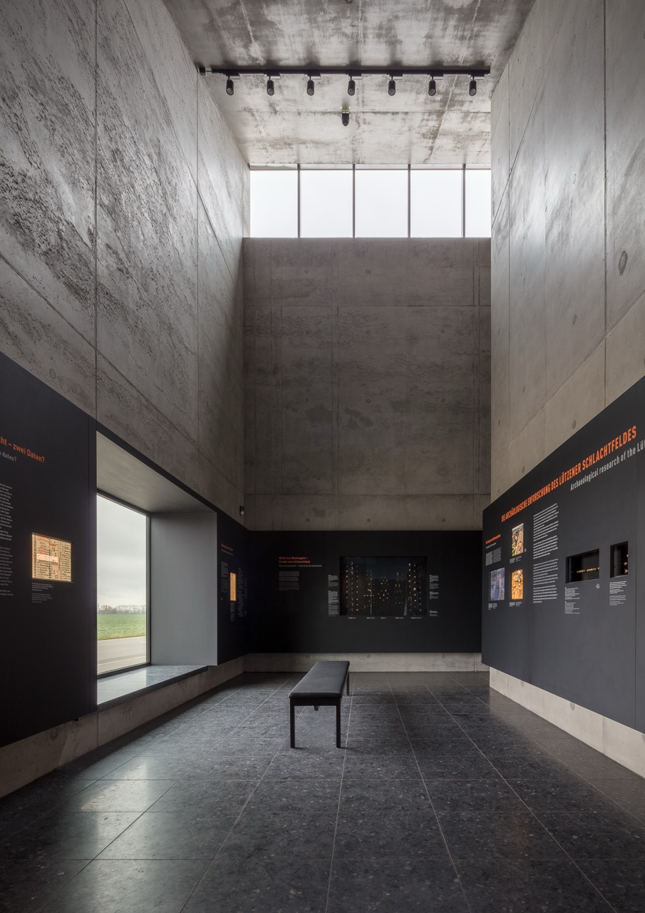 This small room is characterised by two openings. The first is a ribbon window, which is located at a height of around 8 metres due to the steeply rising roof. The window creates a central incidence of light along the roof surface and ensures glare- free and diffuse light in the room. On the other hand, there is a panoramic window that is orientated towards the former battlefield. The format, dimensions and arrangement resemble a painting in a gallery. The visitor experiences the authentic site of the battle by looking out over the fields and gets in the mood for the visit to the exhibition in the basement.