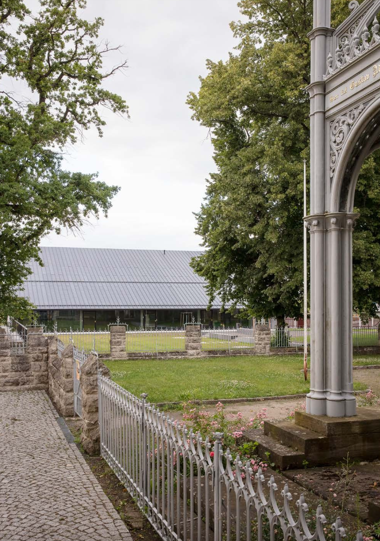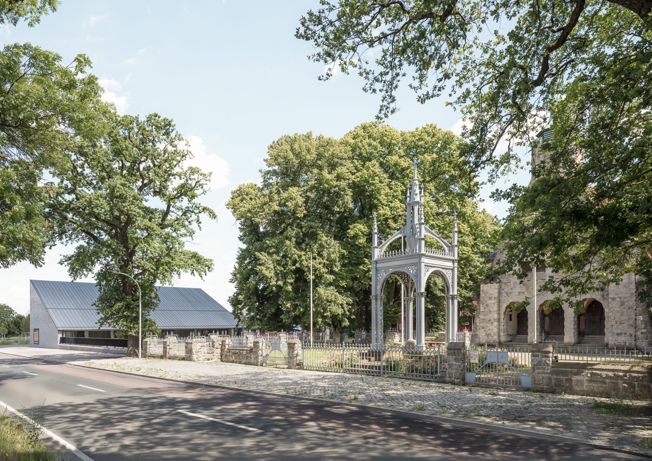 Today’s museums are convincing as exciting places of knowledge or cultural mediation with multimedia spectacles, training and event programmes. In contrast, the Lützen 1632 Museum, with the mass grave of the fallen soldiers as its main exhibit, is also a building of remembrance and thus a place of peace and remembrance. The building takes account of these two different requirements by separating them spatially and arranging them on two different floors, a ground floor with a variety of references to the outside and differentiated spatial offerings, as well as a room below ground that stages the mass grave in a sacred atmosphere. The monolithic character of the seamlessly poured, untreated clay walls also determines the character of the rooms inside.