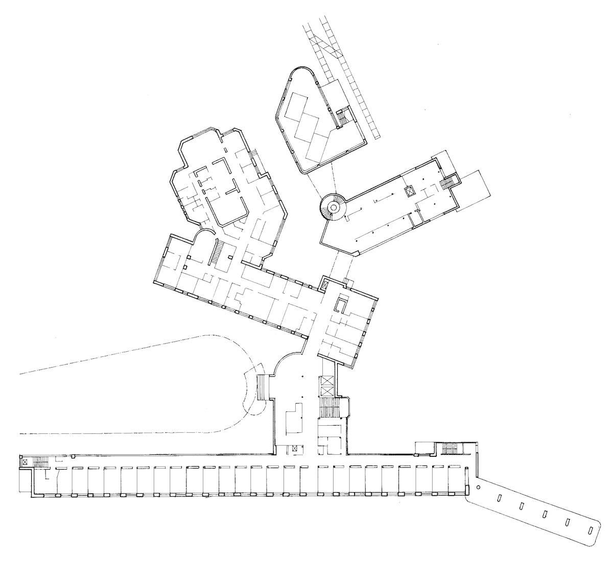 La idea primitiva consistía en la perfecta unión de las zonas de trabajo y las de reposo. La célula módulo del plan es la habitación de los enfermos. A pesar de que la habitación de tres camas proporciona mayor distracción a los enfermos, por razones de tranquilidad se prefirió la habitación con dos camas. Estar acostado, a la larga deprime a los enfermos. Por otra parte, las habitaciones normales no están concebidas para esta posición. El contraste de colores y volúmenes resultante de la diferencia de valores entre los tabiques y los techos, entre la luz del día y la luz eléctrica, etc., casi siempre actúan desfavorablemente sobre los pacientes acostados y que están particularmente sensibilizados a causa de su enfermedad. Las habitaciones y apartamentos de los enfermos constituyen un intento de sustraer la influencia de la atmósfera que reina en un establecimiento semejante. Los empleados superiores, sobre todo los médicos, y todo el personal, viven en las hileras de casas fuera del sanatorio.