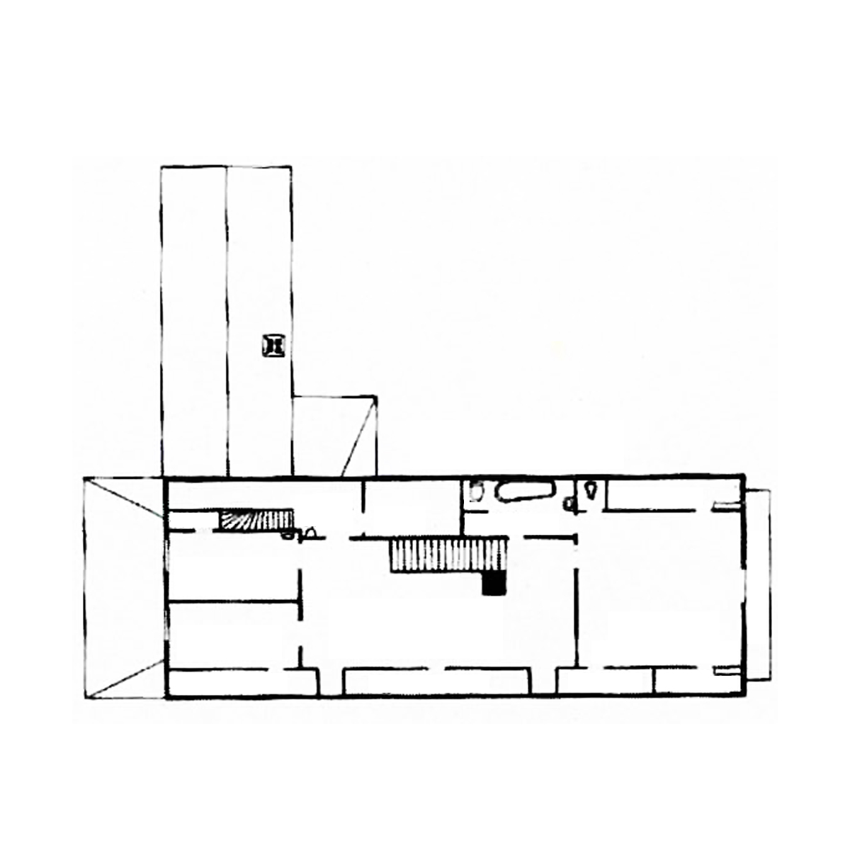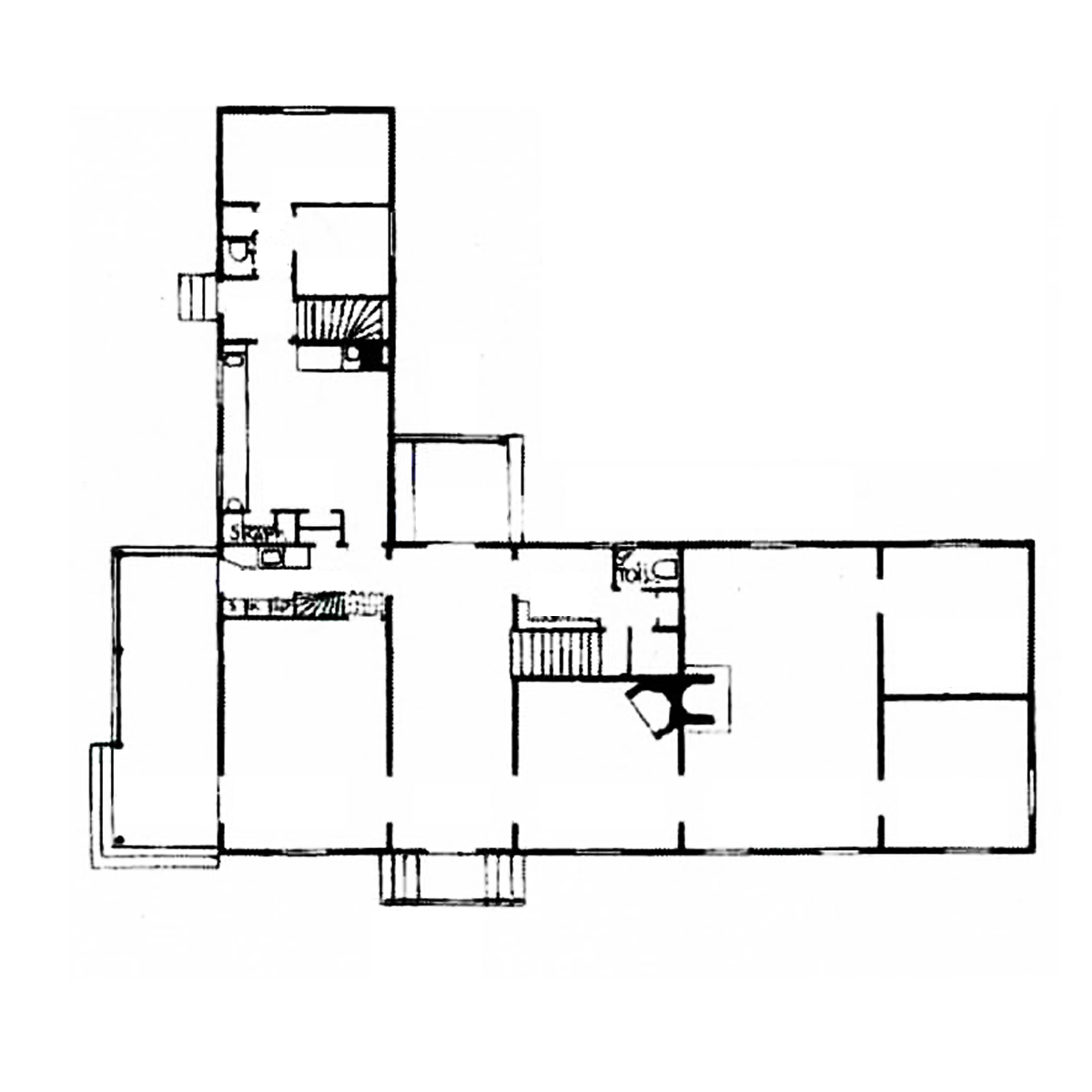 “The house contains living quarters for the master and mistress of the house, as well as guest rooms and kitchen and servant spaces. The streched-out plan is the result of two things: one, the desire to form an outer courtyard. And also, in getting to know the jovial and rather stocky client, it seemed that a long house would suit him best.”