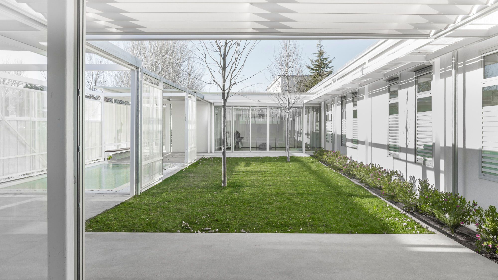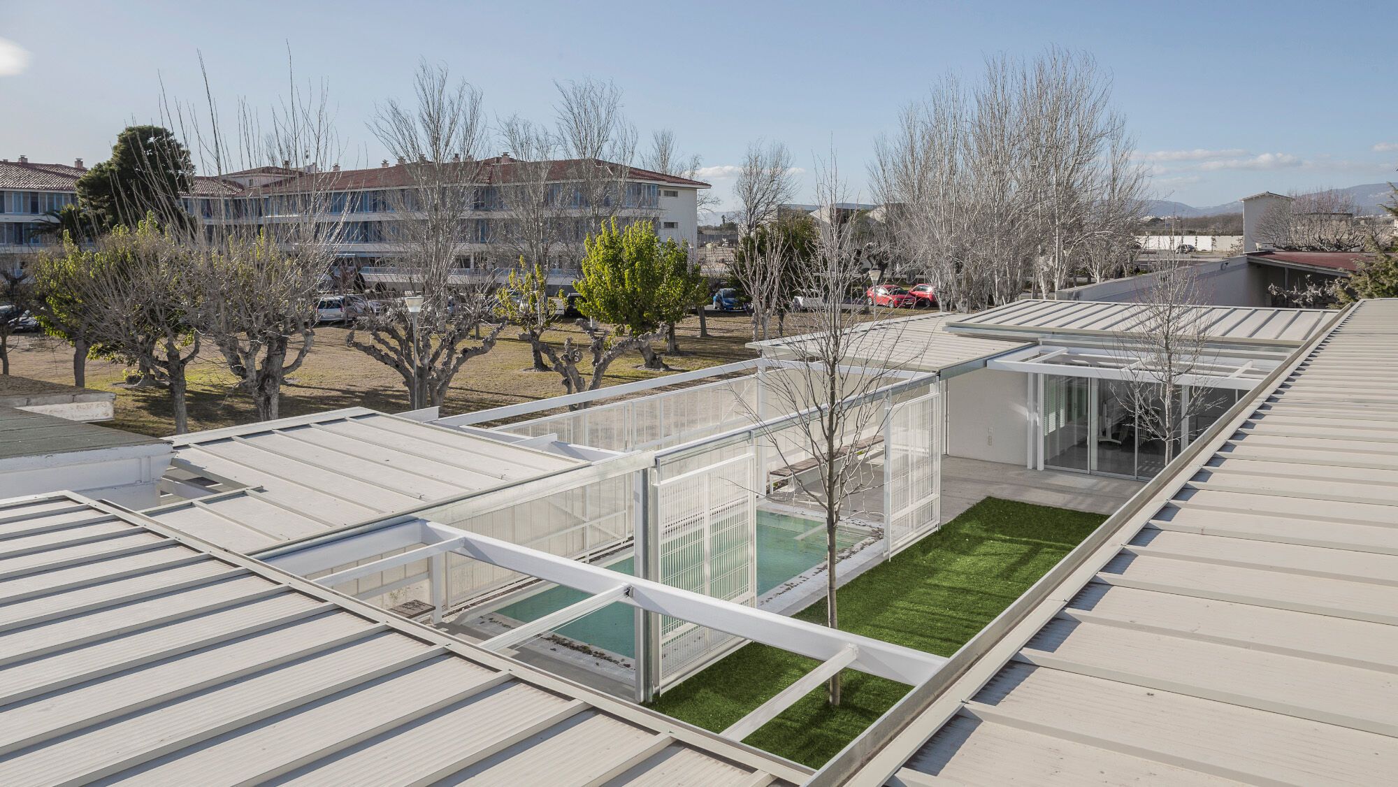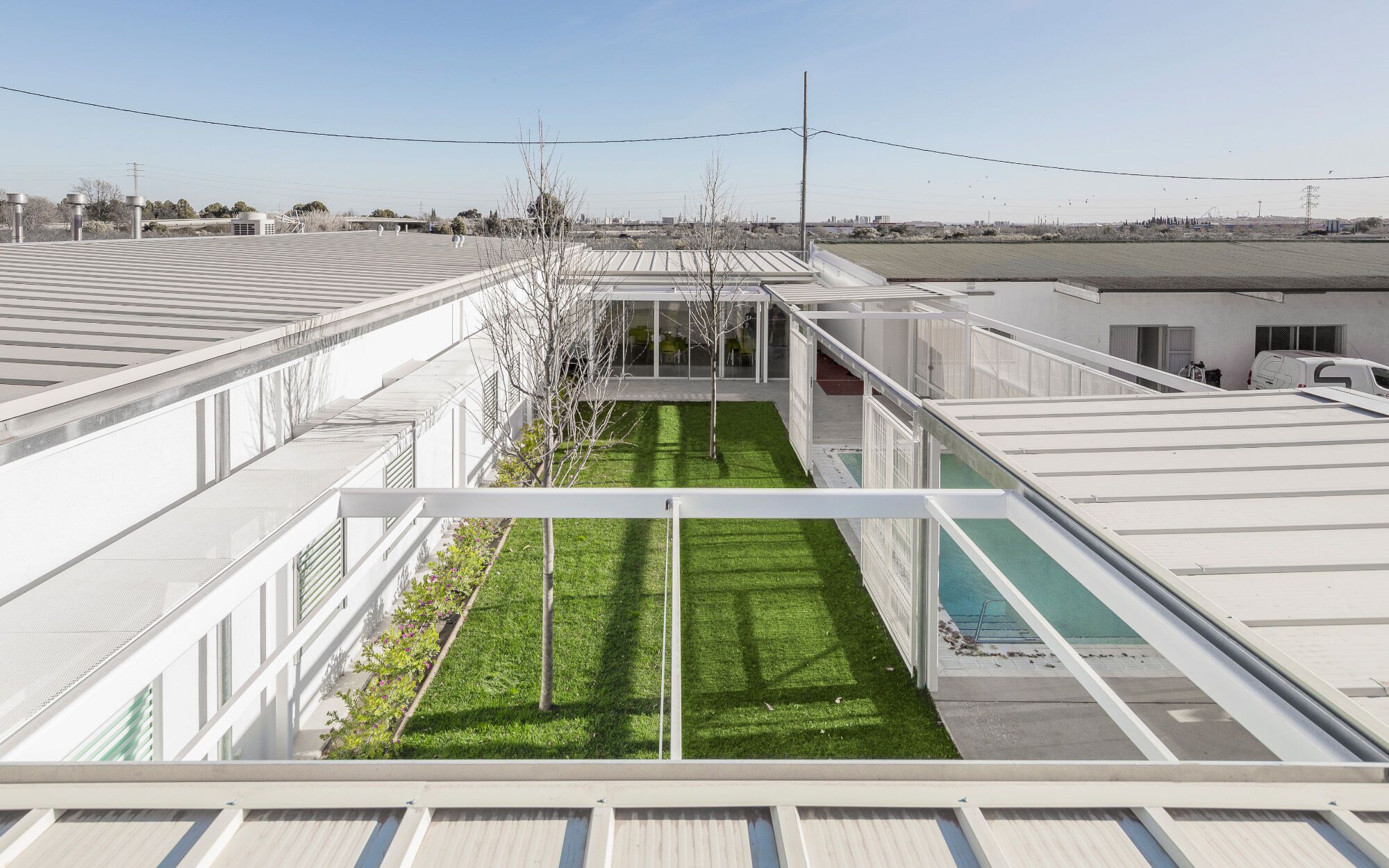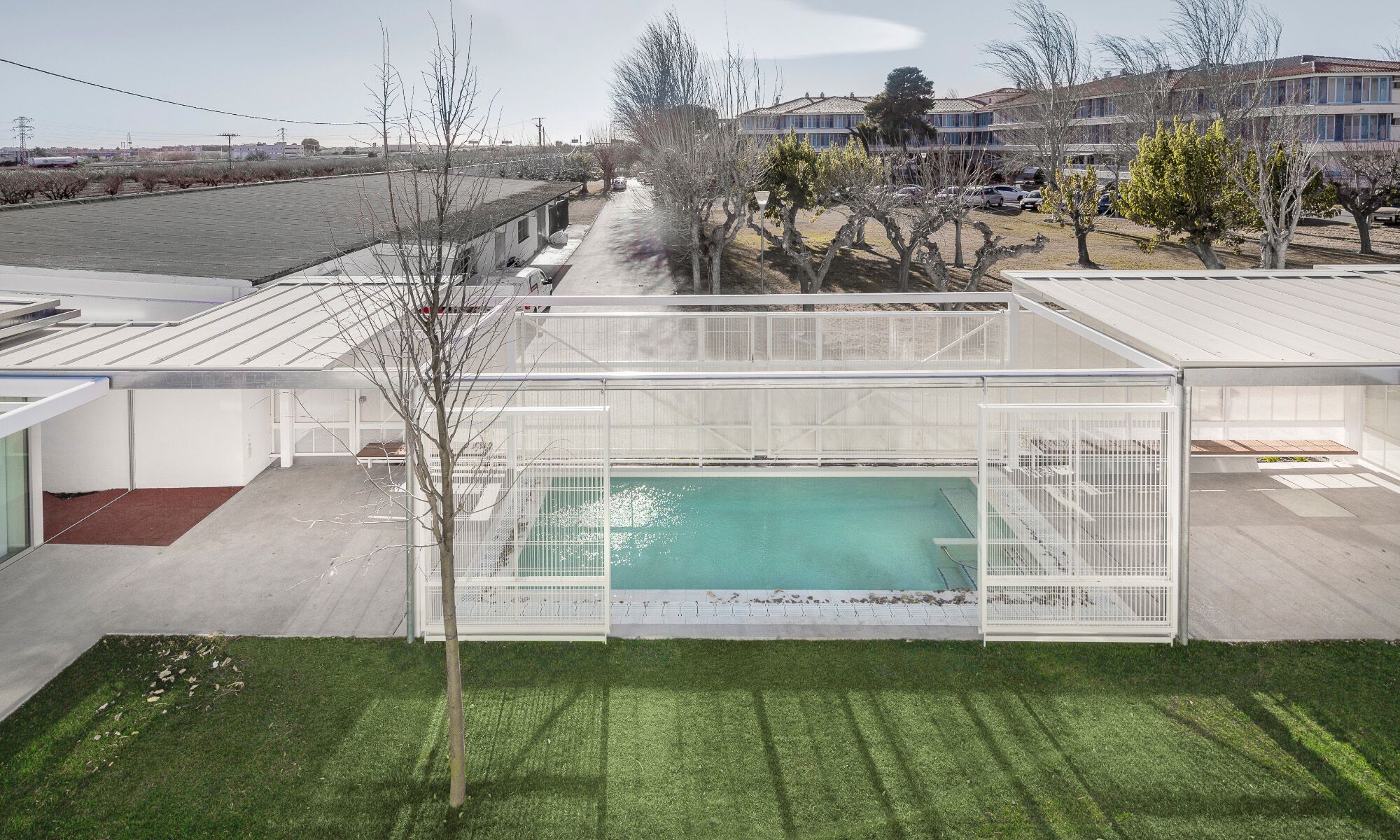 The privacy and safety of the residents are a fundamental condition of the project. The project chooses an enclosure based on oven-lacquered expanded metal sheets, which offer varying degrees of opac-ity. This system creates visual relationships that foster the connection between interior and exterior while preserving the privacy of inhabitants. The pool, which has significant accessibility restrictions, features a very light and permeable fence, aiming to belong to the central courtyard.