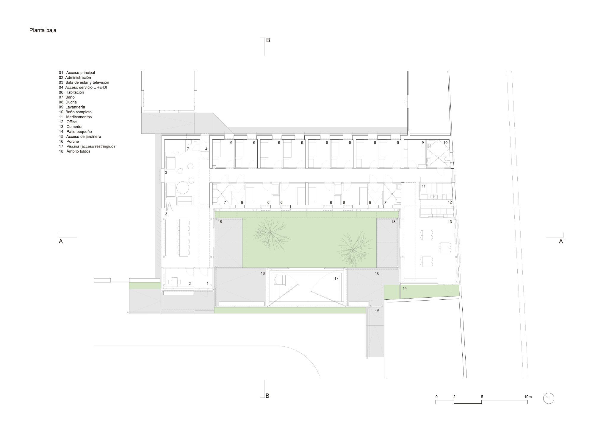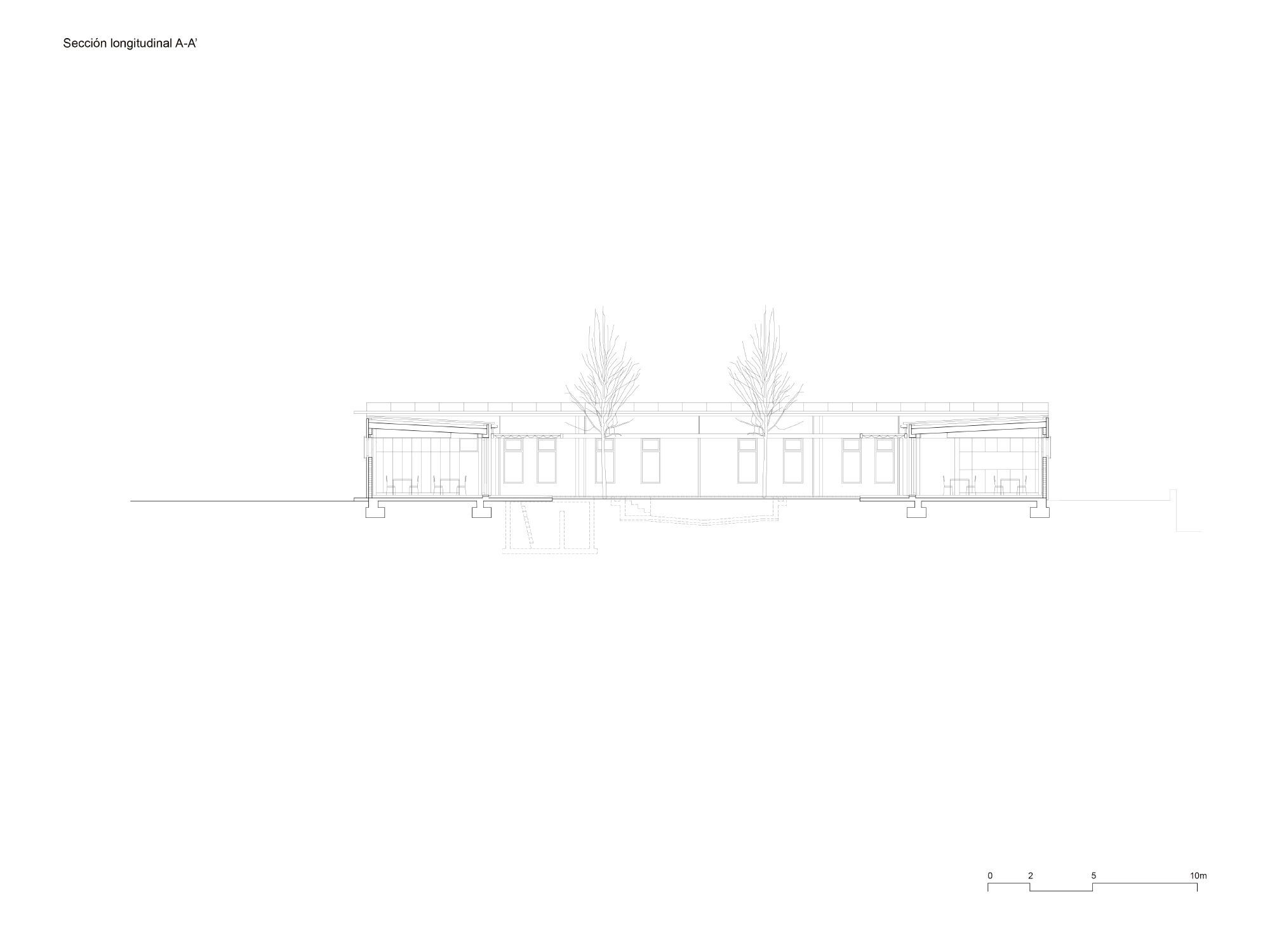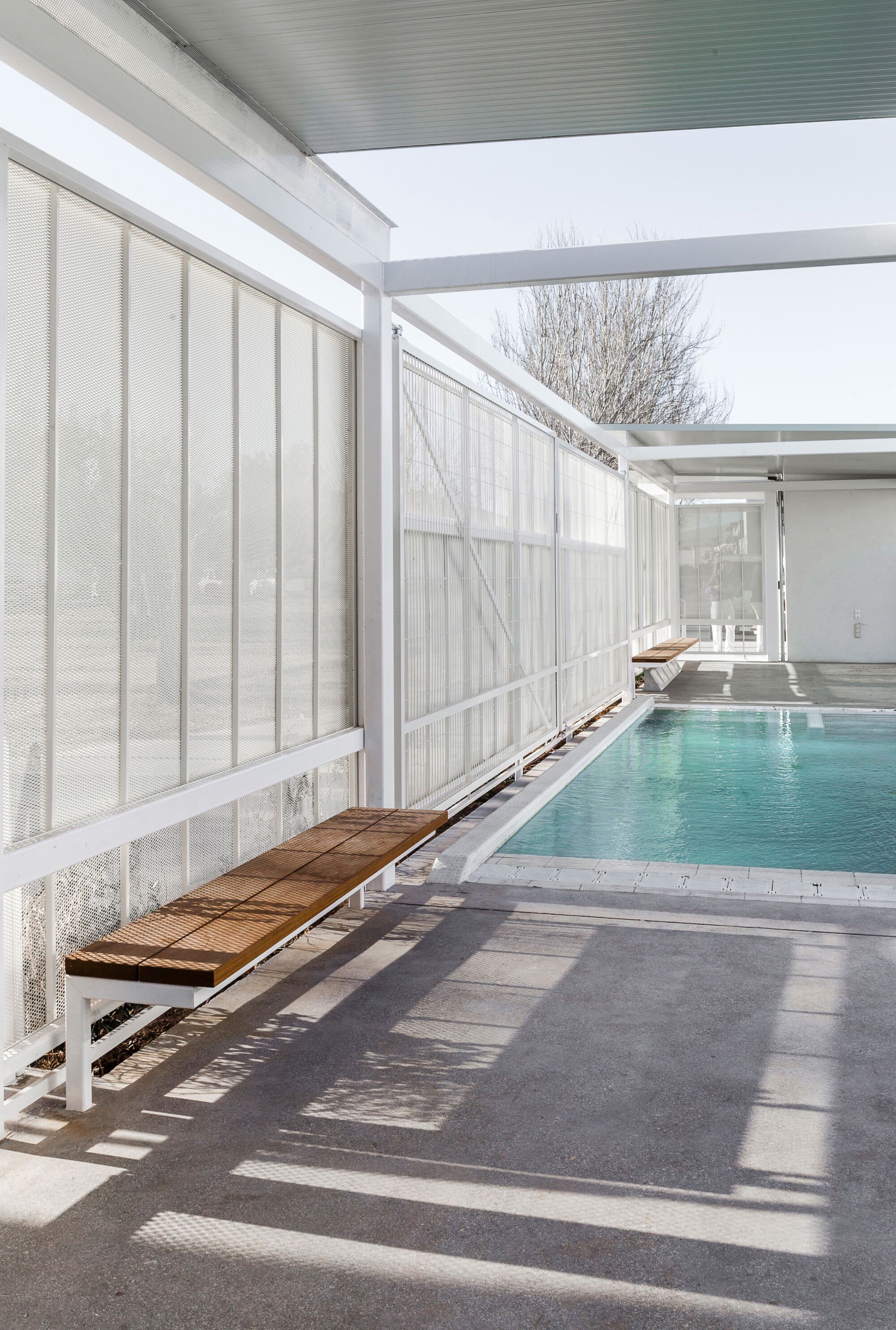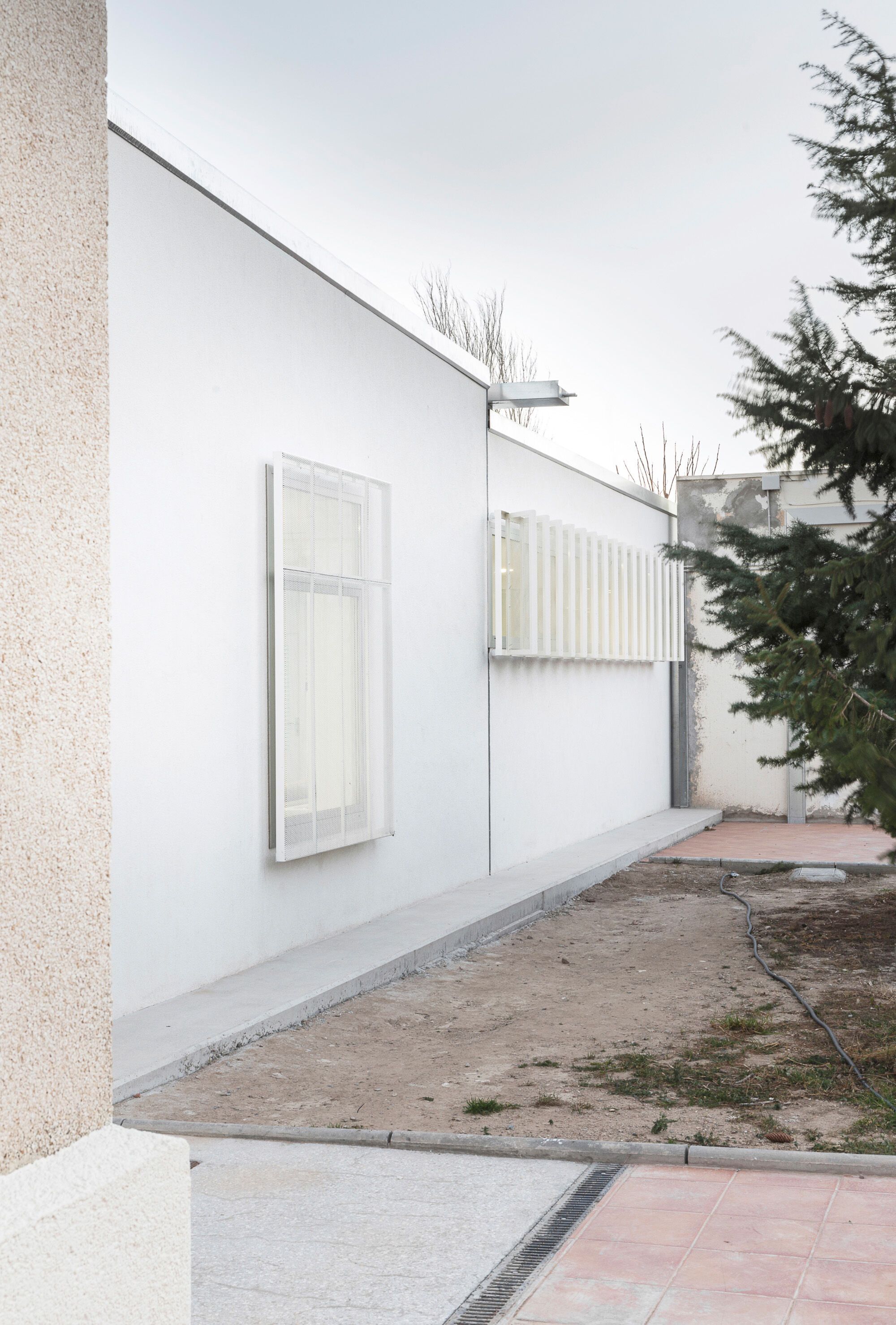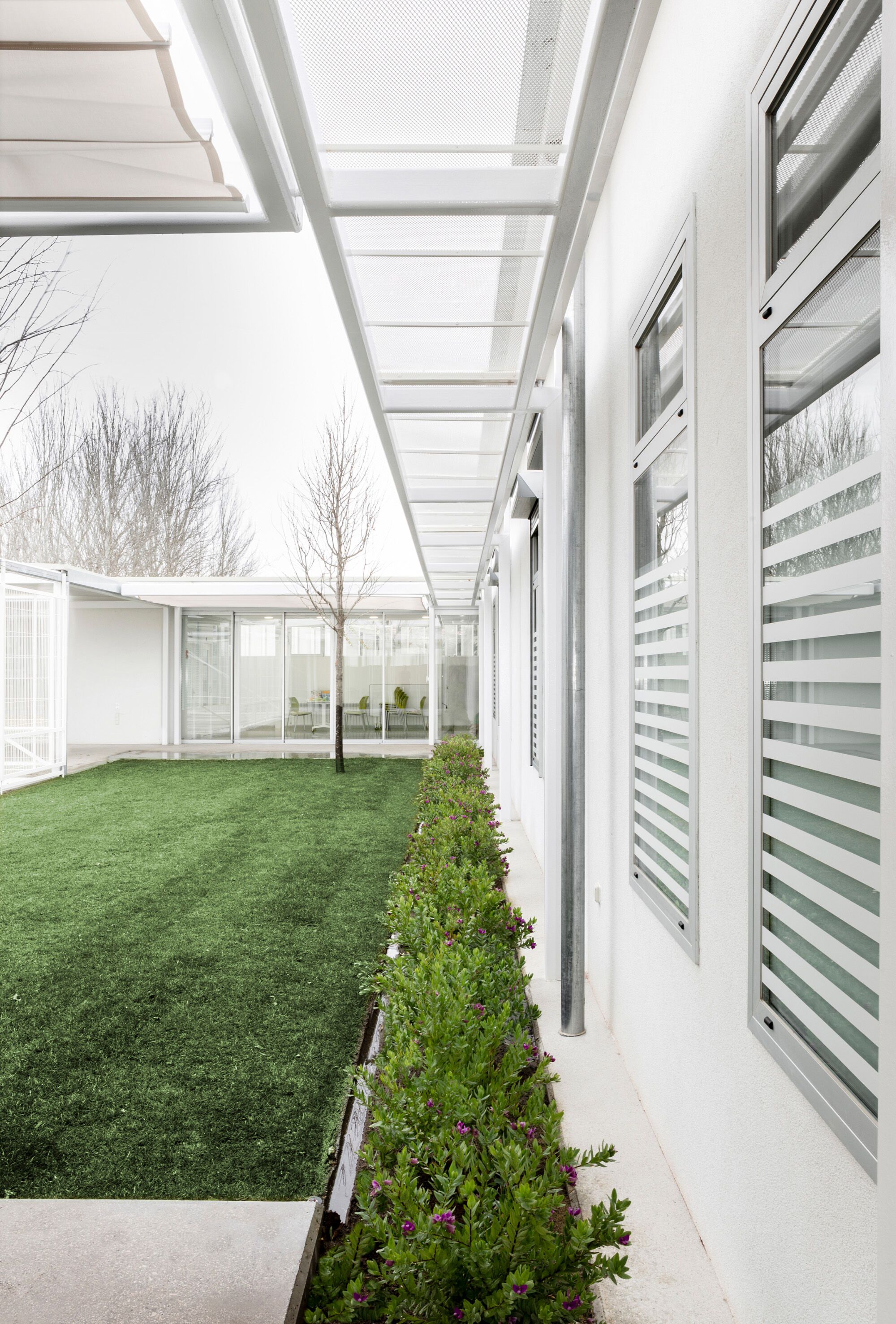 The privacy and safety of the residents are a fundamental condition of the project. The project chooses an enclosure based on oven-lacquered expanded metal sheets, which offer varying degrees of opac-ity. This system creates visual relationships that foster the connection between interior and exterior while preserving the privacy of inhabitants. The pool, which has significant accessibility restrictions, features a very light and permeable fence, aiming to belong to the central courtyard.