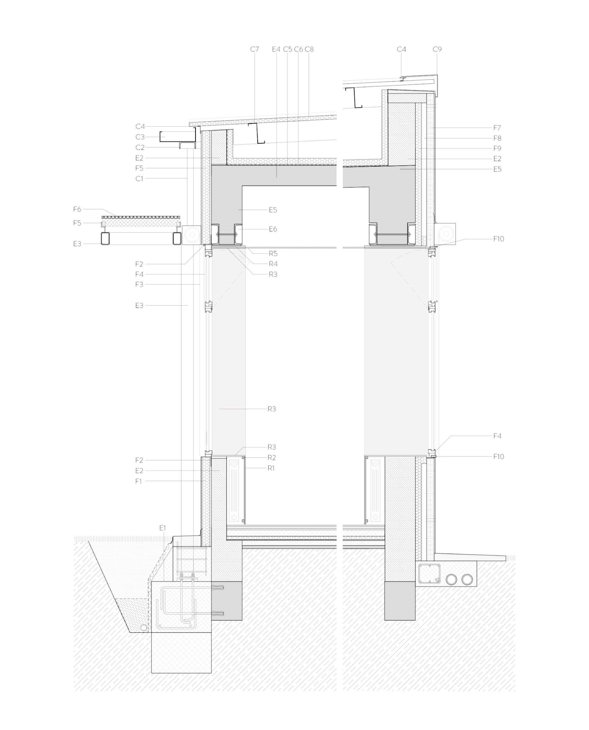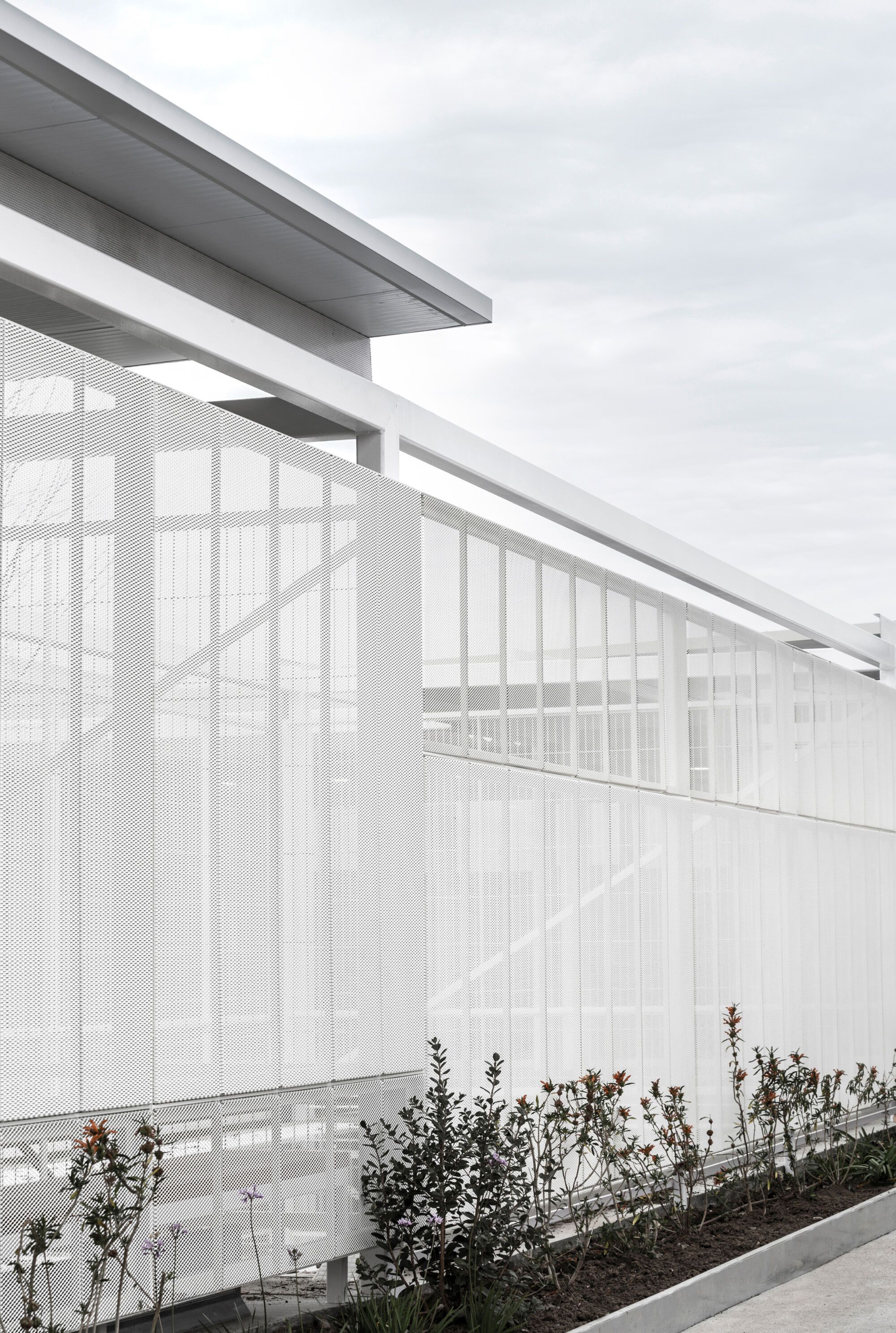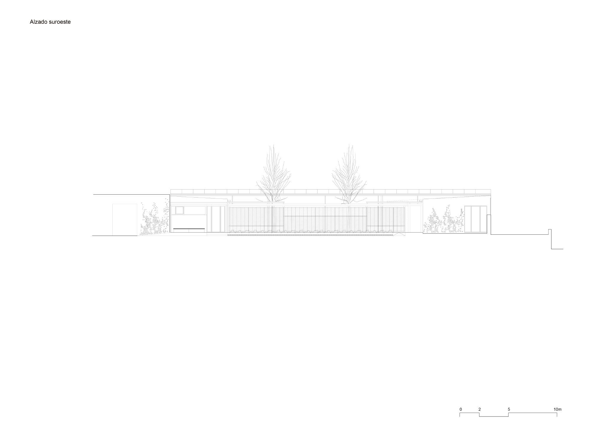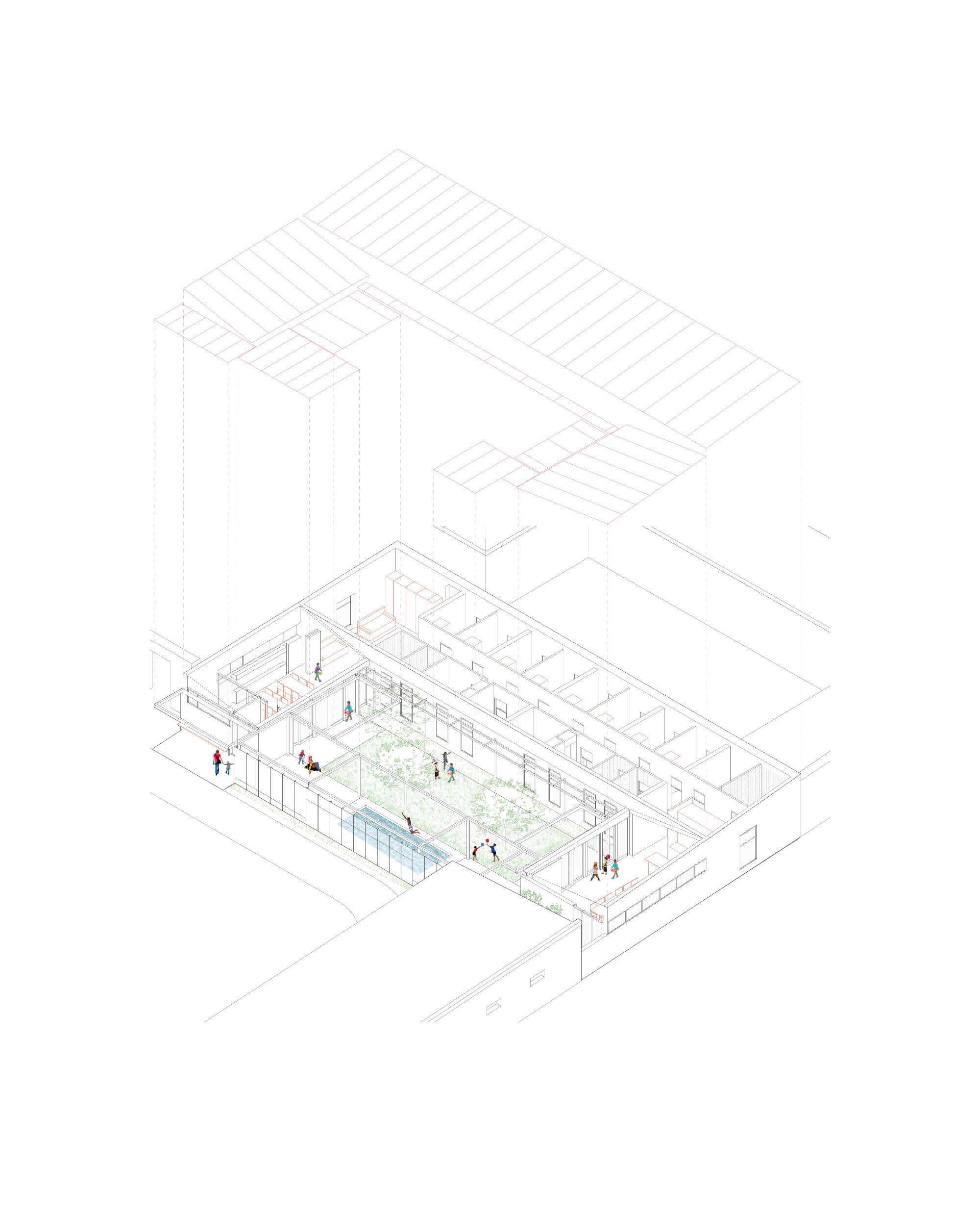 The privacy and safety of the residents are a fundamental condition of the project. The project chooses an enclosure based on oven-lacquered expanded metal sheets, which offer varying degrees of opac-ity. This system creates visual relationships that foster the connection between interior and exterior while preserving the privacy of inhabitants. The pool, which has significant accessibility restrictions, features a very light and permeable fence, aiming to belong to the central courtyard.