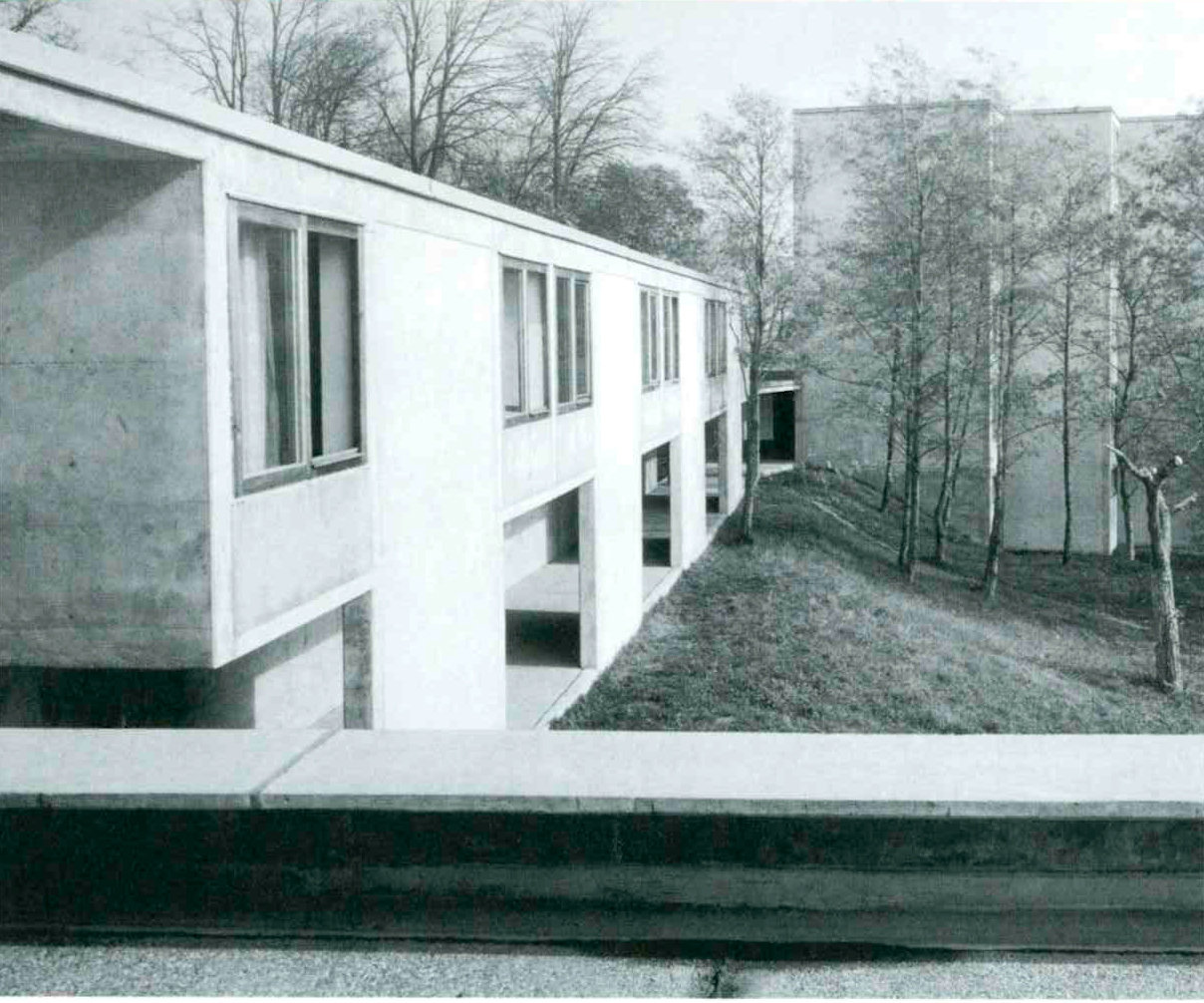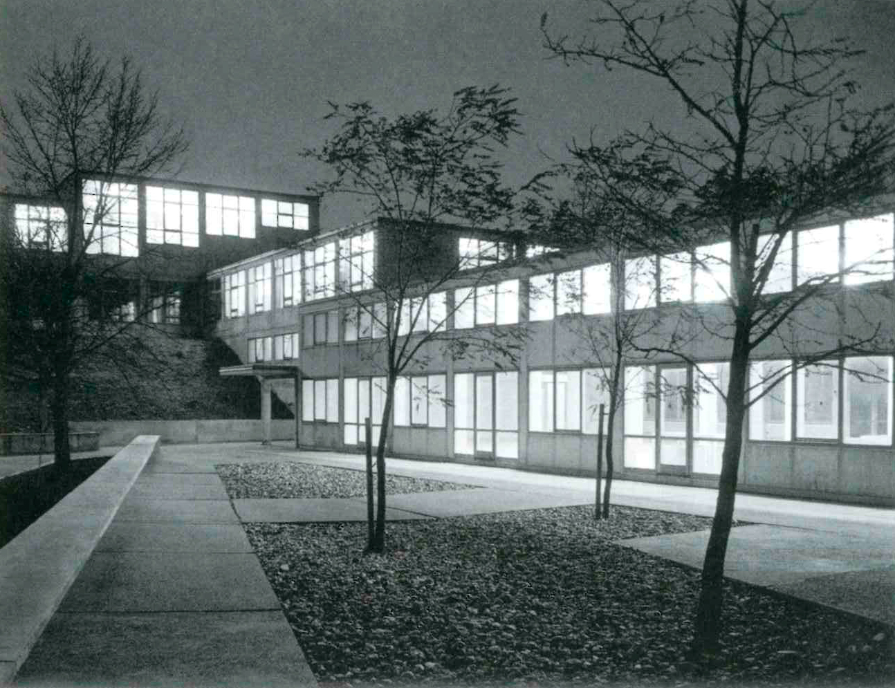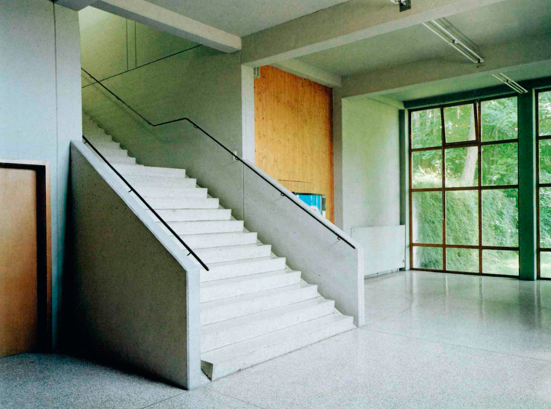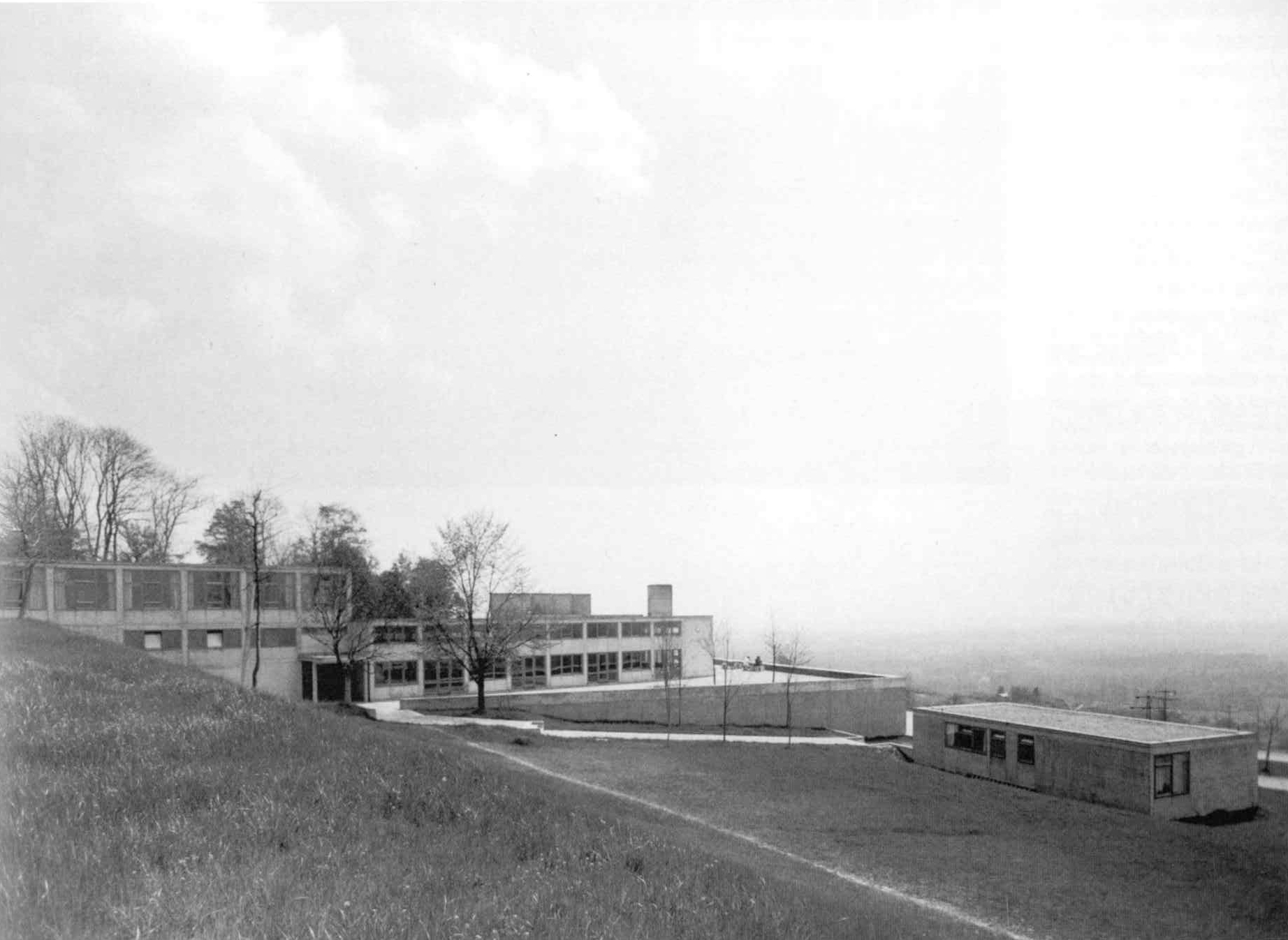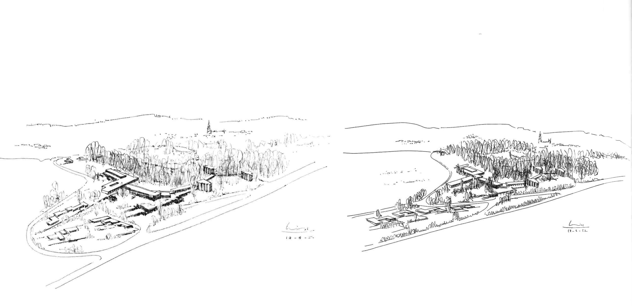 En el proyecto de ejecución definitivo (primera fase de 1953 a 1955) se yuxtaponen una estructura orgánica y la estrictamente racional, generando, de este modo, un conjunto unitario. El complejo se extiende como una columna vertebral y sigue las curvas de nivel conectando todos los elementos en un único organismo. Al contrario que los volúmenes ortogonales, esta espina dorsal posee una forma propia. Primera forma el estrecho corredor que perfora los volúmenes de la hilera de construcciones que albergan los estudios y, posteriormente, funciona como una pérgola abierta o como una estancia exterior cónica. La denominada “hoja de sierra” (cuyo nombre proviene de la planta cuadrada y la sección de las escaleras) es el elemento más llamativo y, en cierta medida, el más emblemático del conjunto: es la estancia central del edificio principal, alrededor del cual se agrupan las distintas aulas y salas de reunión, confiriendo forma y direccionalidad al exterior.