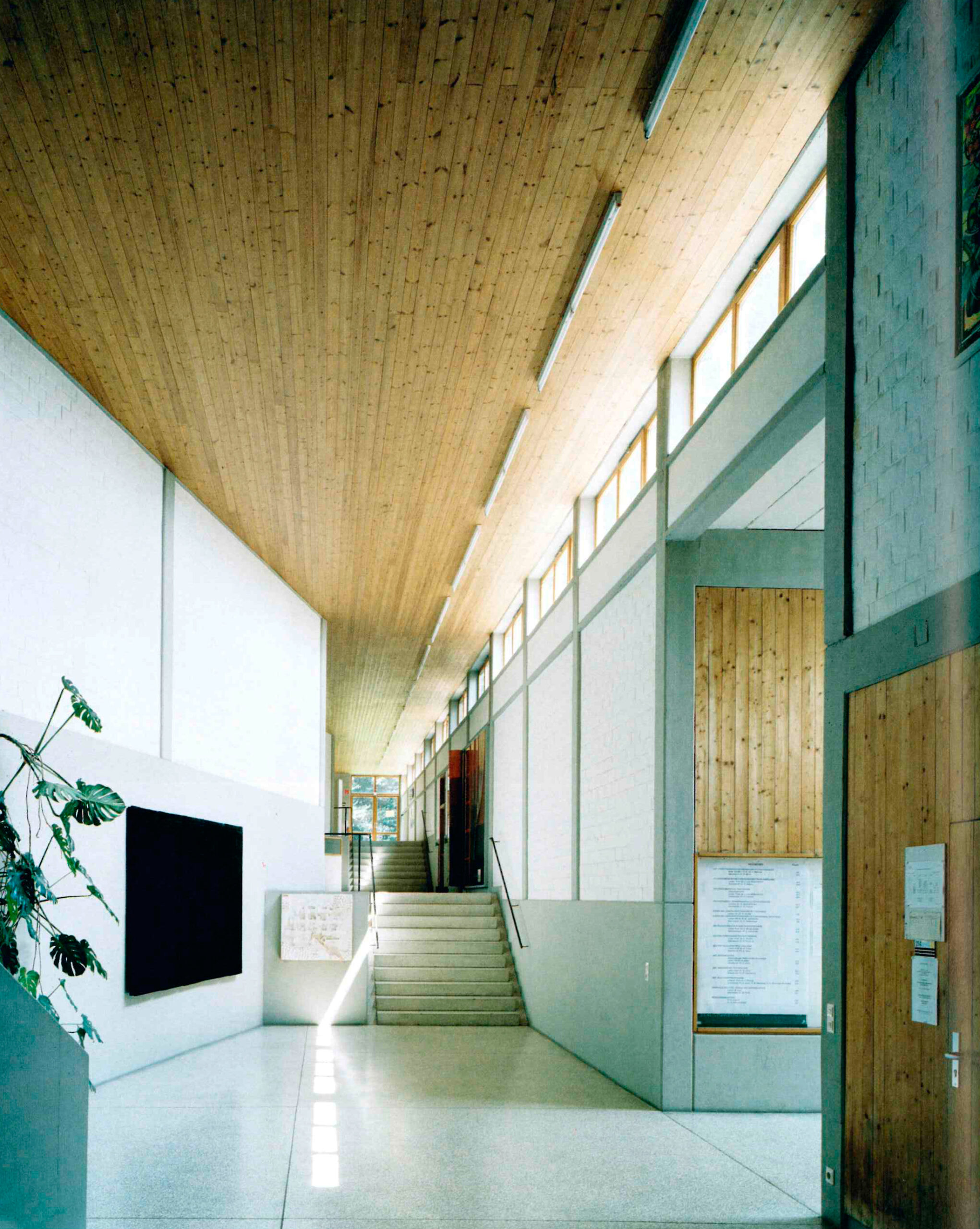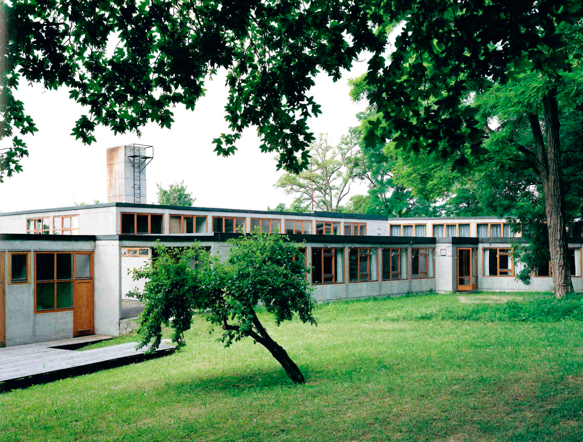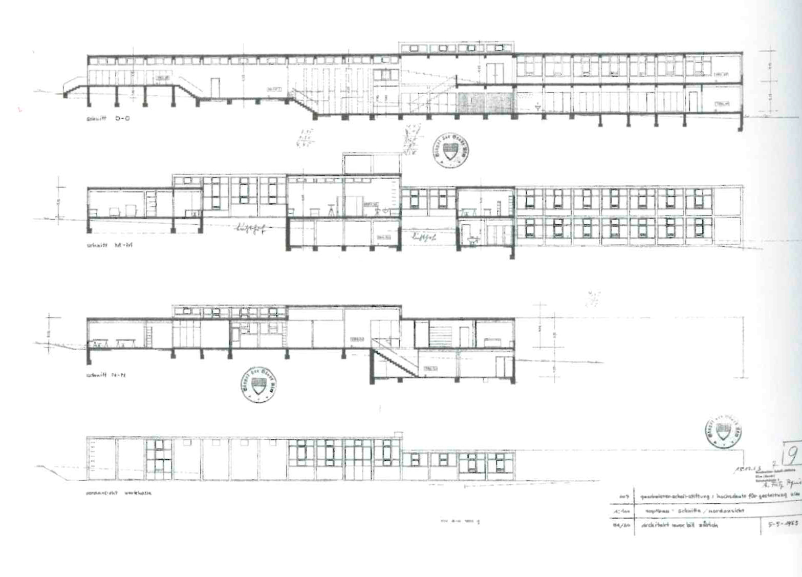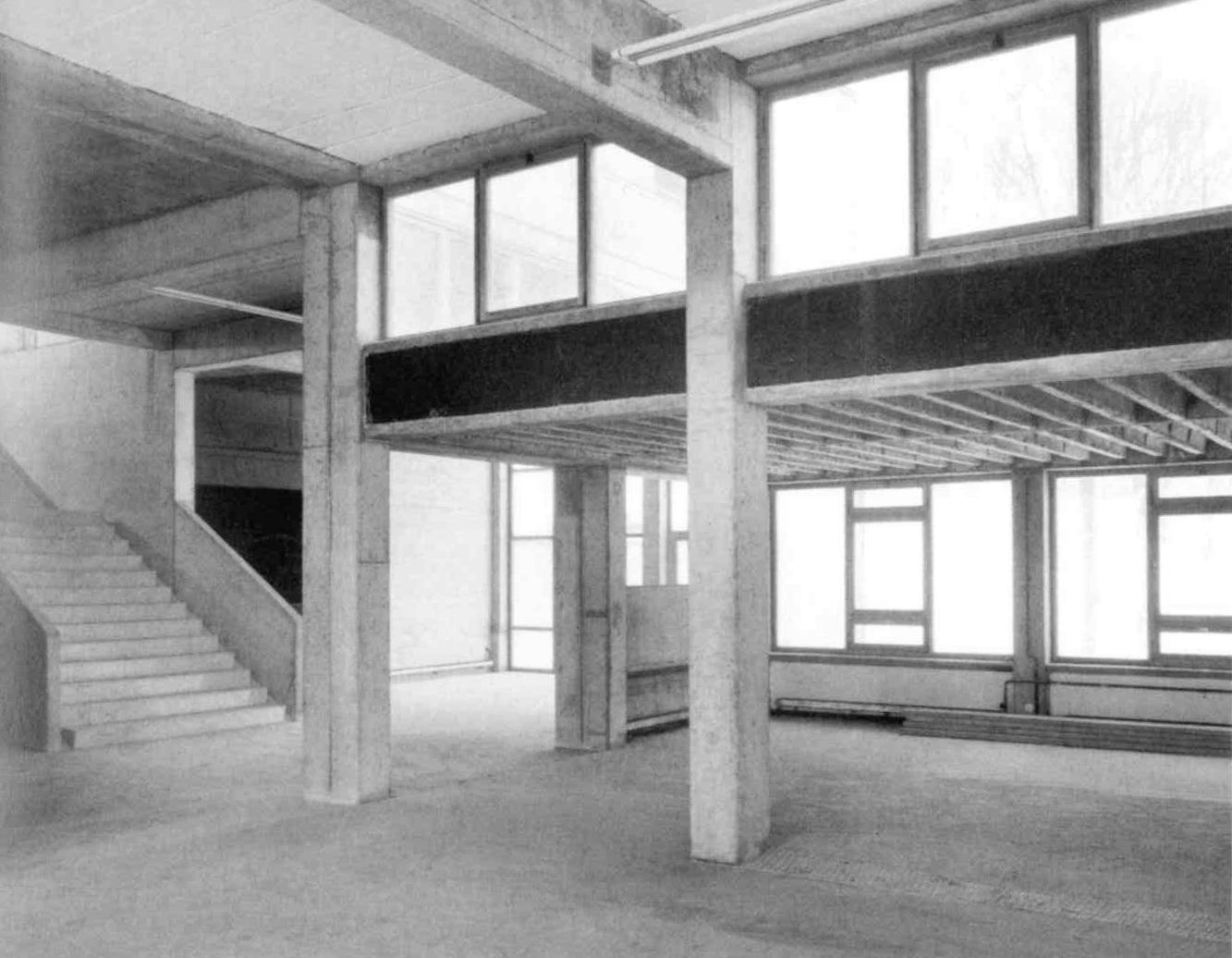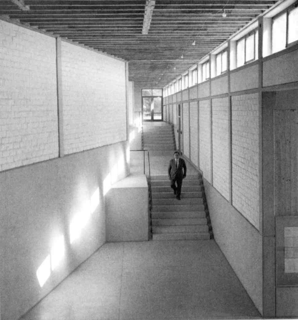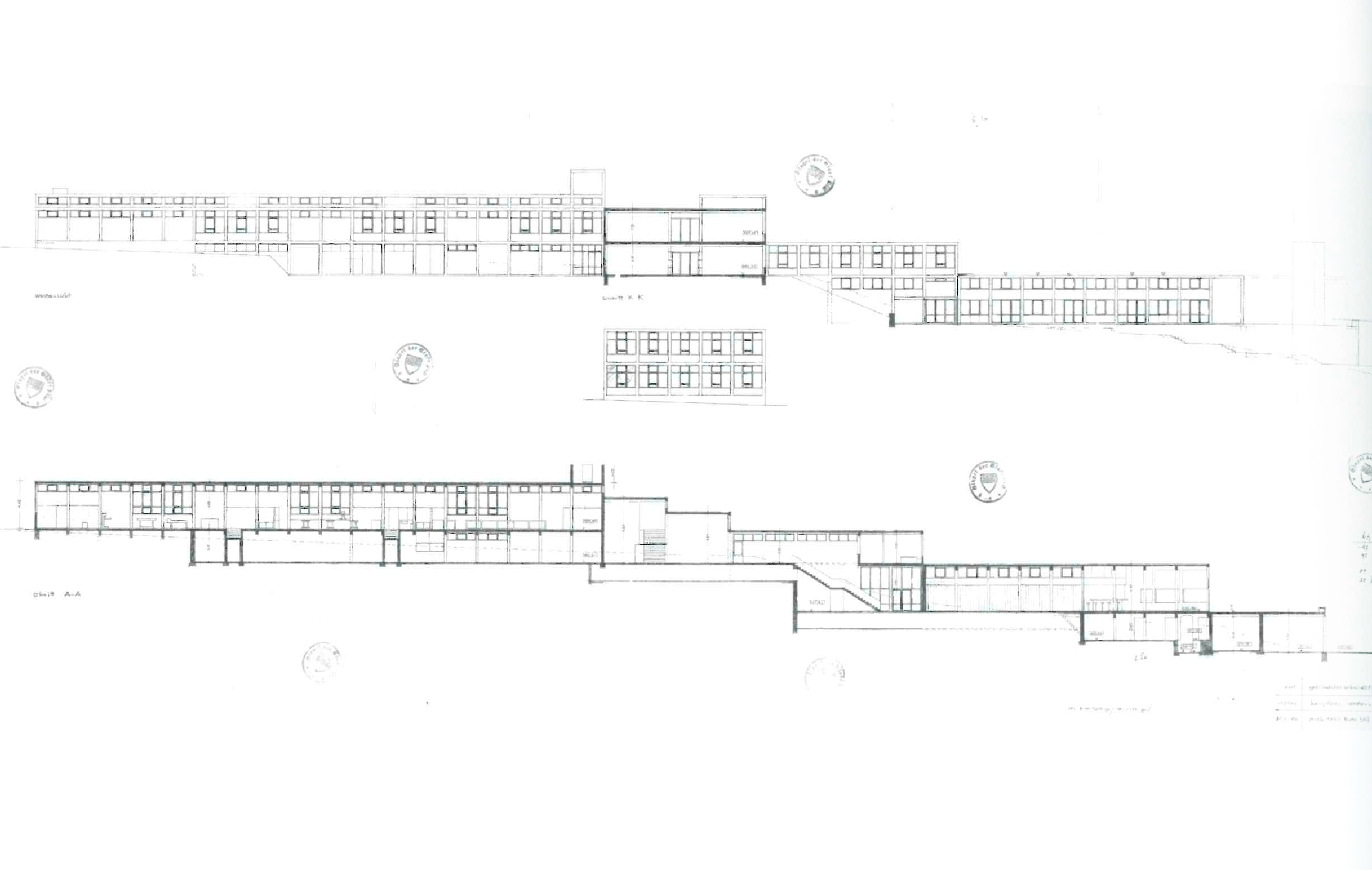 En el proyecto de ejecución definitivo (primera fase de 1953 a 1955) se yuxtaponen una estructura orgánica y la estrictamente racional, generando, de este modo, un conjunto unitario. El complejo se extiende como una columna vertebral y sigue las curvas de nivel conectando todos los elementos en un único organismo. Al contrario que los volúmenes ortogonales, esta espina dorsal posee una forma propia. Primera forma el estrecho corredor que perfora los volúmenes de la hilera de construcciones que albergan los estudios y, posteriormente, funciona como una pérgola abierta o como una estancia exterior cónica. La denominada “hoja de sierra” (cuyo nombre proviene de la planta cuadrada y la sección de las escaleras) es el elemento más llamativo y, en cierta medida, el más emblemático del conjunto: es la estancia central del edificio principal, alrededor del cual se agrupan las distintas aulas y salas de reunión, confiriendo forma y direccionalidad al exterior.